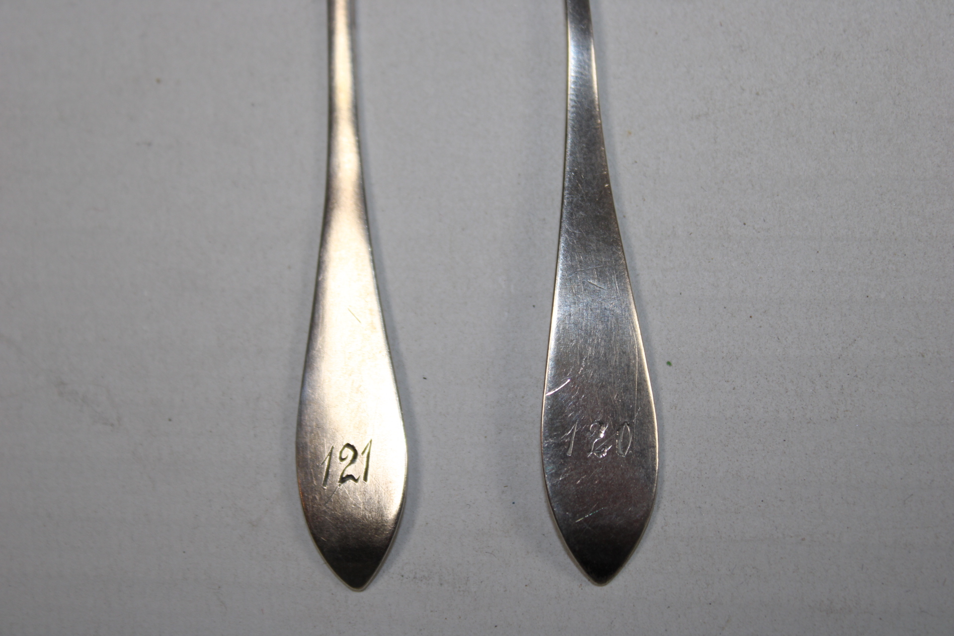 - 2 pieces: length +/- 13.5 cm, silver content 800. Numbered: 120-121. Unknown mark 'AH'.