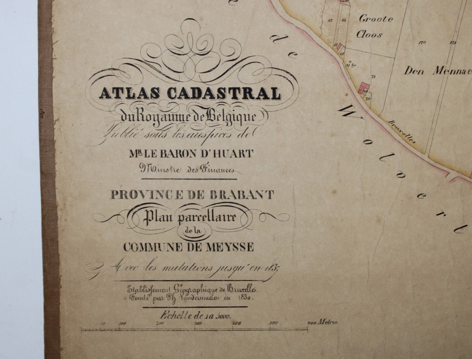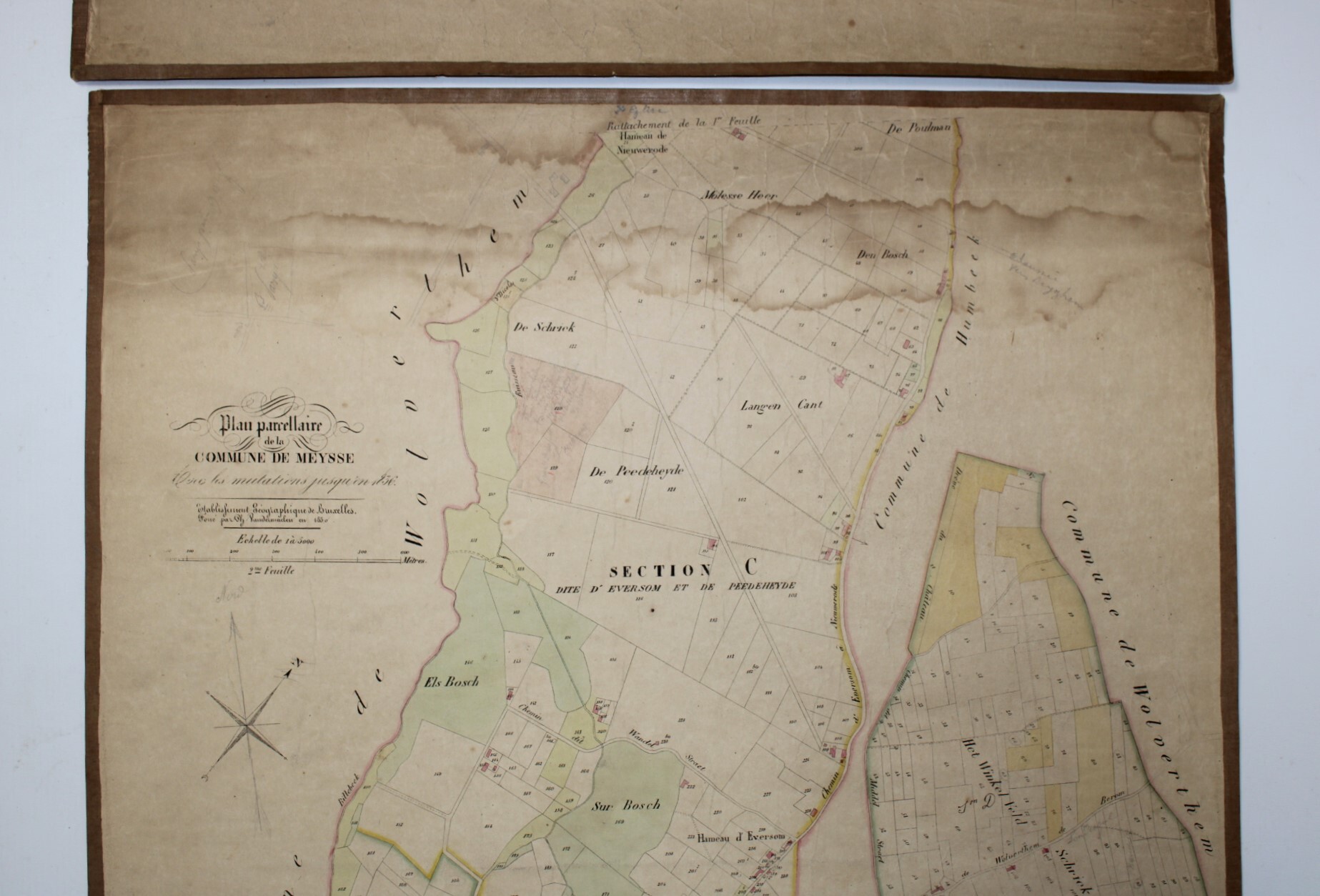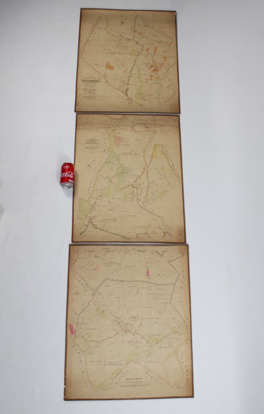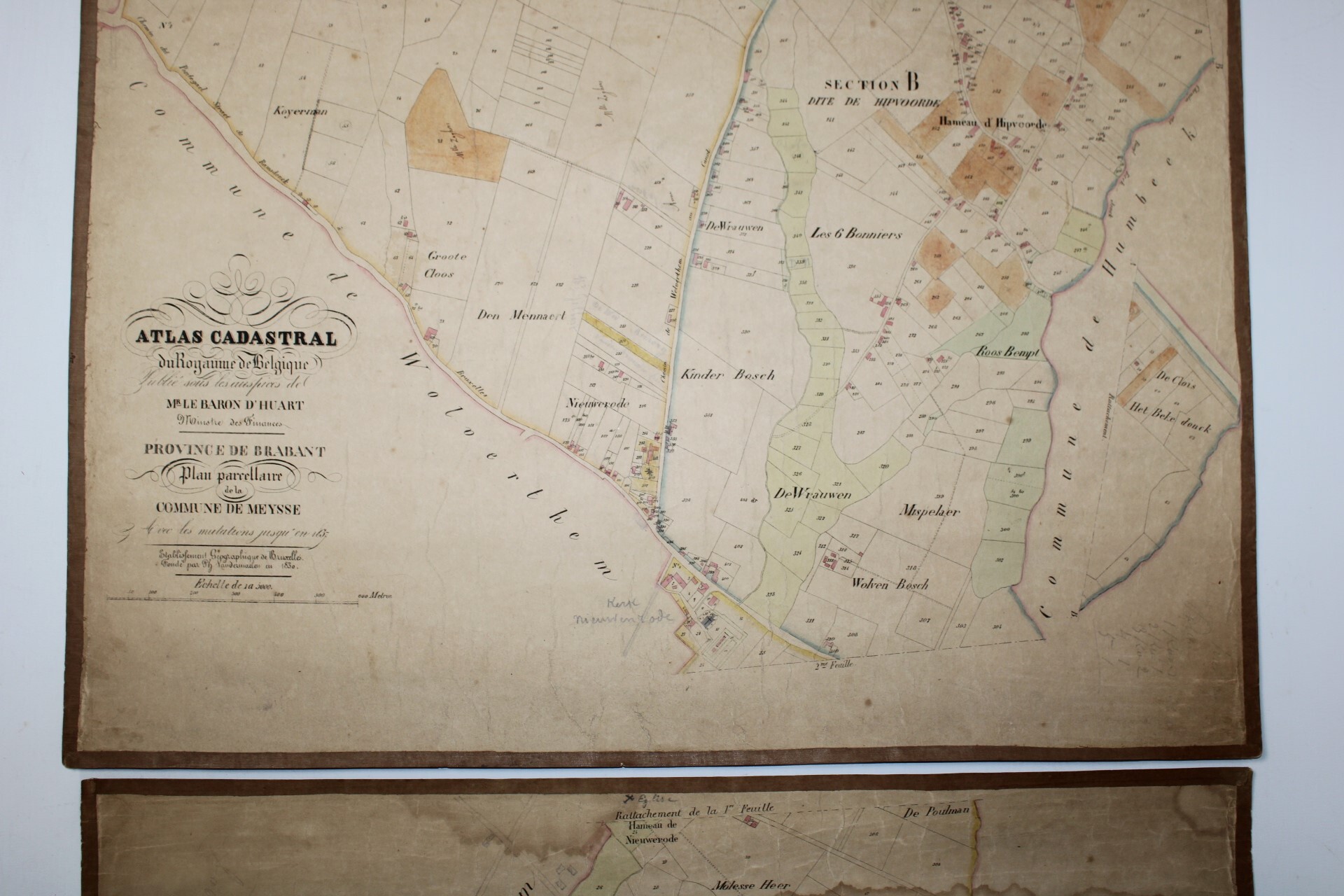 A set of 3 large original cadastral map of Meise or 'Meysse', drawn by cartographer Philippe Vandermaelen and published as the "Atlas Cadastral" between 1846 and 1854. Indication: "Avec les mutations jusqu'en 1837". Scale: 1 à 5000.