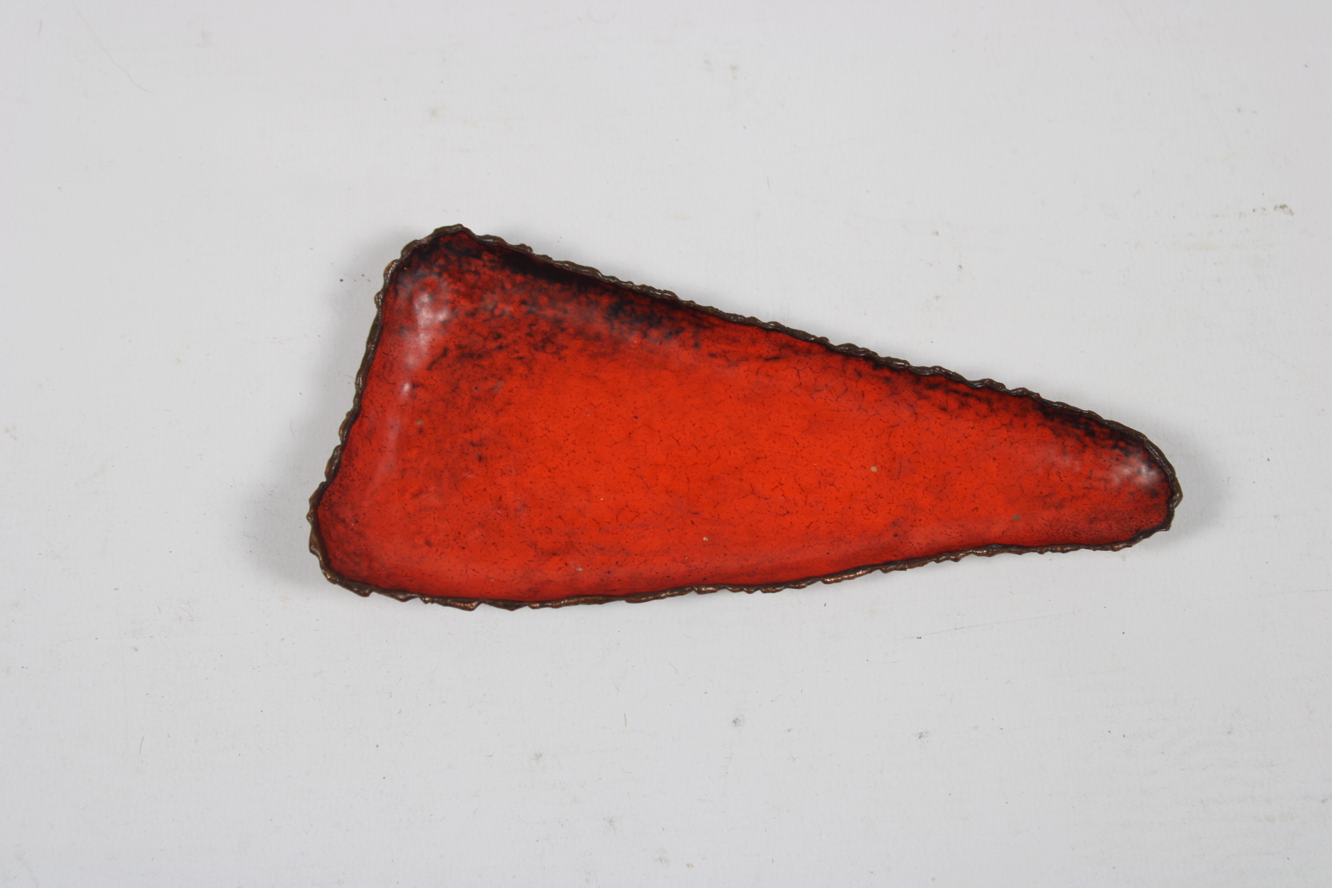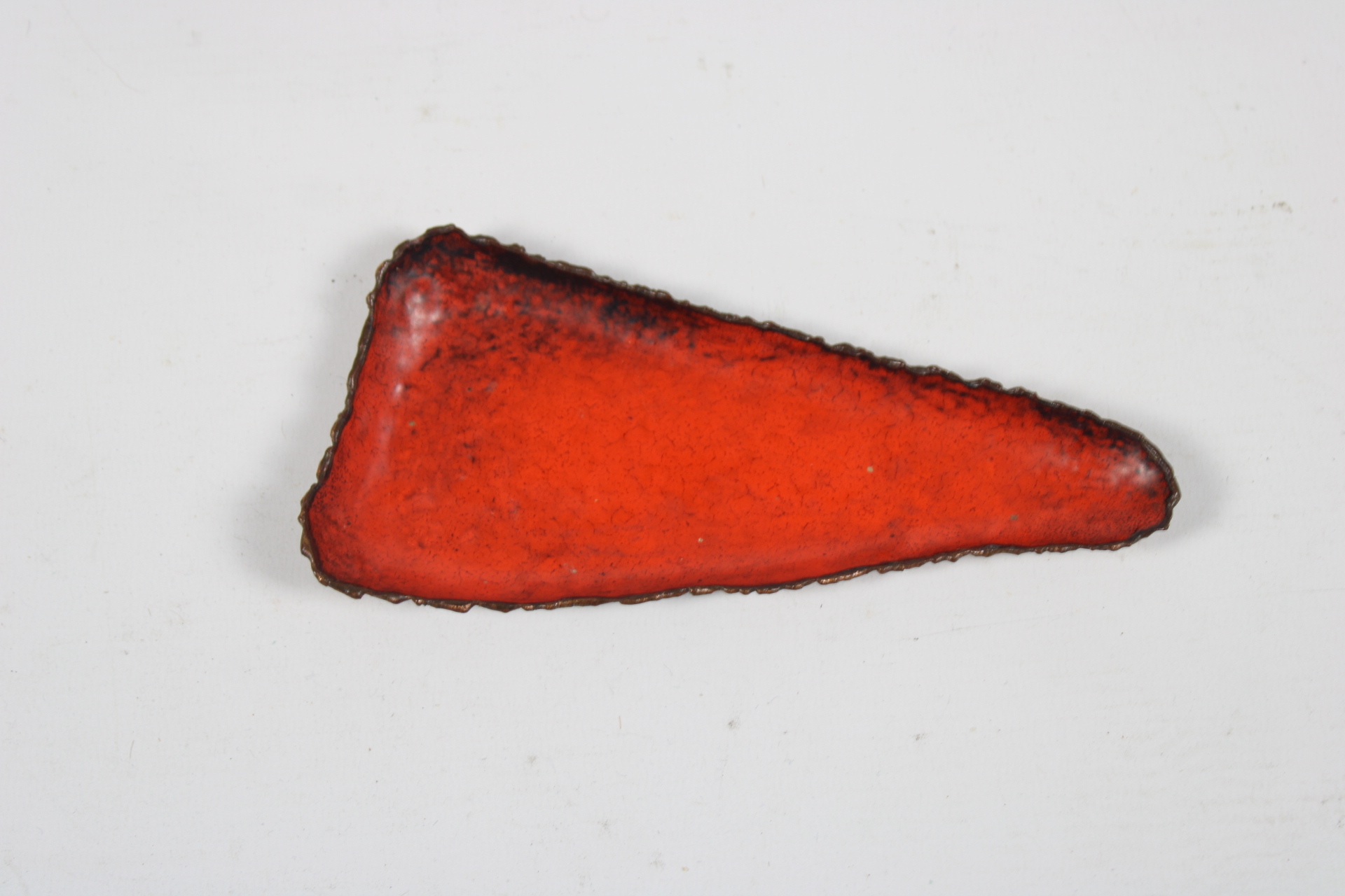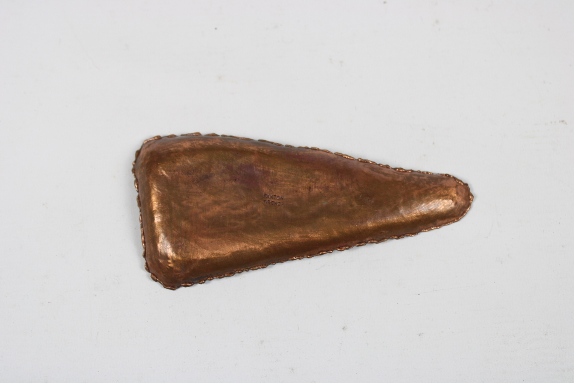 A rare triangular copper dish/bowl lined with orange-brown enamel. Designed by Marcello Fantoni (1915-2011), a hand made copper enamel change trinket dish. Made in the brutalist style, executed in handwrought copper with a torch-cut edge. Signed on the bottom: Fantoni, Firenze. 1960s-1970s.