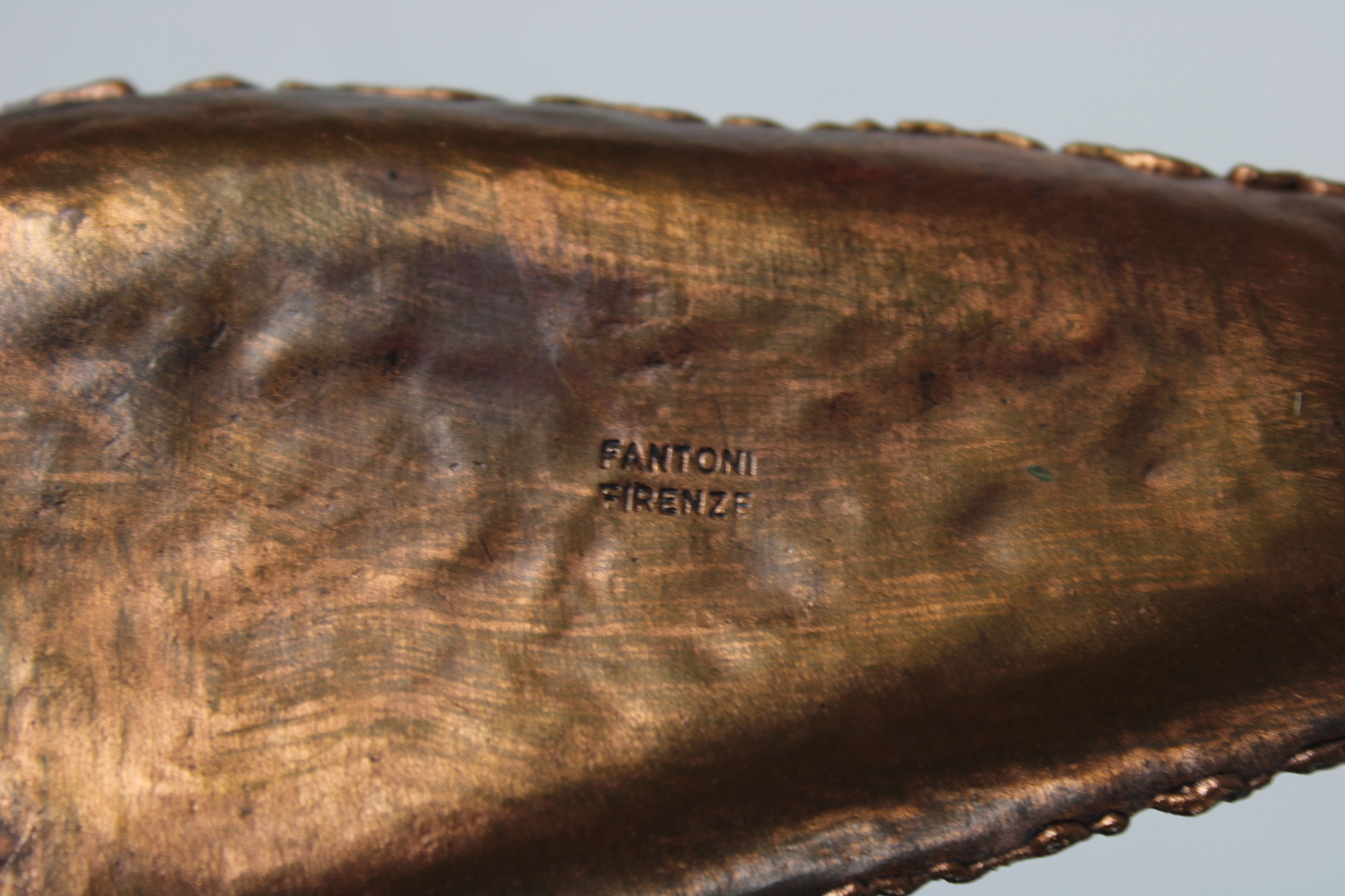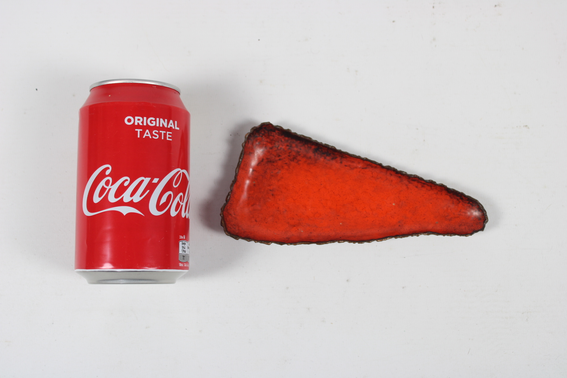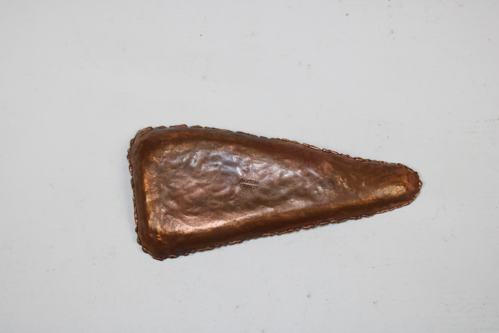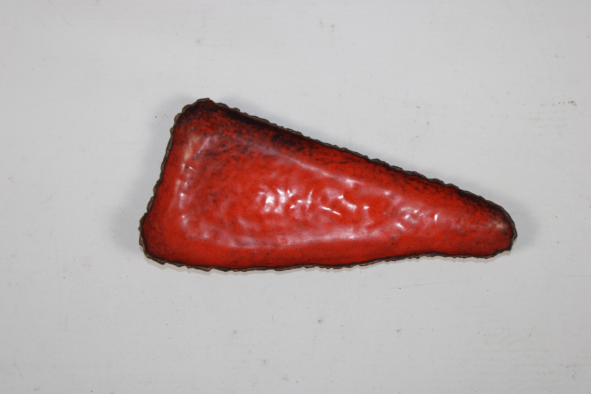 A rare triangular copper dish/bowl lined with orange-brown enamel. Designed by Marcello Fantoni (1915-2011), a hand made copper enamel change trinket dish. Made in the brutalist style, executed in handwrought copper with a torch-cut edge. Signed on the bottom: Fantoni, Firenze. 1960s-1970s.