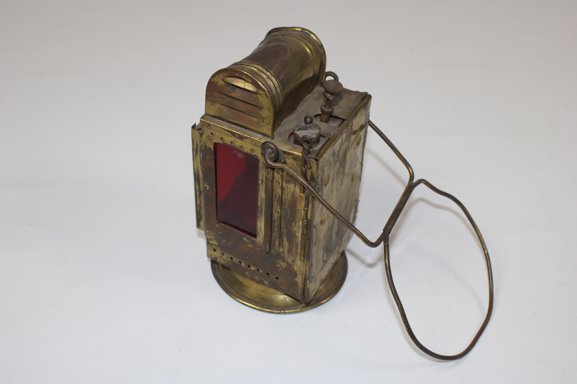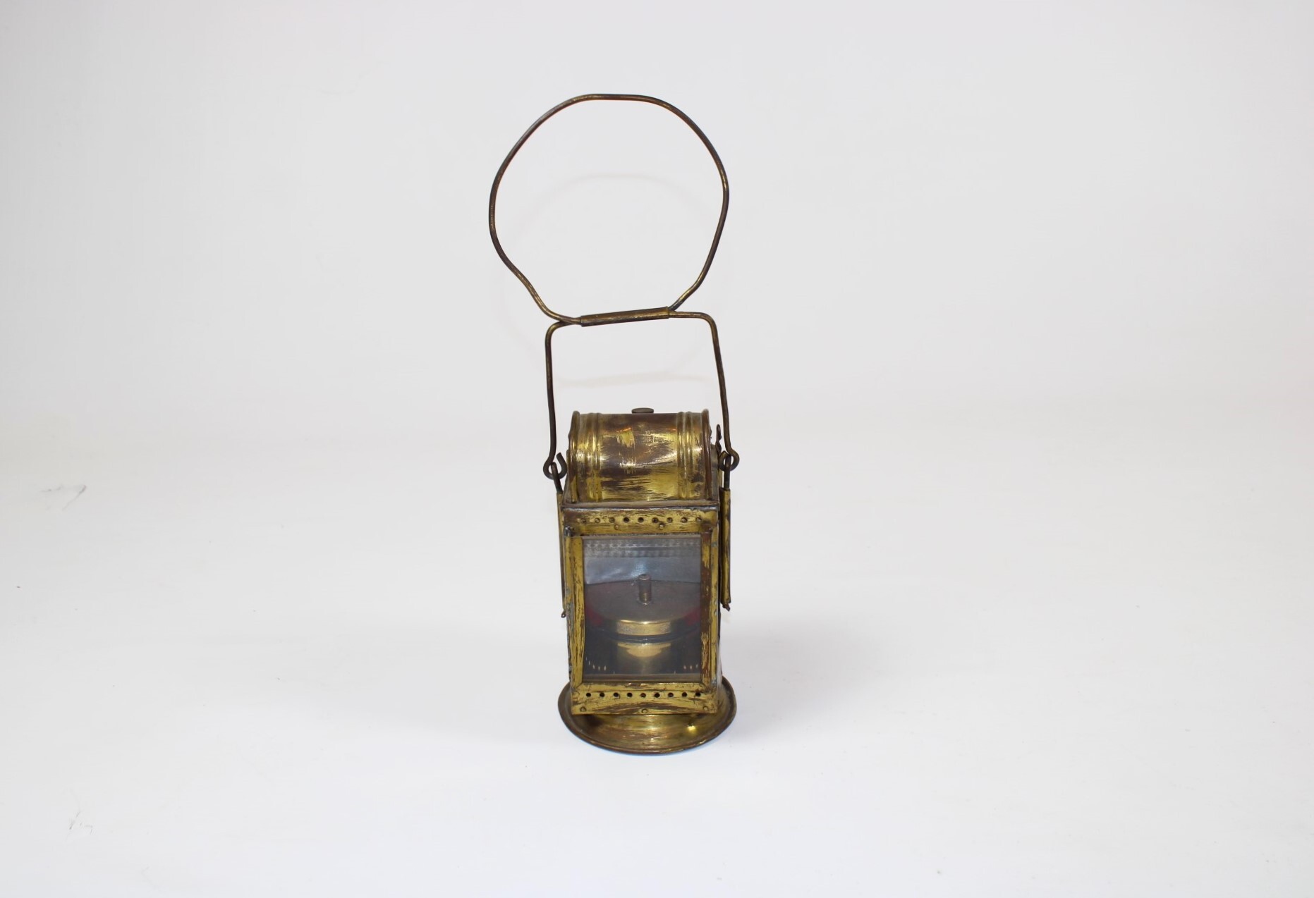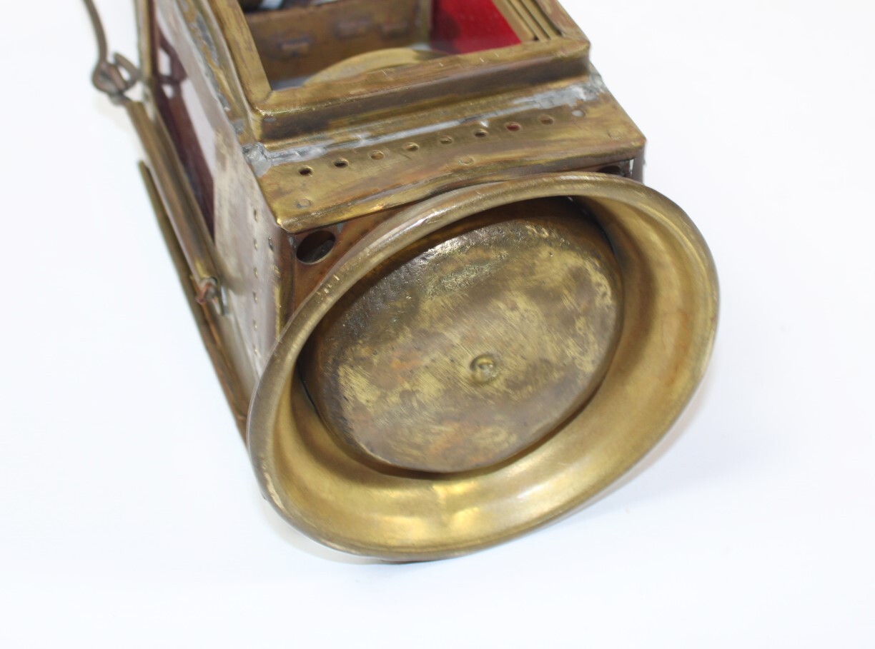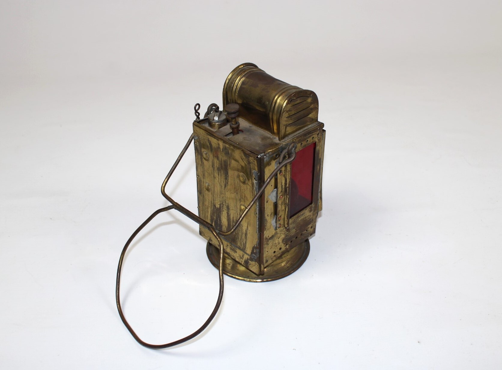 Een oude carbuurlamp / carbidlamp /acetyleenlamp. Waarschijnlijk een spoorweglamp omwille van het rode glas aan de zijkant. Fabrikant: F. Rogiers-Roose, Lanternier, Bruxelles. Waarschijnlijk eerste helft 20ste eeuw.