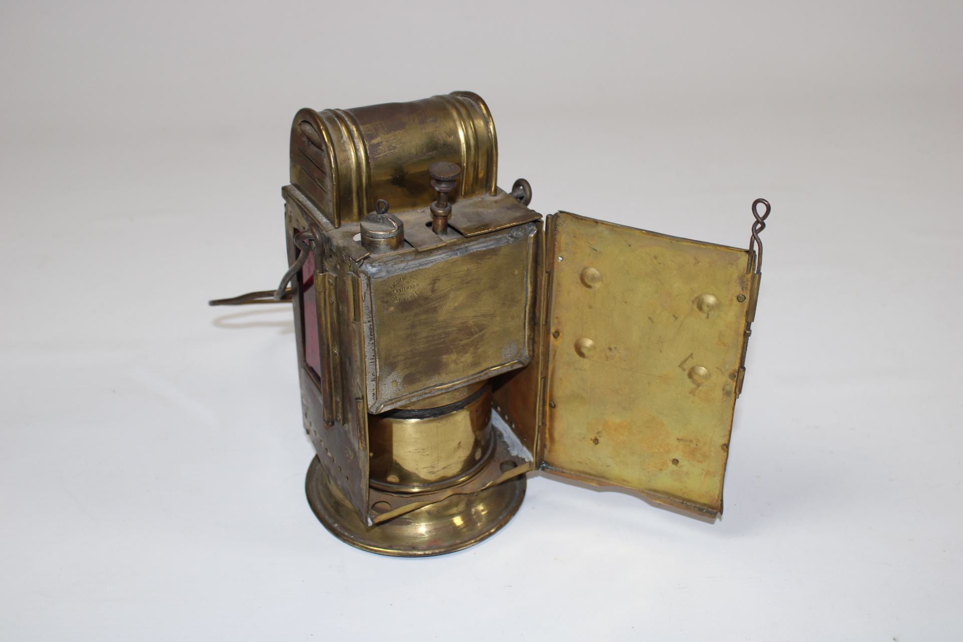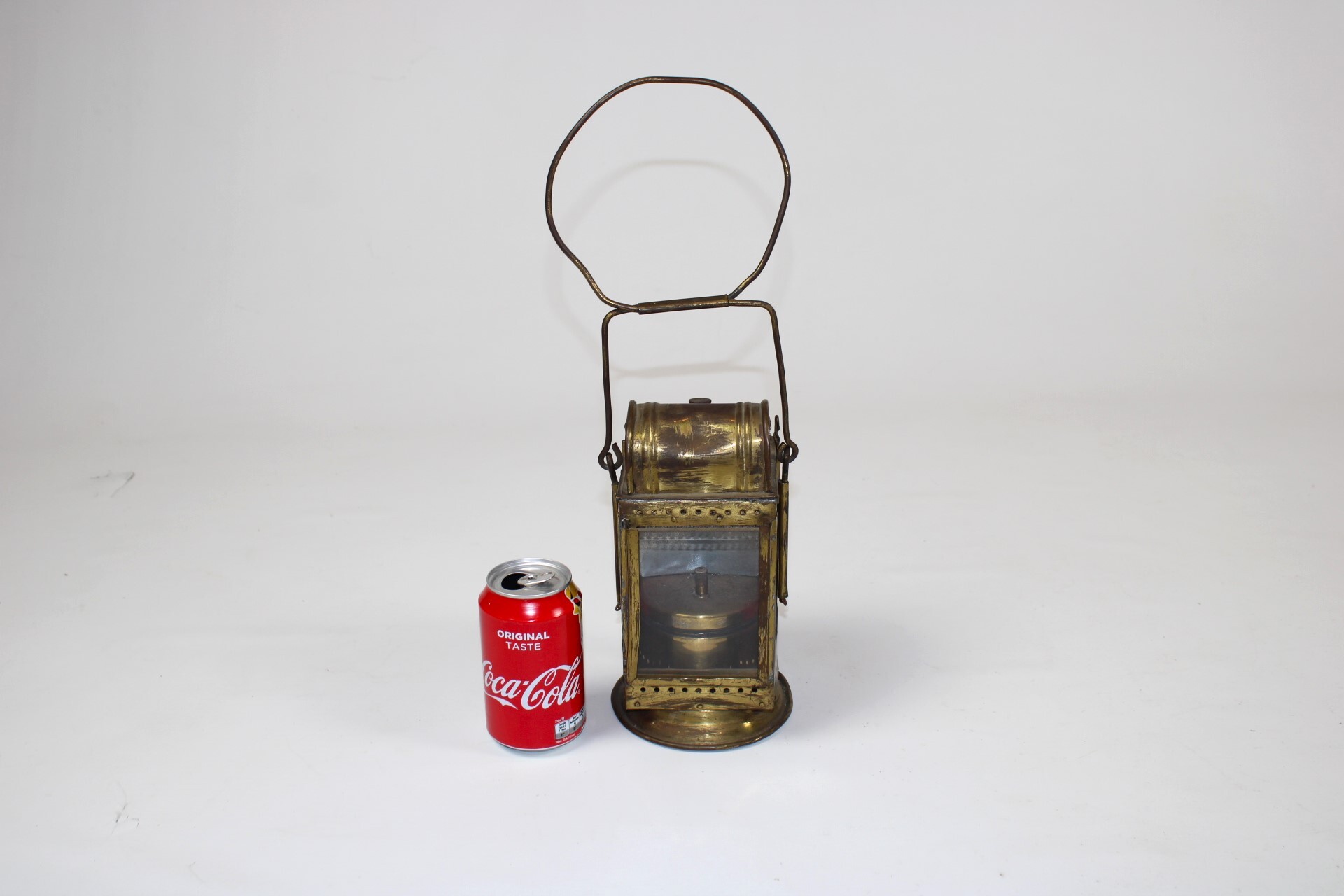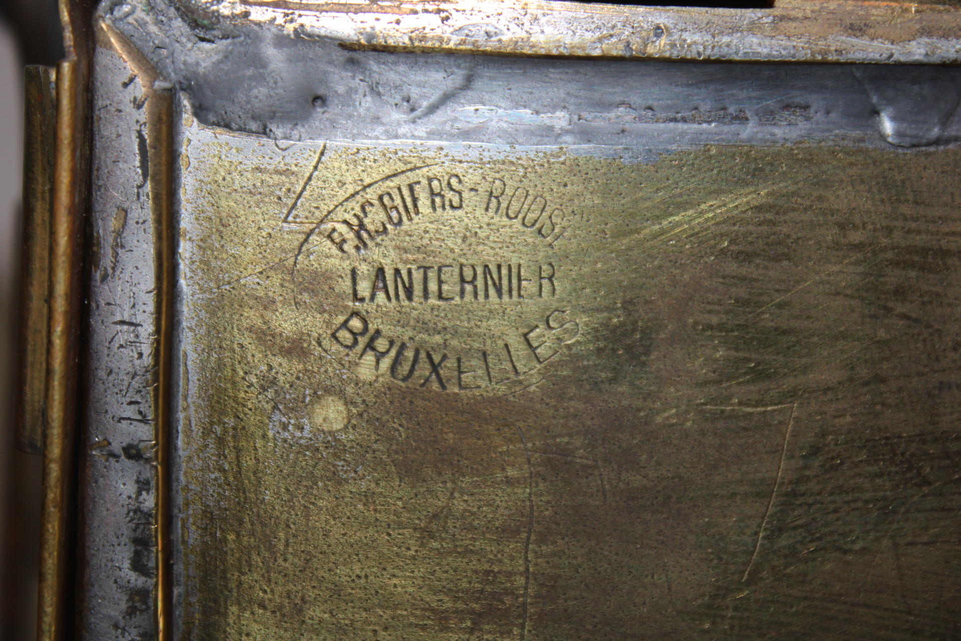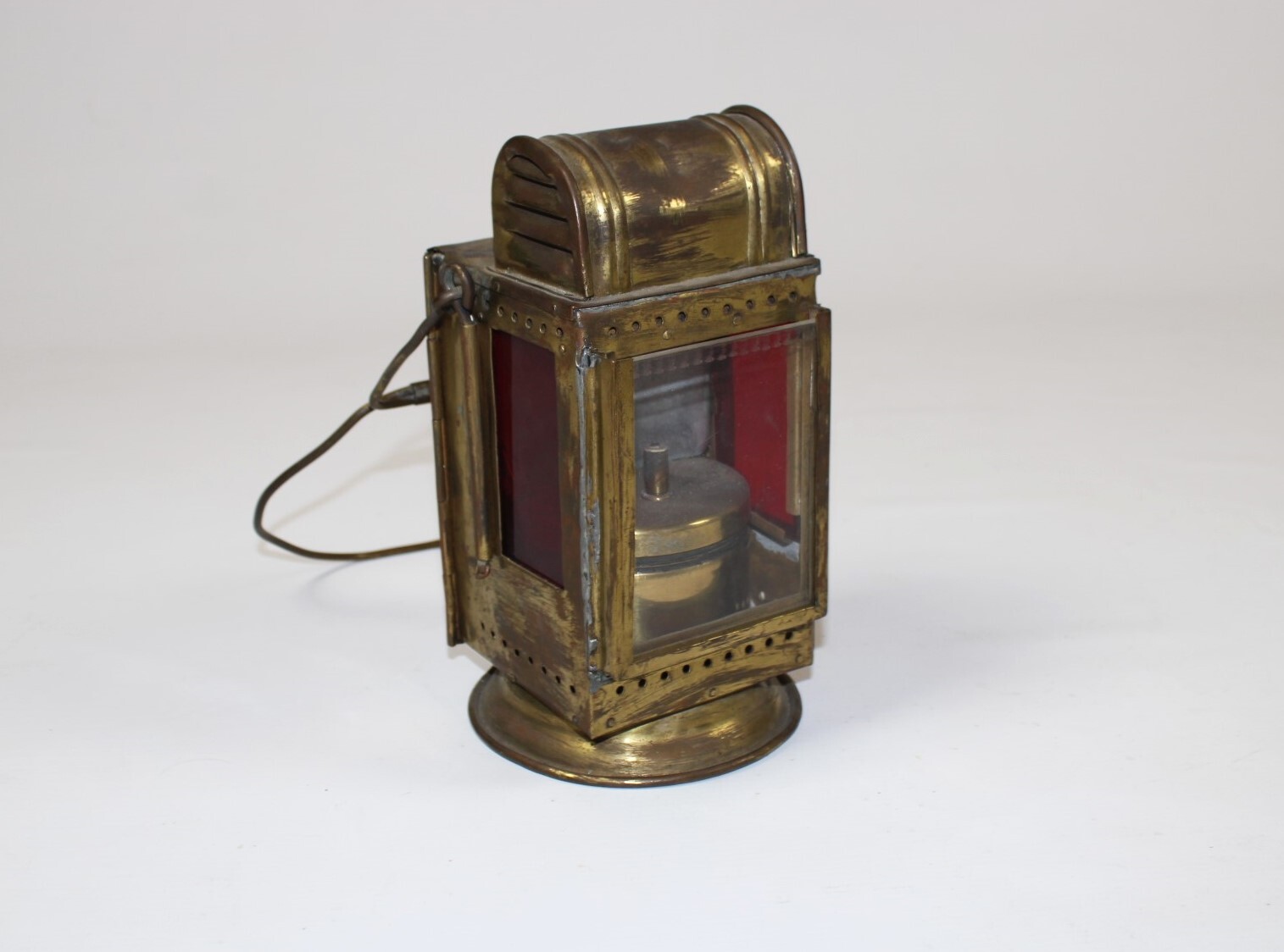 Een oude carbuurlamp / carbidlamp /acetyleenlamp. Waarschijnlijk een spoorweglamp omwille van het rode glas aan de zijkant. Fabrikant: F. Rogiers-Roose, Lanternier, Bruxelles. Waarschijnlijk eerste helft 20ste eeuw.