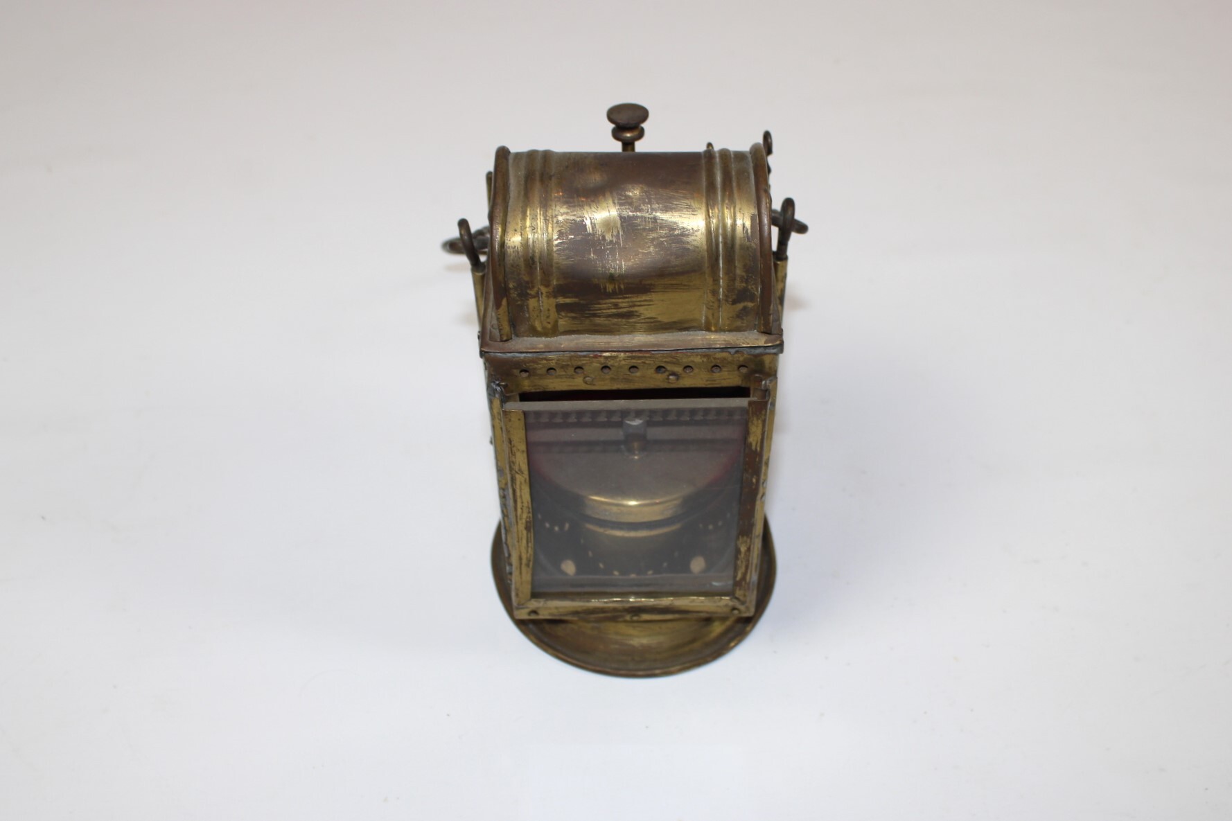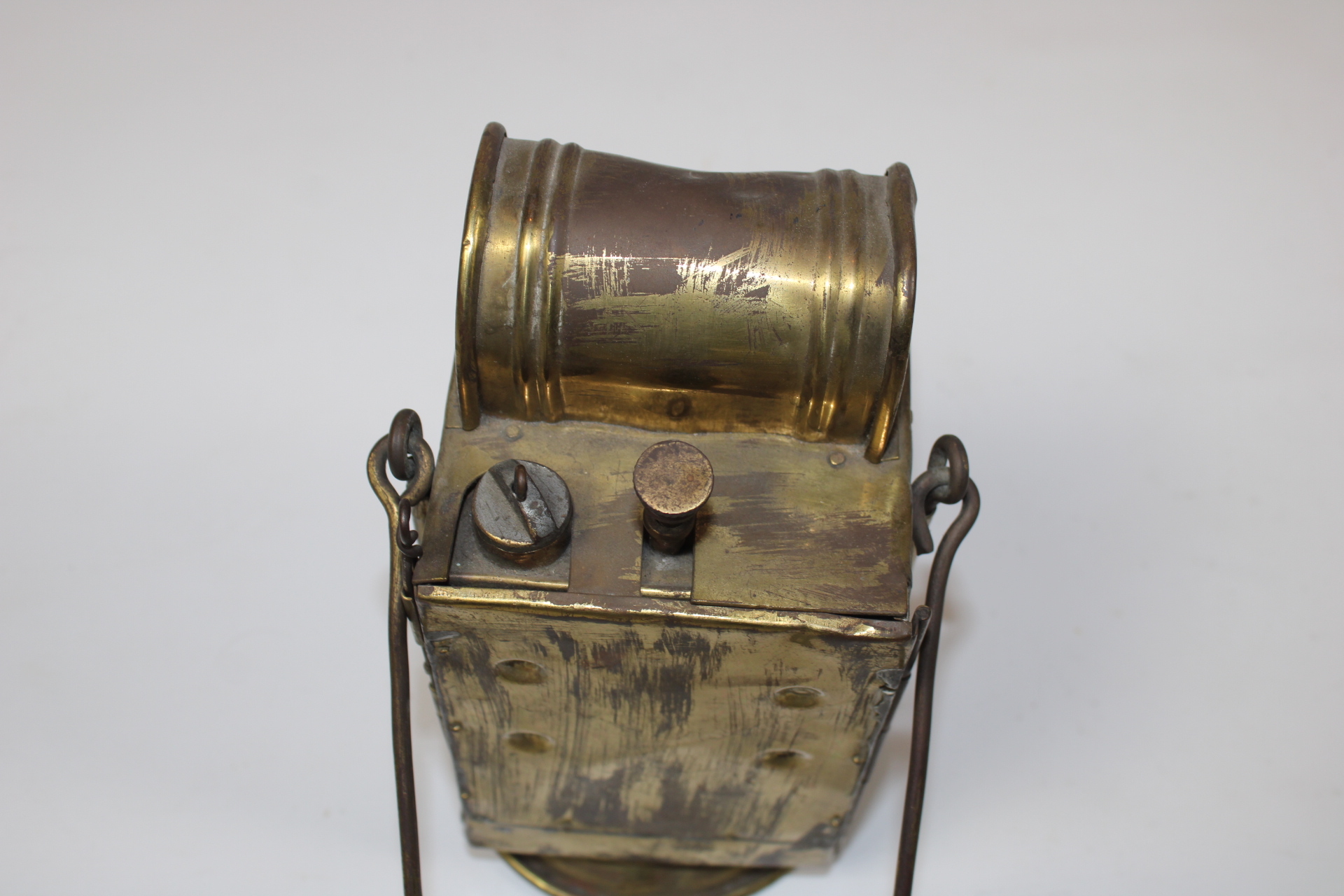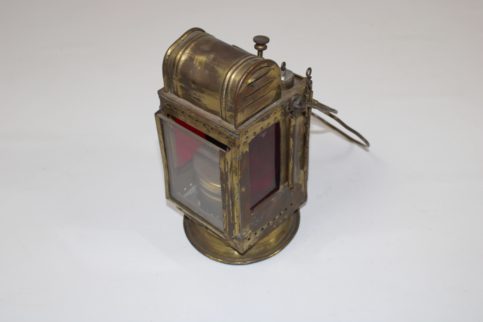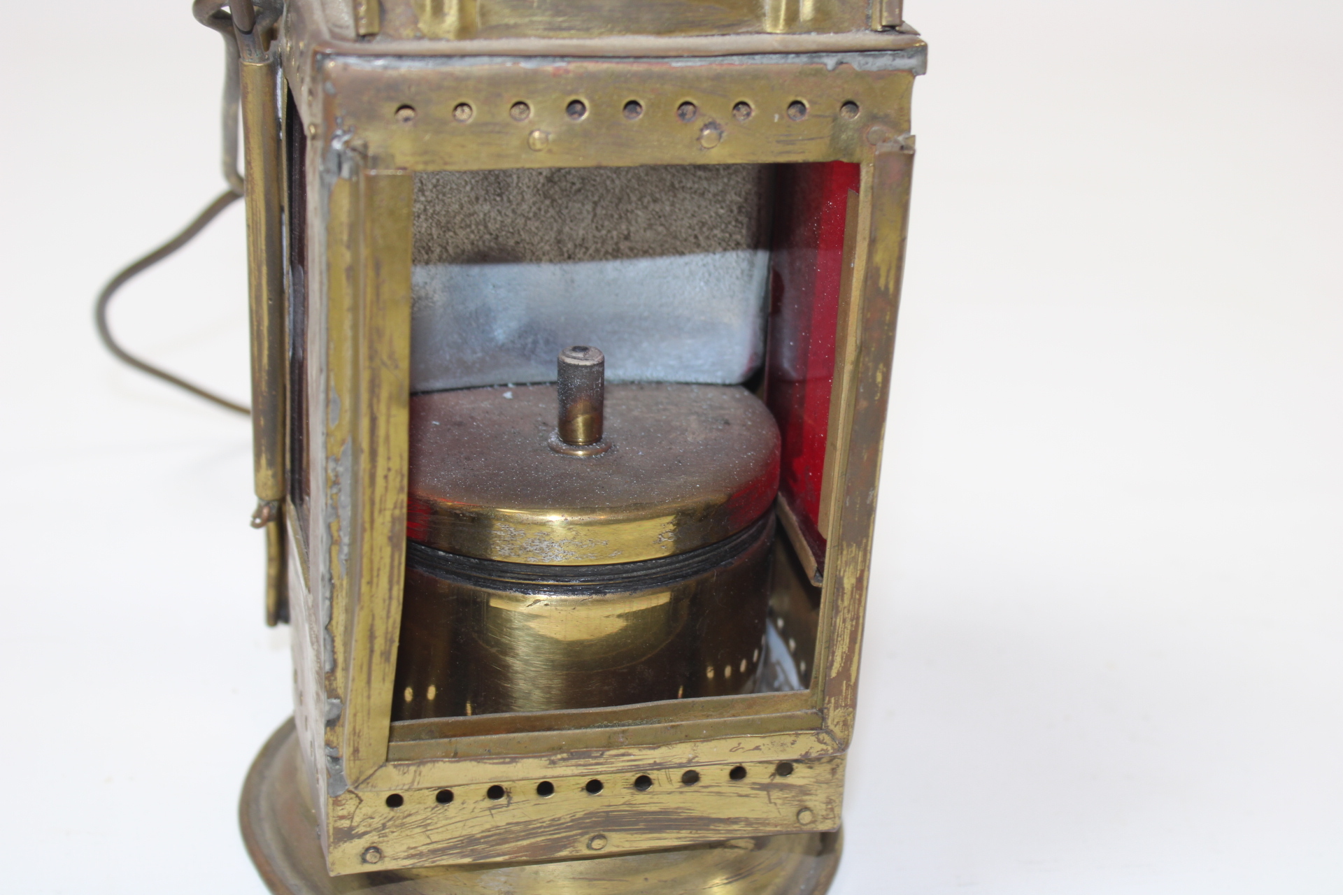 Een oude carbuurlamp / carbidlamp /acetyleenlamp. Waarschijnlijk een spoorweglamp omwille van het rode glas aan de zijkant. Fabrikant: F. Rogiers-Roose, Lanternier, Bruxelles. Waarschijnlijk eerste helft 20ste eeuw.
