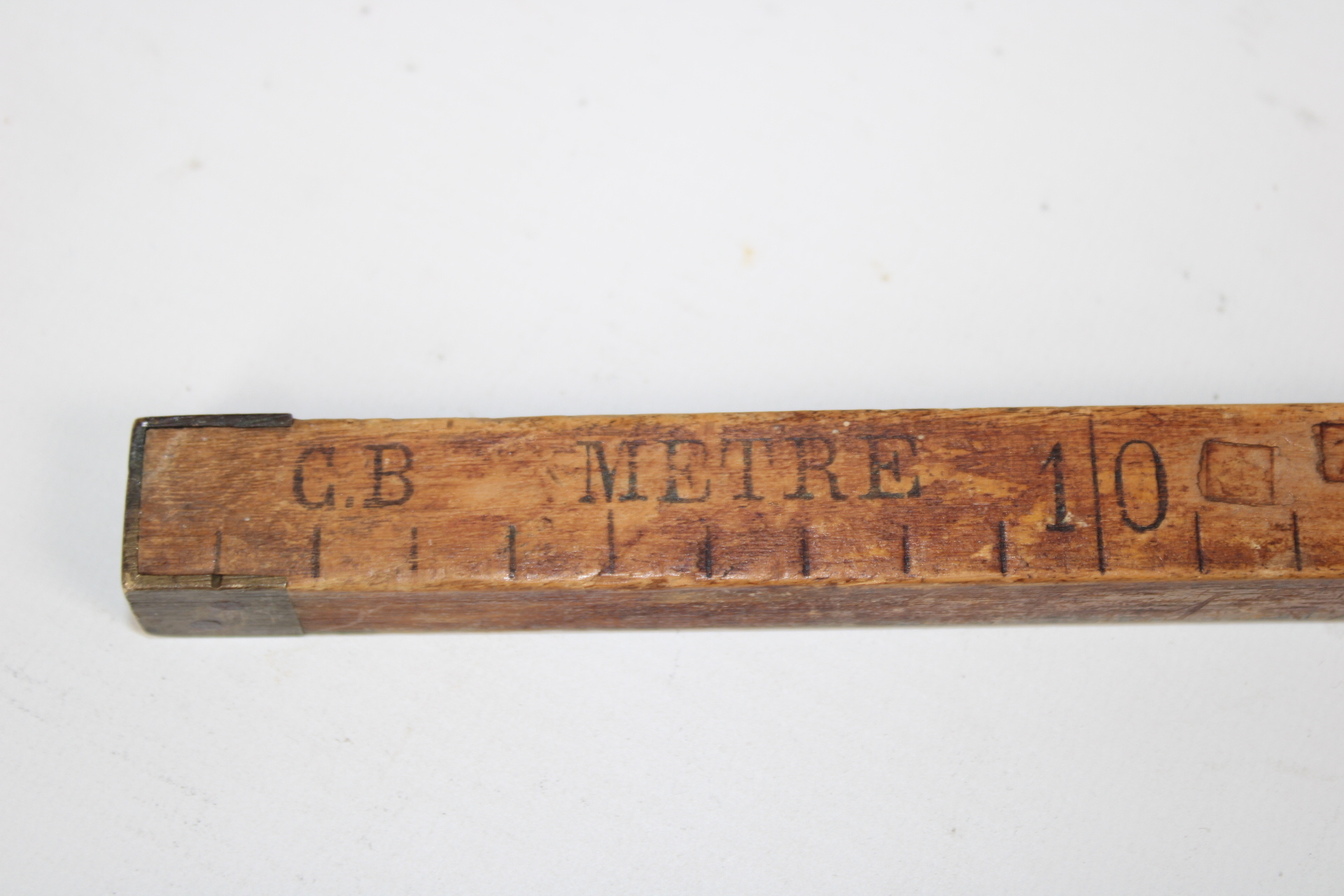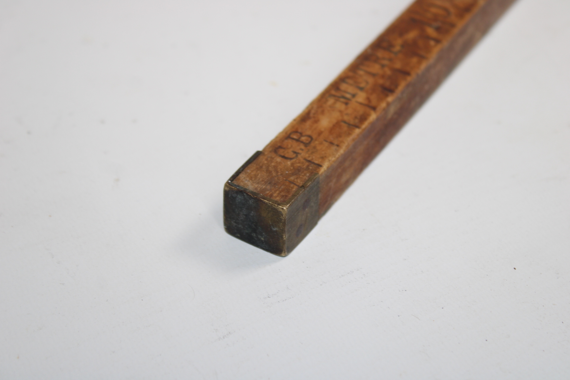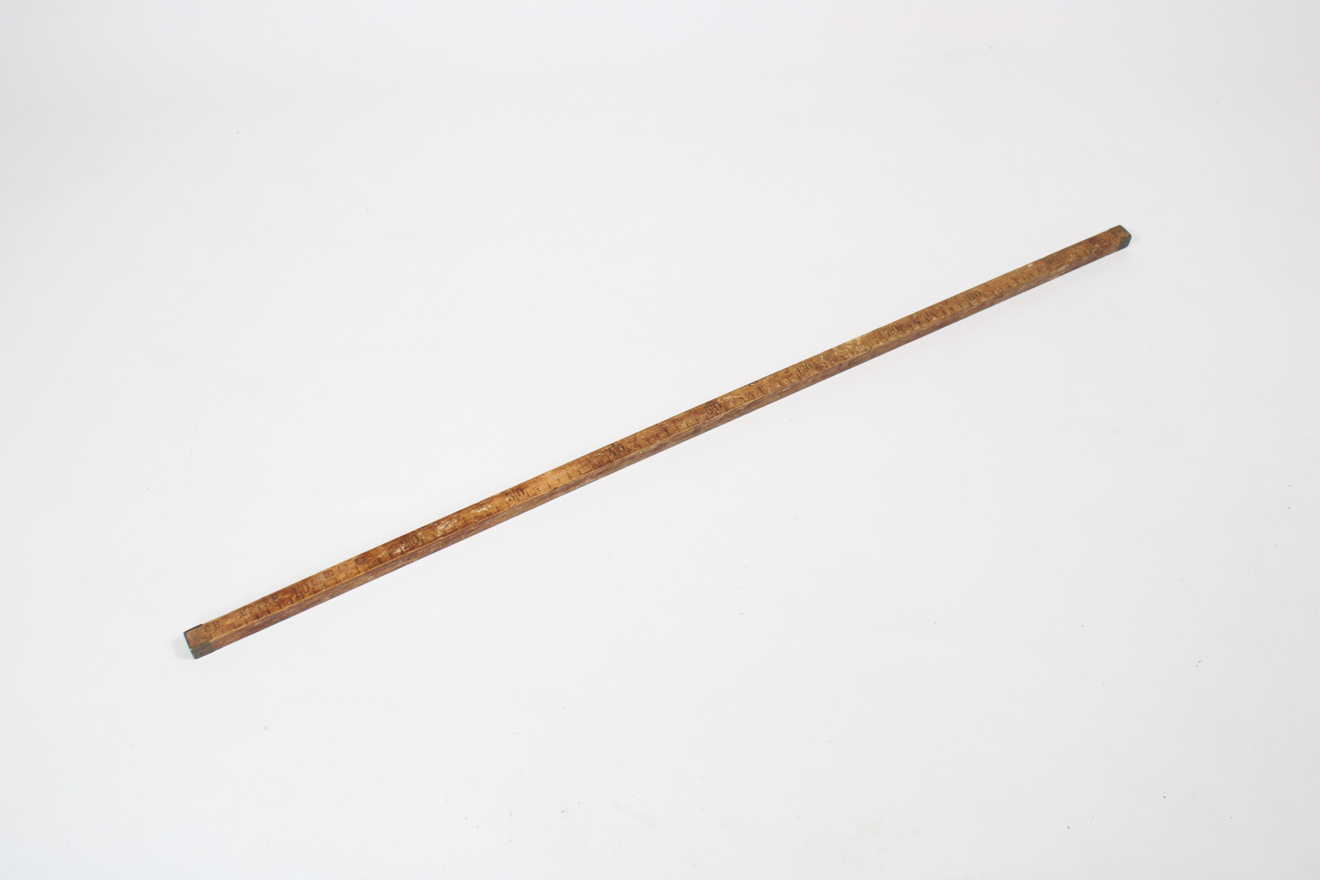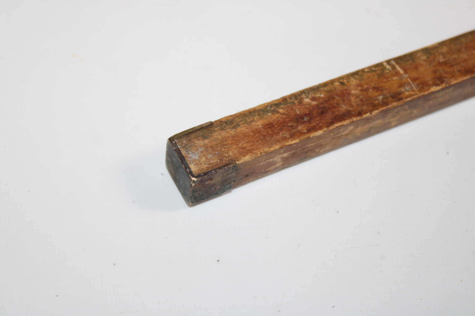 Wooden ruler from a tailor. With metal reinforcements on the edges and stamps as control marks .