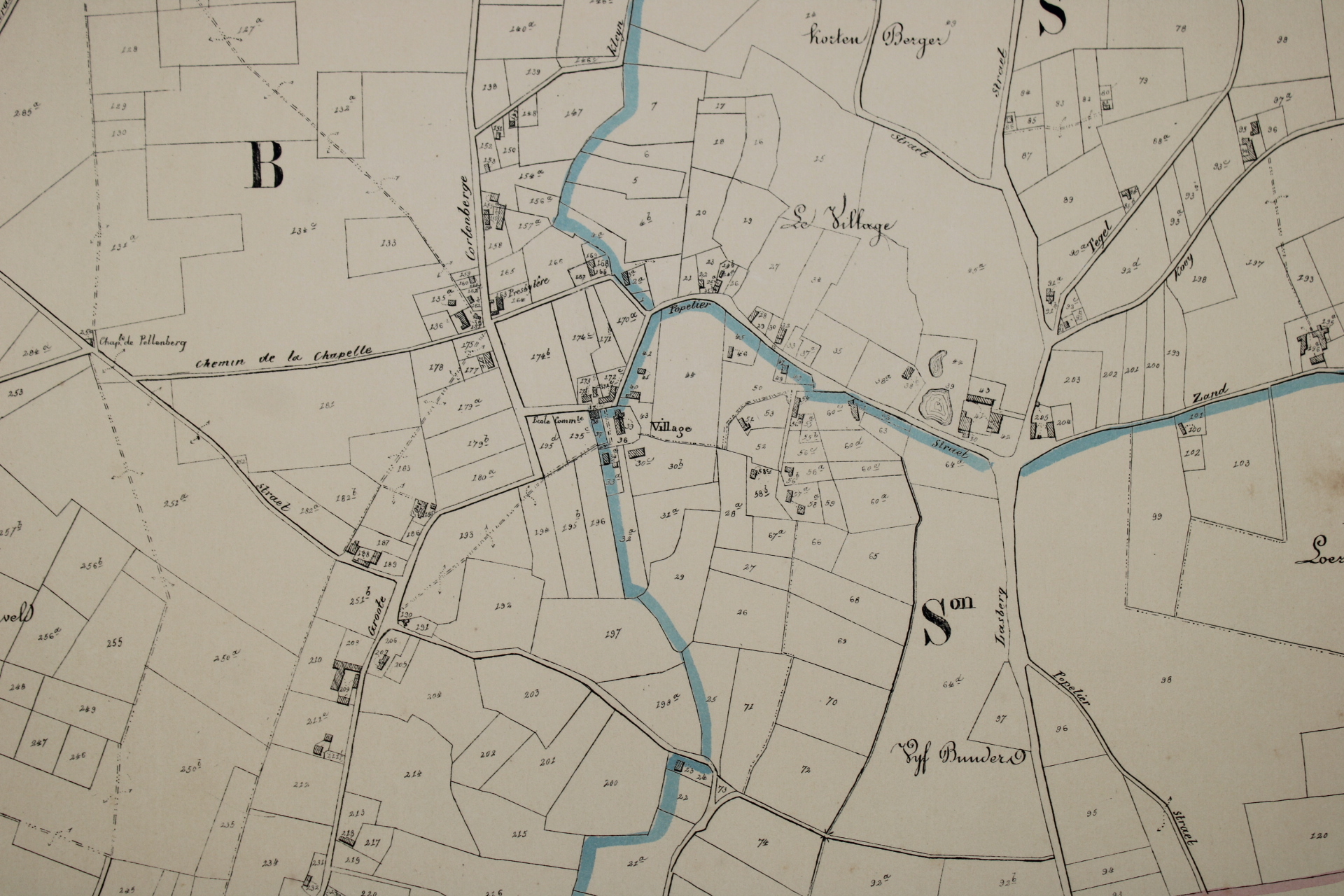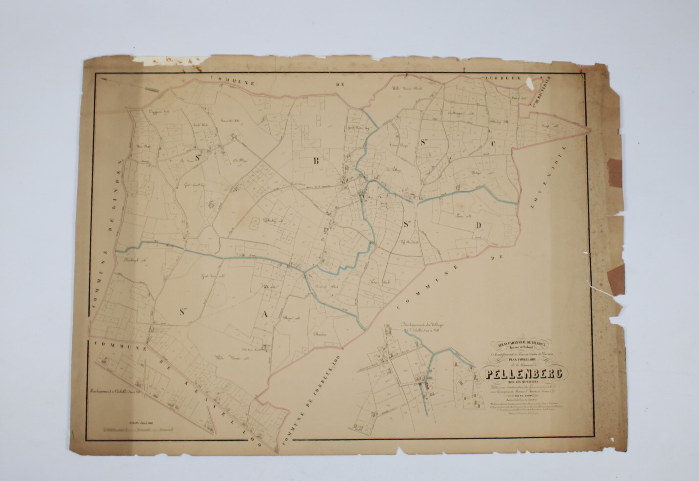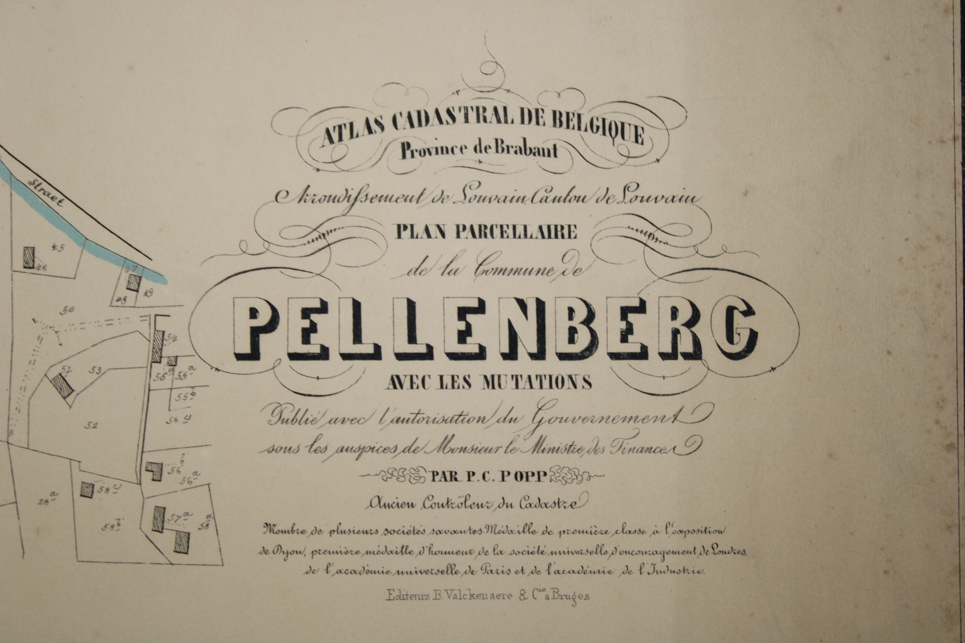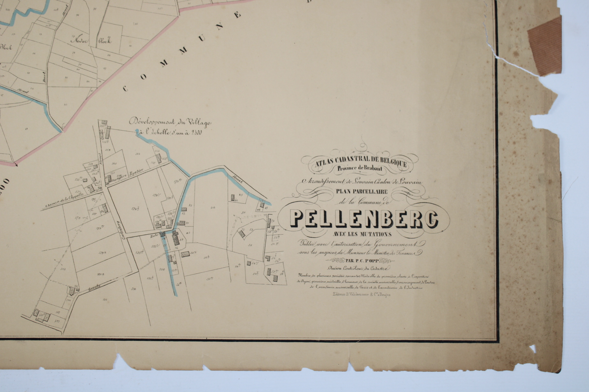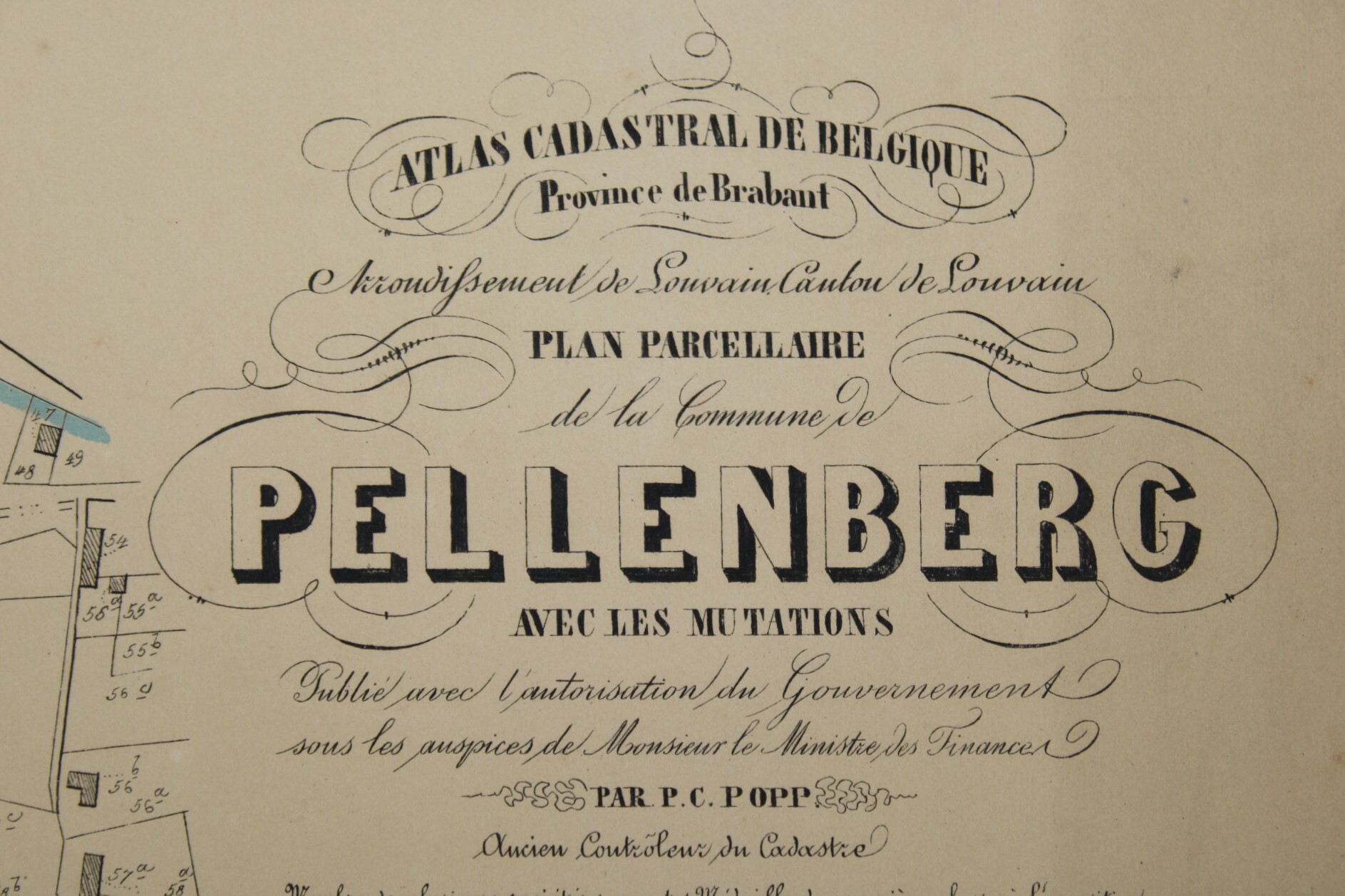 Old map by P.C. Popp of Pellenberg. These maps were used by notaries and surveyors and were among the first cadastral maps. They offer highly detailed depictions of plots and houses, including a detail of the village center.