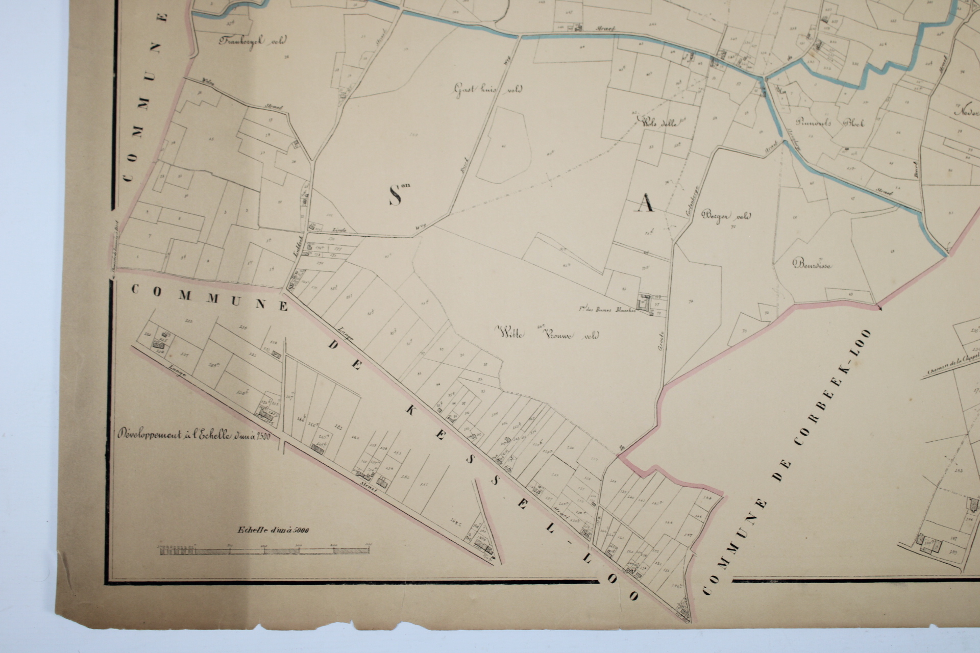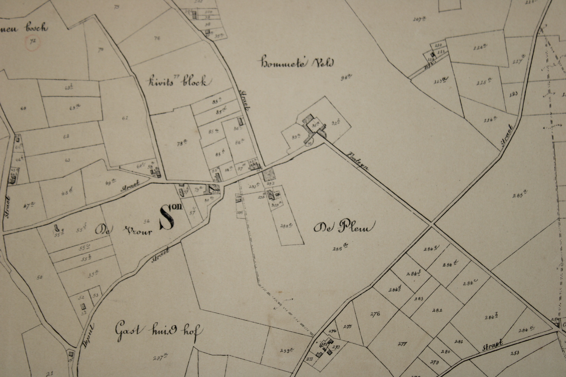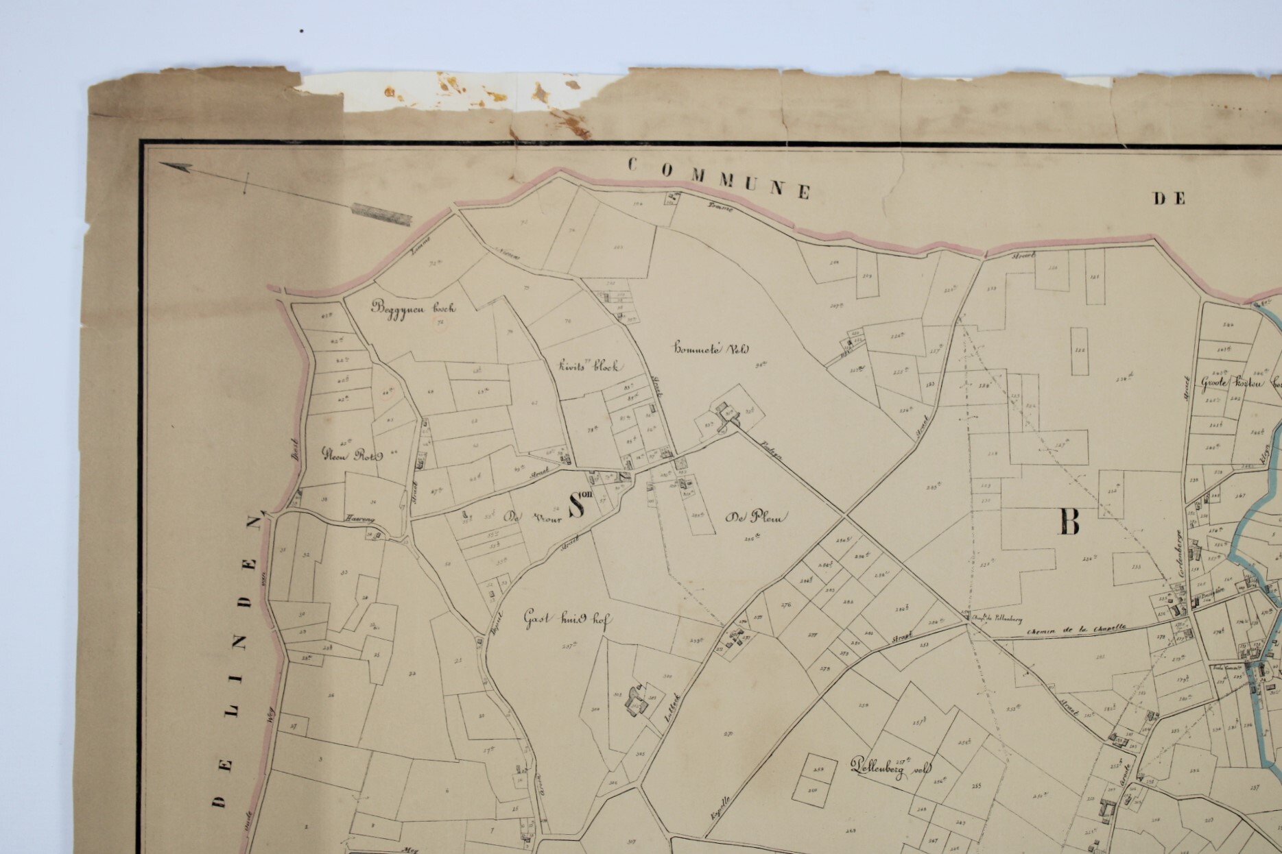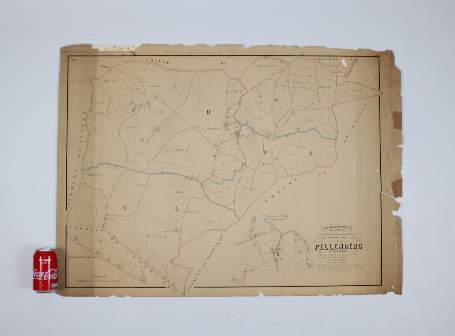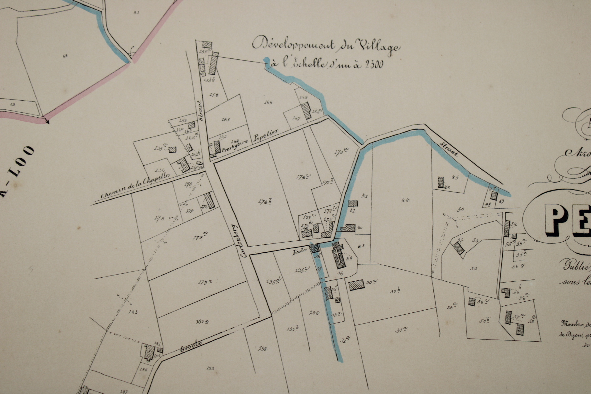 Old map by P.C. Popp of Pellenberg. These maps were used by notaries and surveyors and were among the first cadastral maps. They offer highly detailed depictions of plots and houses, including a detail of the village center.