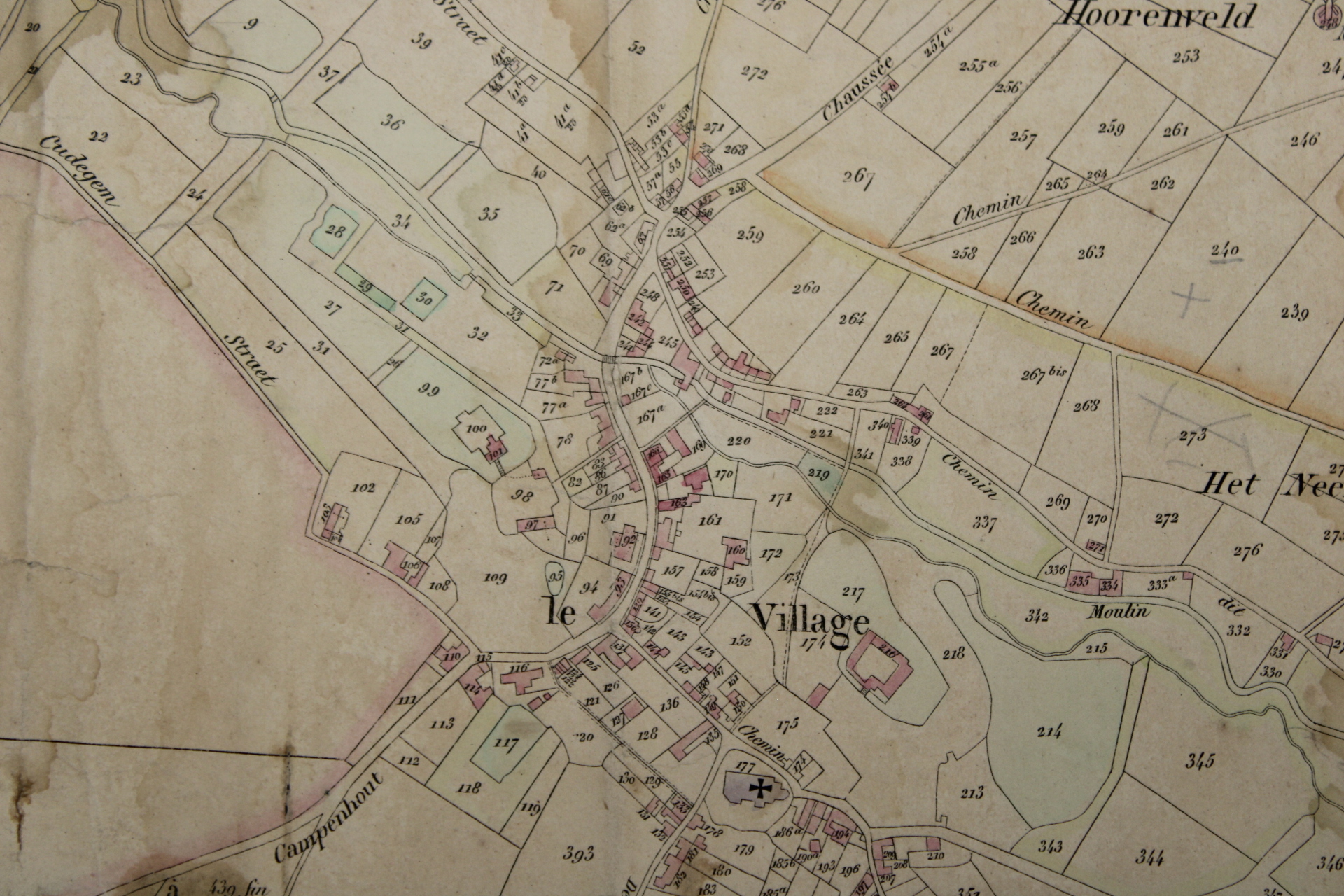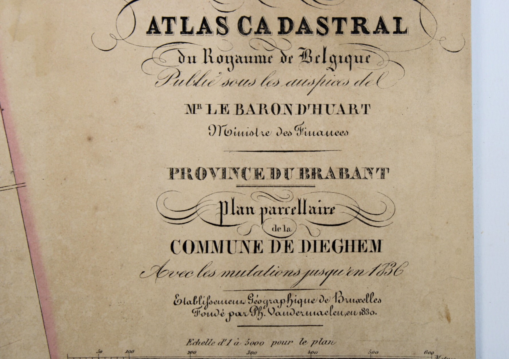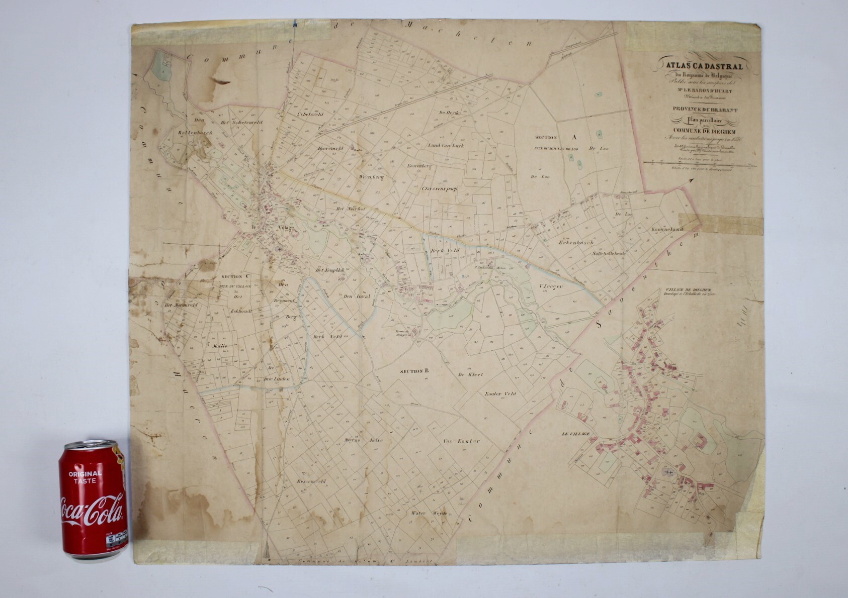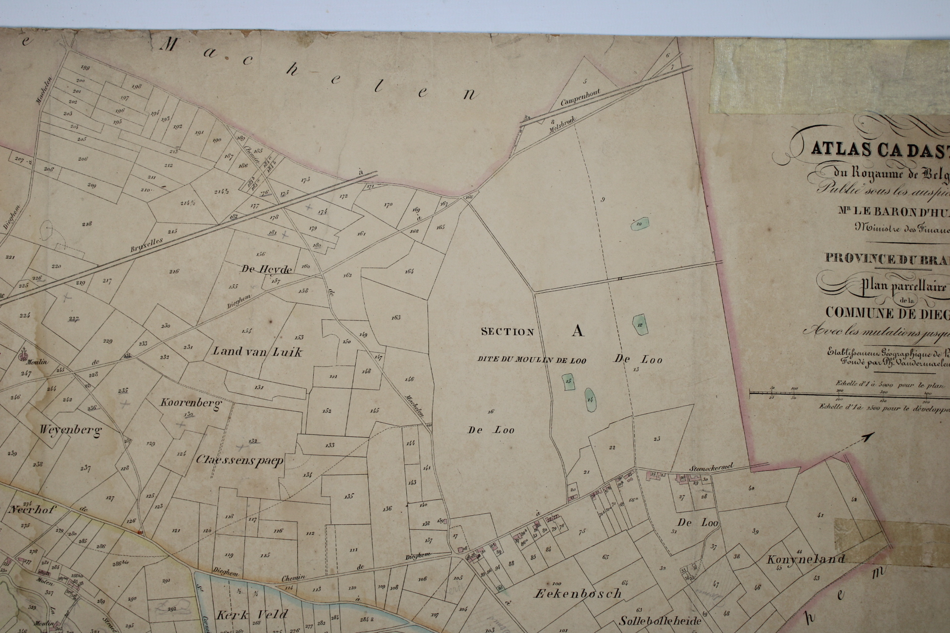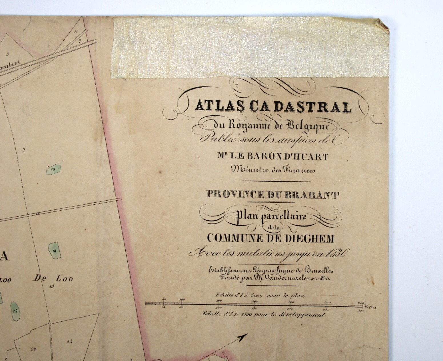 Old map by Philippe Vandermaelen of Diegem (Dieghem). These maps were used by notaries and surveyors and were among the first cadastral maps. They offer highly detailed depictions of plots and houses, including a detail of the village center.