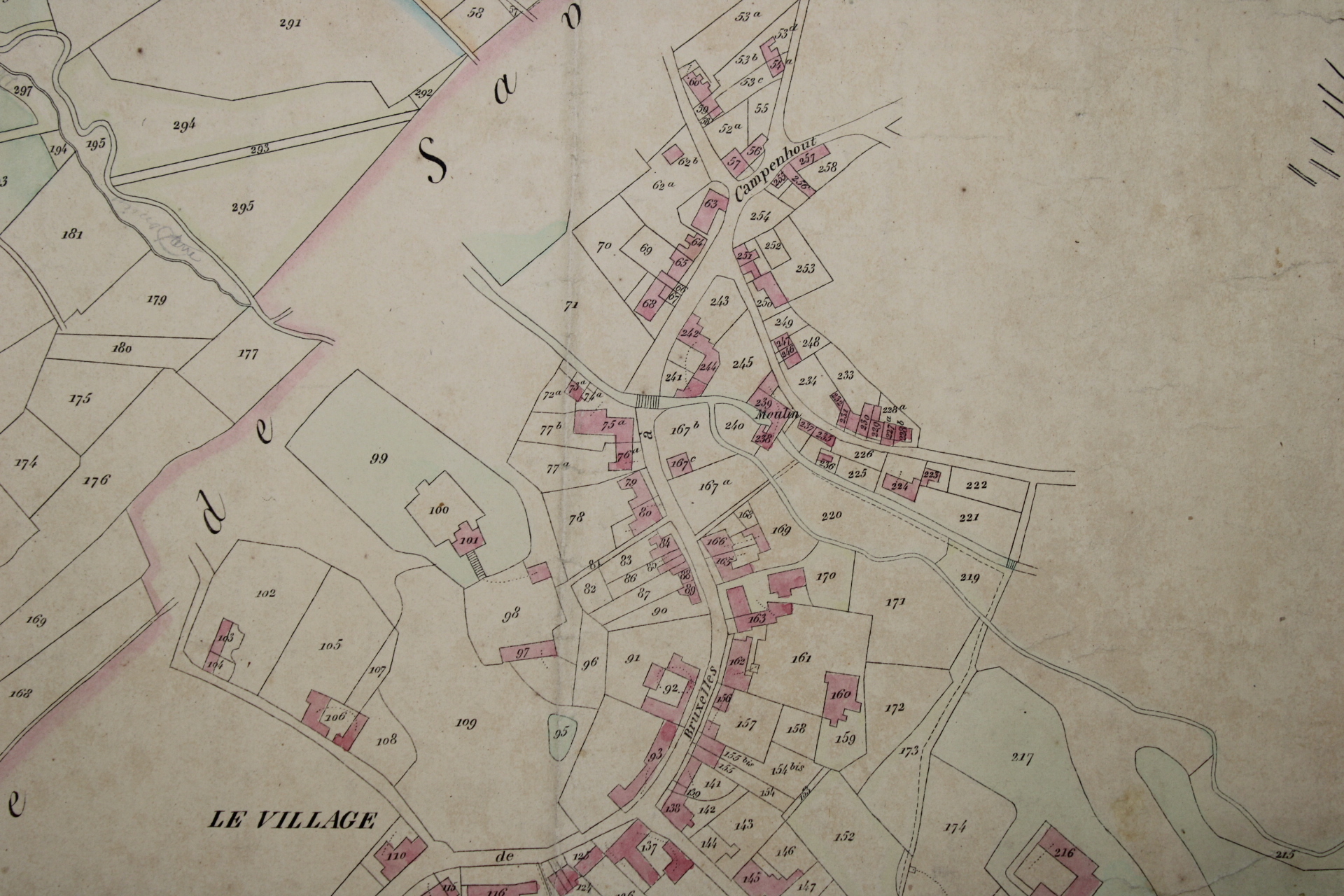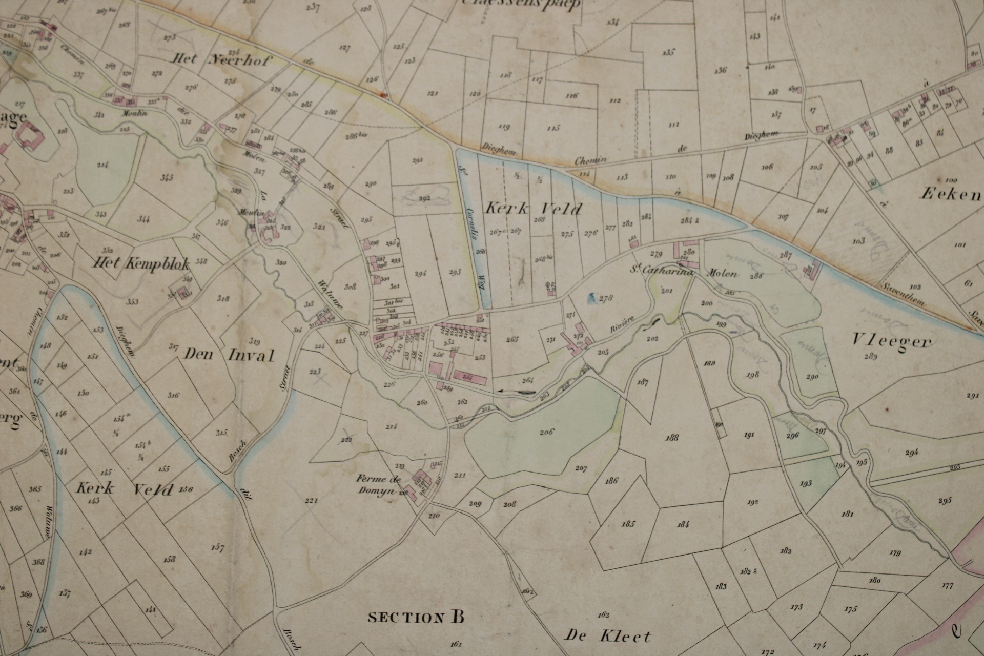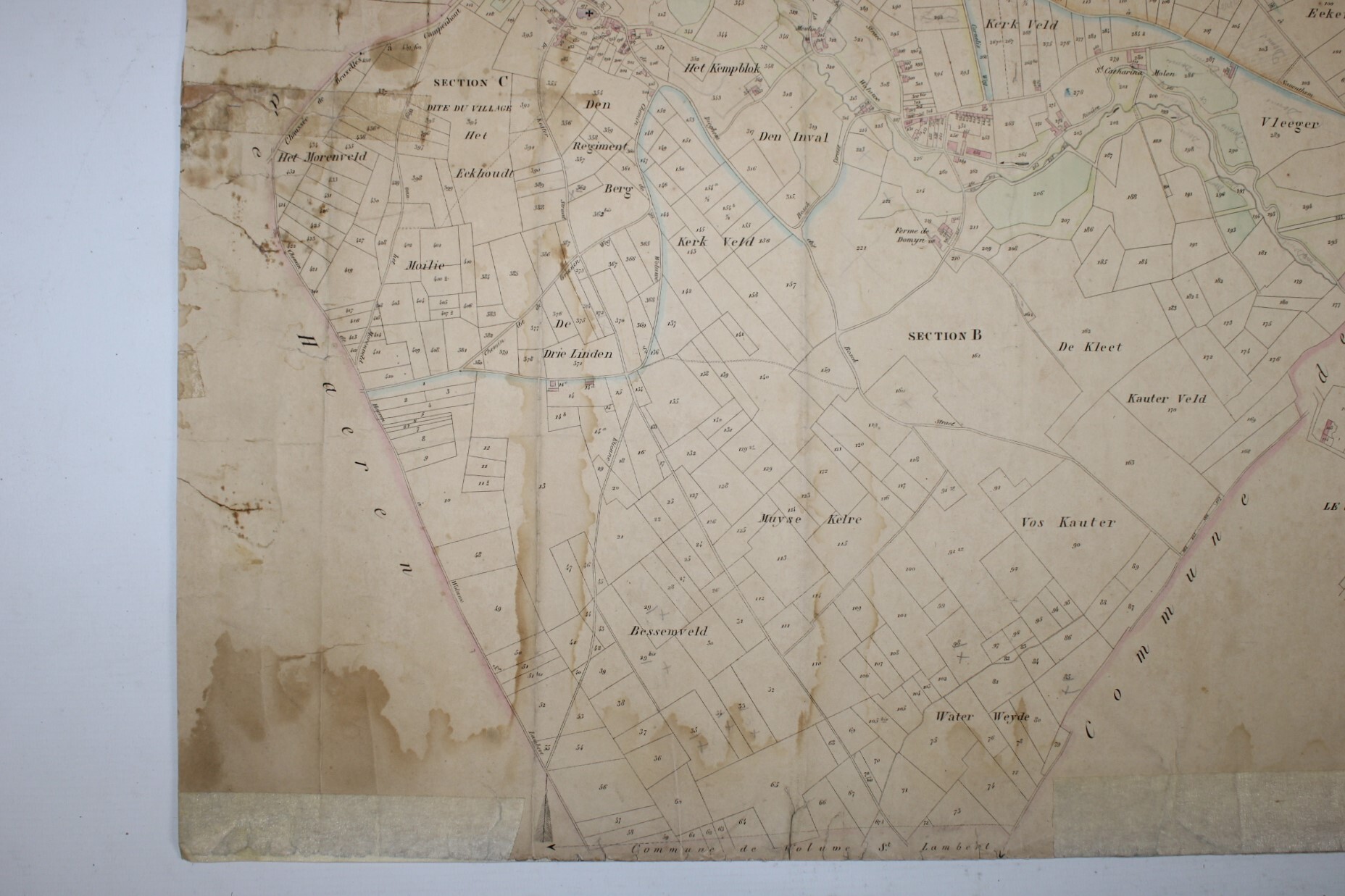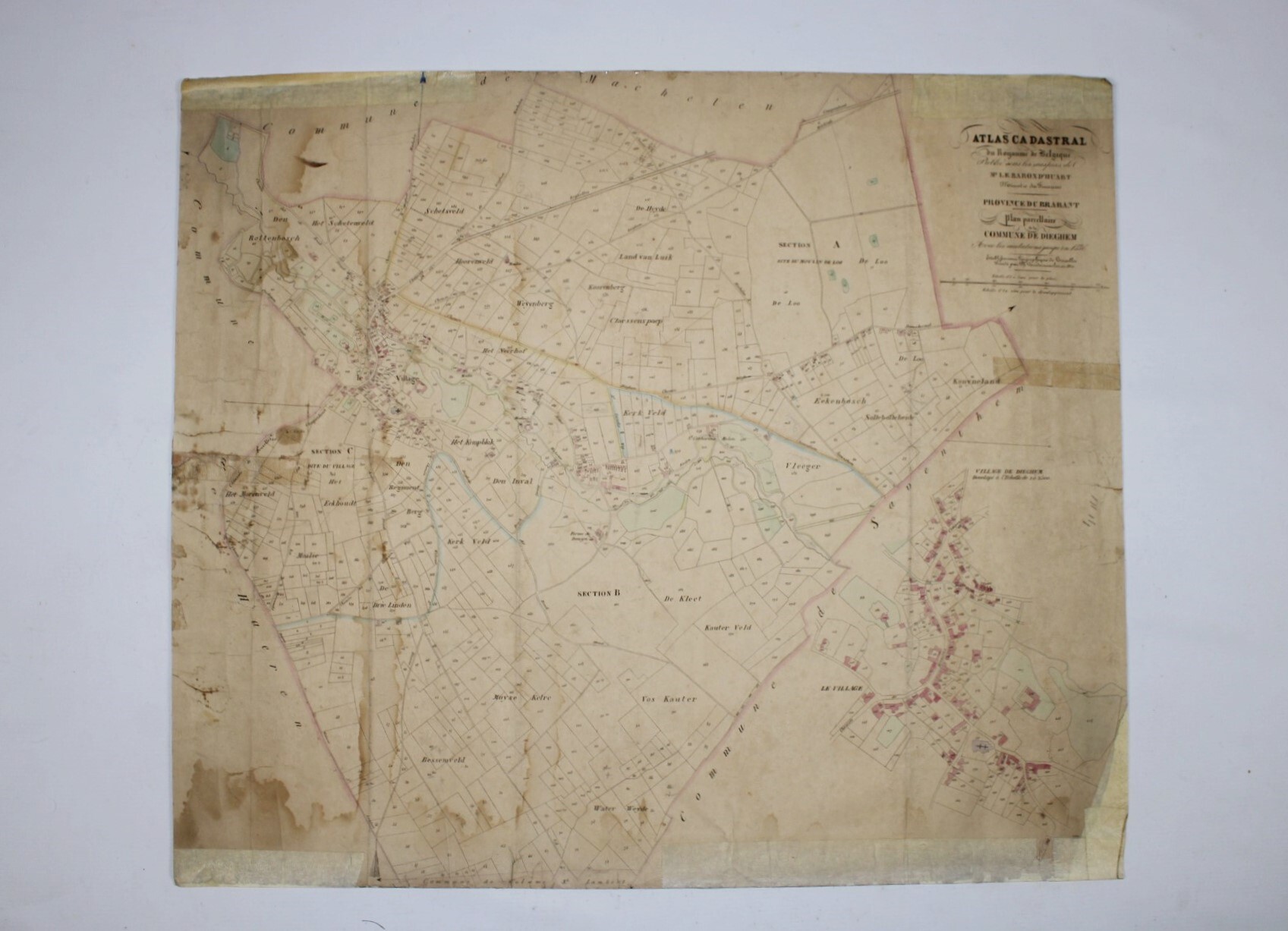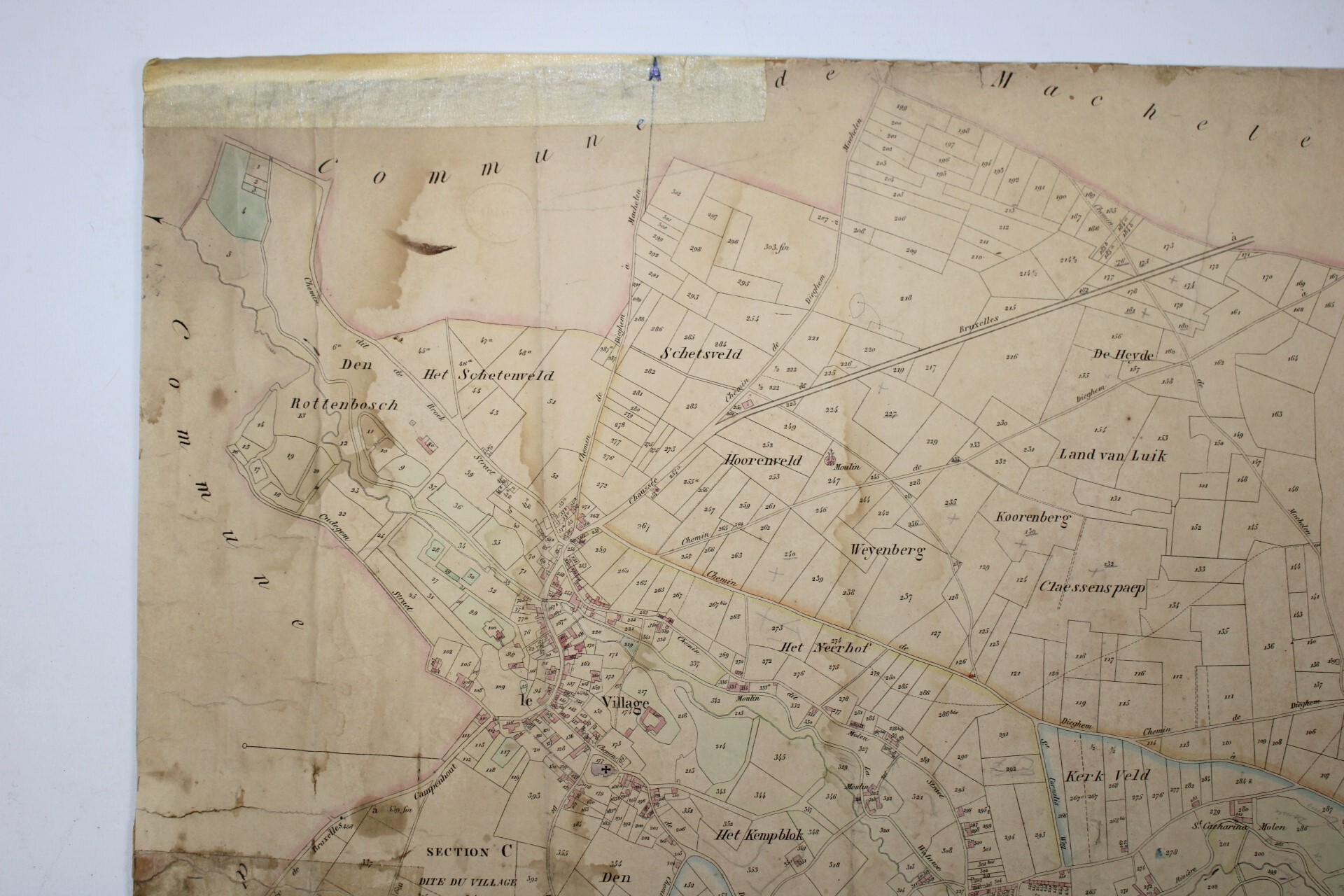 Old map by Philippe Vandermaelen of Diegem (Dieghem). These maps were used by notaries and surveyors and were among the first cadastral maps. They offer highly detailed depictions of plots and houses, including a detail of the village center.