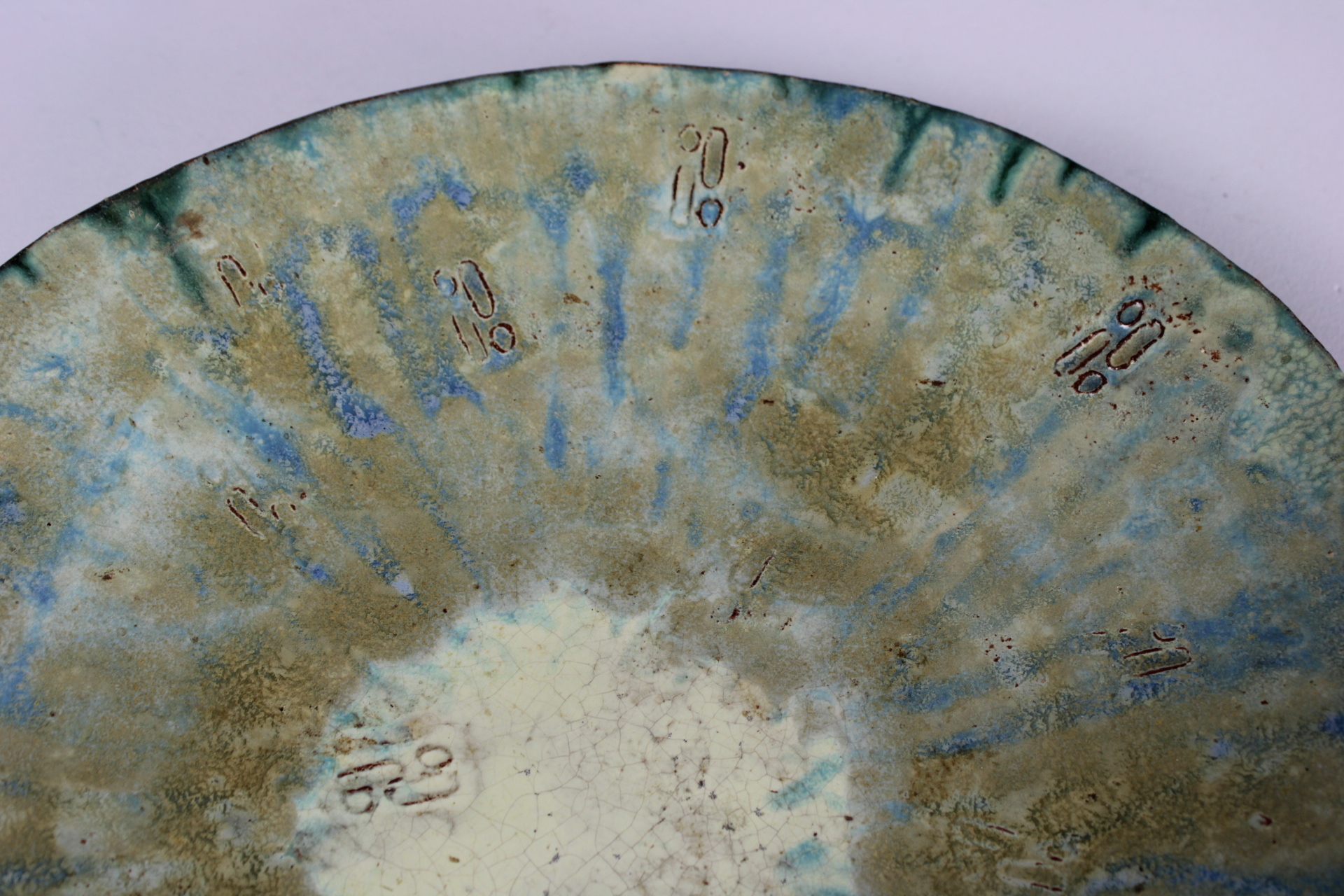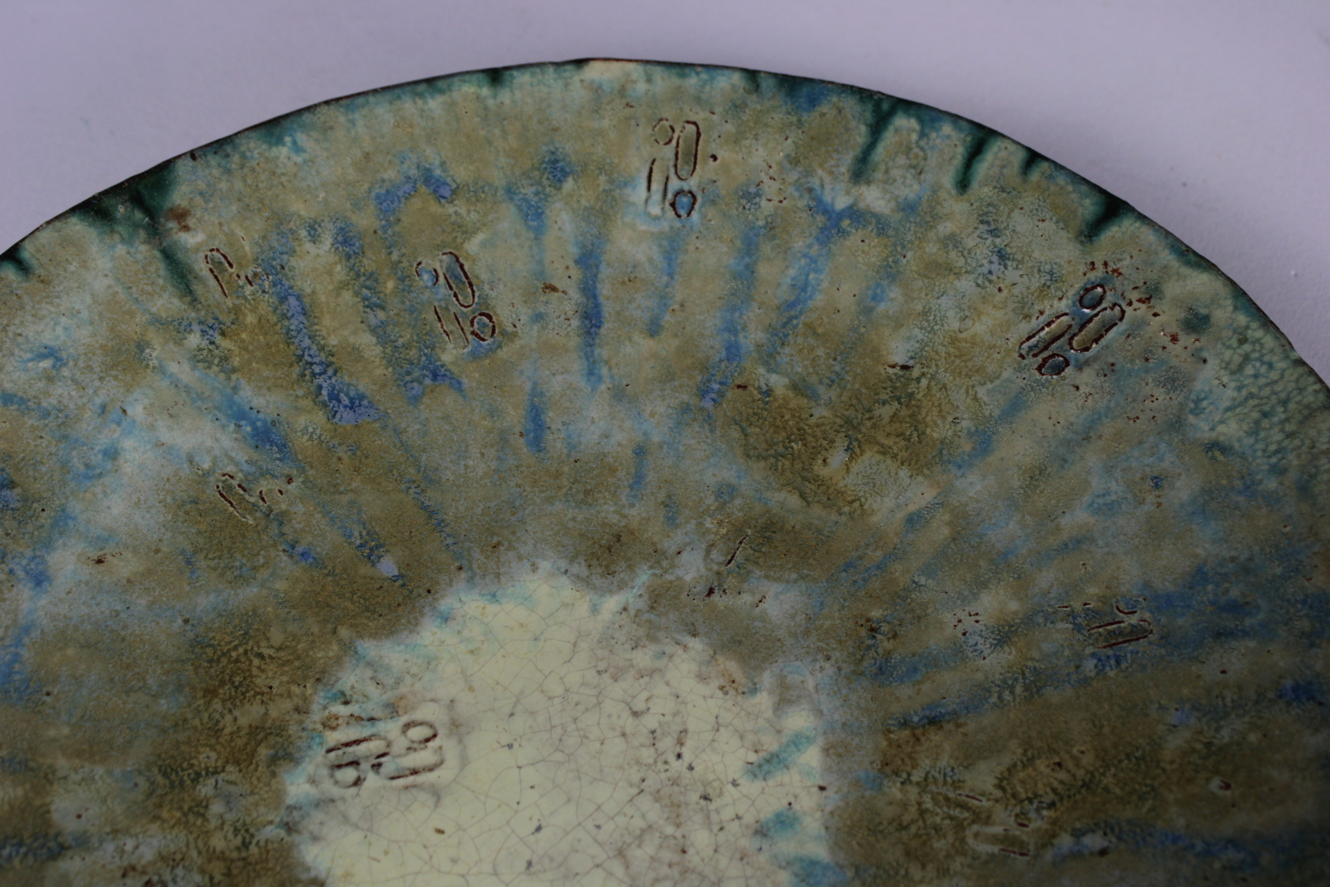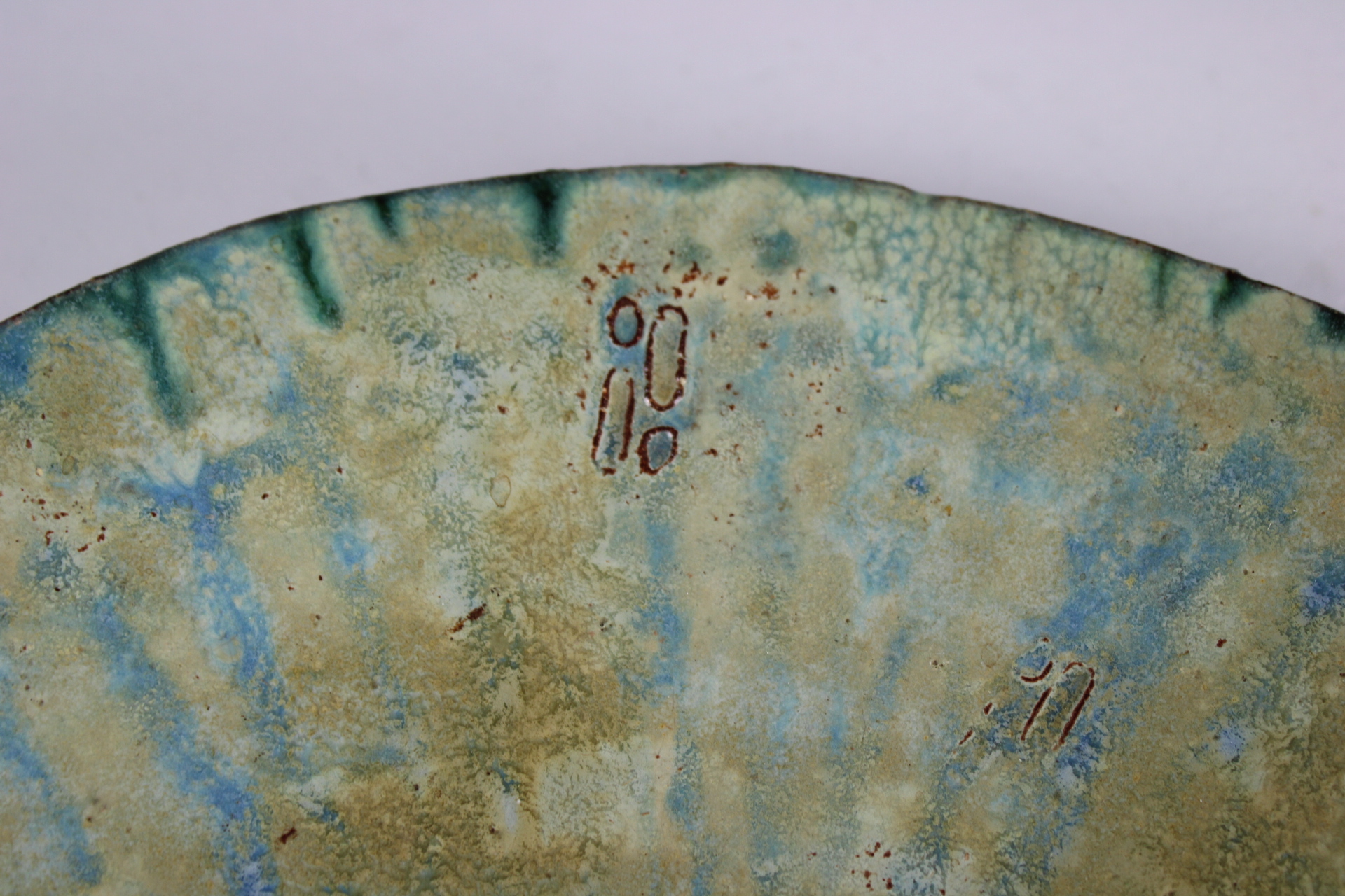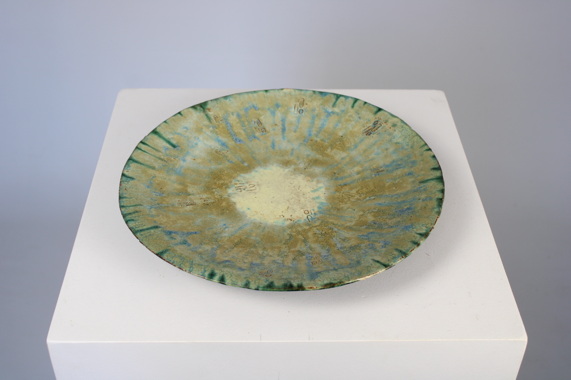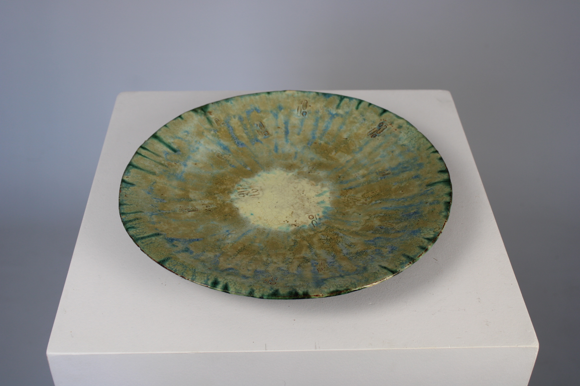 A glazed platter with soft blue-green-gray colors and light decoration in relief. Vintage. Signed on the bottom. In very good condition.