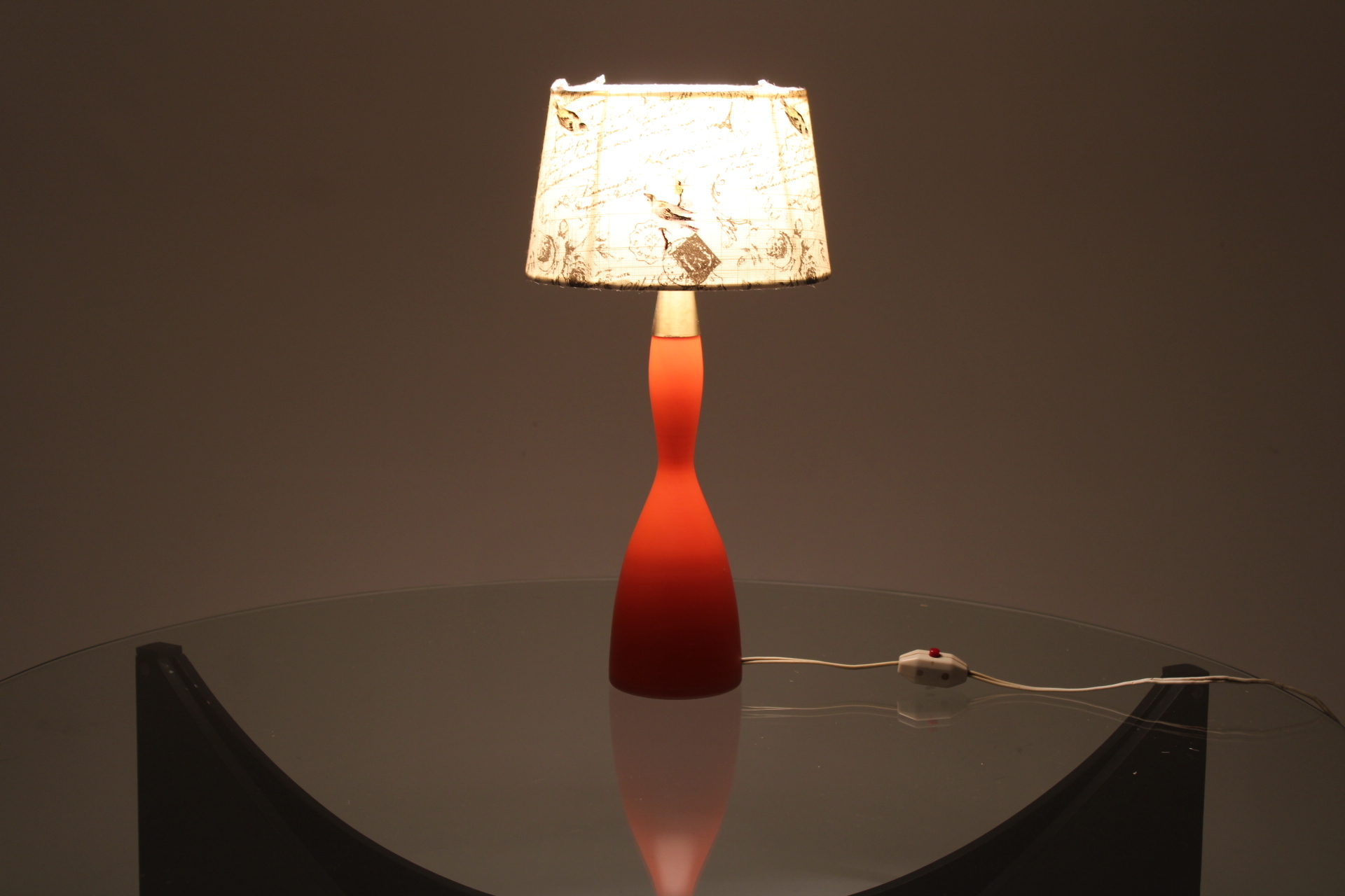 This original orange vintage table lamp was manufactured by the Kastrup Holmegaard glass factory in Denmark. Designed by Bent Nordsted for Kastrup-Holmegaard. Danish design from the 60s-70s. The lamp has an orange glass base and a non-original lampshade (a new lampshade can be attached to the metal base).