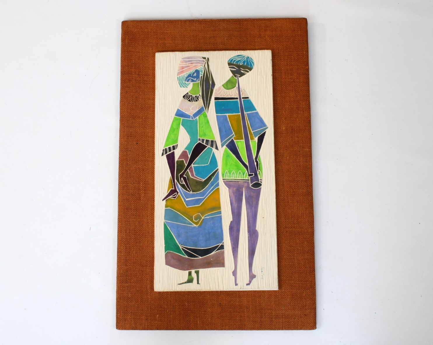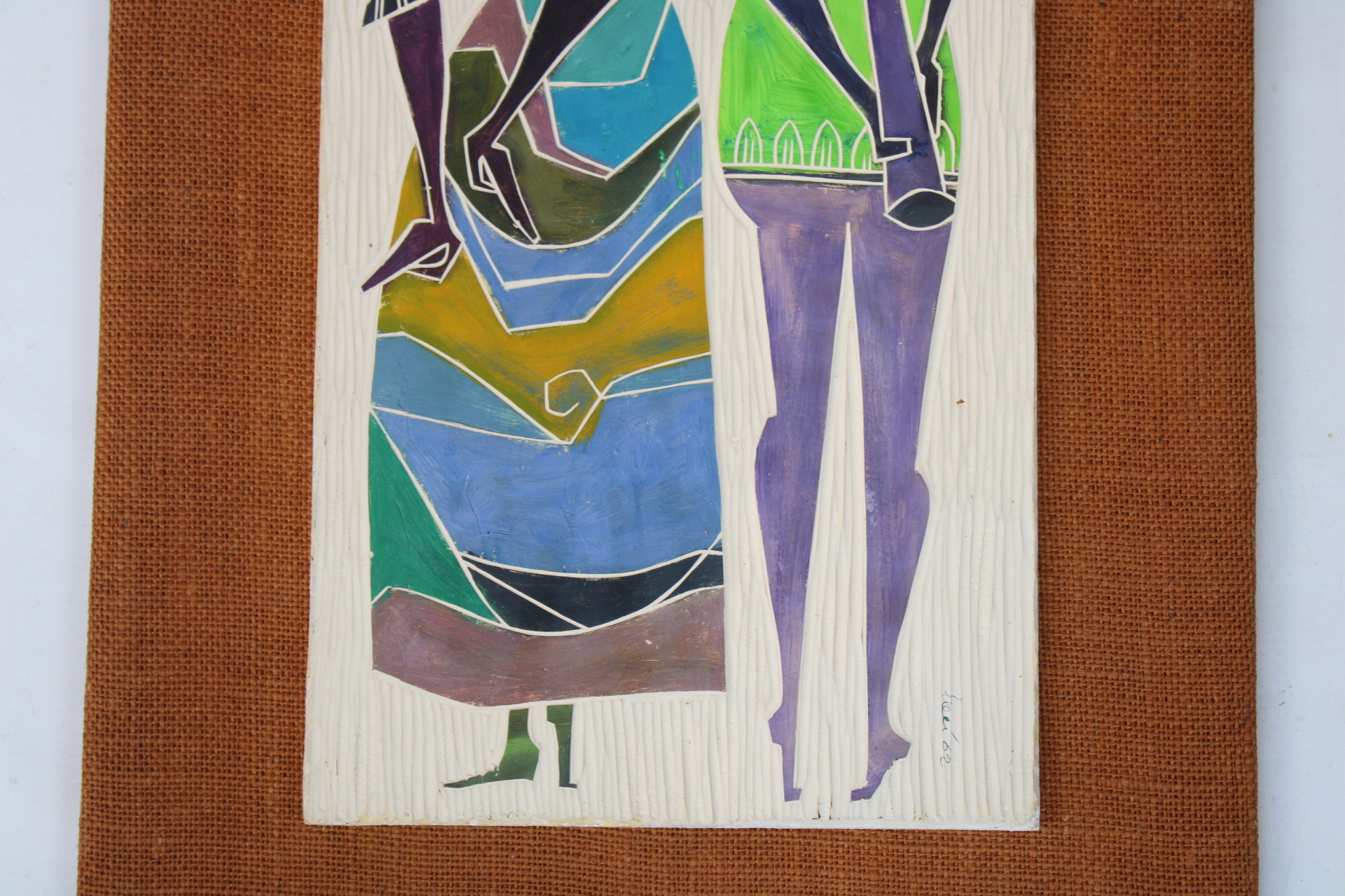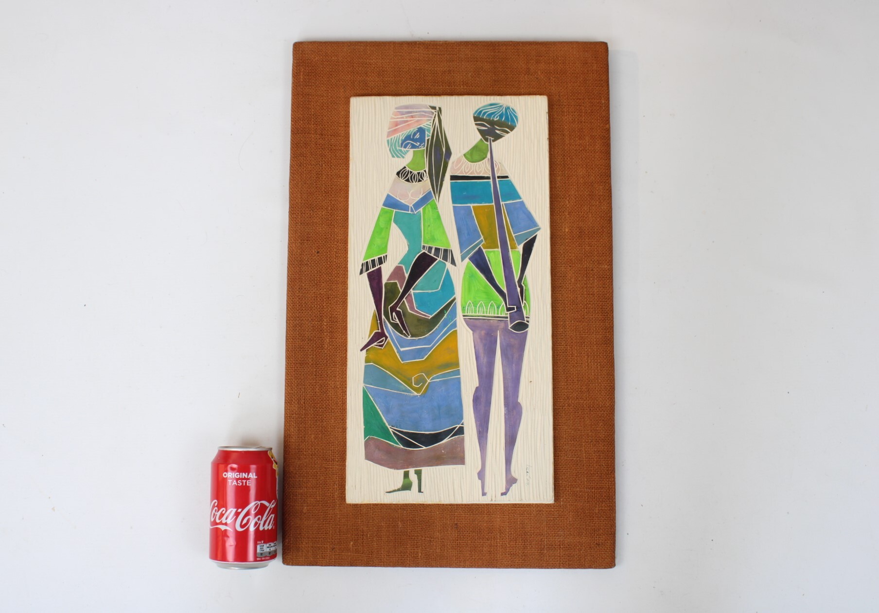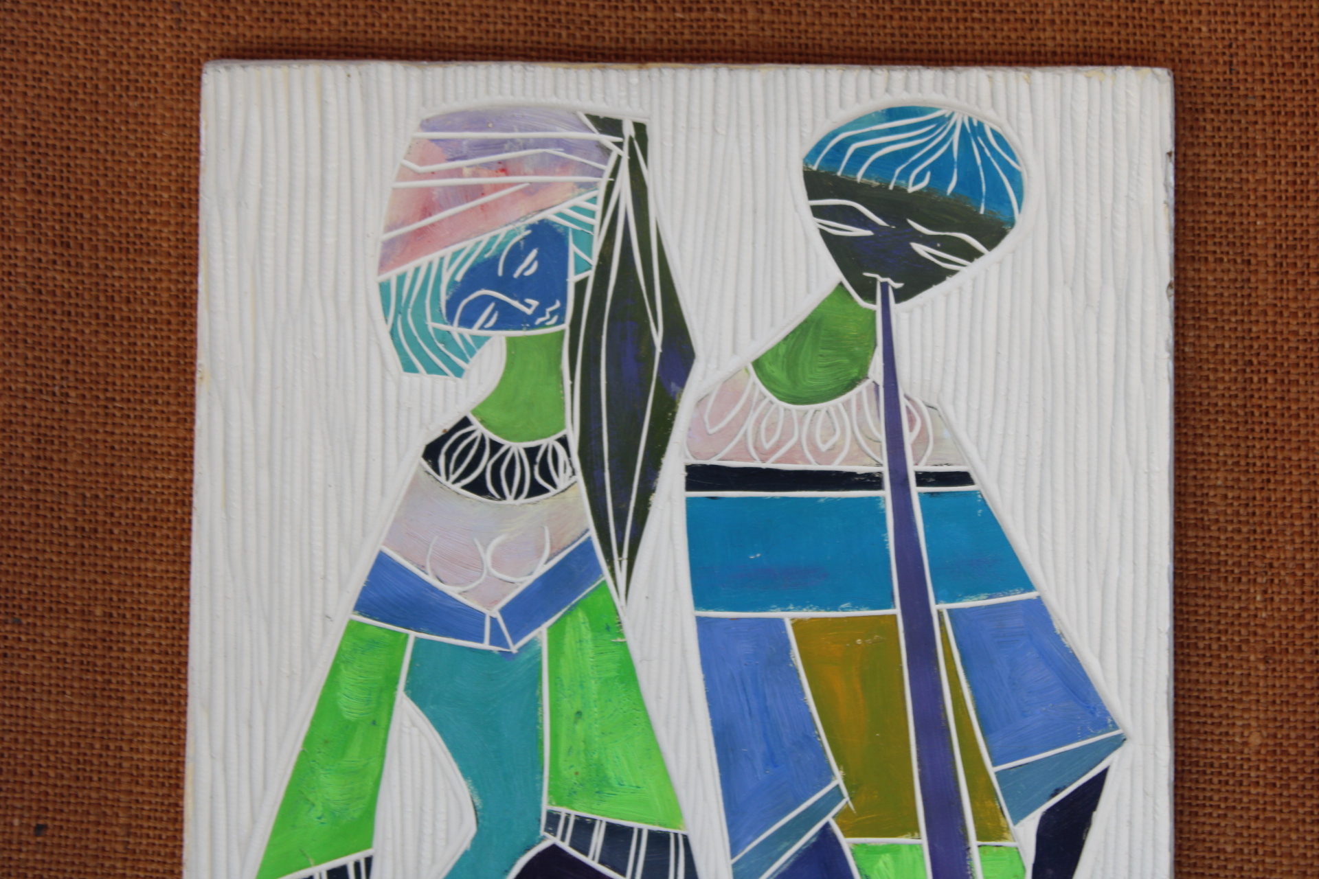 A painting of a flute player and a dancing woman. Primarily green and blue hues. Stylized figures. Painted on ceramic surface with relief and mounted on a jute background. Signed at the bottom and on the back, "Leen '62. Leen Dereymaeker (?) '62."