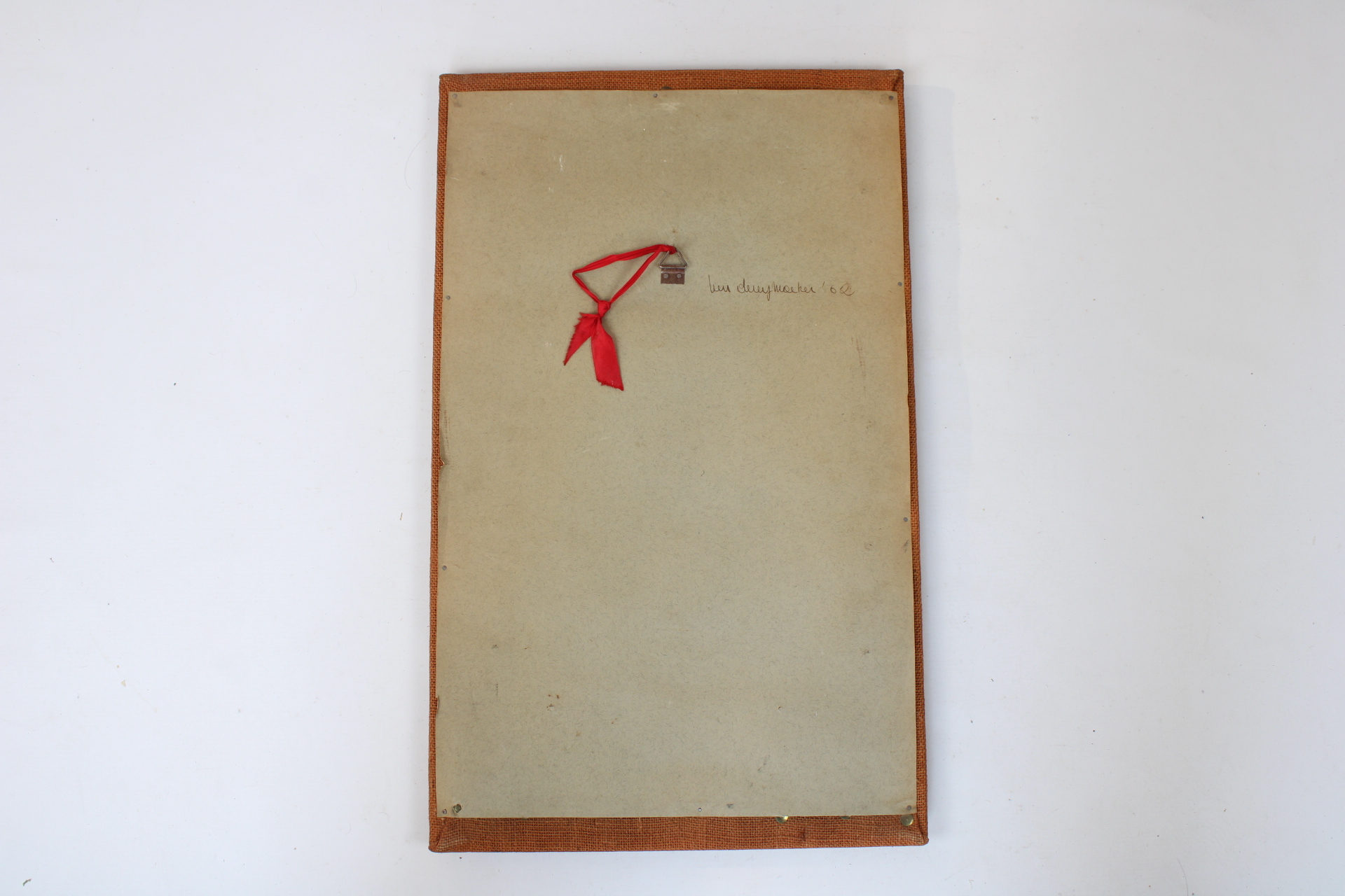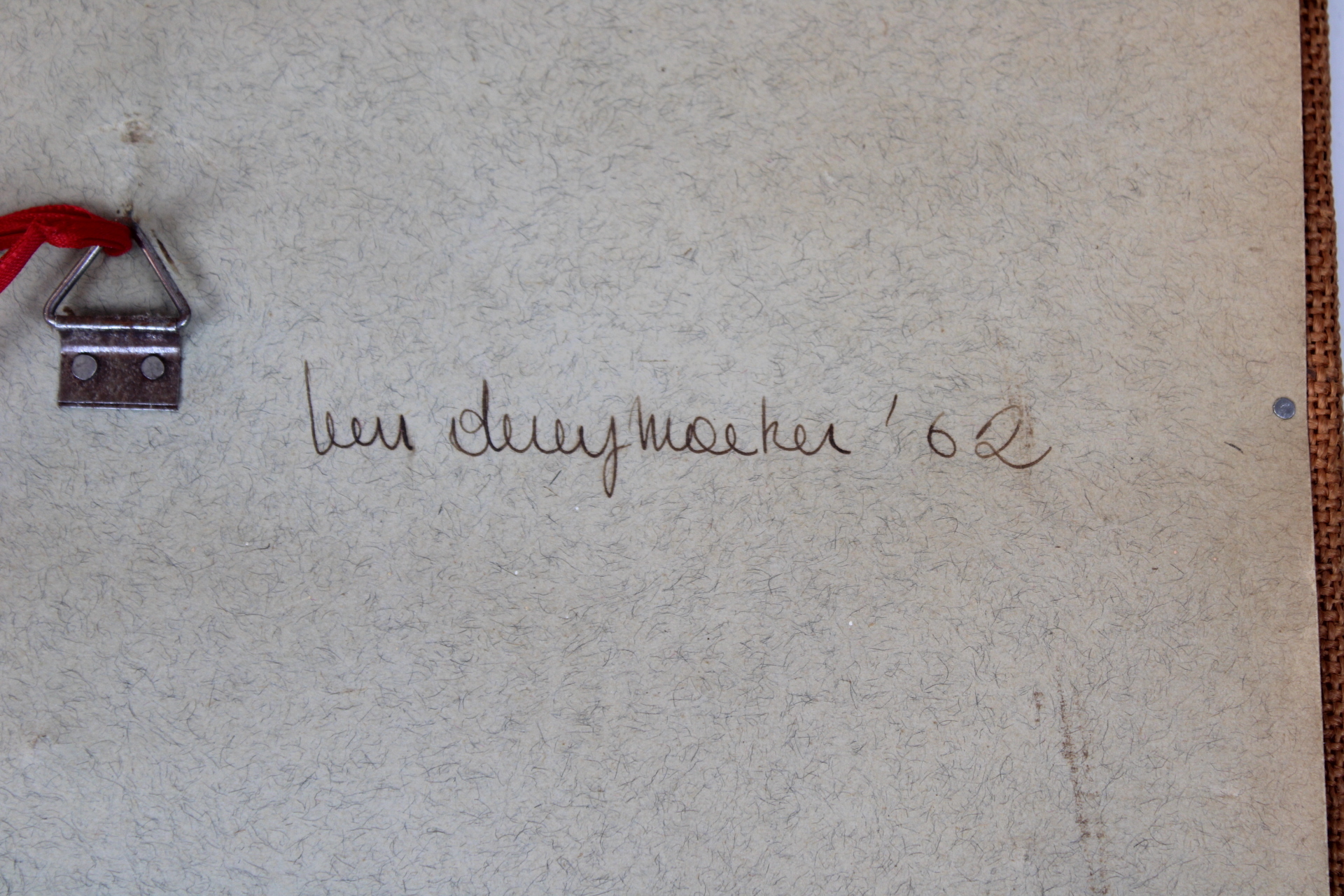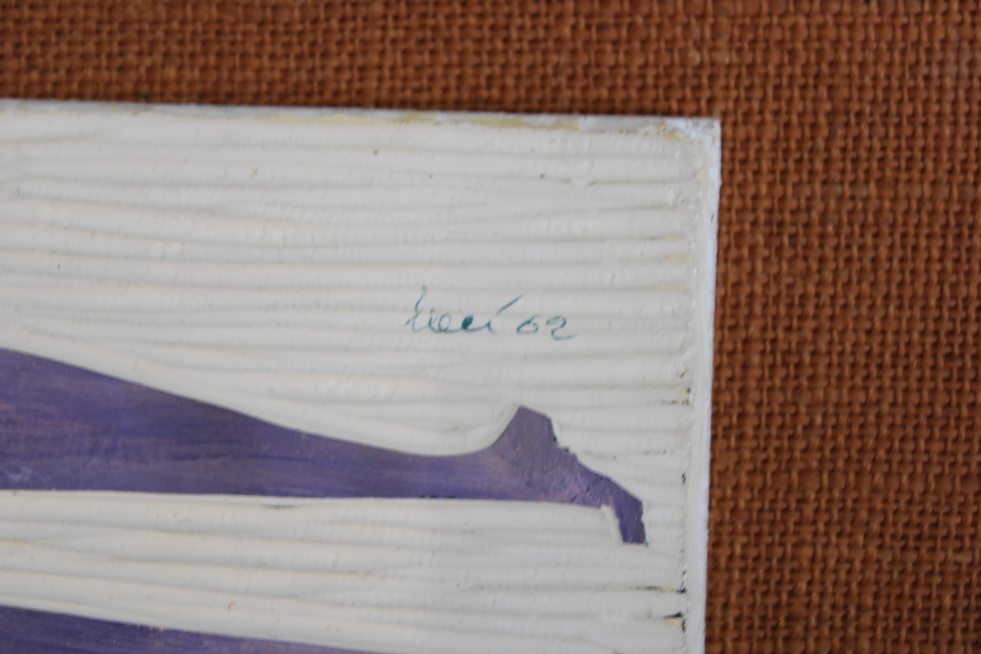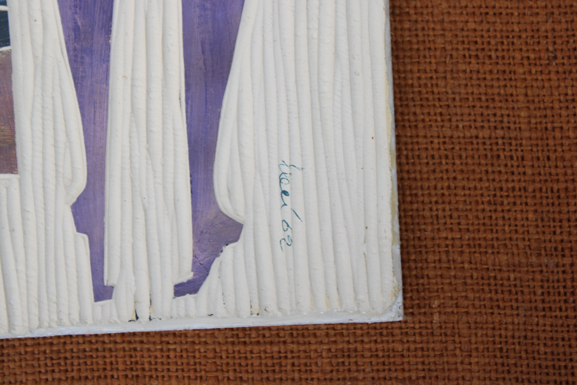 A painting of a flute player and a dancing woman. Primarily green and blue hues. Stylized figures. Painted on ceramic surface with relief and mounted on a jute background. Signed at the bottom and on the back, "Leen '62. Leen Dereymaeker (?) '62."