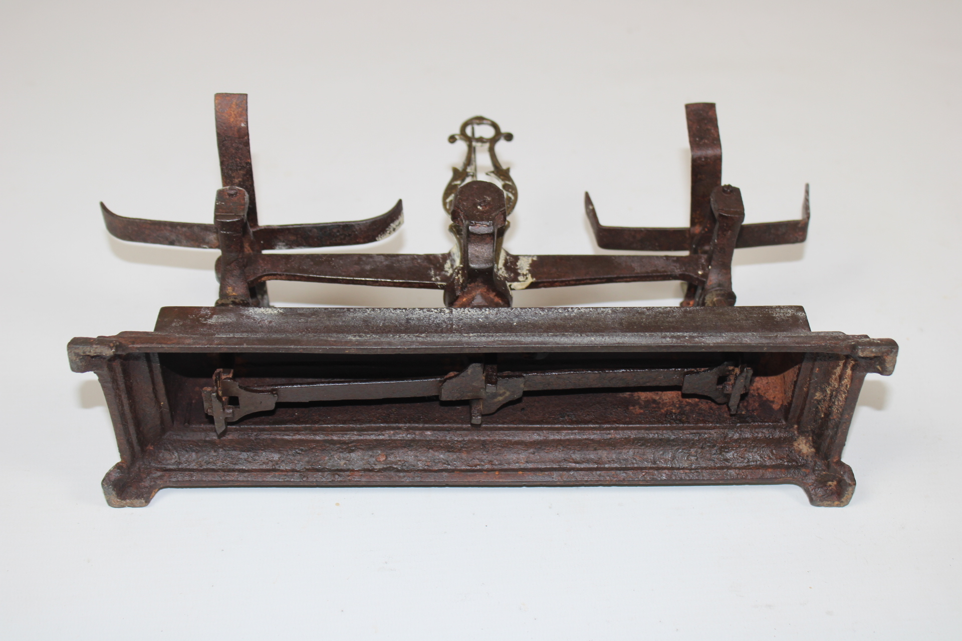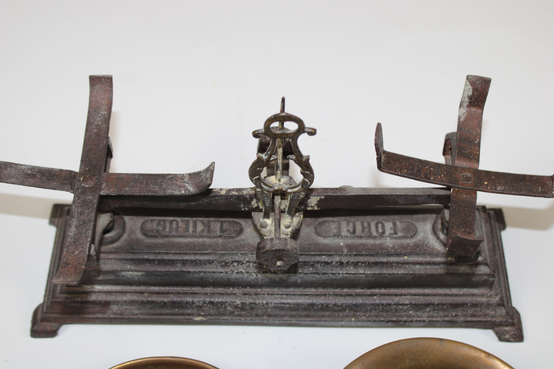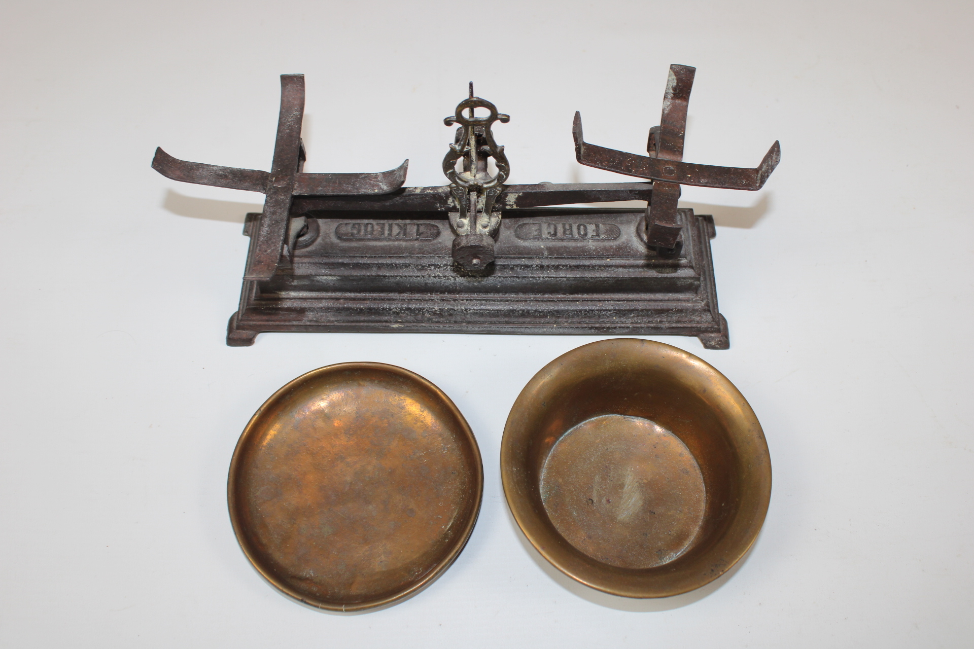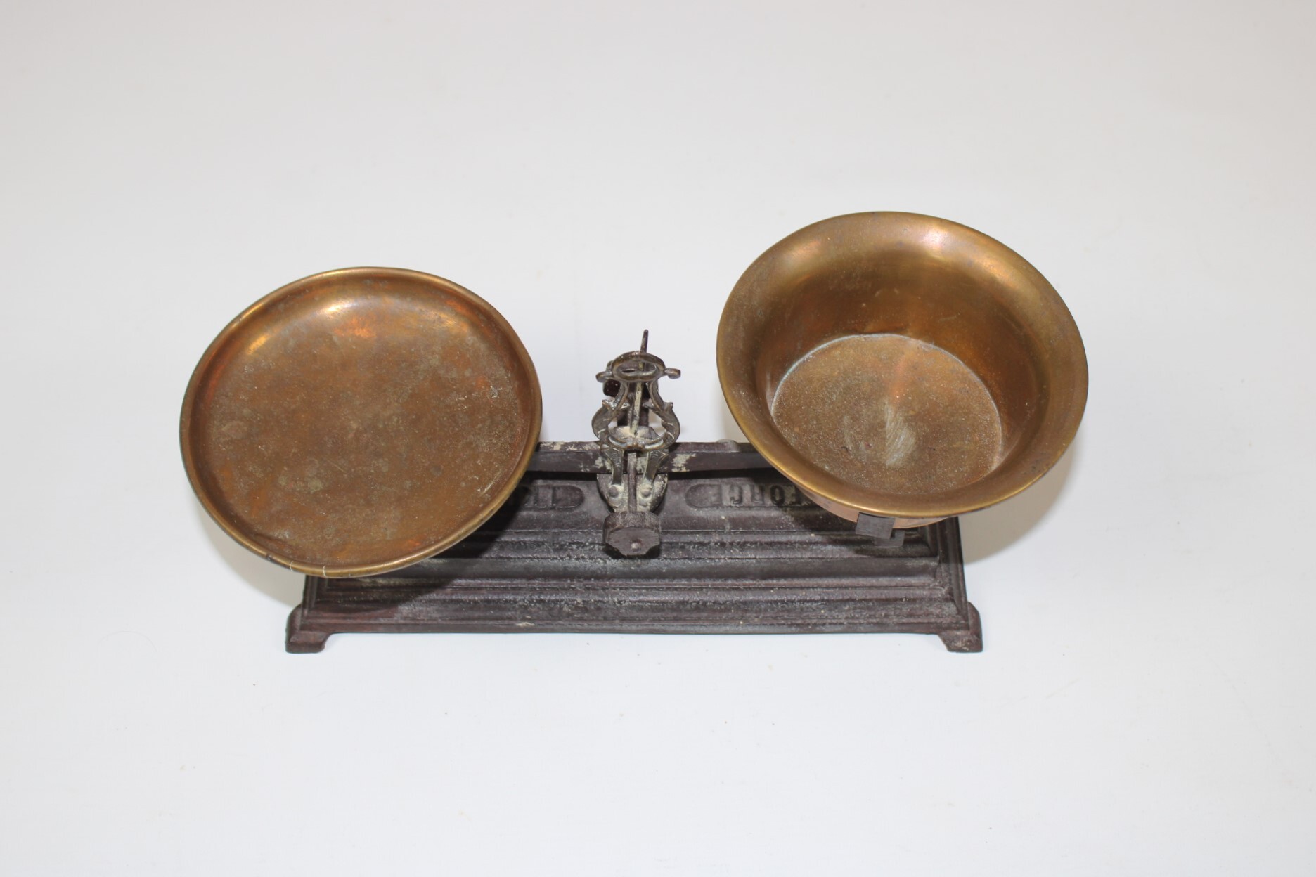 A small force scale or counterbalance scale with two matching copper pans. Sturdy cast iron base.
