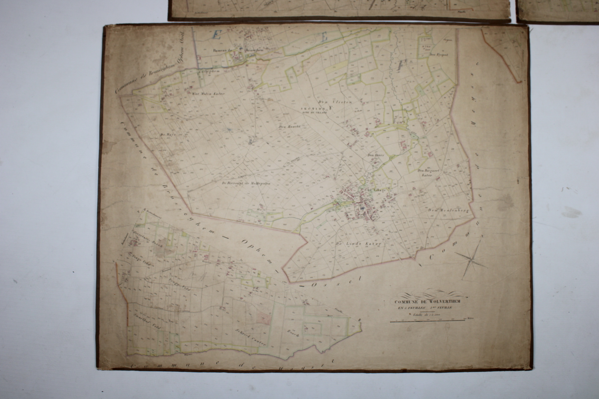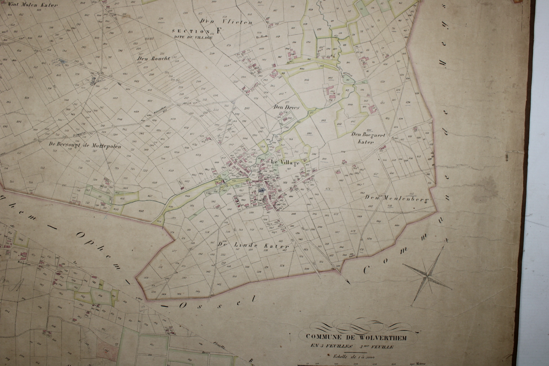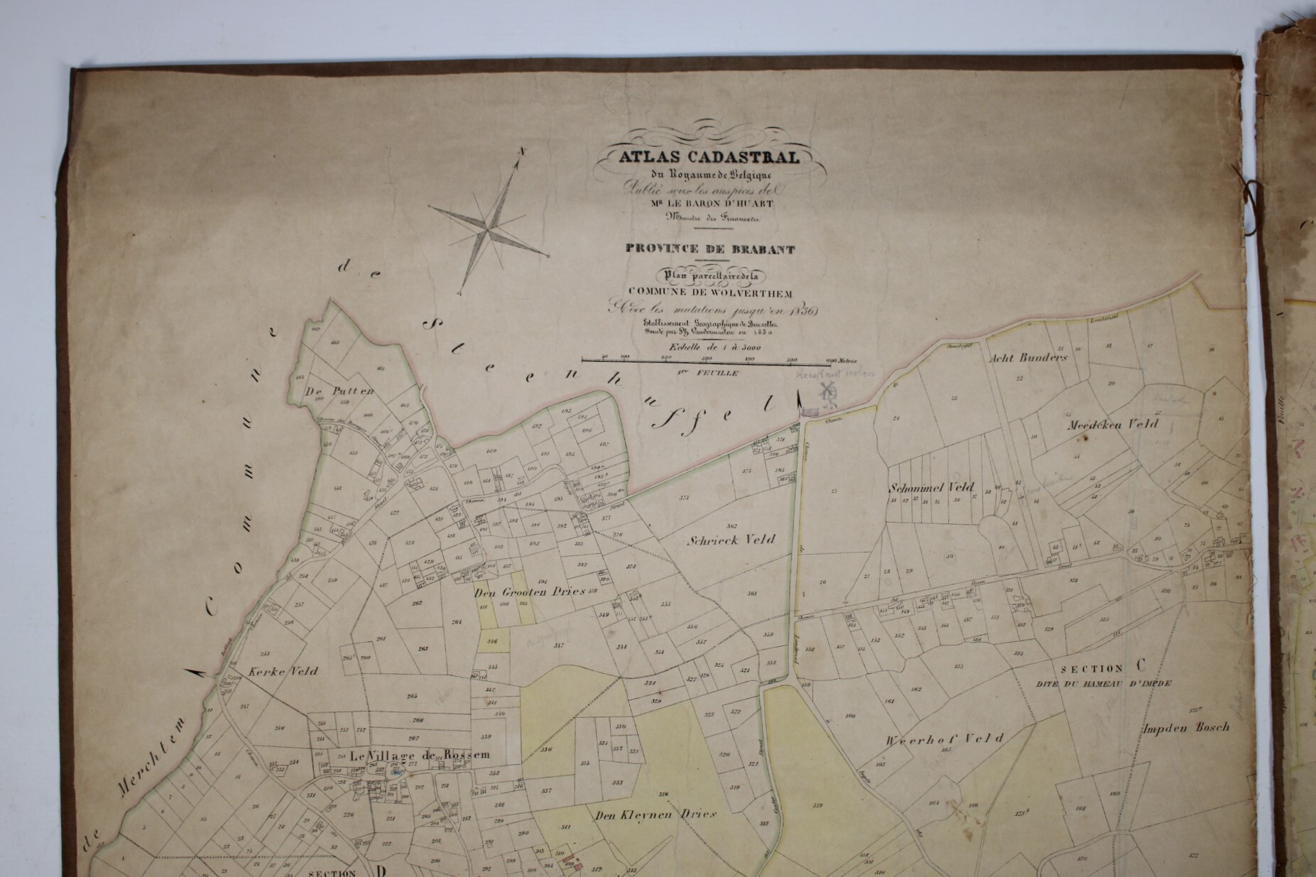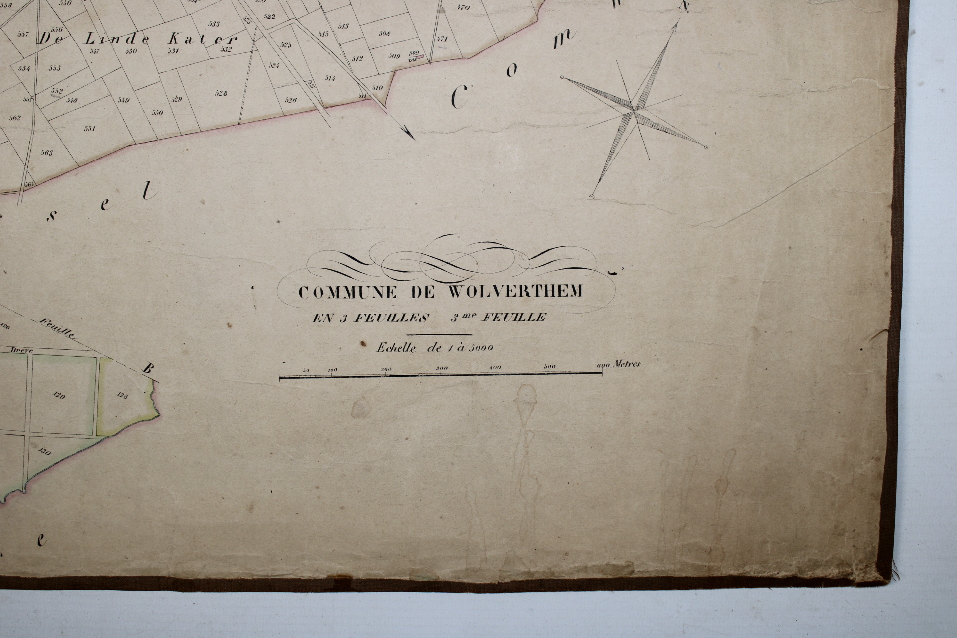 Un lot de 3 cartes (plans cadastraux) anciennes de 'Wolverthem' de "l'Atlas Cadastral" de Philippe Vandermaelen, datant du milieu du 19e siècle. Philippe Vandermaelen était un cartographe et géographe belge. Il fonda l'Établissement Géographique de Bruxelles en 1830. À partir de 1836, il obtint l'autorisation du ministre des Finances, le baron d'Huart, de publier des plans cadastraux dan 'Atlas Cadastral'. Ces plans, utilisées par les notaires et les géomètres, figurent parmi les premiers plans cadastraux. Elles offrent des représentations très détaillées des parcelles et des maisons. En relativement bon état compte tenu de son âge avec des décolorations et quelques dommages.