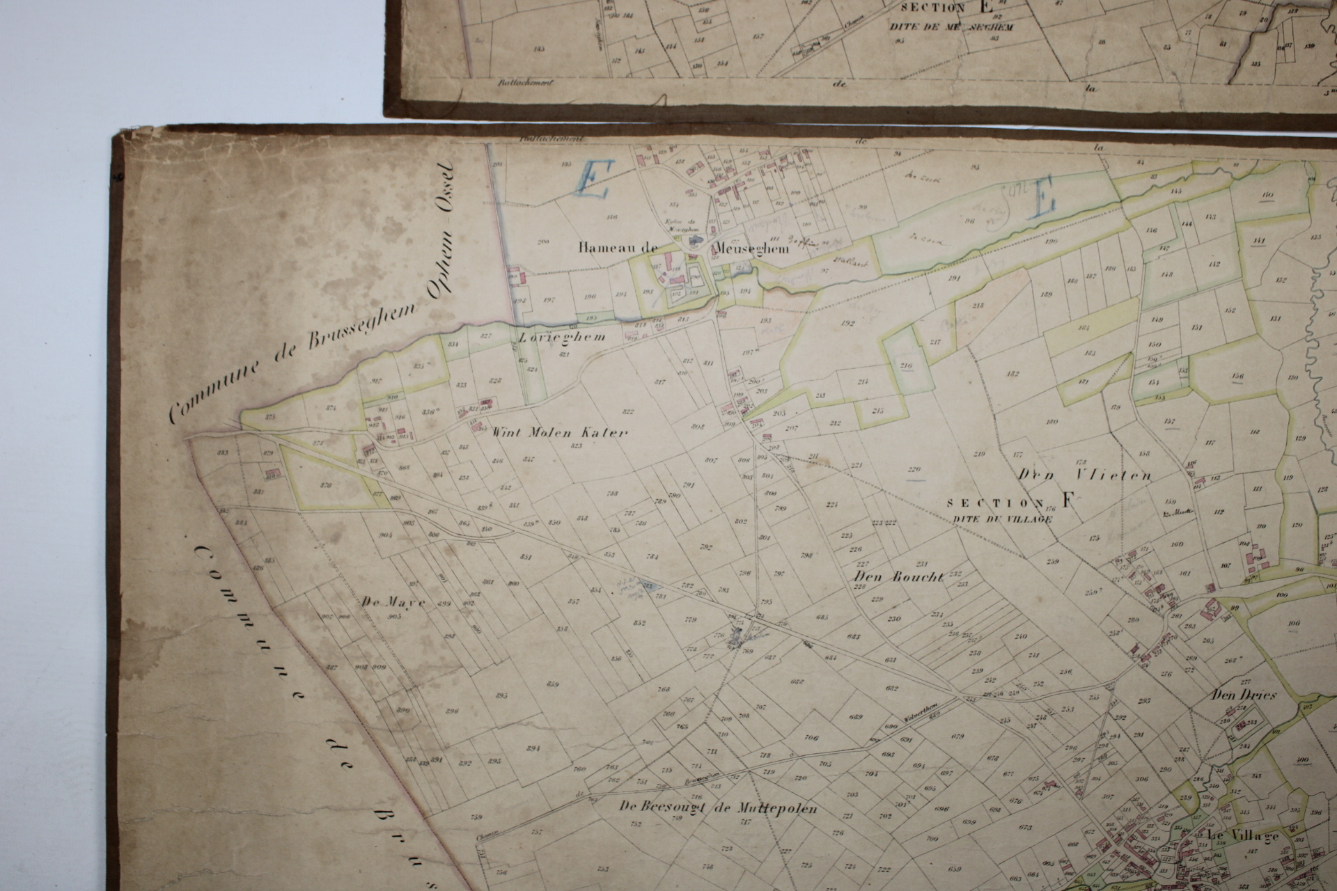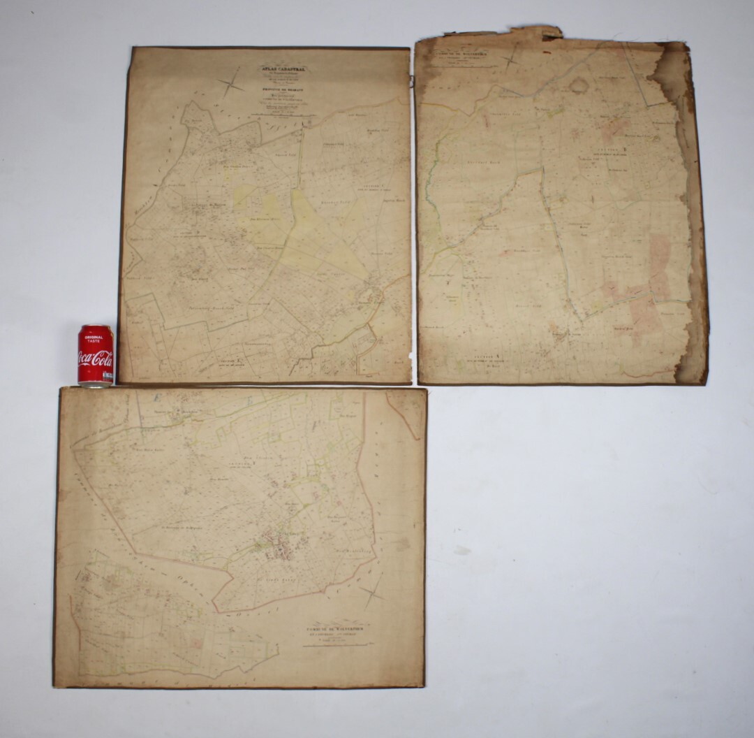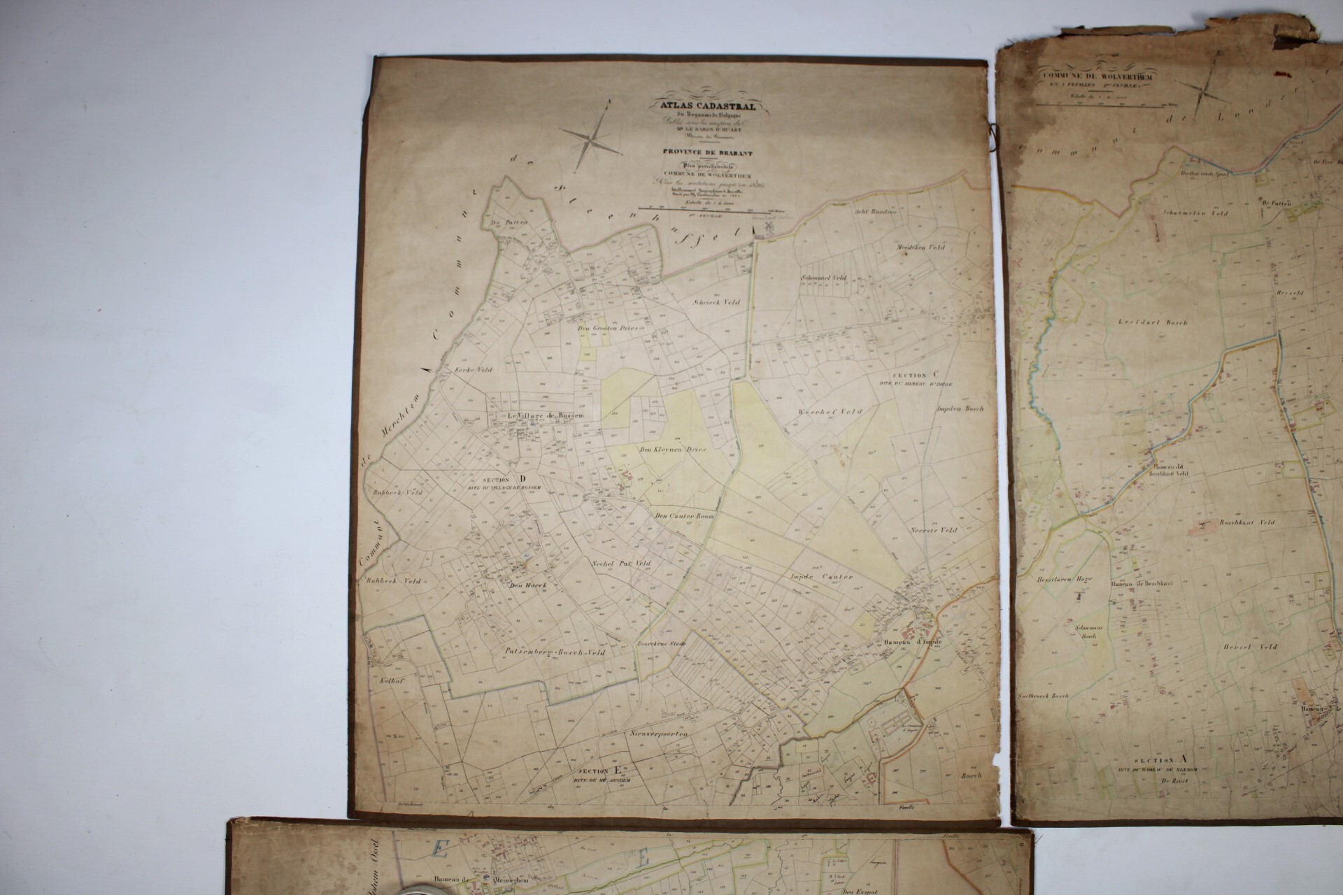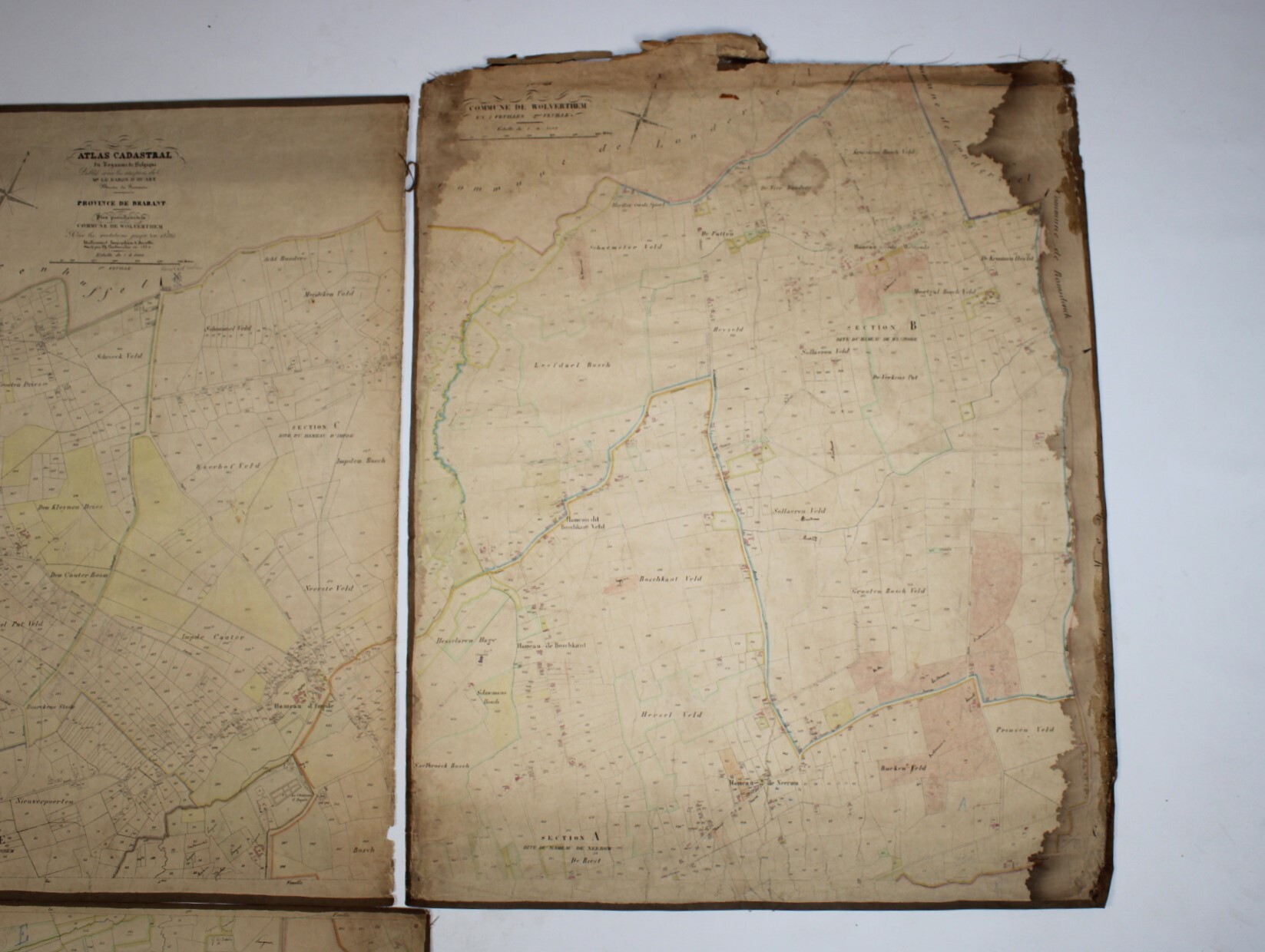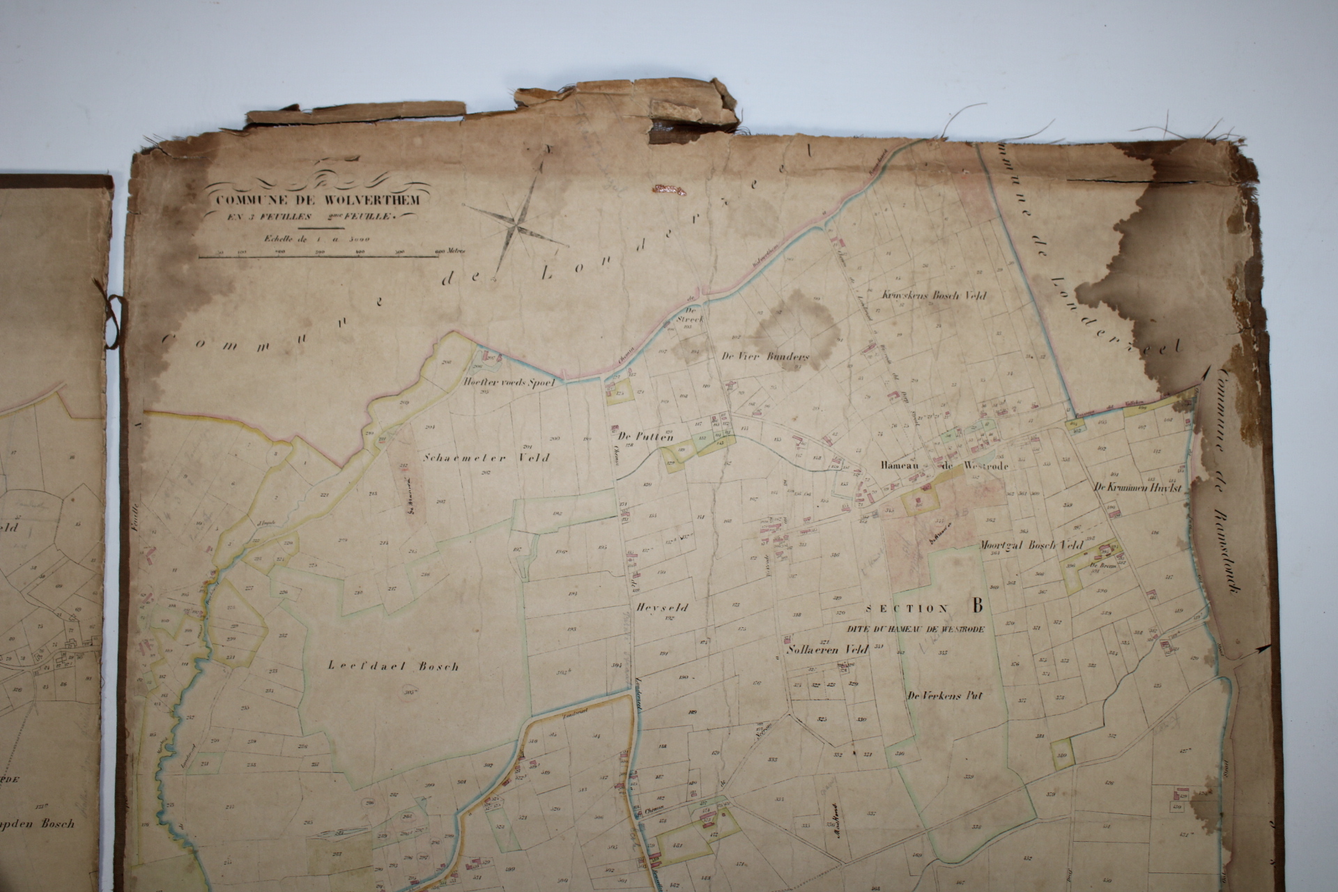 Un lot de 3 cartes (plans cadastraux) anciennes de 'Wolverthem' de "l'Atlas Cadastral" de Philippe Vandermaelen, datant du milieu du 19e siècle. Philippe Vandermaelen était un cartographe et géographe belge. Il fonda l'Établissement Géographique de Bruxelles en 1830. À partir de 1836, il obtint l'autorisation du ministre des Finances, le baron d'Huart, de publier des plans cadastraux dan 'Atlas Cadastral'. Ces plans, utilisées par les notaires et les géomètres, figurent parmi les premiers plans cadastraux. Elles offrent des représentations très détaillées des parcelles et des maisons. En relativement bon état compte tenu de son âge avec des décolorations et quelques dommages.