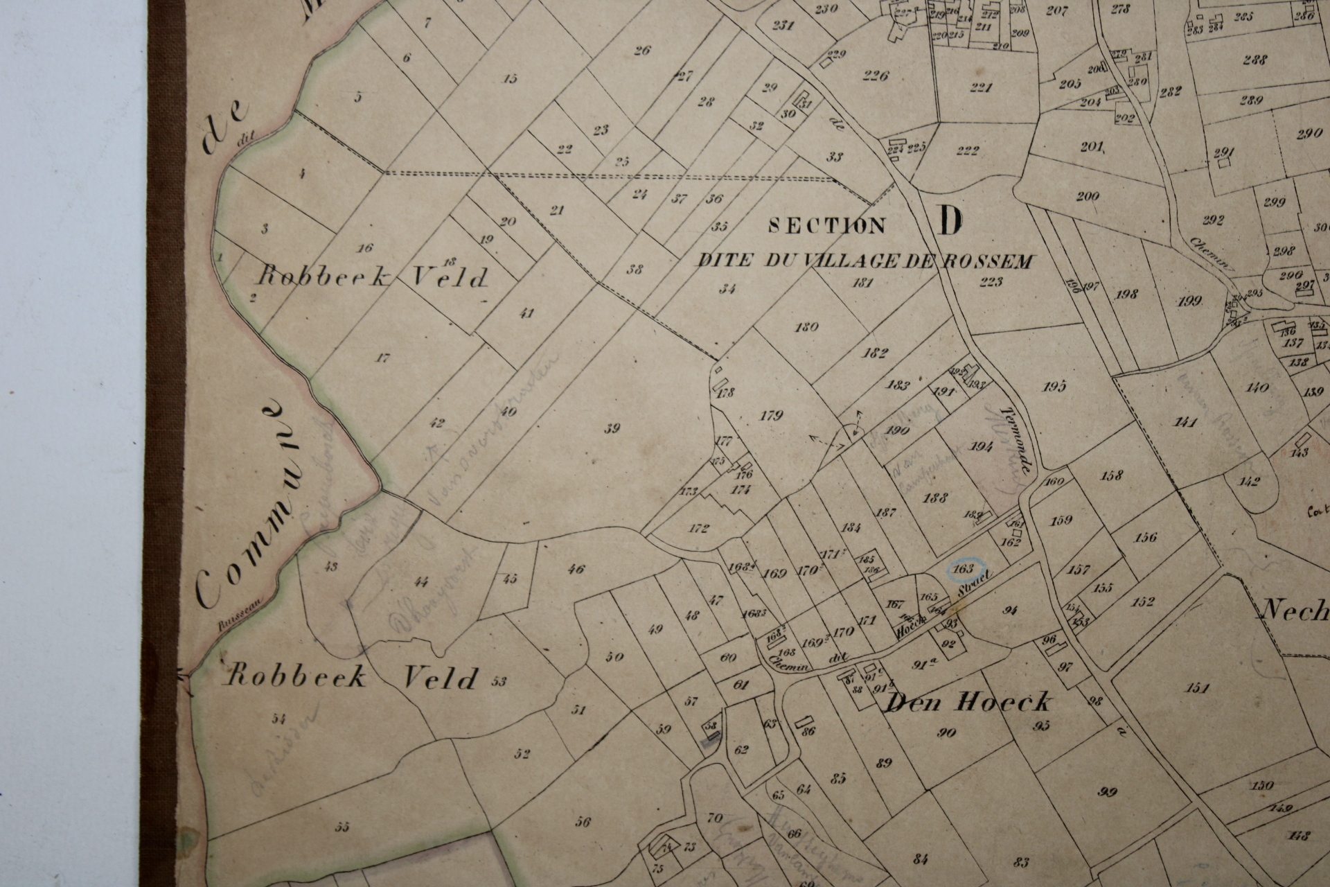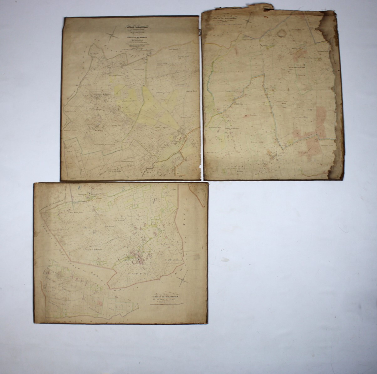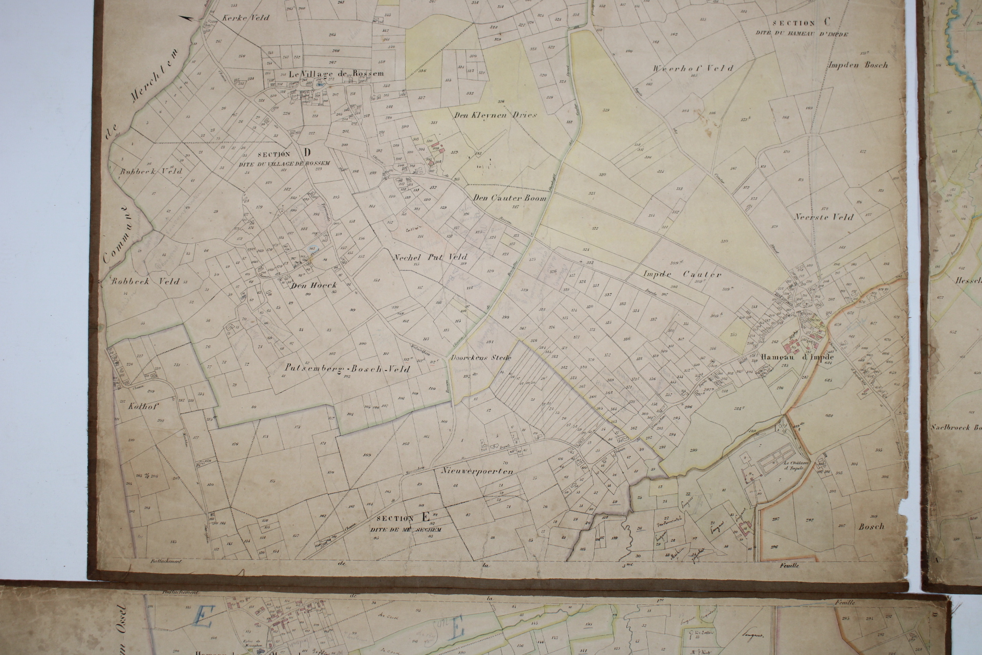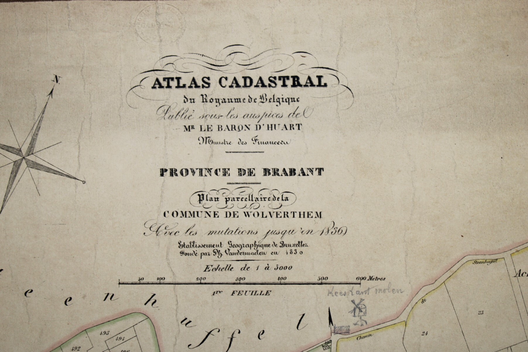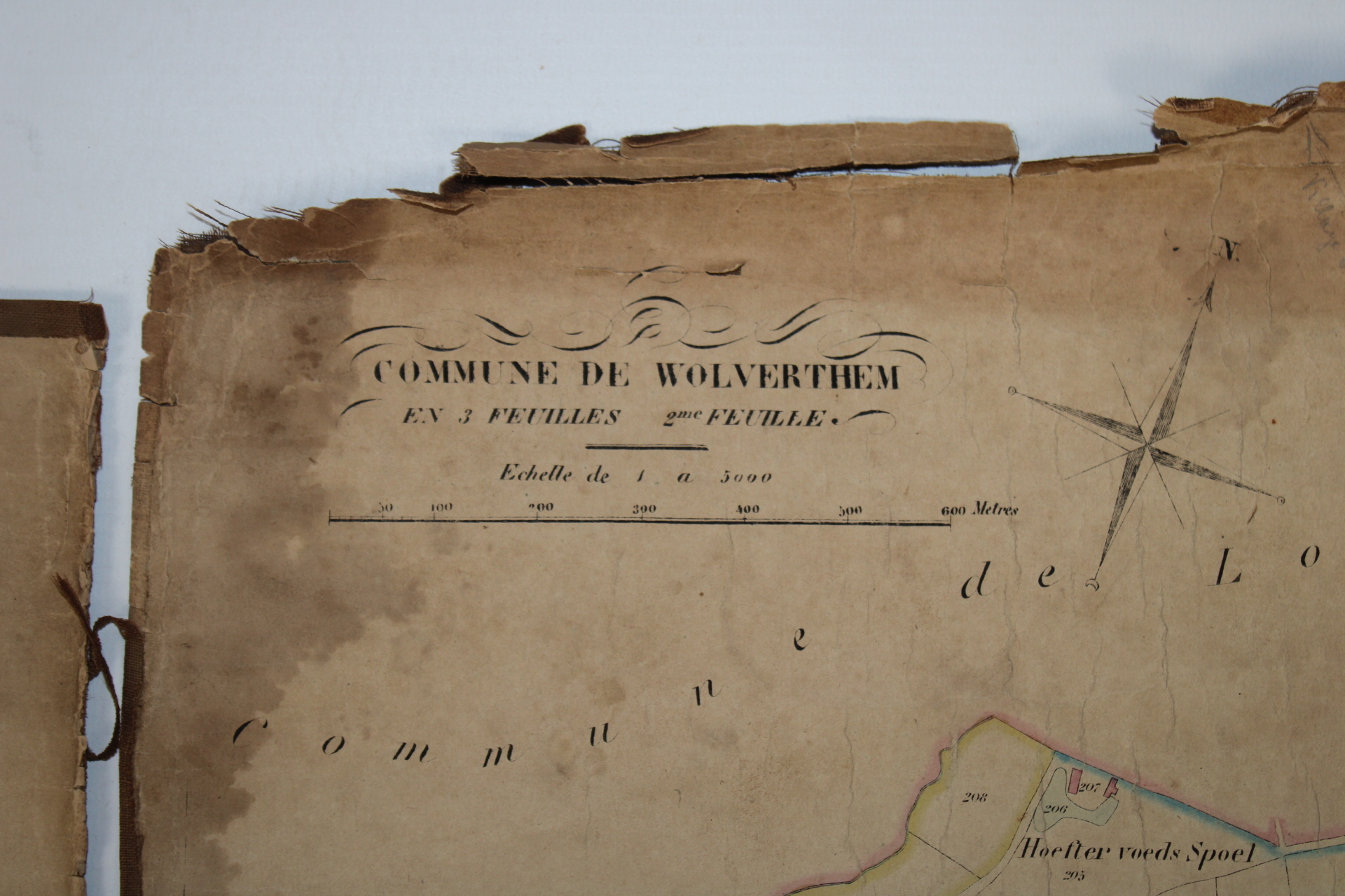 Un lot de 3 cartes (plans cadastraux) anciennes de 'Wolverthem' de "l'Atlas Cadastral" de Philippe Vandermaelen, datant du milieu du 19e siècle. Philippe Vandermaelen était un cartographe et géographe belge. Il fonda l'Établissement Géographique de Bruxelles en 1830. À partir de 1836, il obtint l'autorisation du ministre des Finances, le baron d'Huart, de publier des plans cadastraux dan 'Atlas Cadastral'. Ces plans, utilisées par les notaires et les géomètres, figurent parmi les premiers plans cadastraux. Elles offrent des représentations très détaillées des parcelles et des maisons. En relativement bon état compte tenu de son âge avec des décolorations et quelques dommages.