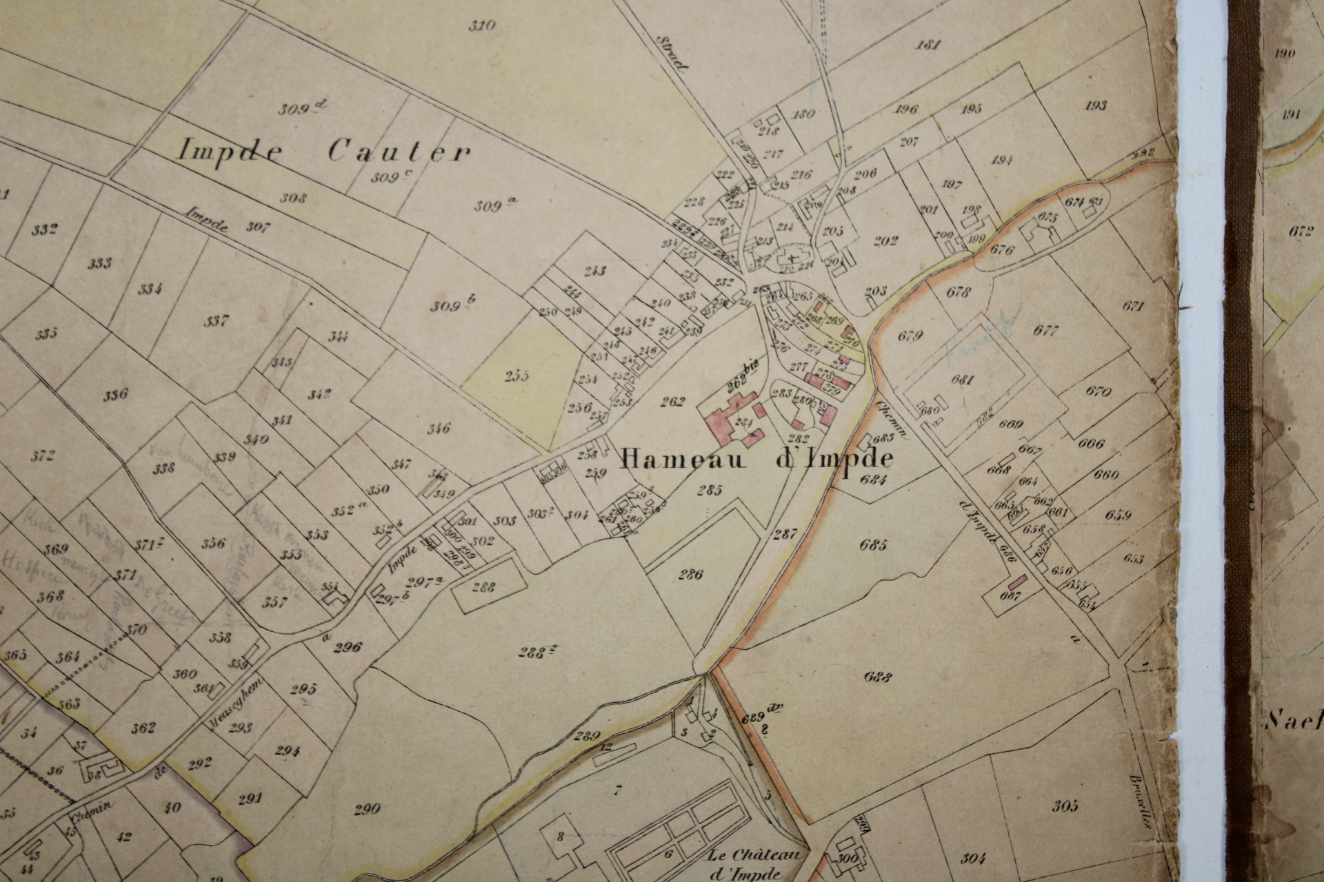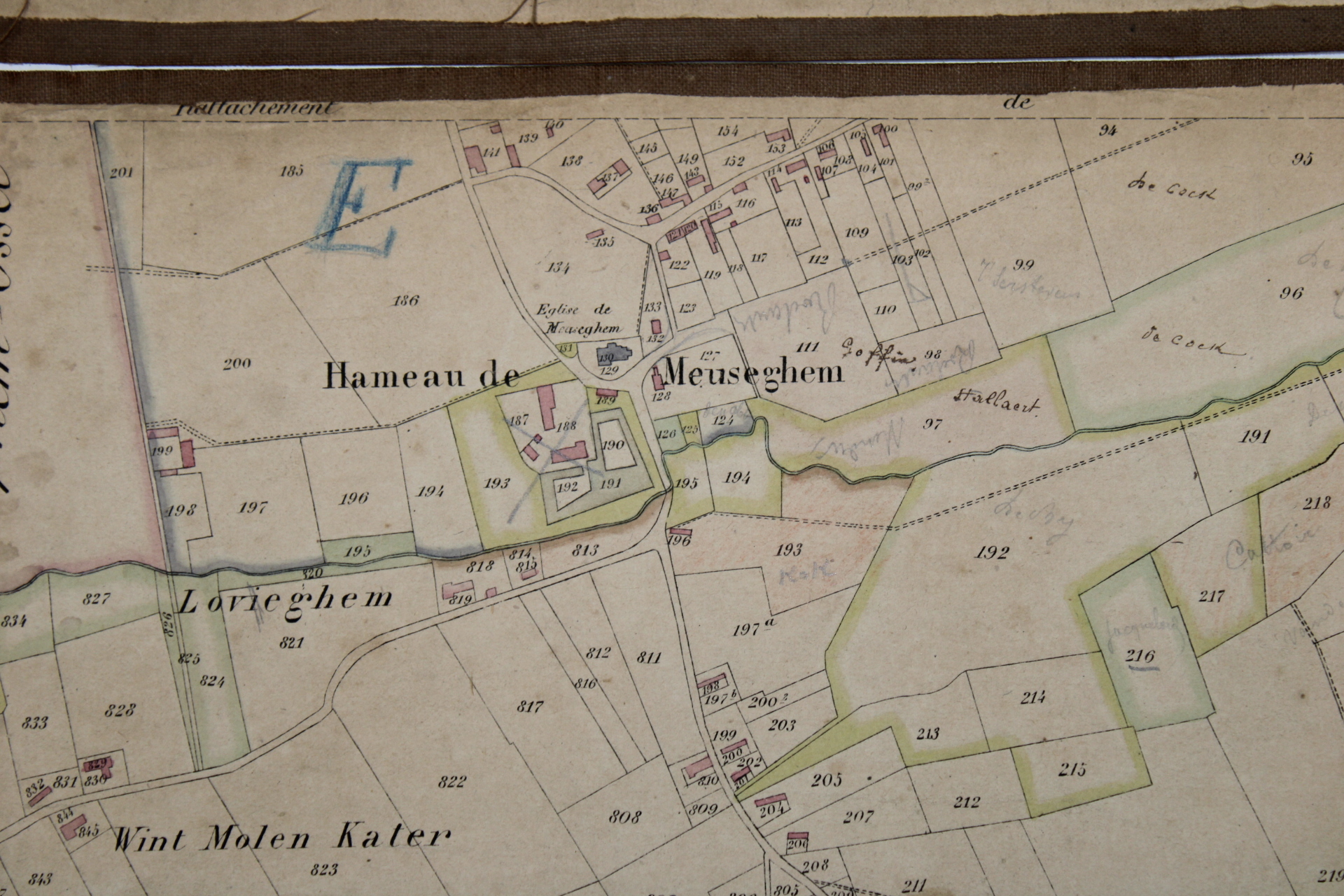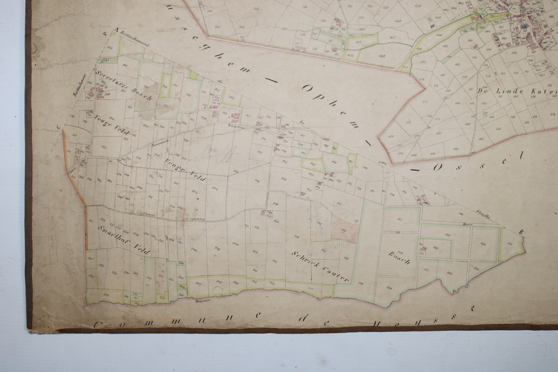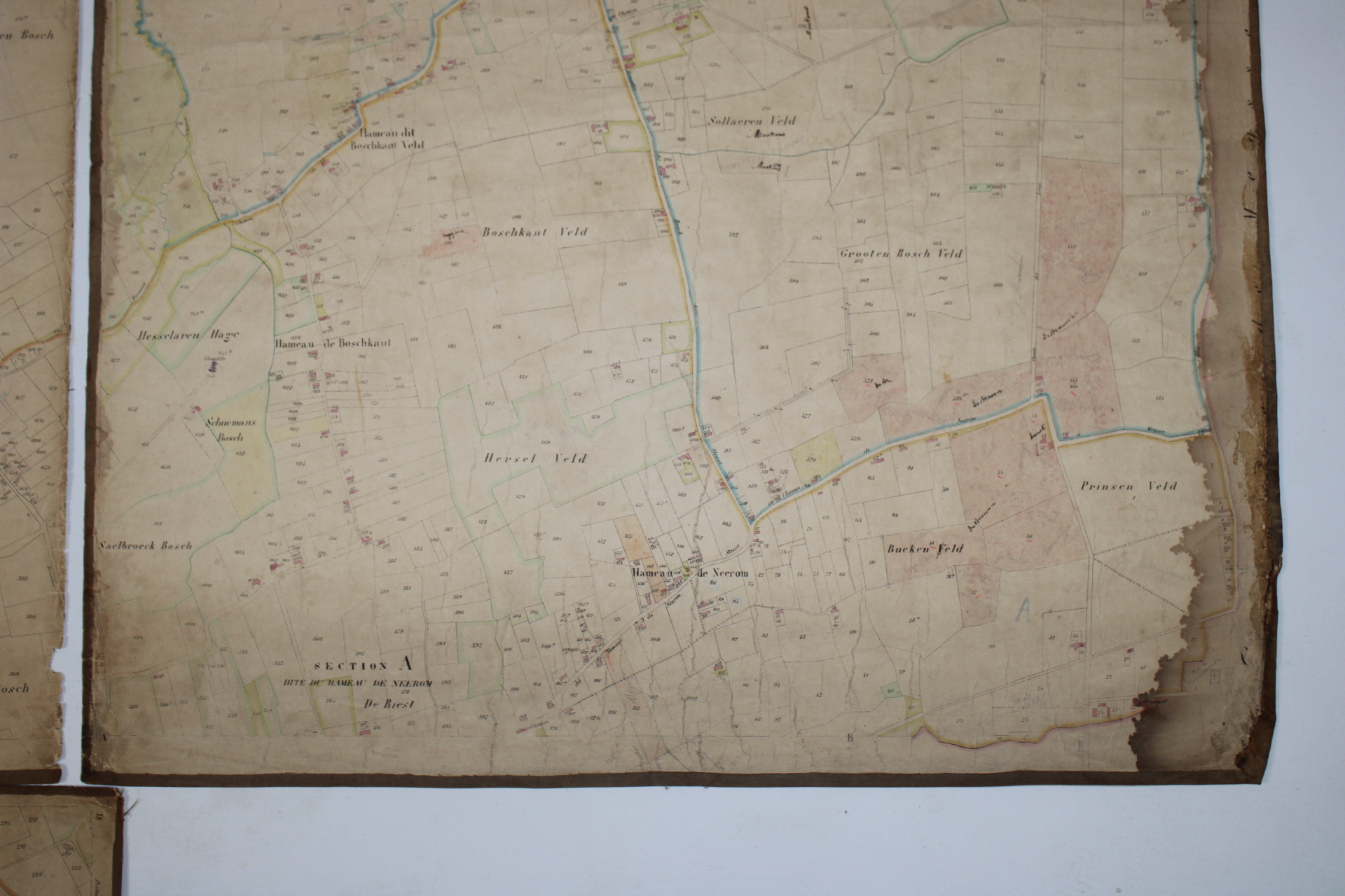 Un lot de 3 cartes (plans cadastraux) anciennes de 'Wolverthem' de "l'Atlas Cadastral" de Philippe Vandermaelen, datant du milieu du 19e siècle. Philippe Vandermaelen était un cartographe et géographe belge. Il fonda l'Établissement Géographique de Bruxelles en 1830. À partir de 1836, il obtint l'autorisation du ministre des Finances, le baron d'Huart, de publier des plans cadastraux dan 'Atlas Cadastral'. Ces plans, utilisées par les notaires et les géomètres, figurent parmi les premiers plans cadastraux. Elles offrent des représentations très détaillées des parcelles et des maisons. En relativement bon état compte tenu de son âge avec des décolorations et quelques dommages.