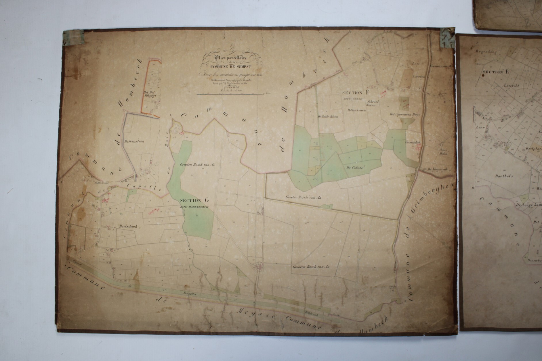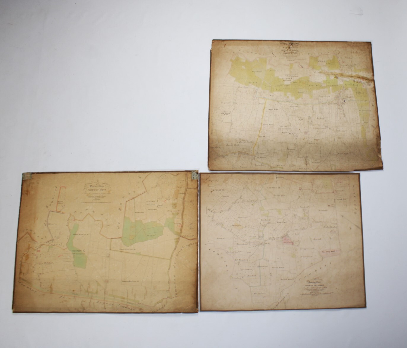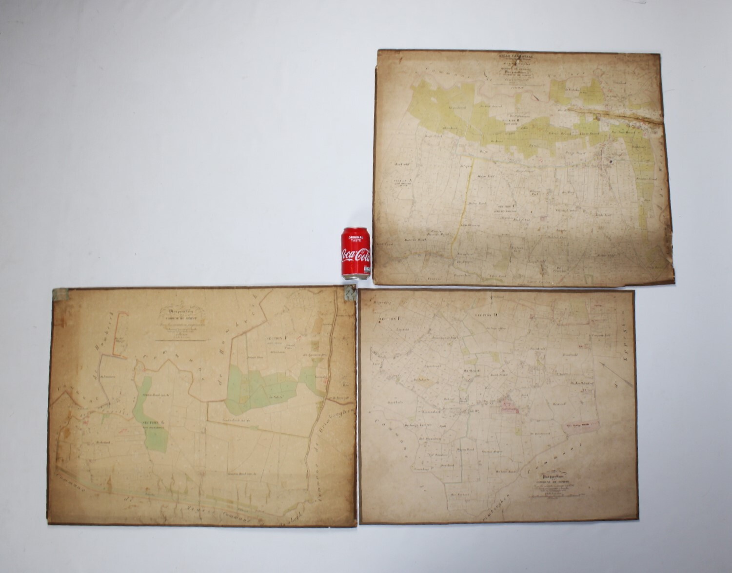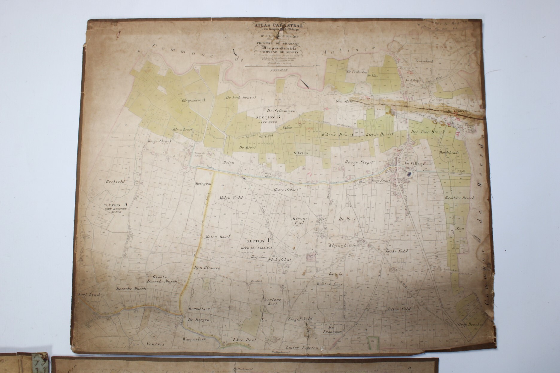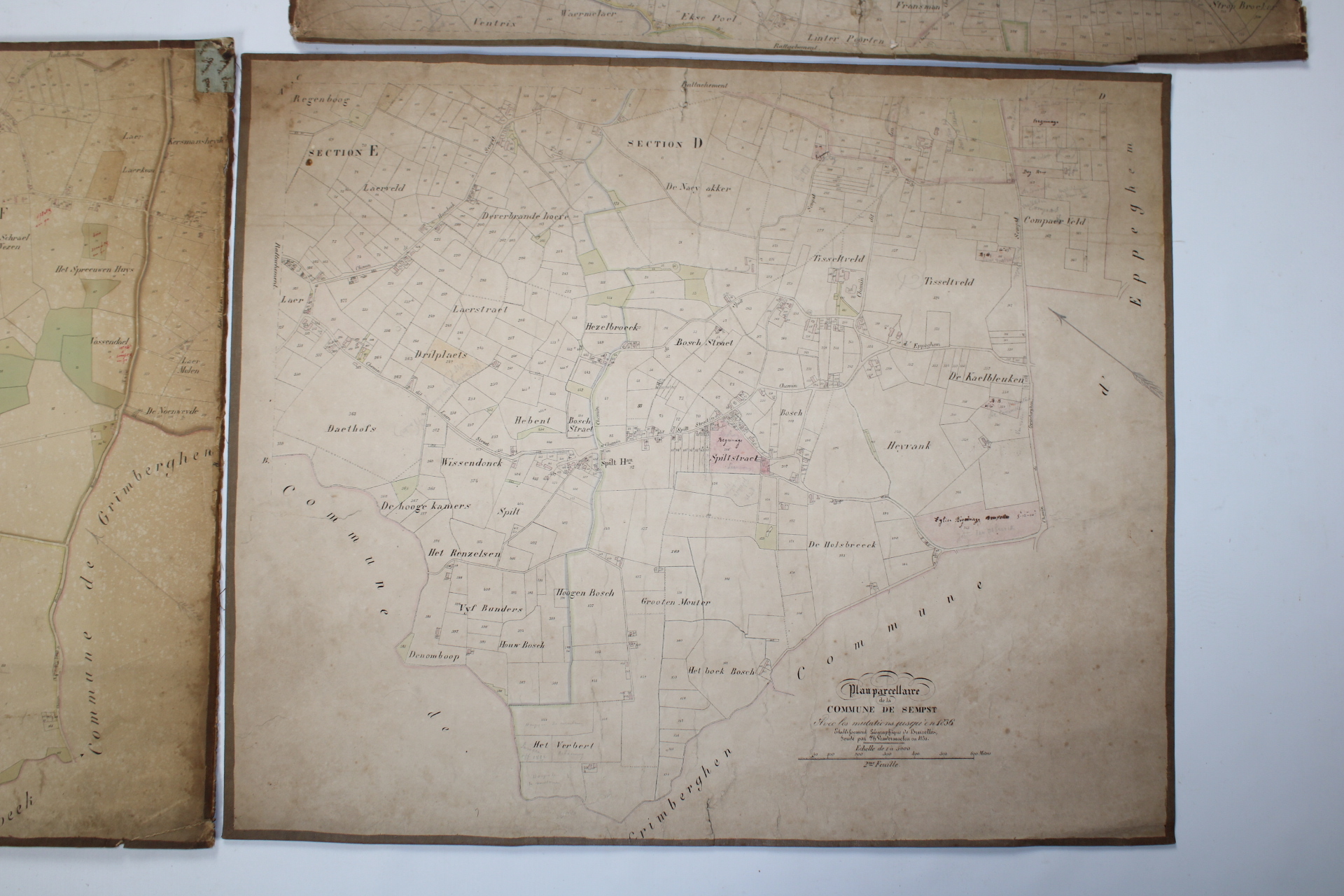 Un lot de 3 cartes (plans cadastraux) anciennes de 'Sempts' de "l'Atlas Cadastral" de Philippe Vandermaelen, datant du milieu du 19e siècle. "Avec les mutations jusqu'en 1836". Philippe Vandermaelen était un cartographe et géographe belge. Il fonda l'Établissement Géographique de Bruxelles en 1830. À partir de 1836, il obtint l'autorisation du ministre des Finances, le baron d'Huart, de publier des plans cadastraux dan 'Atlas Cadastral'. Ces plans, utilisées par les notaires et les géomètres, figurent parmi les premiers plans cadastraux. Elles offrent des représentations très détaillées des parcelles et des maisons. En relativement bon état compte tenu de son âge. Echelle: 1 à 5000.