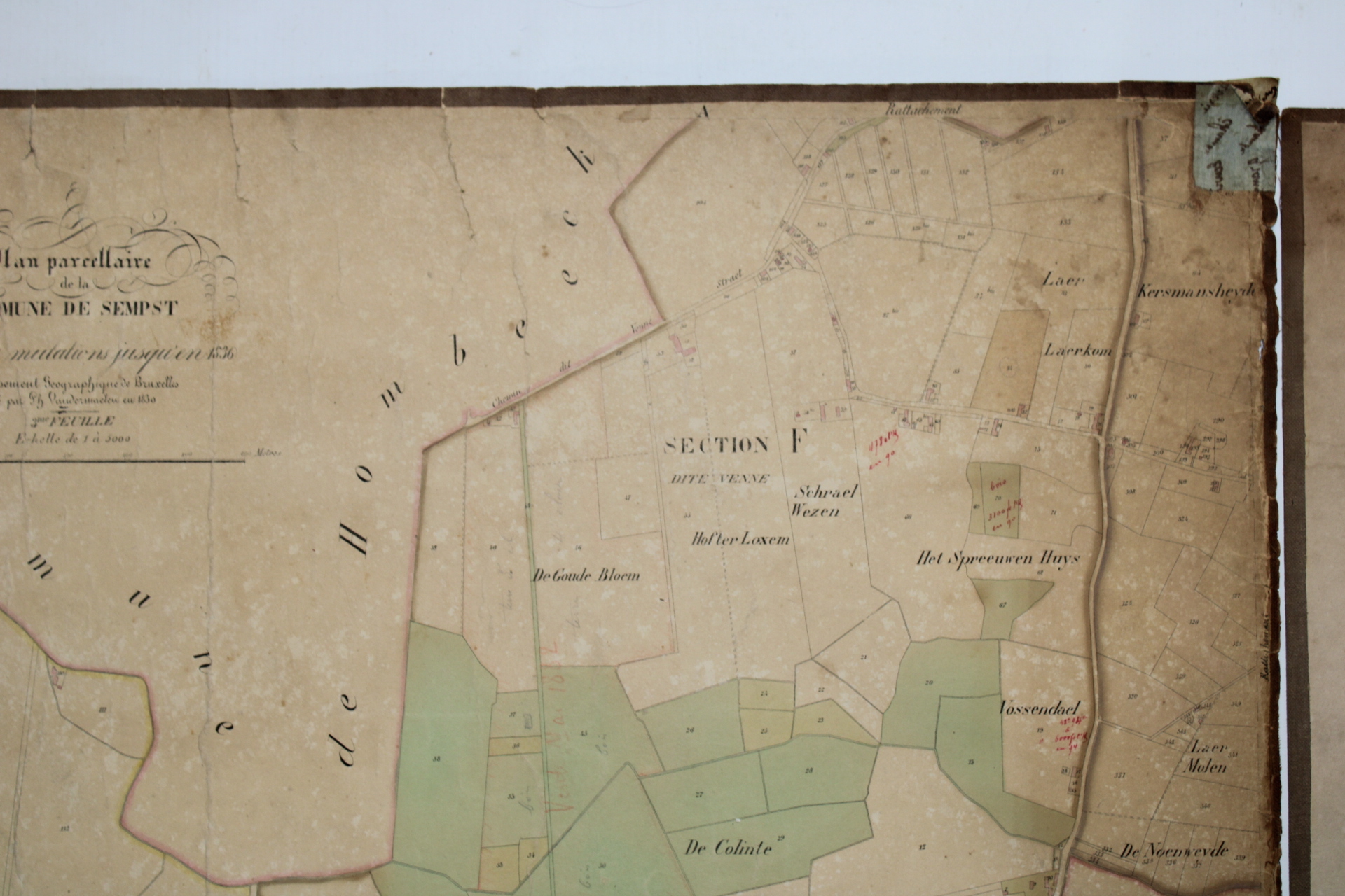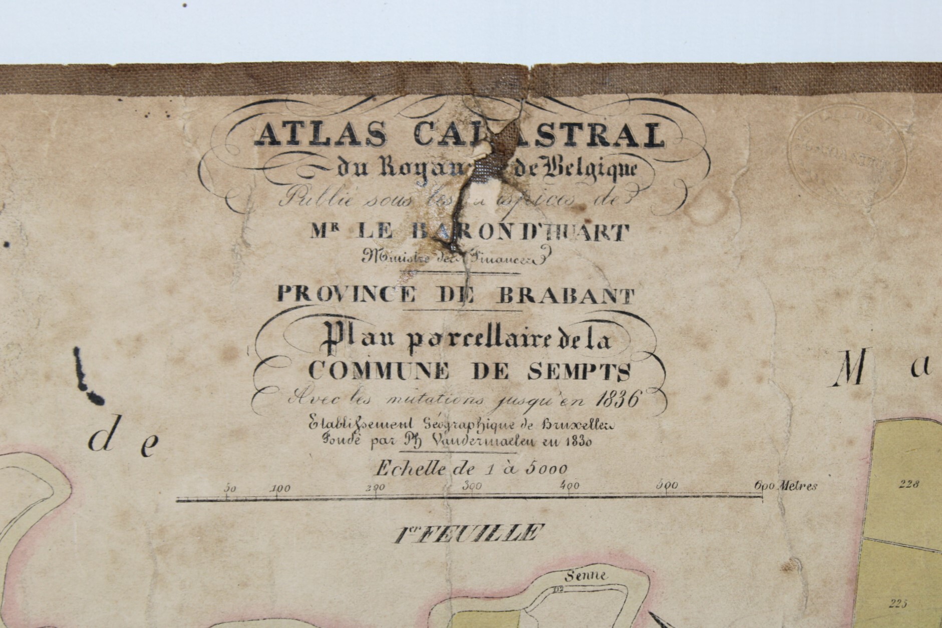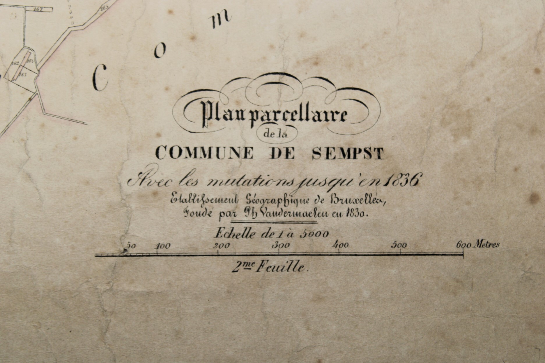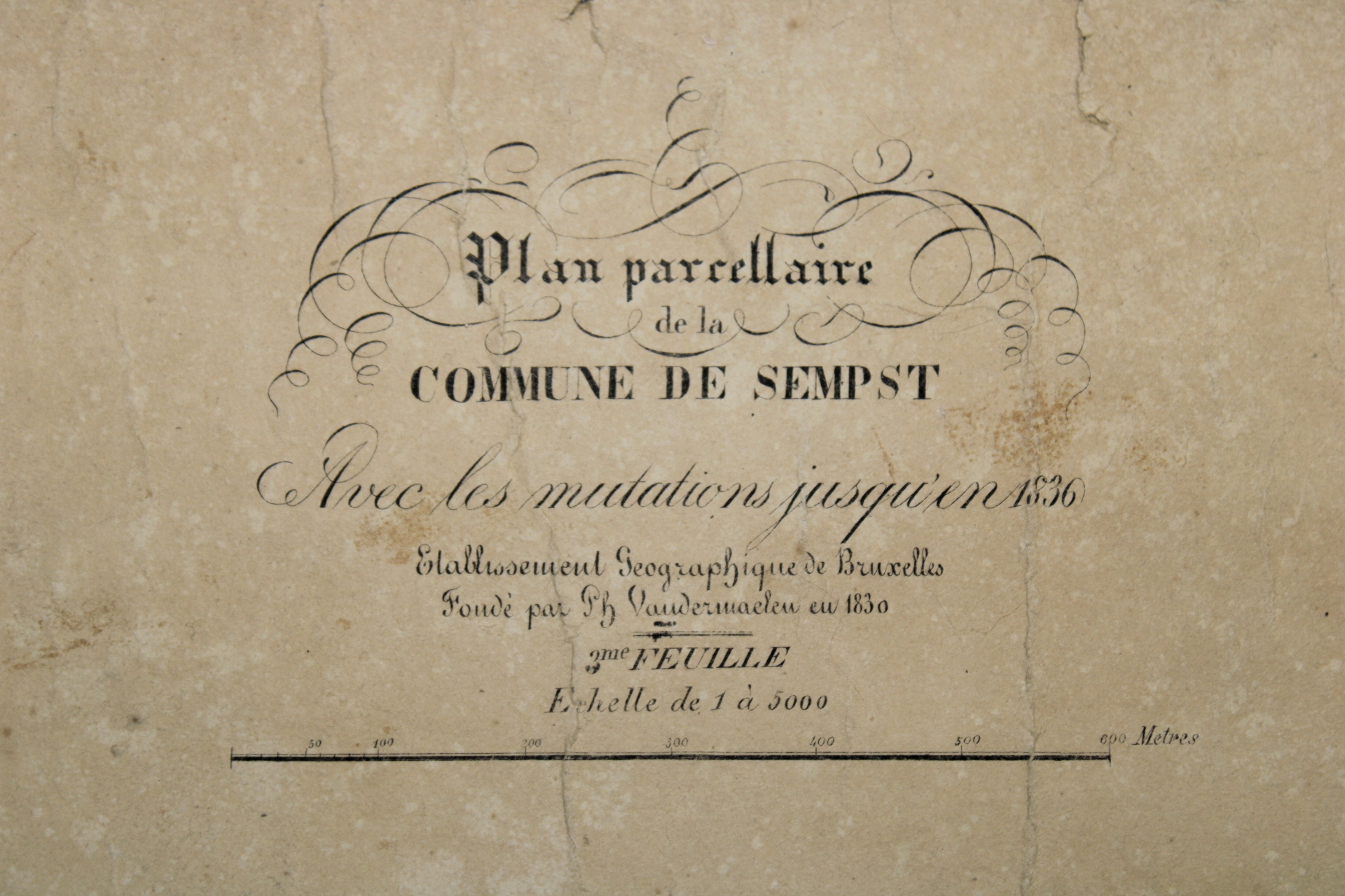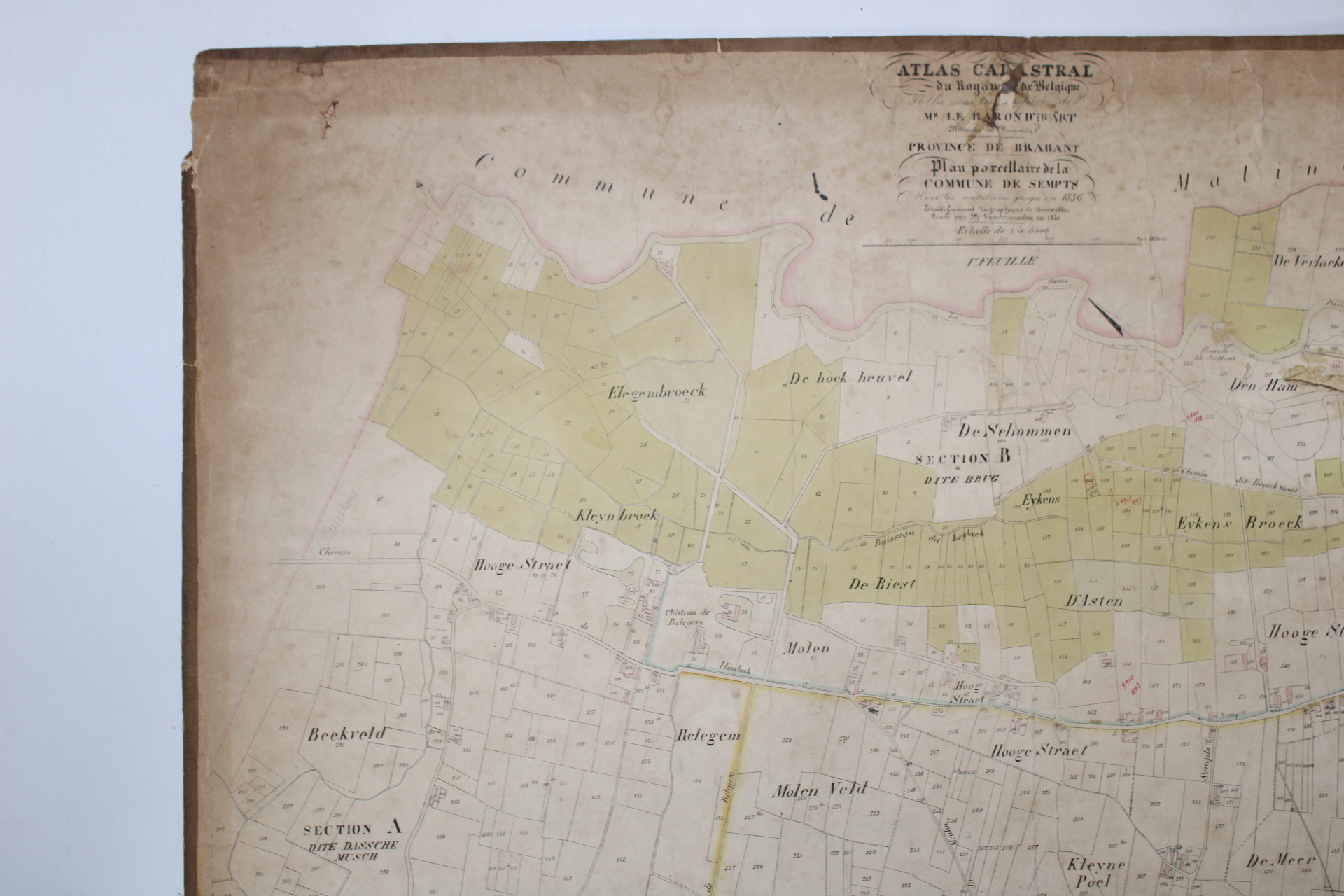 Un lot de 3 cartes (plans cadastraux) anciennes de 'Sempts' de "l'Atlas Cadastral" de Philippe Vandermaelen, datant du milieu du 19e siècle. "Avec les mutations jusqu'en 1836". Philippe Vandermaelen était un cartographe et géographe belge. Il fonda l'Établissement Géographique de Bruxelles en 1830. À partir de 1836, il obtint l'autorisation du ministre des Finances, le baron d'Huart, de publier des plans cadastraux dan 'Atlas Cadastral'. Ces plans, utilisées par les notaires et les géomètres, figurent parmi les premiers plans cadastraux. Elles offrent des représentations très détaillées des parcelles et des maisons. En relativement bon état compte tenu de son âge. Echelle: 1 à 5000.
