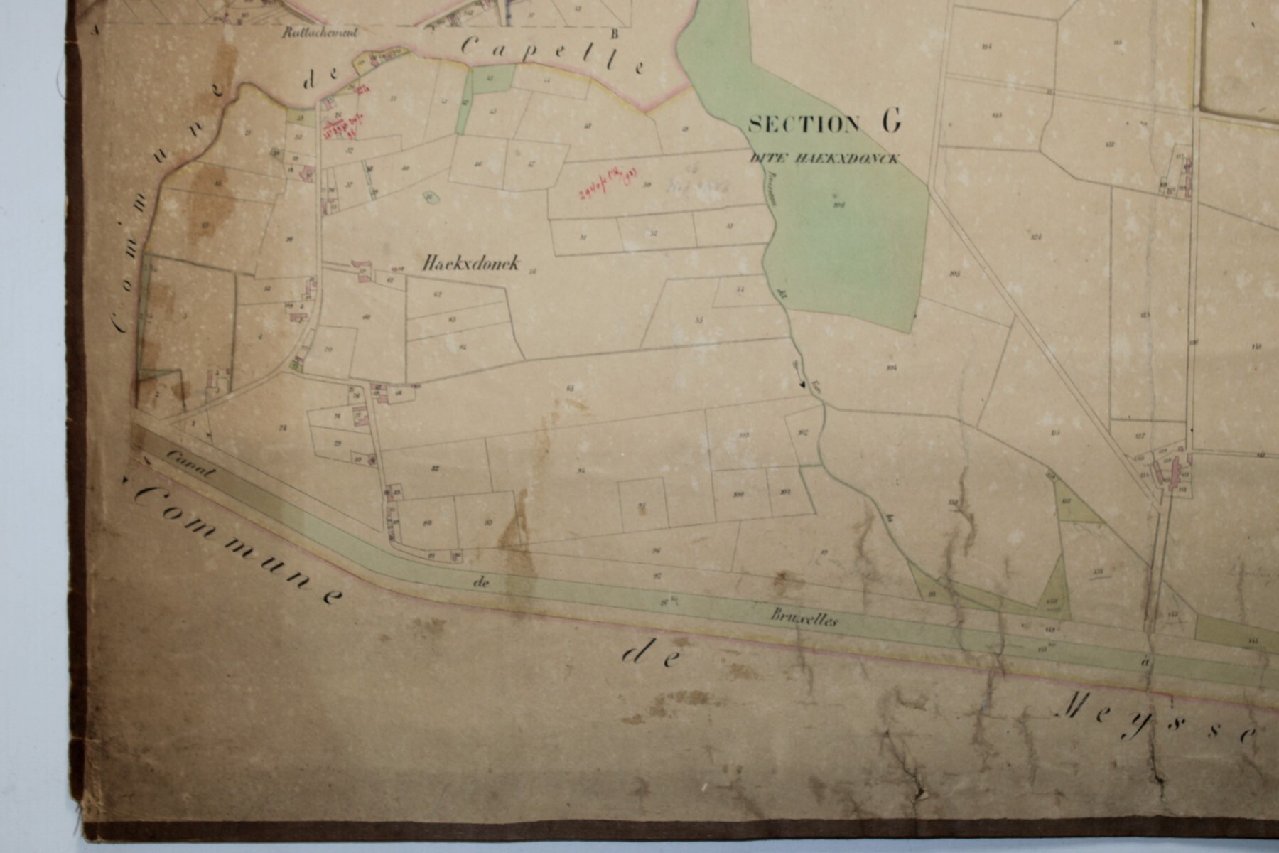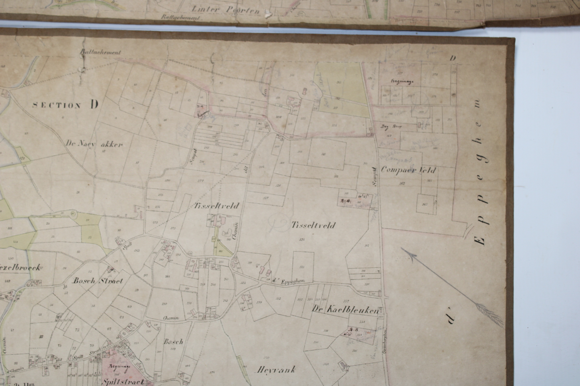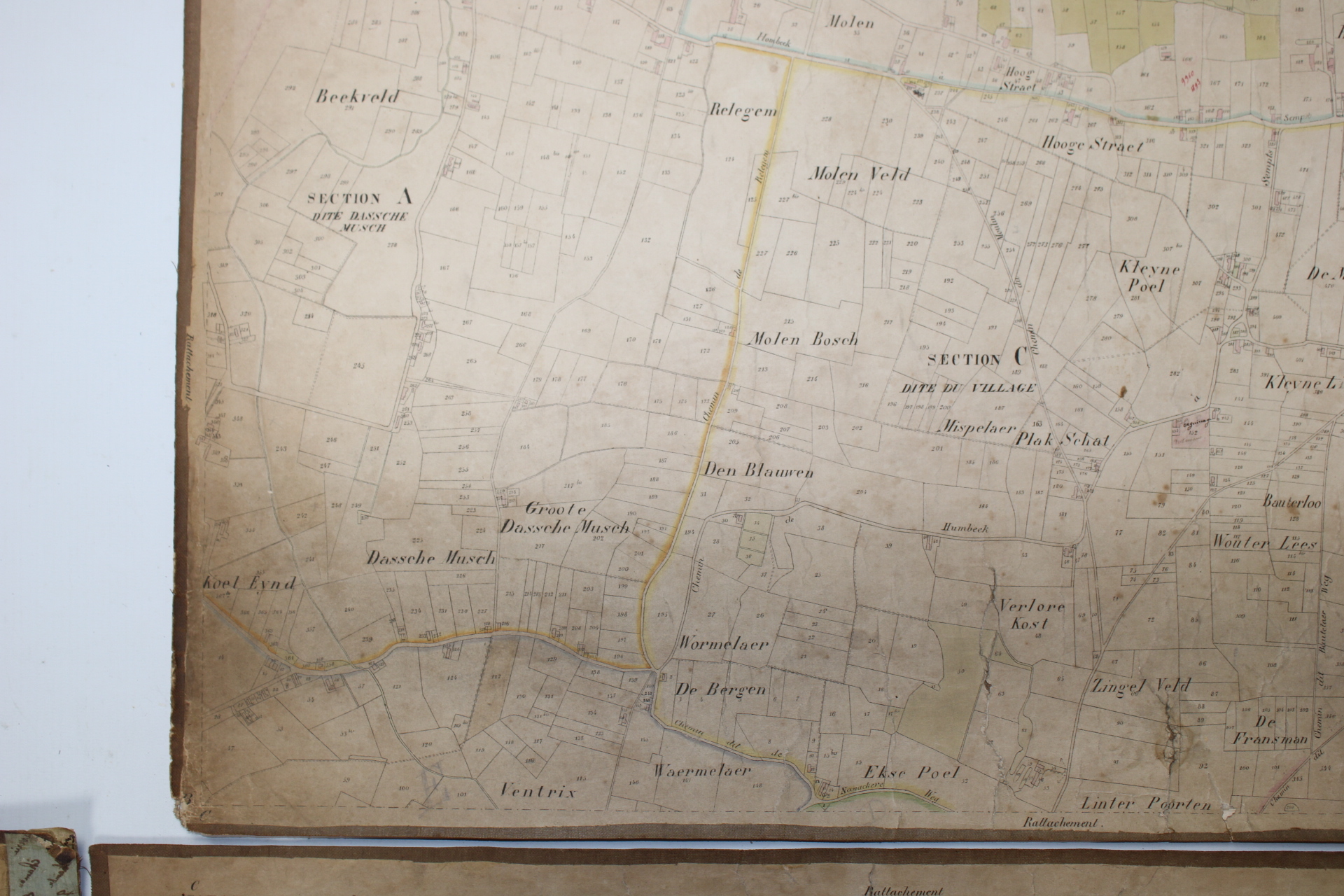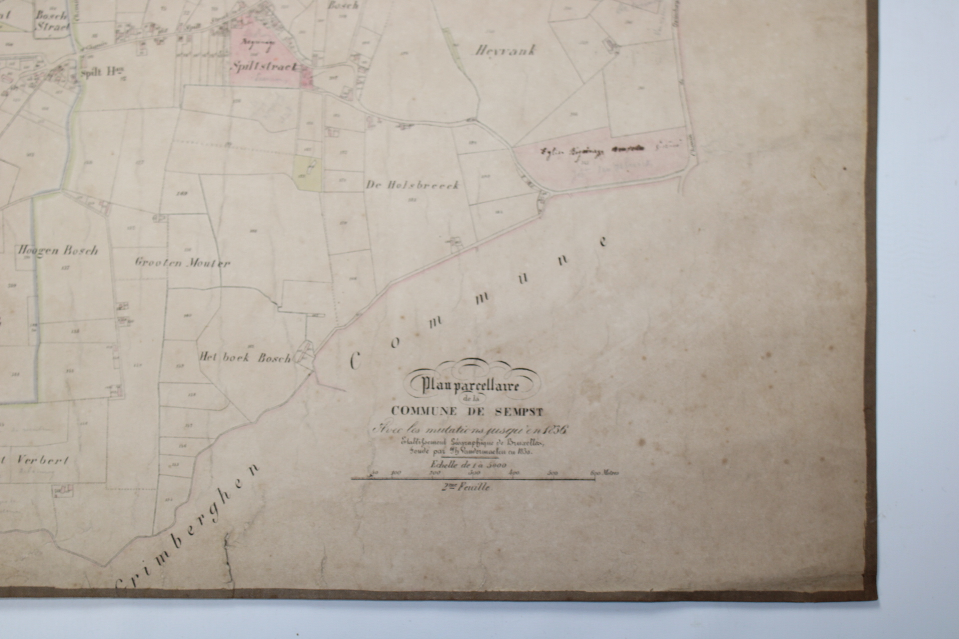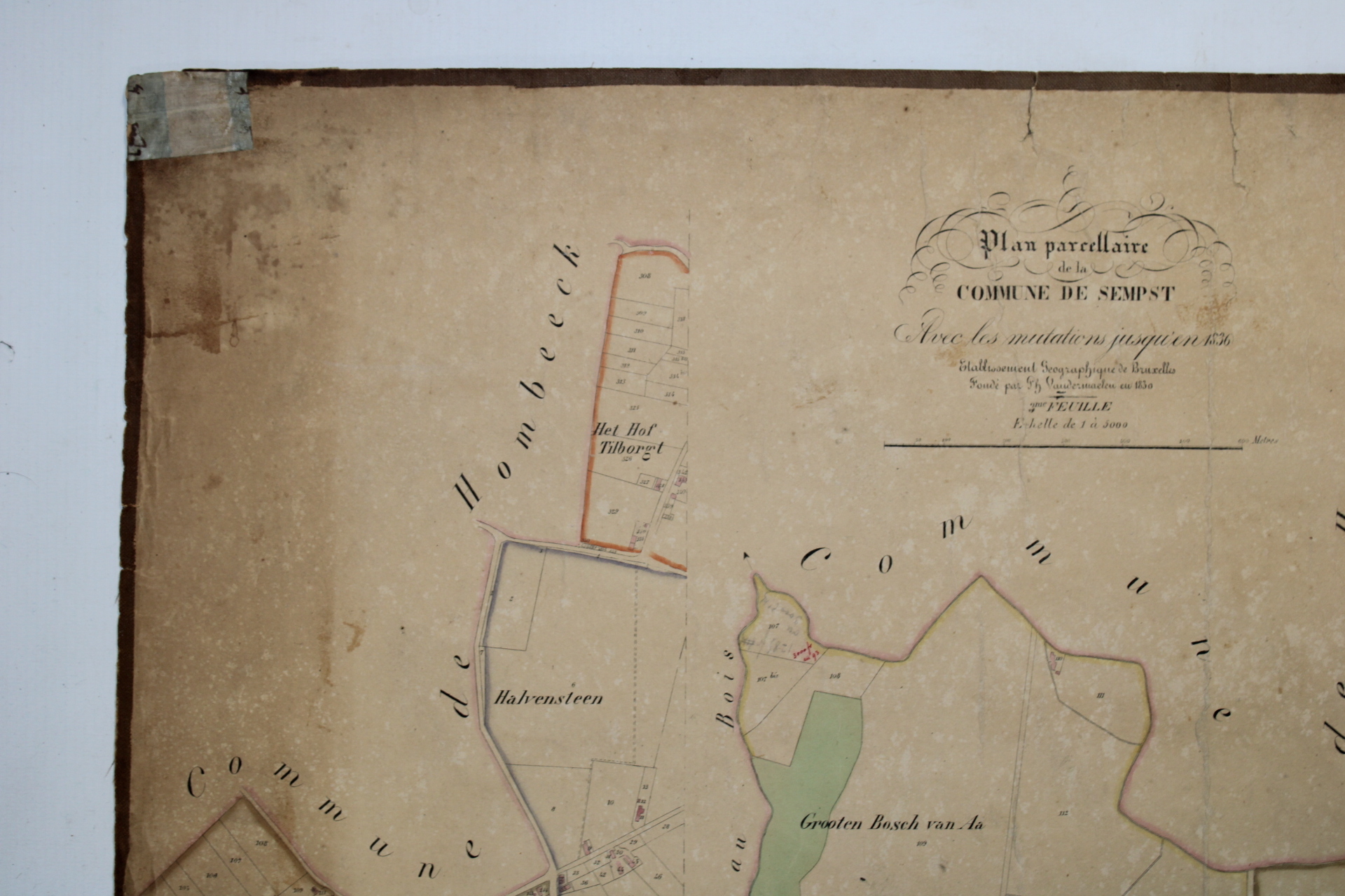 Un lot de 3 cartes (plans cadastraux) anciennes de 'Sempts' de "l'Atlas Cadastral" de Philippe Vandermaelen, datant du milieu du 19e siècle. "Avec les mutations jusqu'en 1836". Philippe Vandermaelen était un cartographe et géographe belge. Il fonda l'Établissement Géographique de Bruxelles en 1830. À partir de 1836, il obtint l'autorisation du ministre des Finances, le baron d'Huart, de publier des plans cadastraux dan 'Atlas Cadastral'. Ces plans, utilisées par les notaires et les géomètres, figurent parmi les premiers plans cadastraux. Elles offrent des représentations très détaillées des parcelles et des maisons. En relativement bon état compte tenu de son âge. Echelle: 1 à 5000.