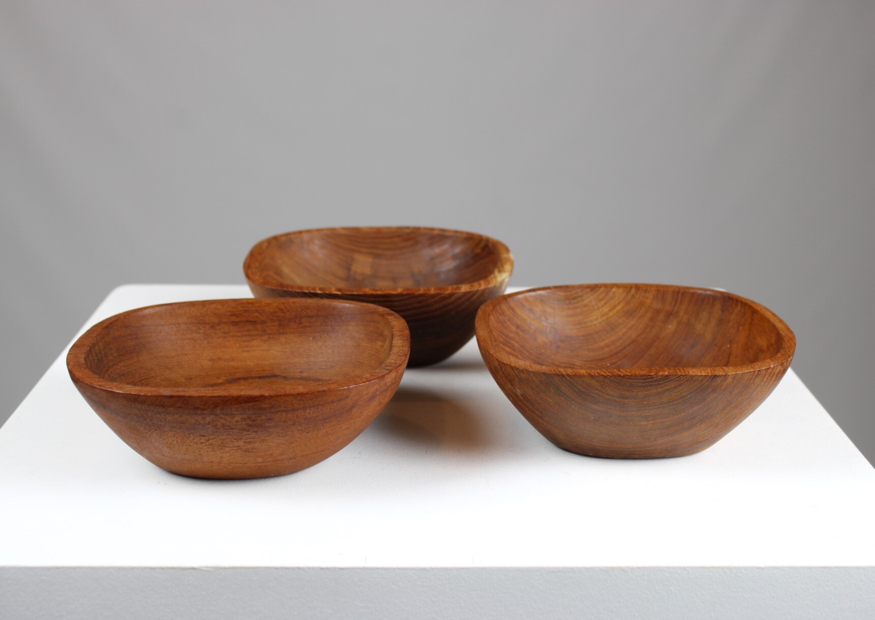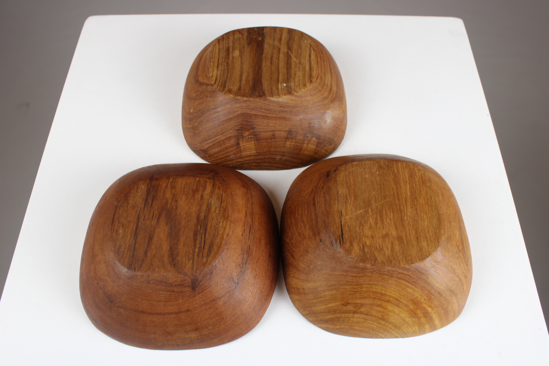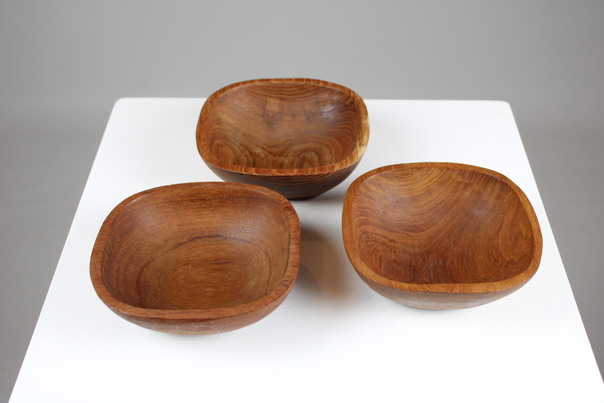 Un ensemble de 3 bols en bois de teck. Vintage, années '60-'70. En bon état, un bol présente des décolorations. Voir photos.