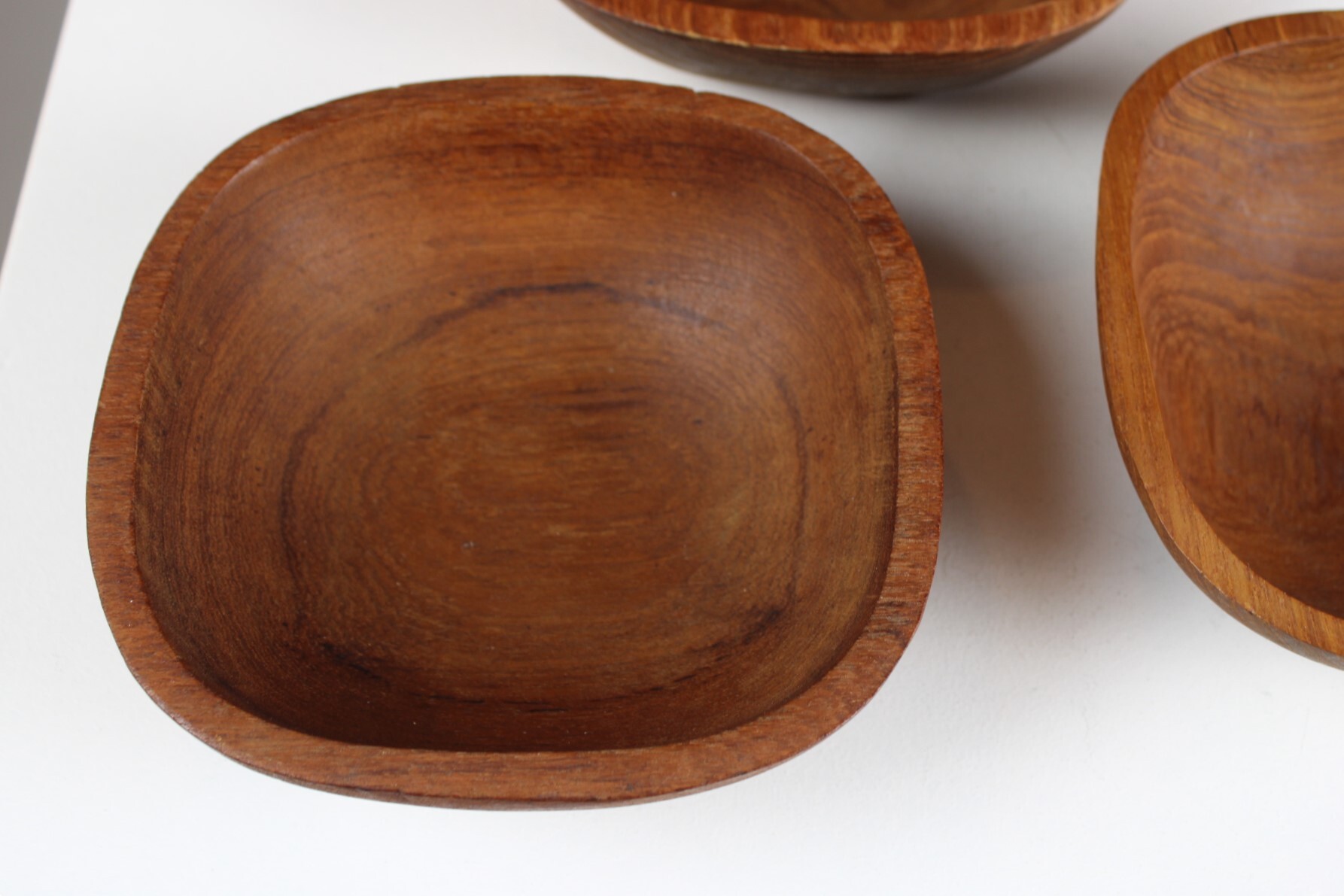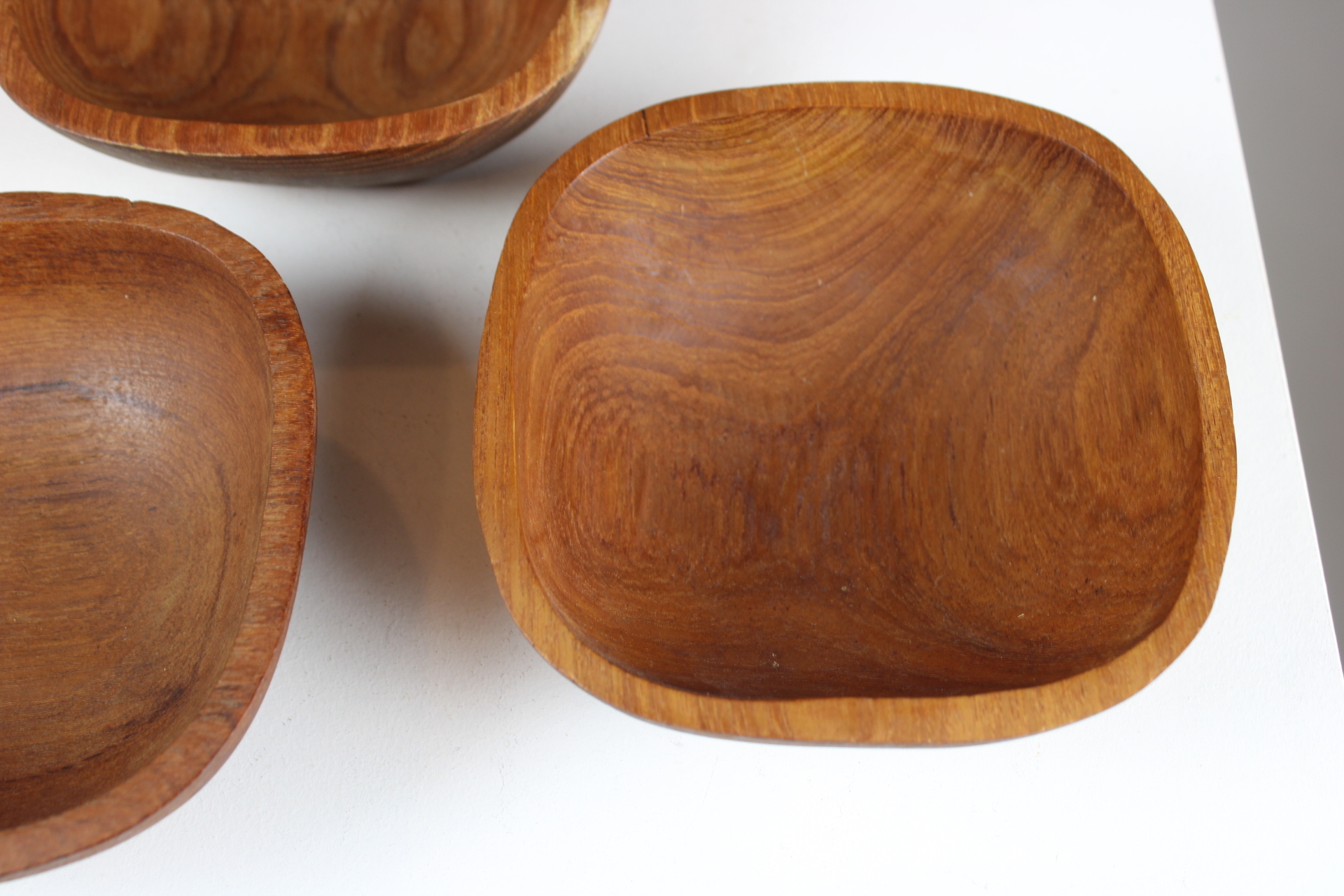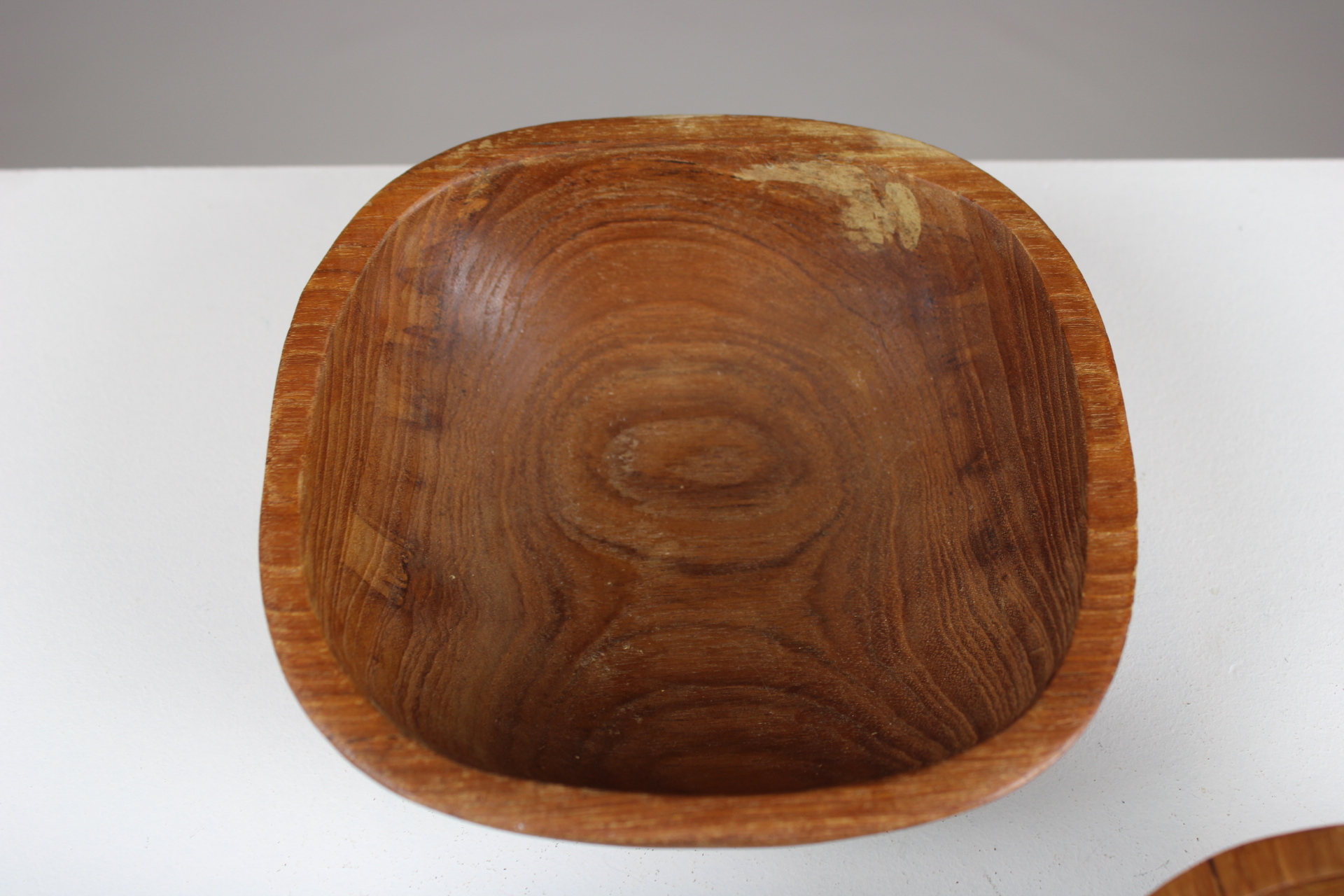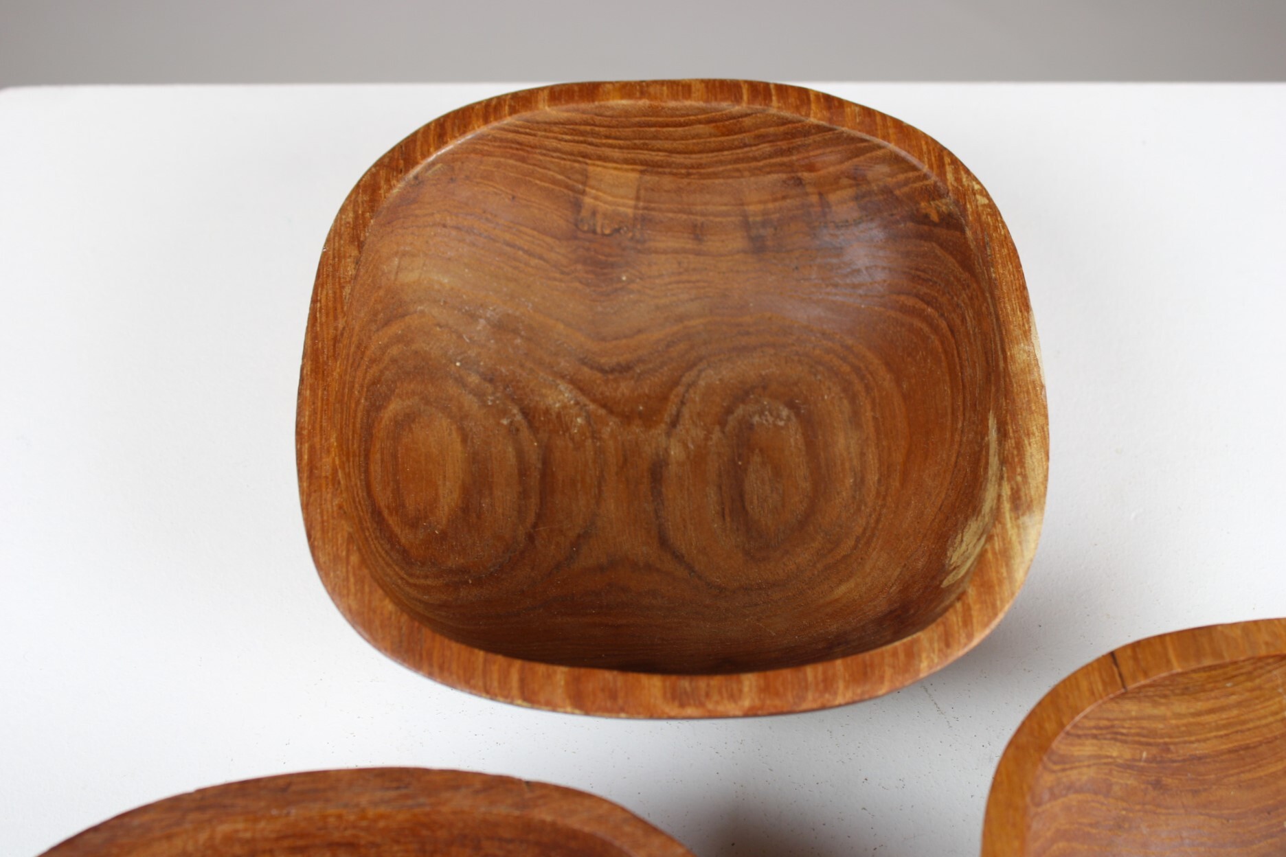 Un ensemble de 3 bols en bois de teck. Vintage, années '60-'70. En bon état, un bol présente des décolorations. Voir photos.