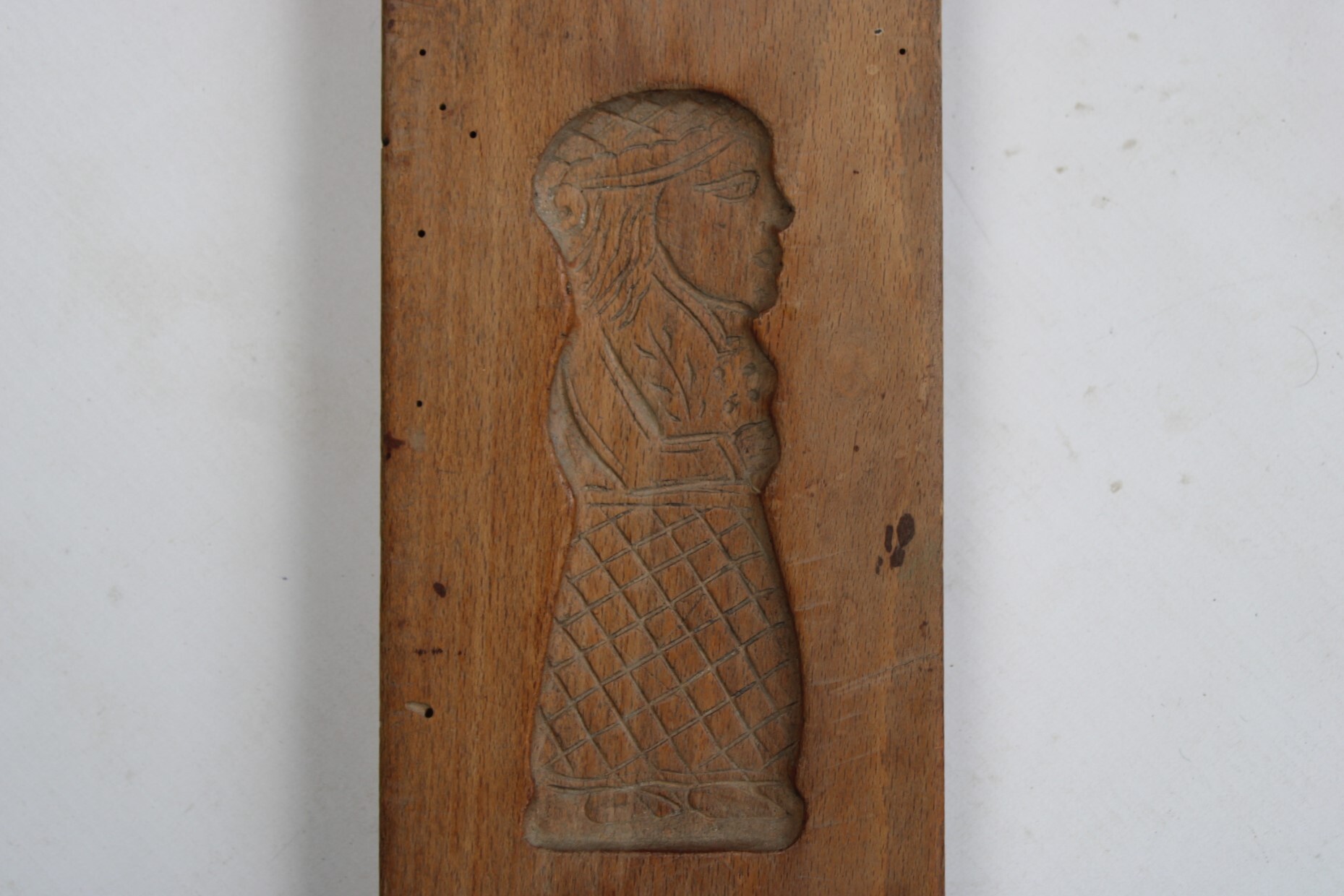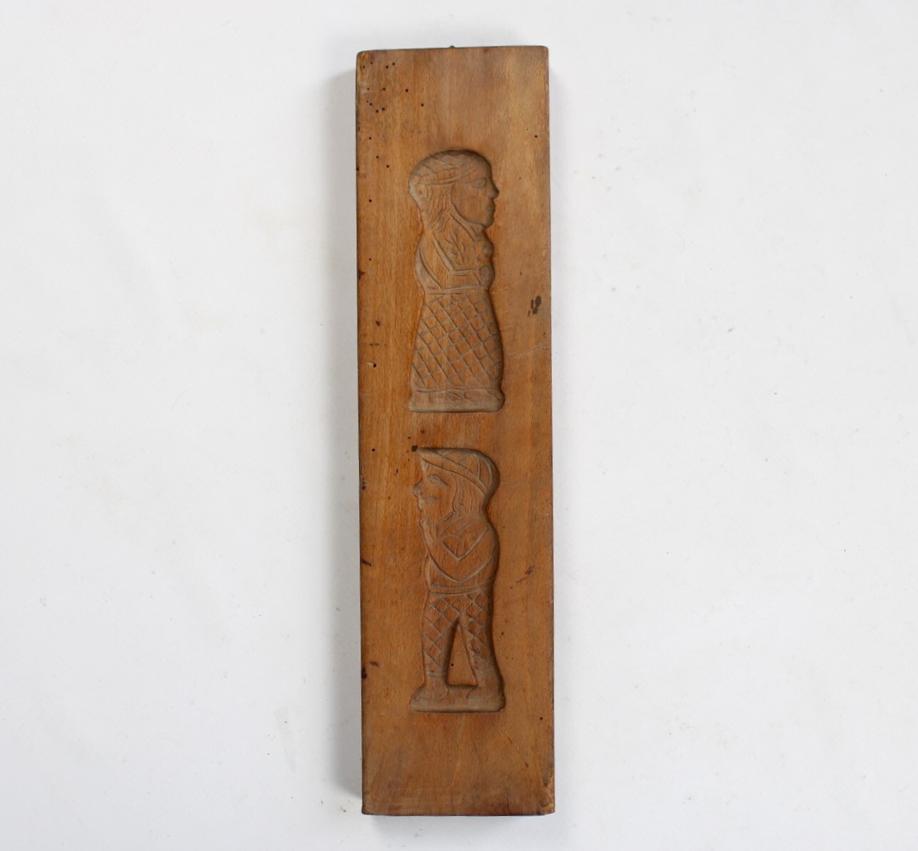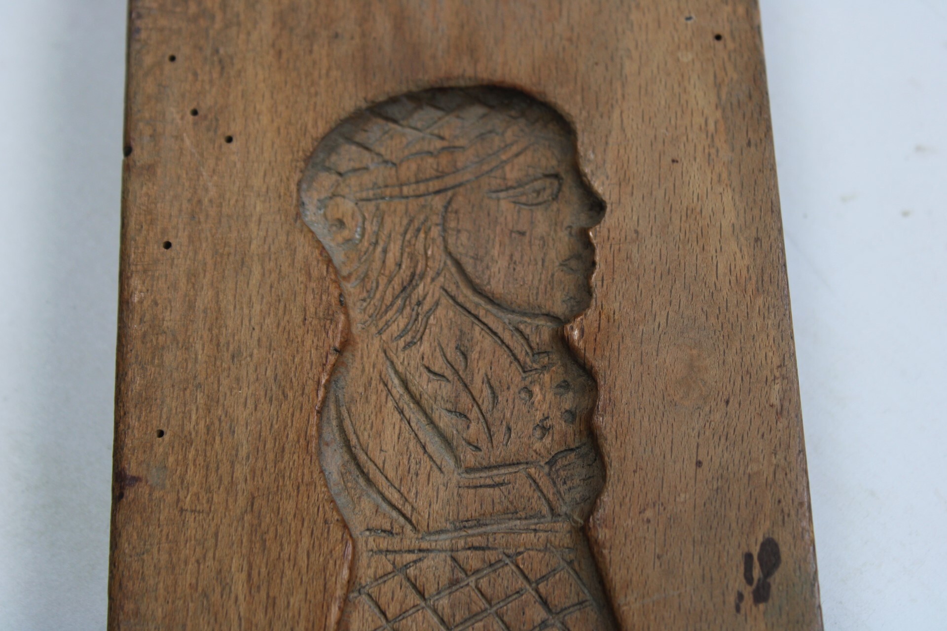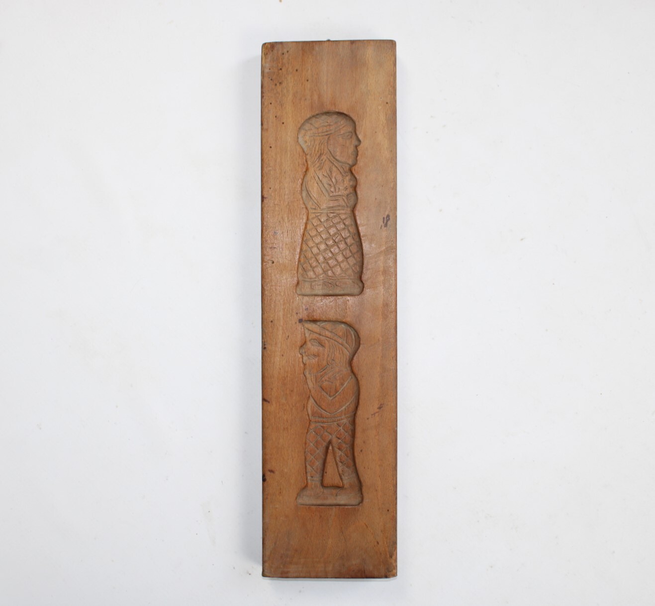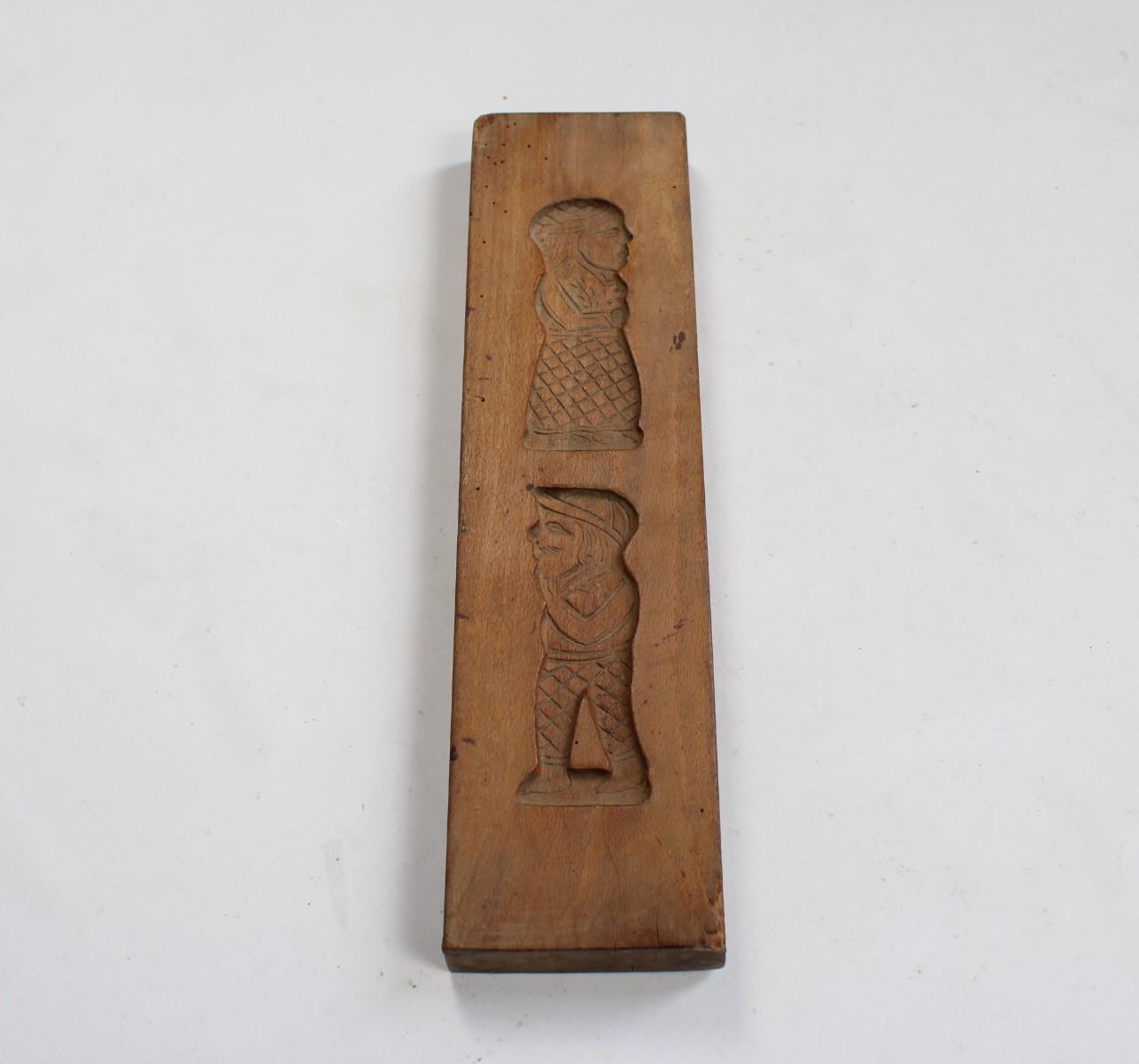 Ancien moule à spéculoos en bois. Deux images superposées représentent un homme et une femme coiffés d'un chapeau.