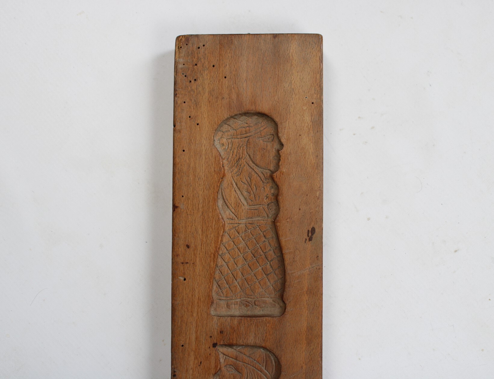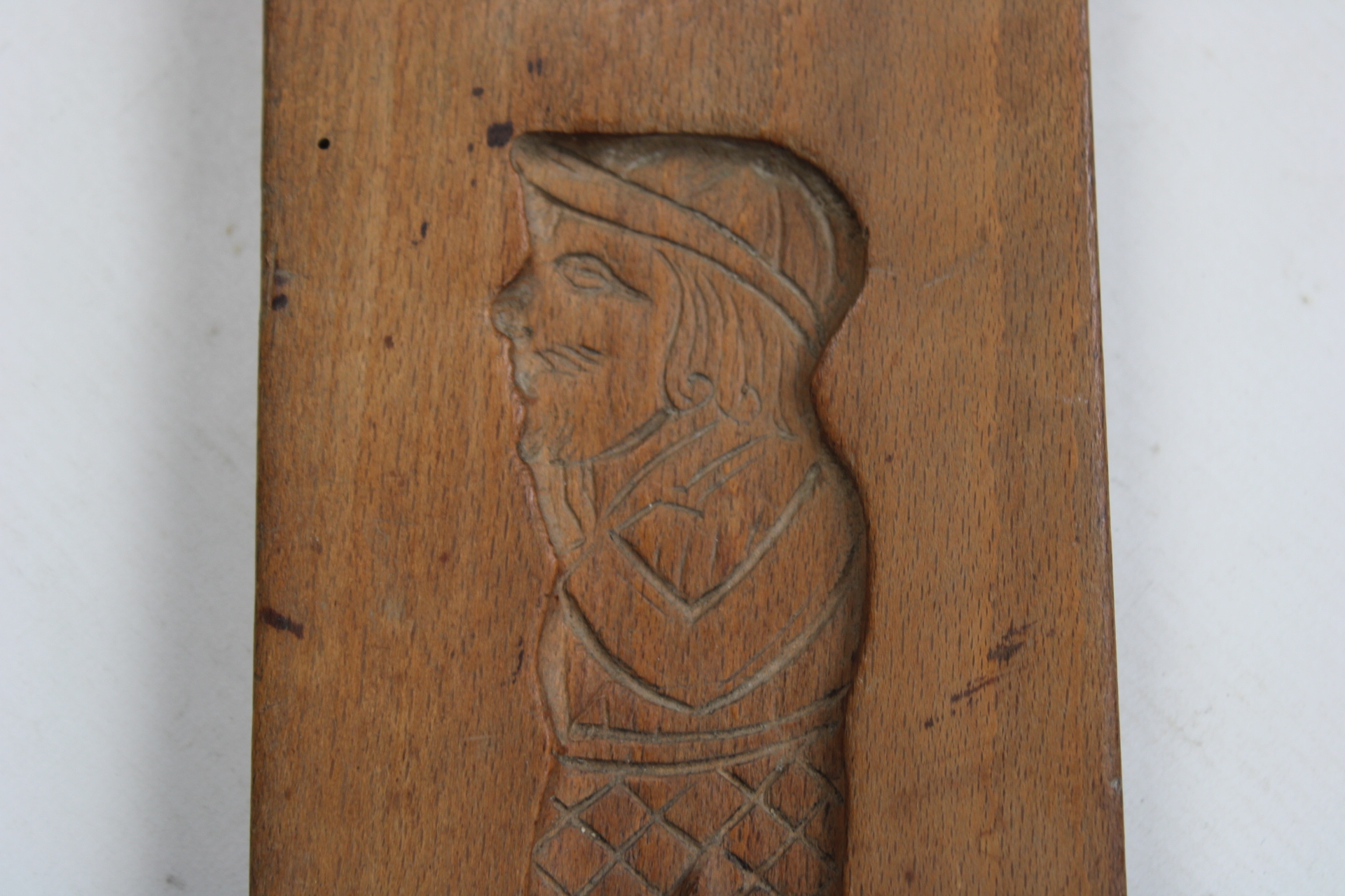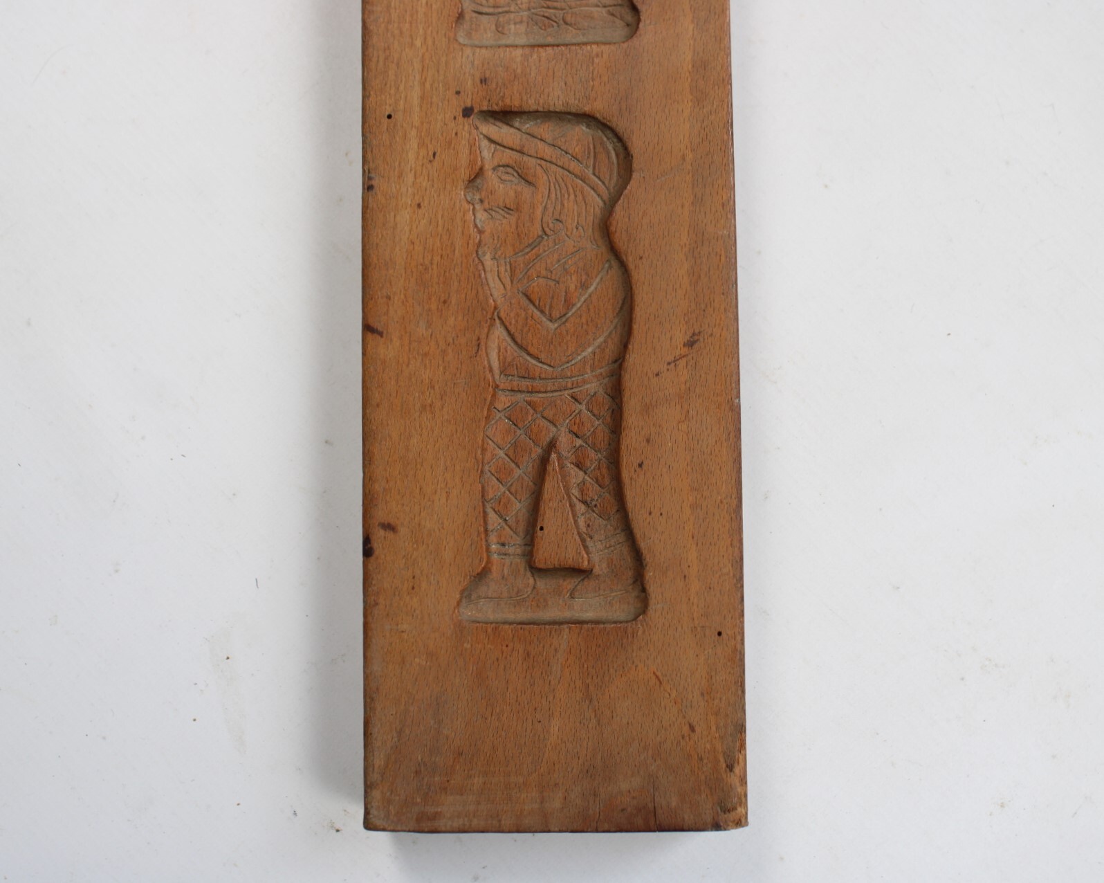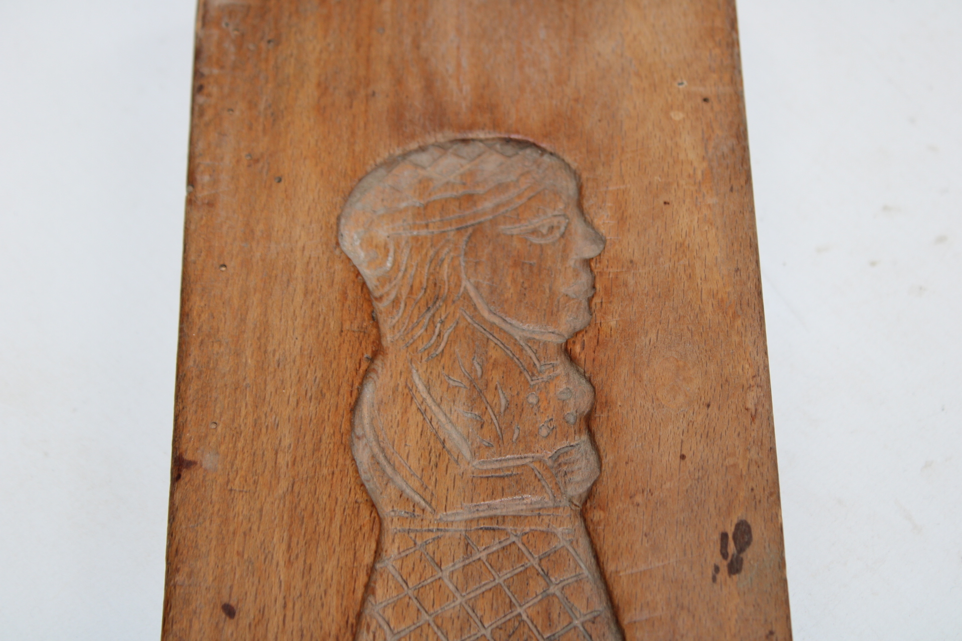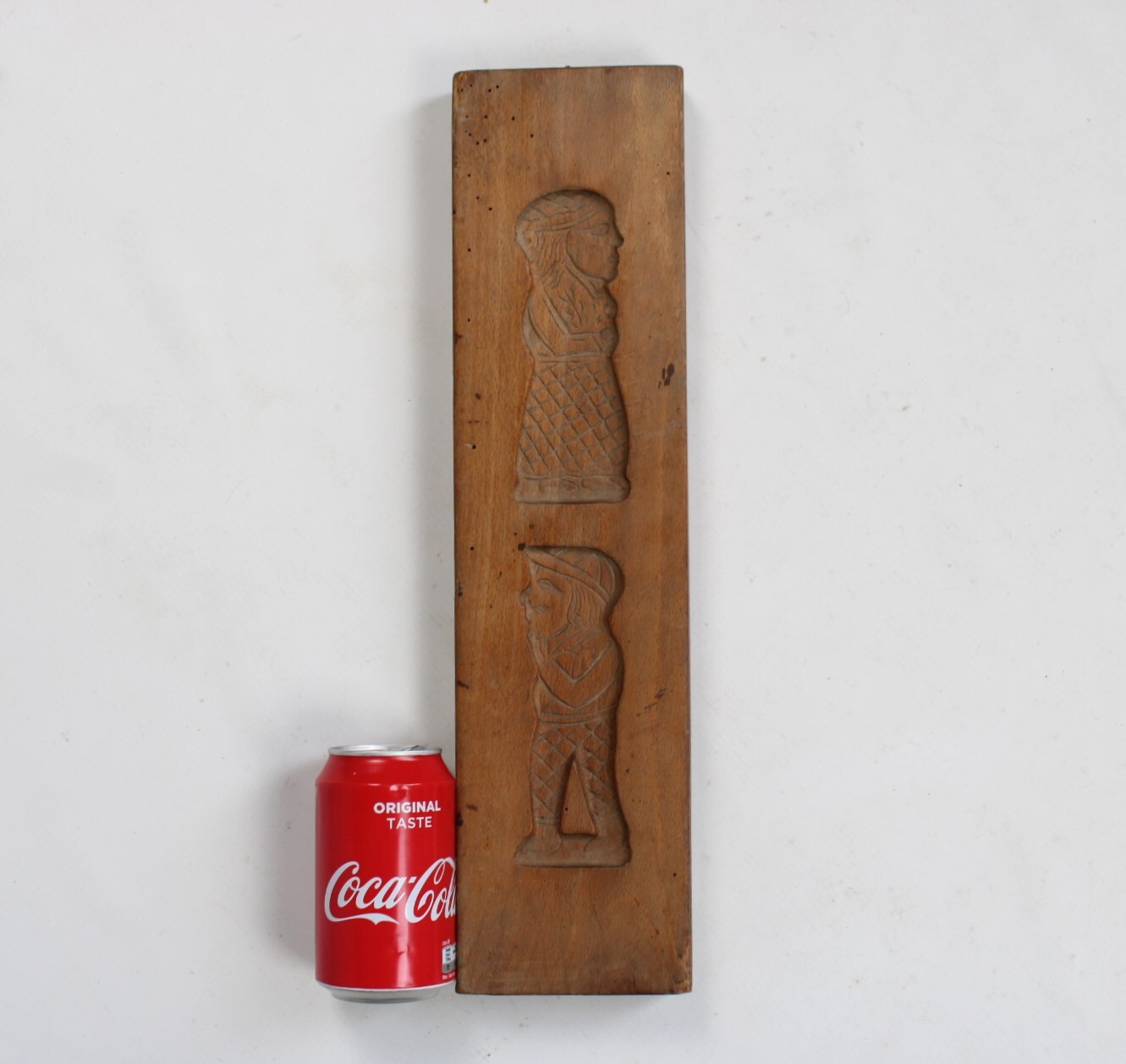 Ancien moule à spéculoos en bois. Deux images superposées représentent un homme et une femme coiffés d'un chapeau.