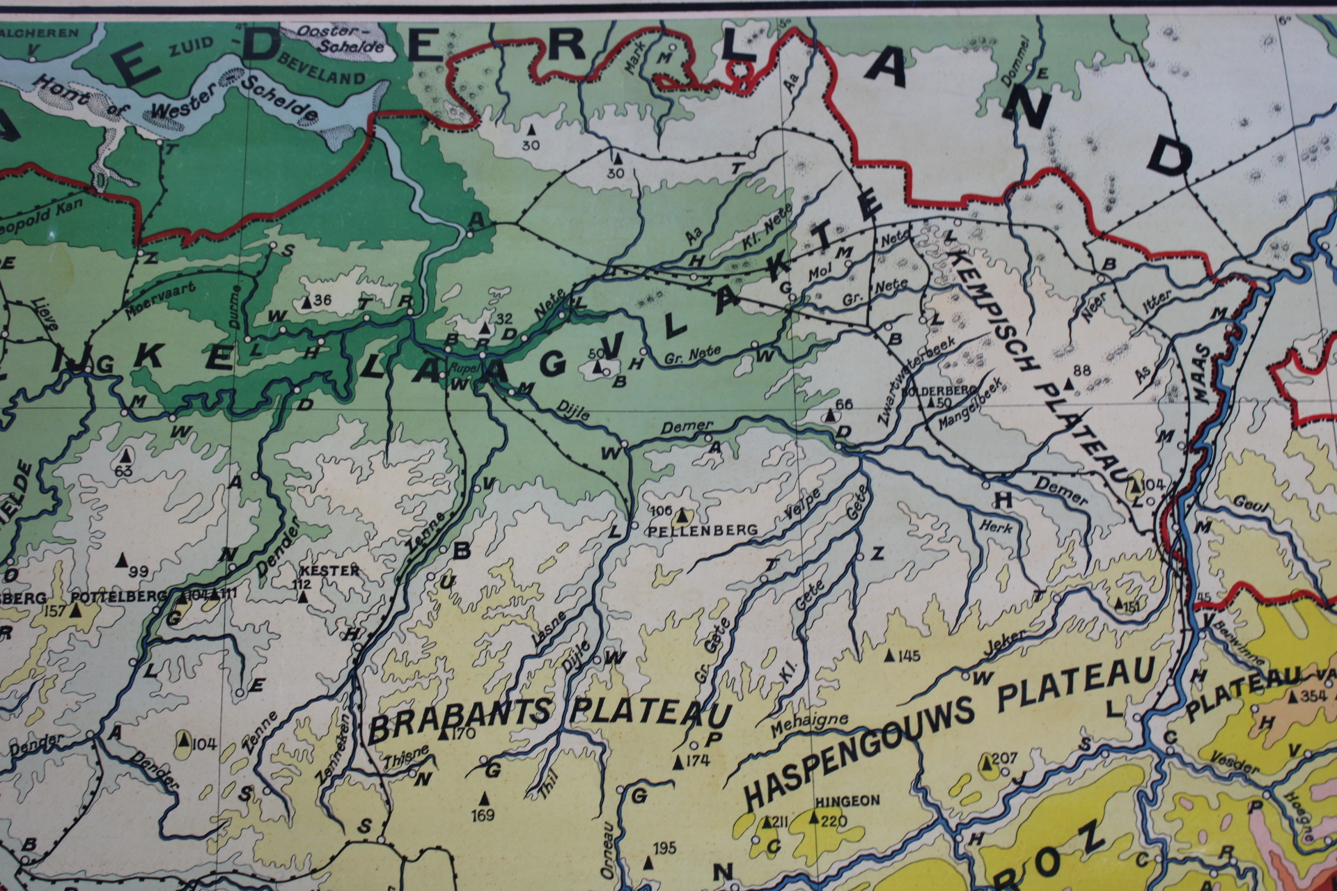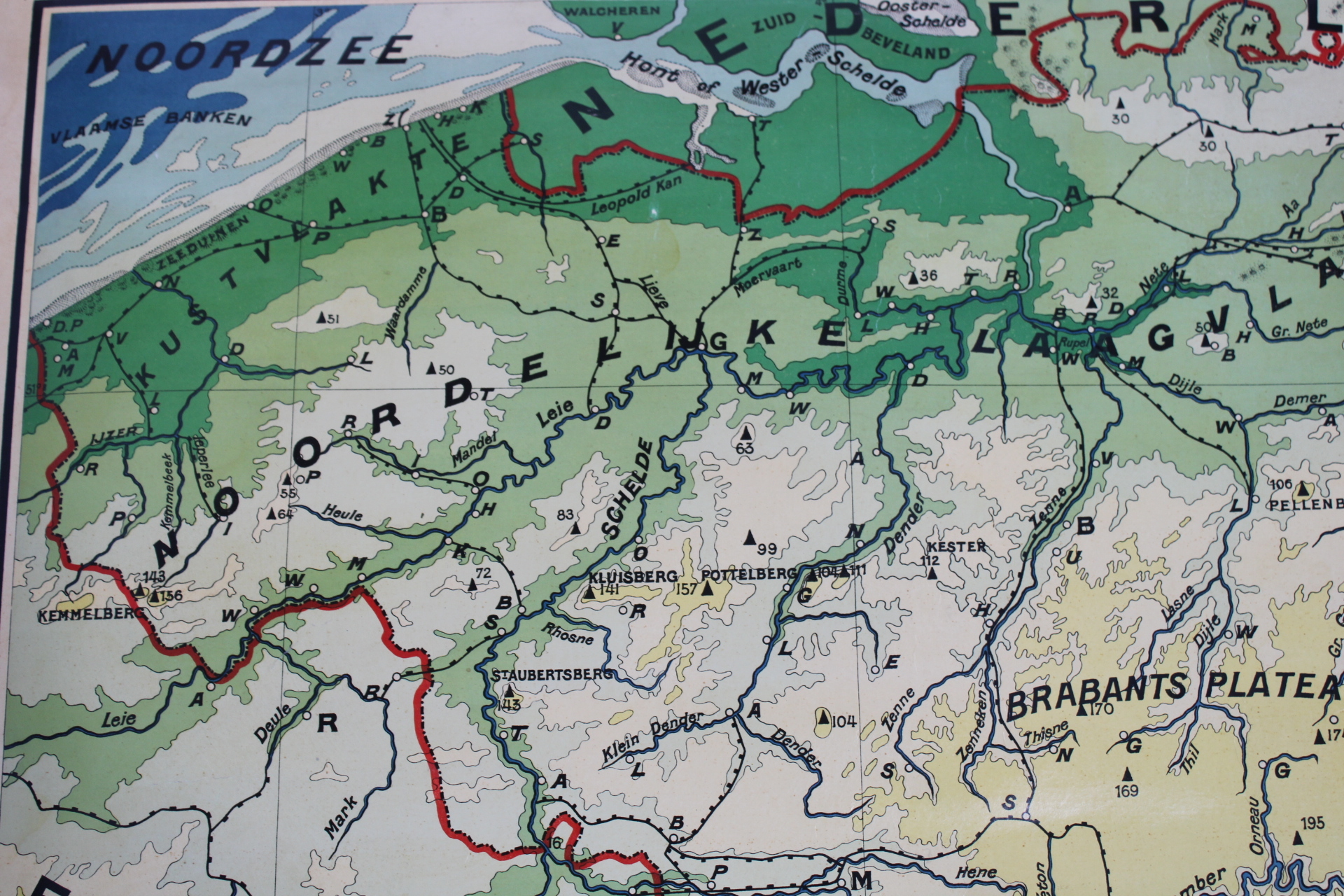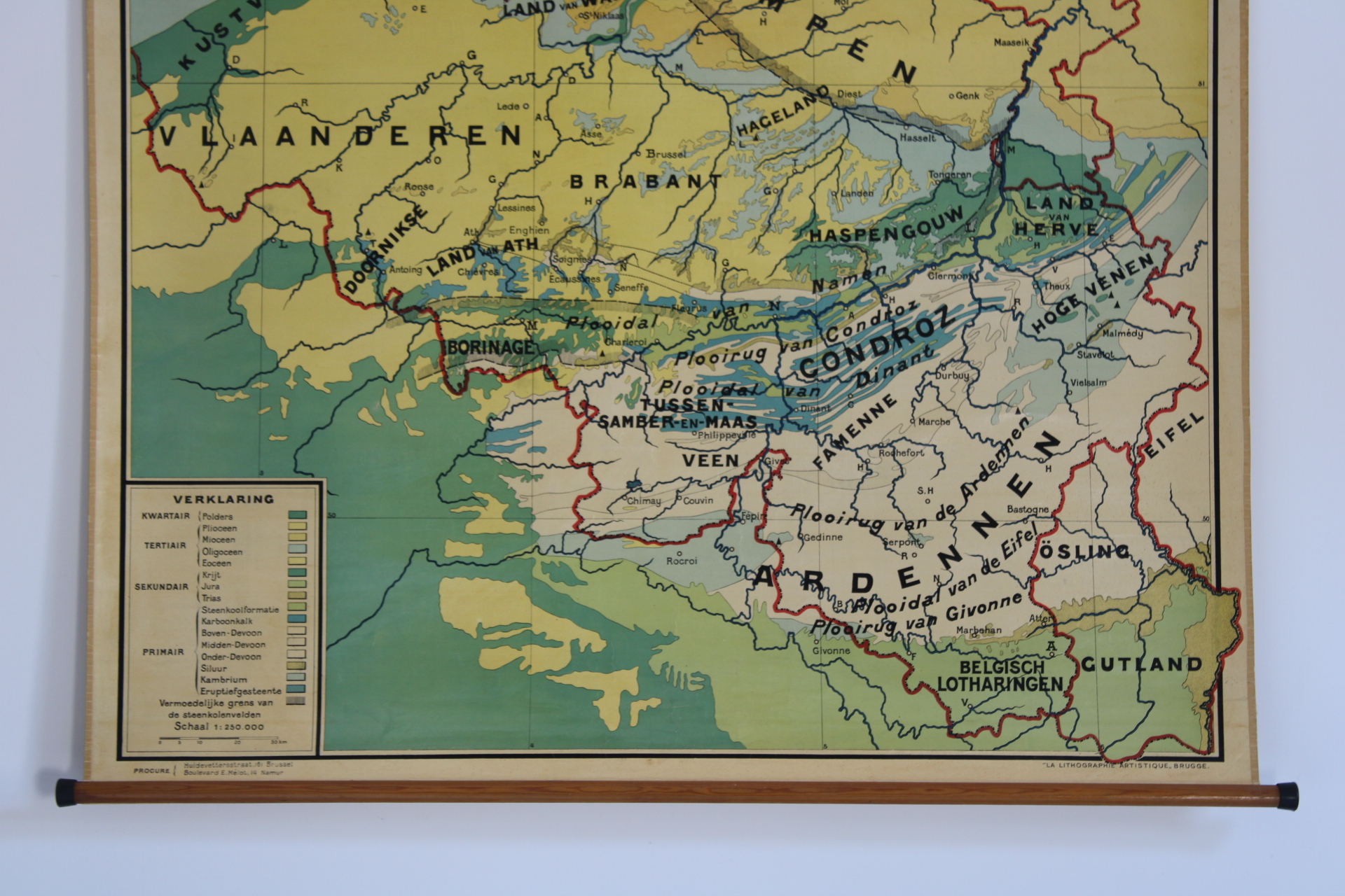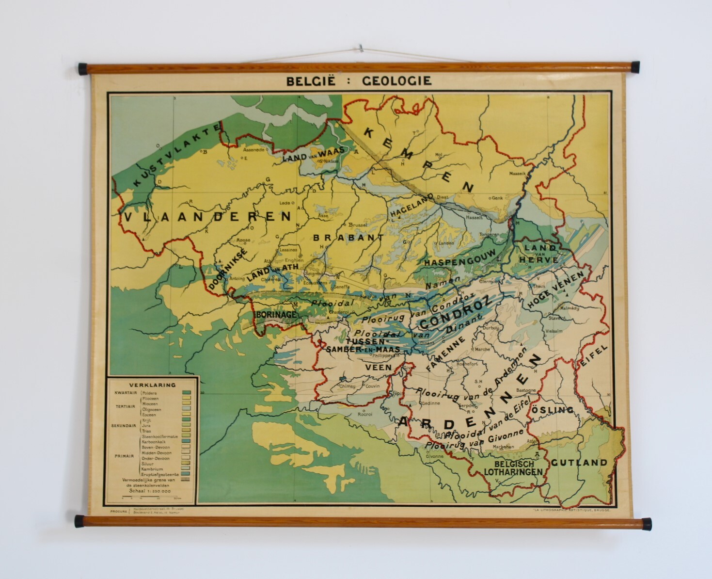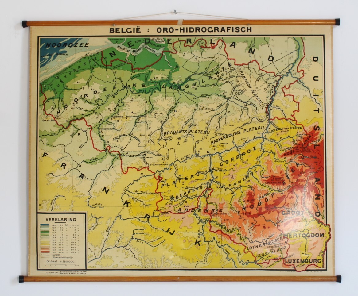 Une carte d'école ancienne recto verso de la Belgique: oro-hydrographique et géologie.