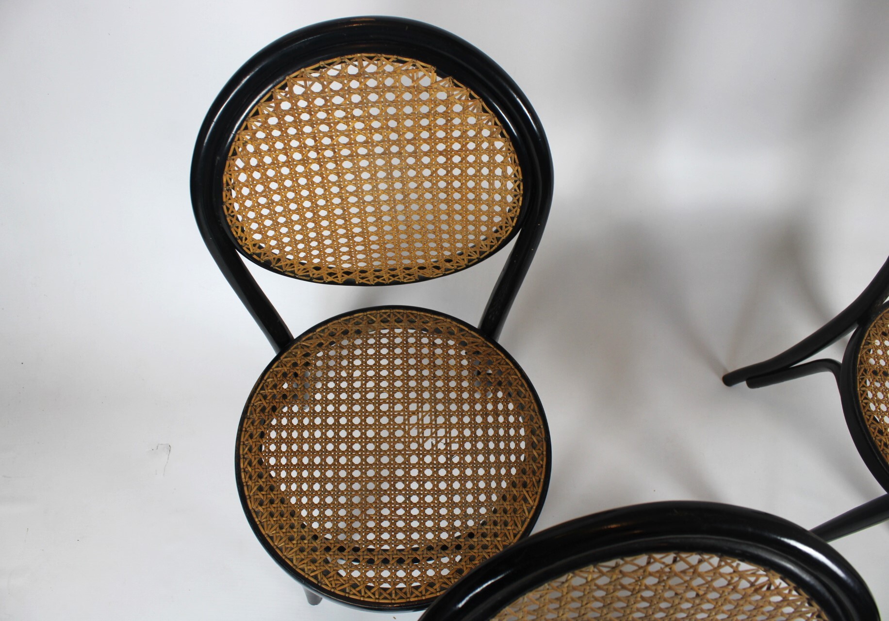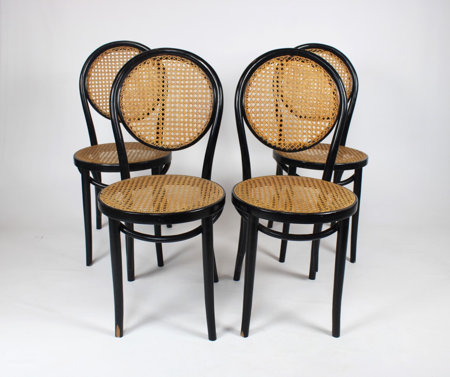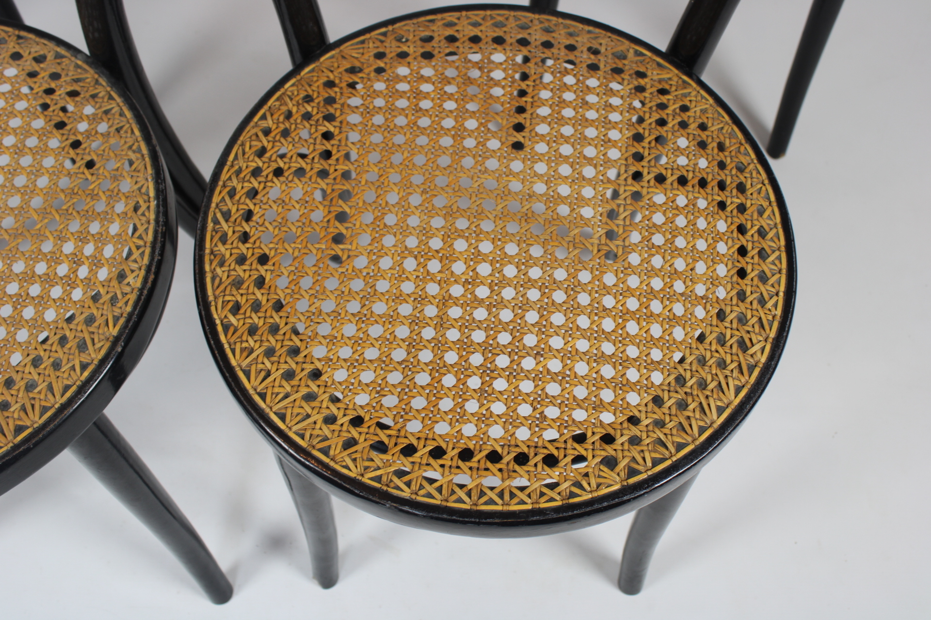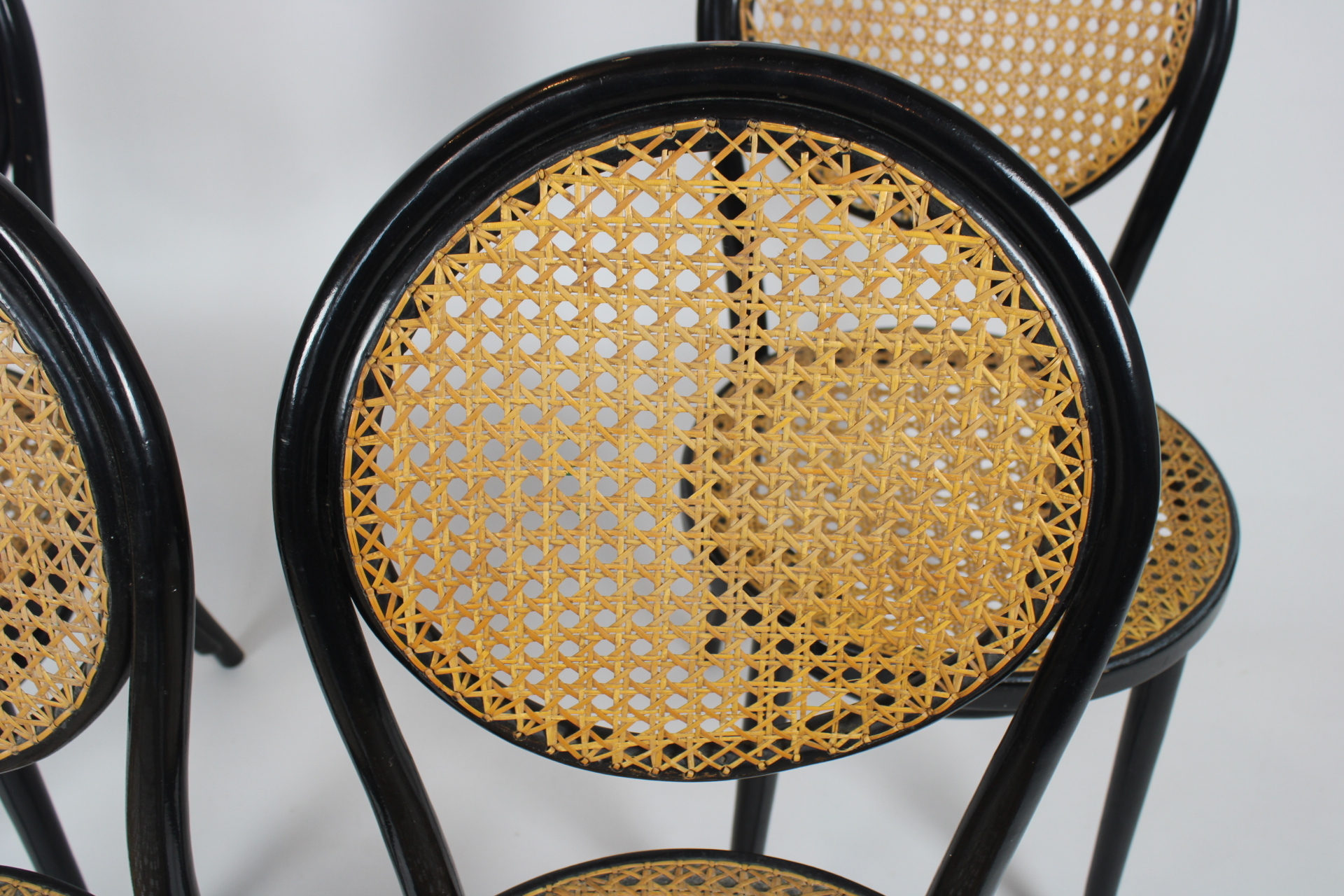 Een set van 4 zwarte stoelen in bentwood met rieten zitting in de stijl van Thonet of Kohn. Niet gemarkeerd.