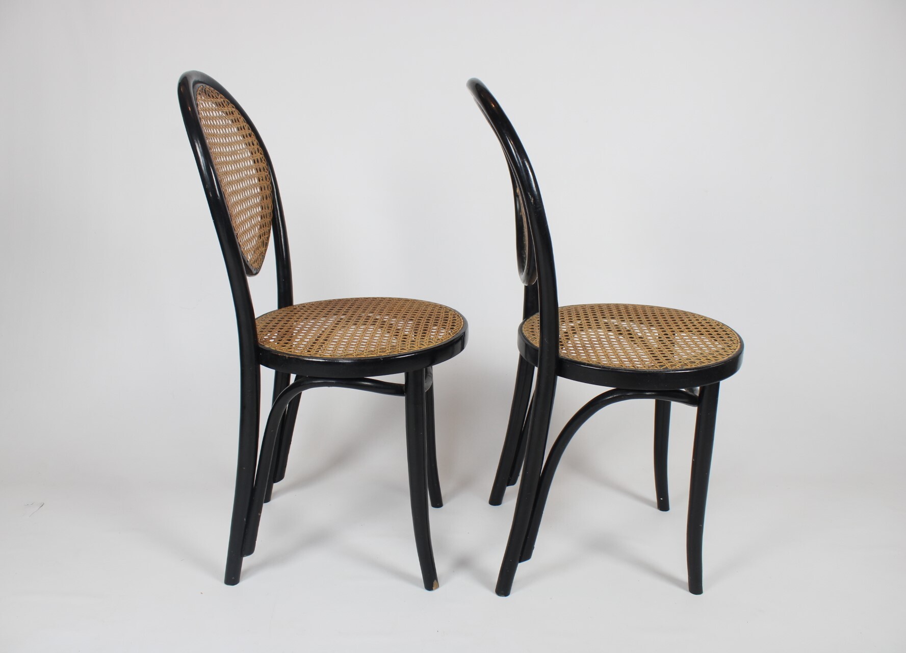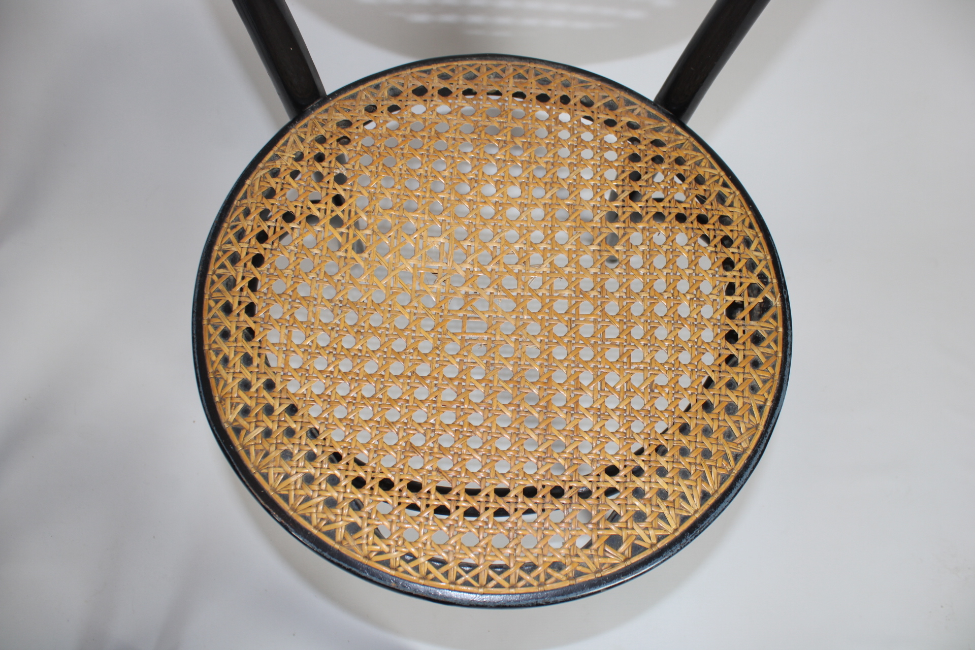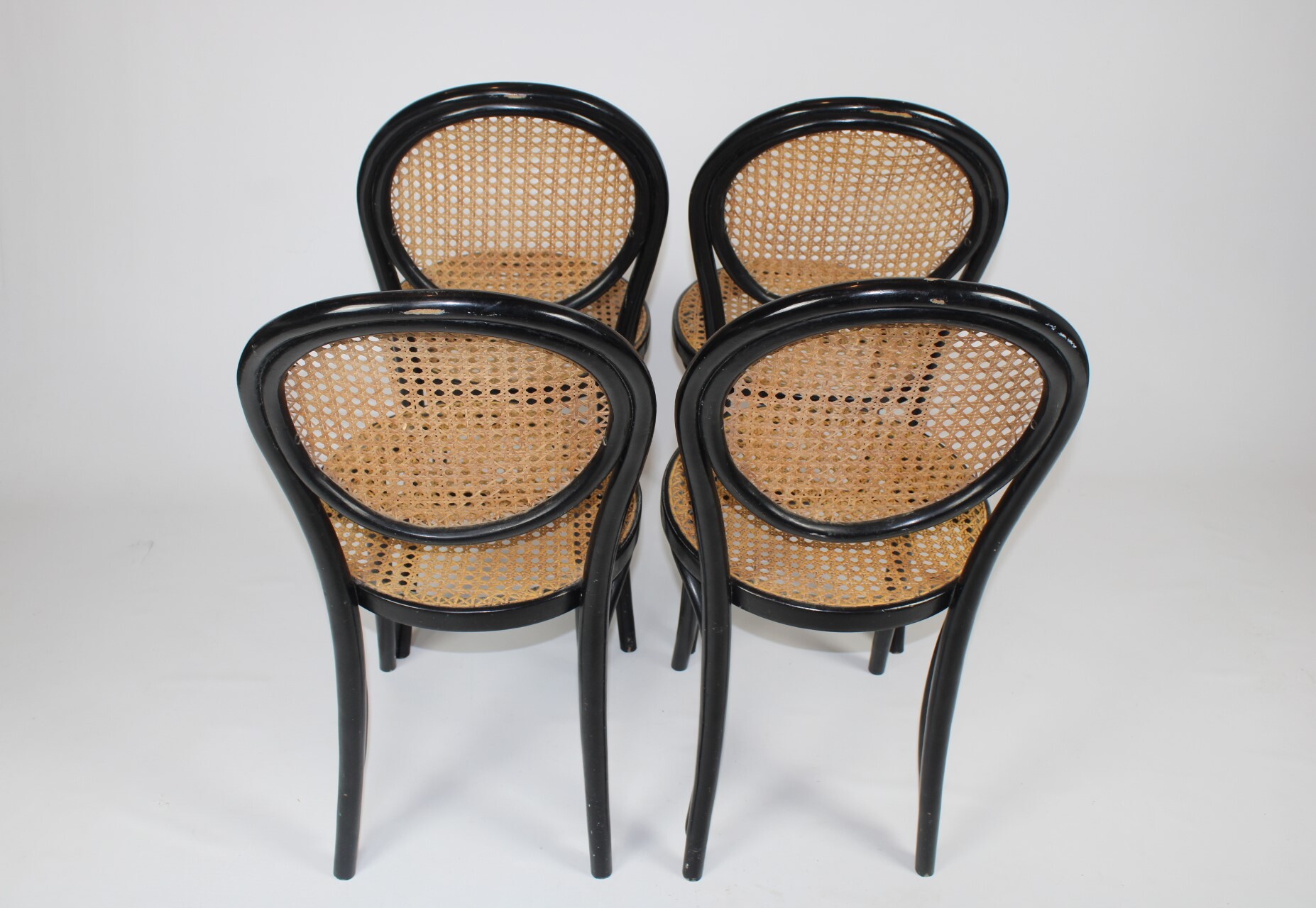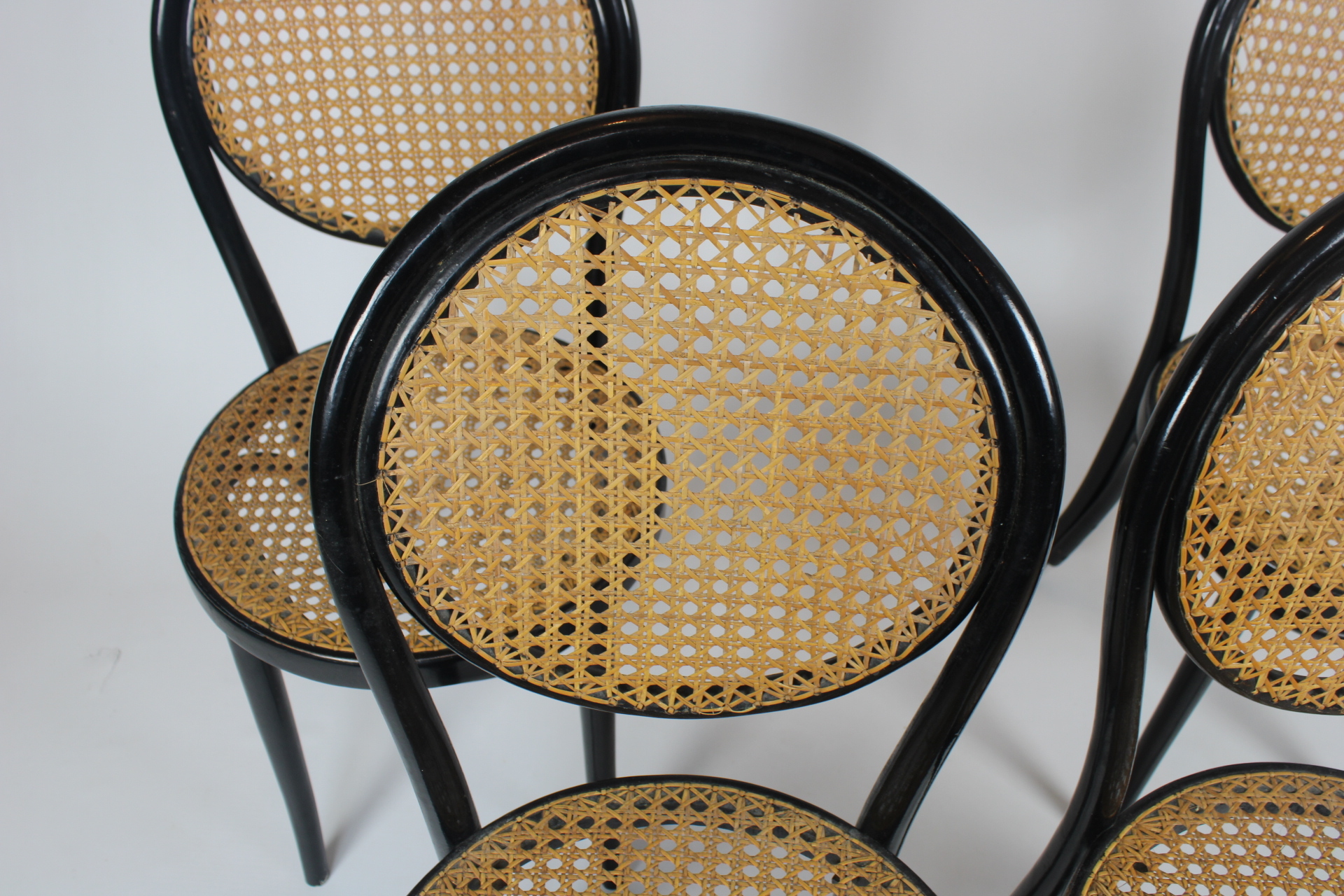 Een set van 4 zwarte stoelen in bentwood met rieten zitting in de stijl van Thonet of Kohn. Niet gemarkeerd.