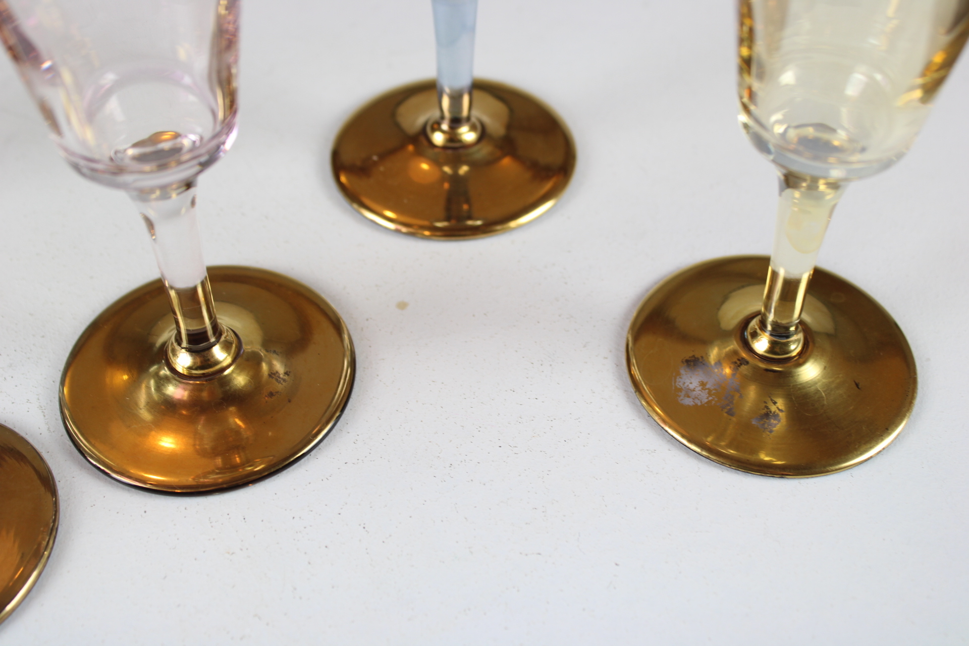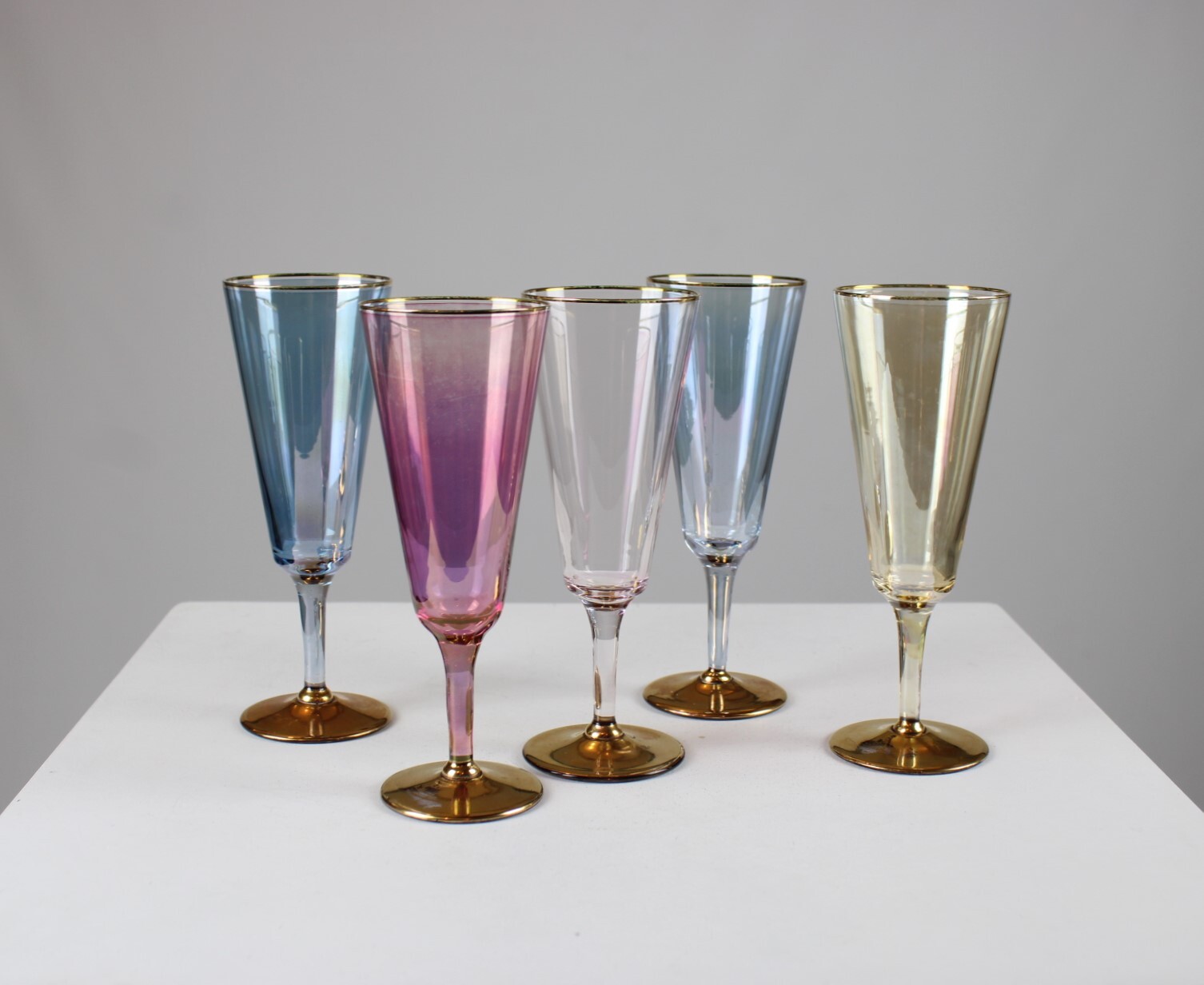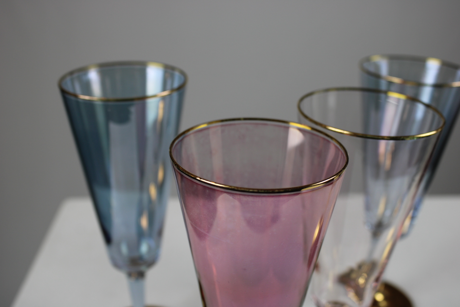 Een set van 5 pastelkleurige glazen in iriserend glas met een verguld randje bovenaan en vergulde voet. Enkele slijtagesporen, zie foto's.