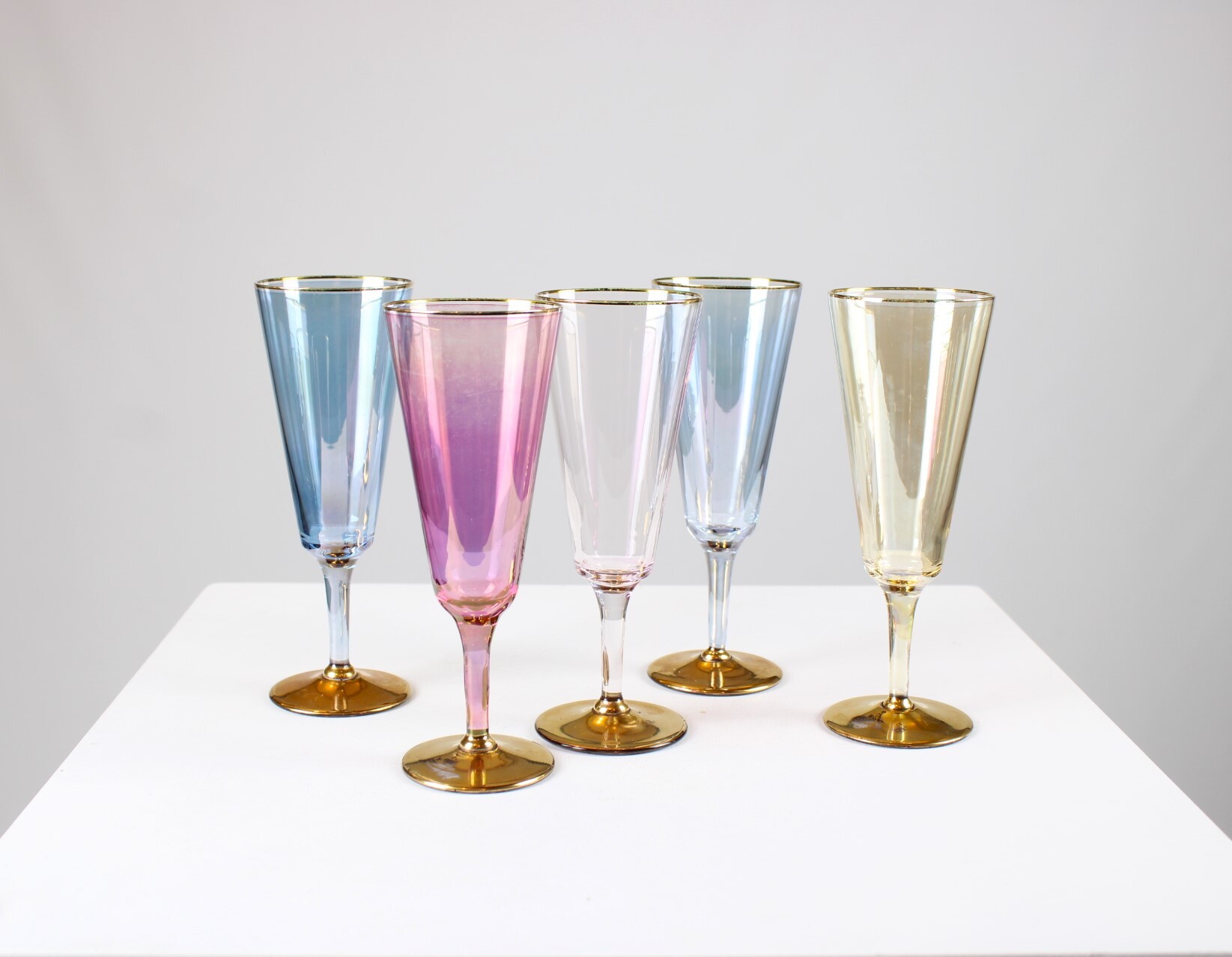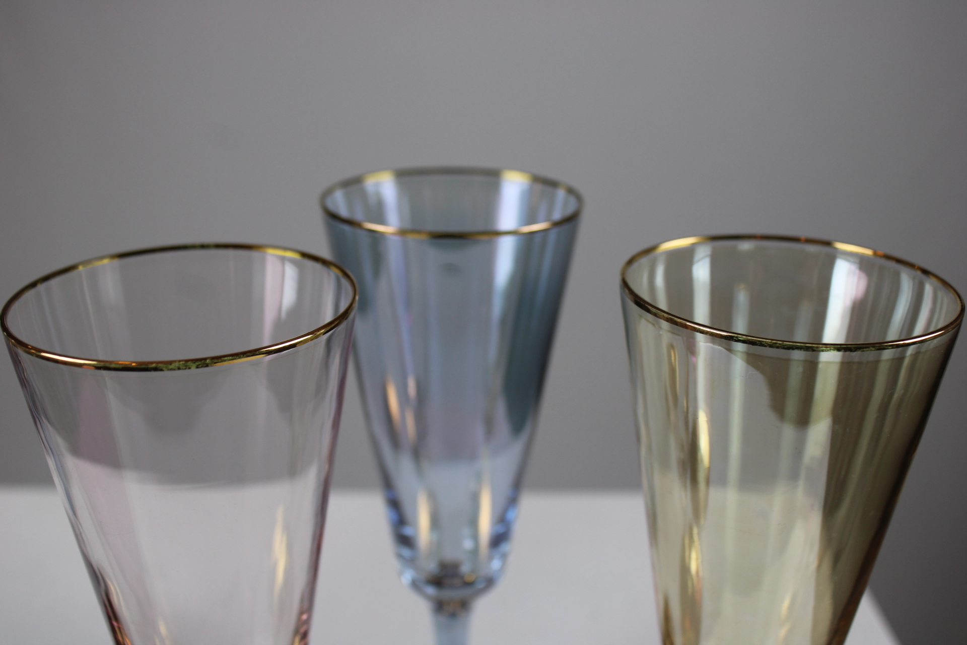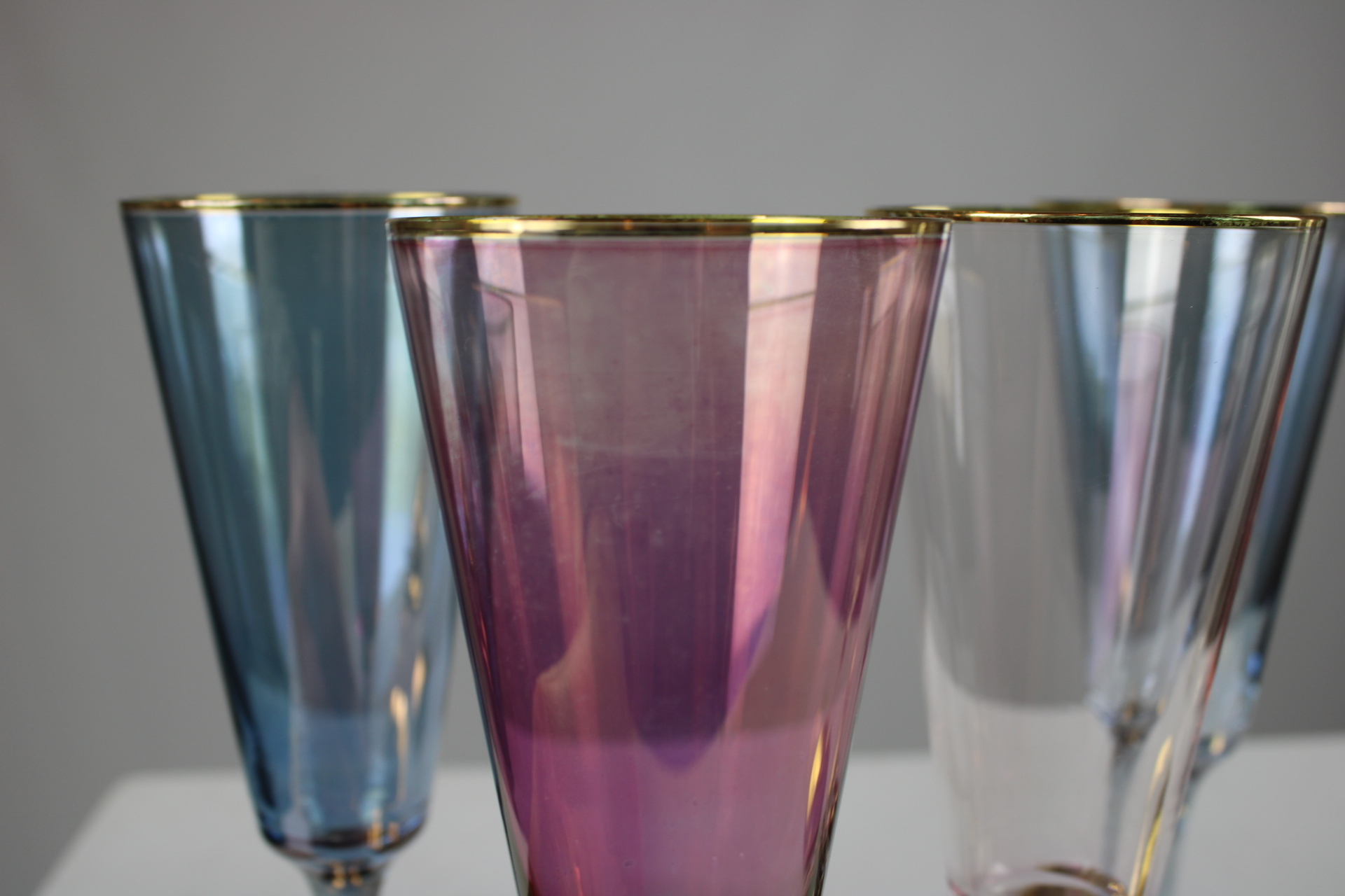 Een set van 5 pastelkleurige glazen in iriserend glas met een verguld randje bovenaan en vergulde voet. Enkele slijtagesporen, zie foto's.