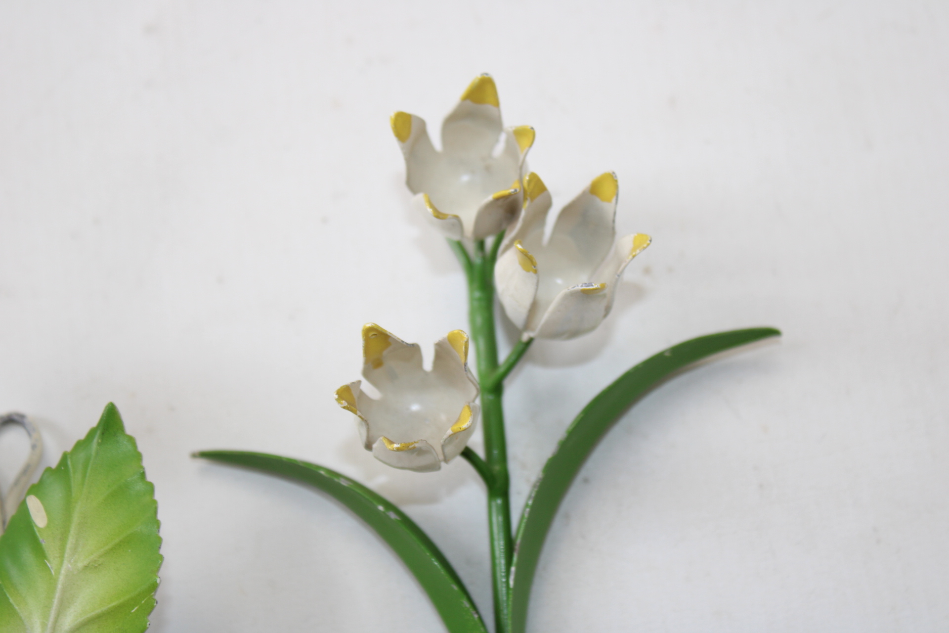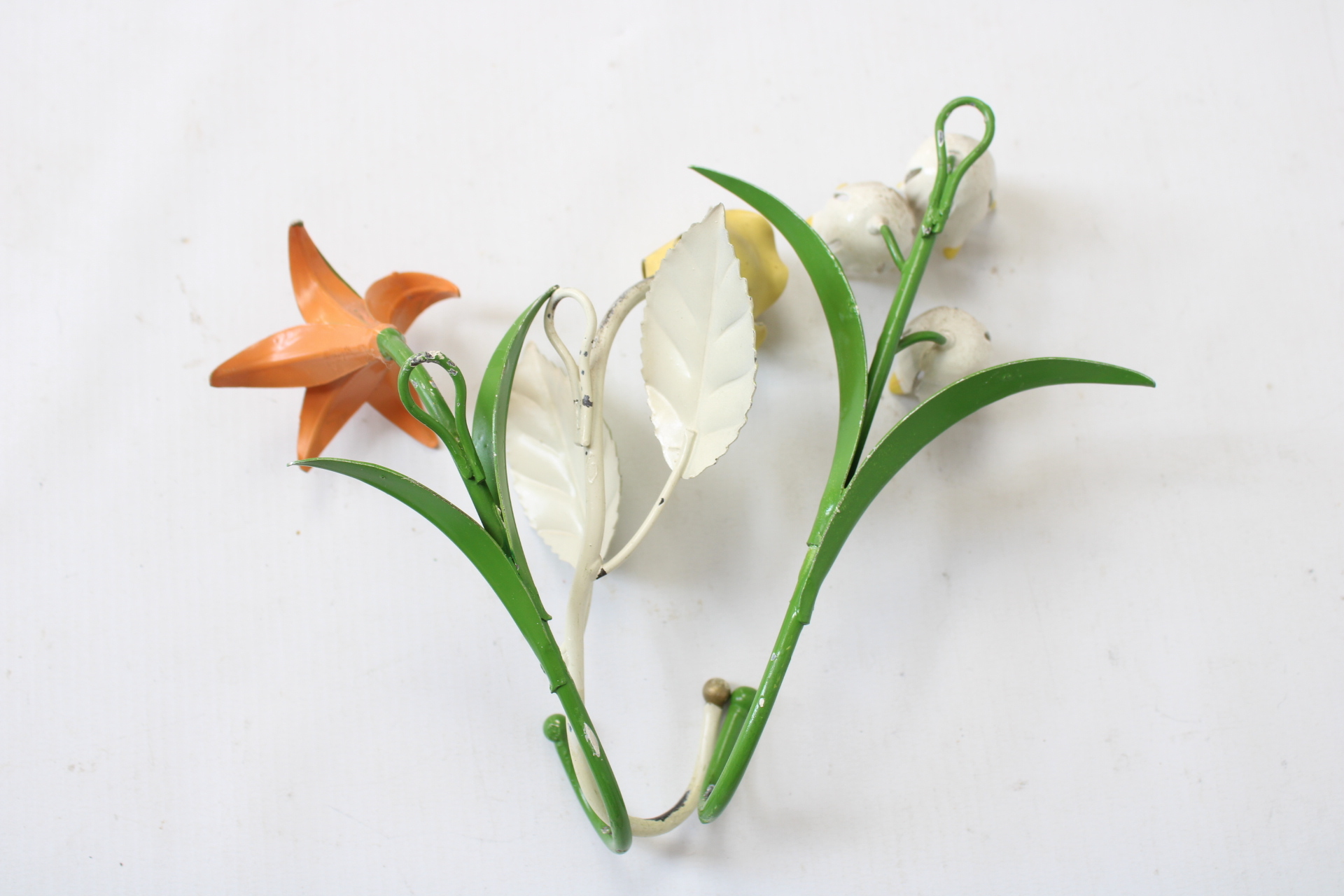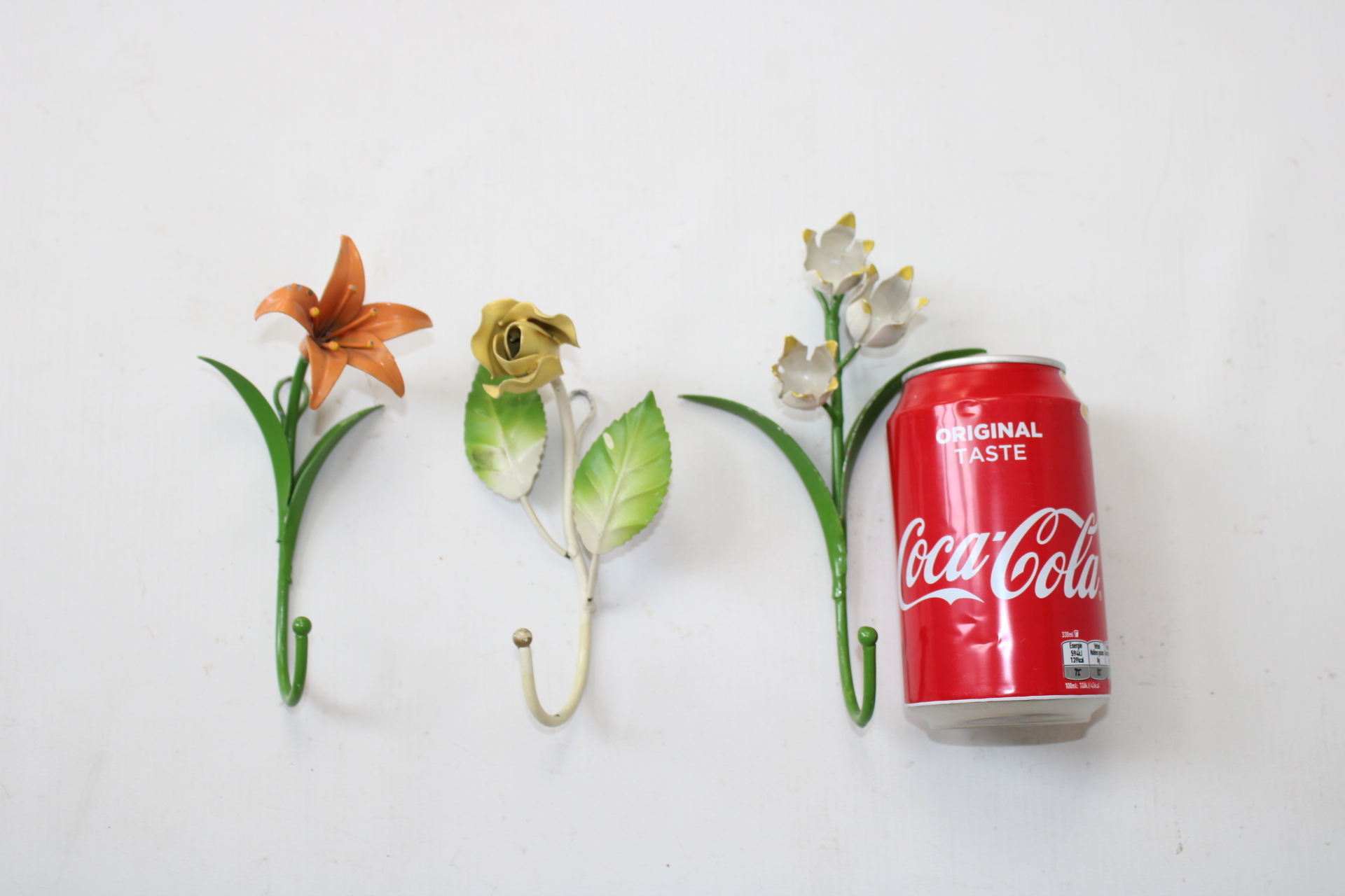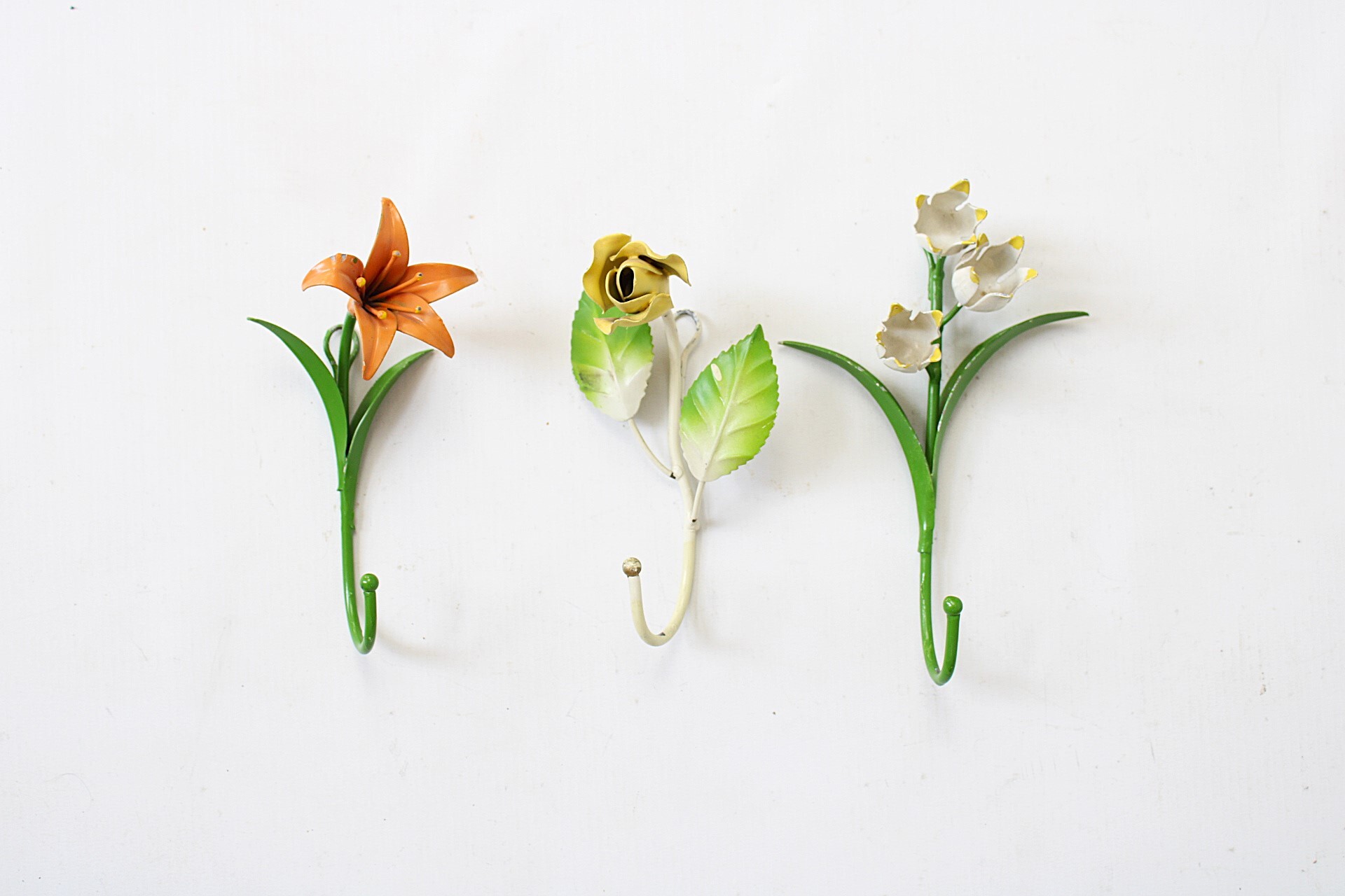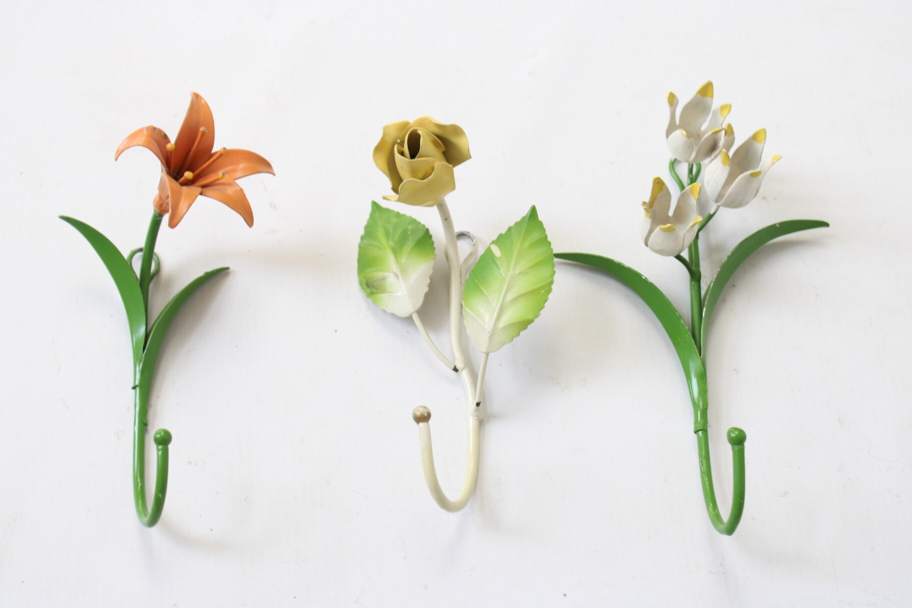 Een set van 3 sympathieke vintage bloemen-kapstokhaken. Beschilderd metaal. In goede staat.