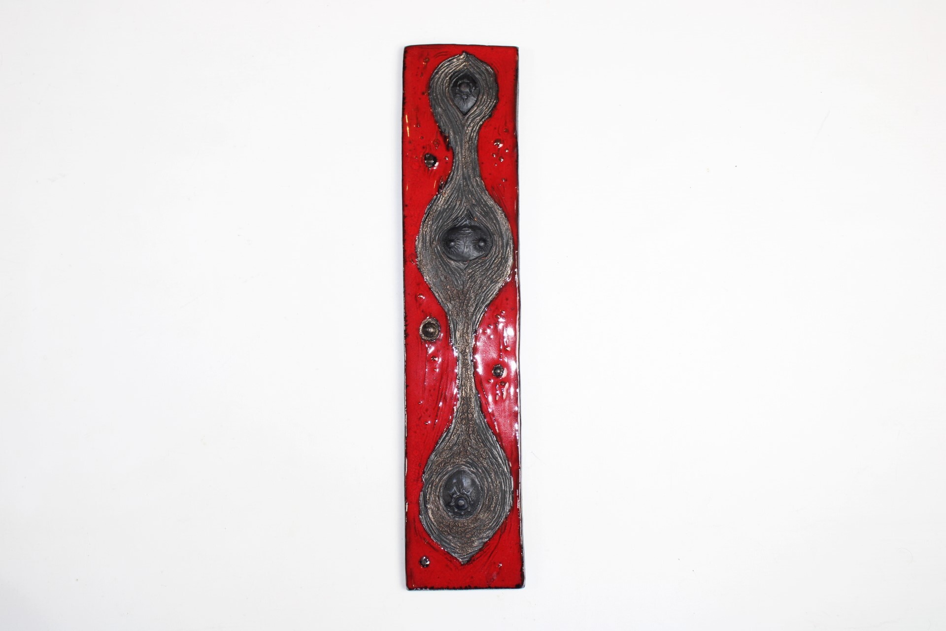 Een abstract kunstwerk in keramiek. Rogier Vandeweghe voor Amphora (gemarkeerd). Bedoeld om verticaal omhoog te hangen. Uitgevoerd in rode glanzende geglazuurde keramiek met zwarte decoraties in reliëf.
