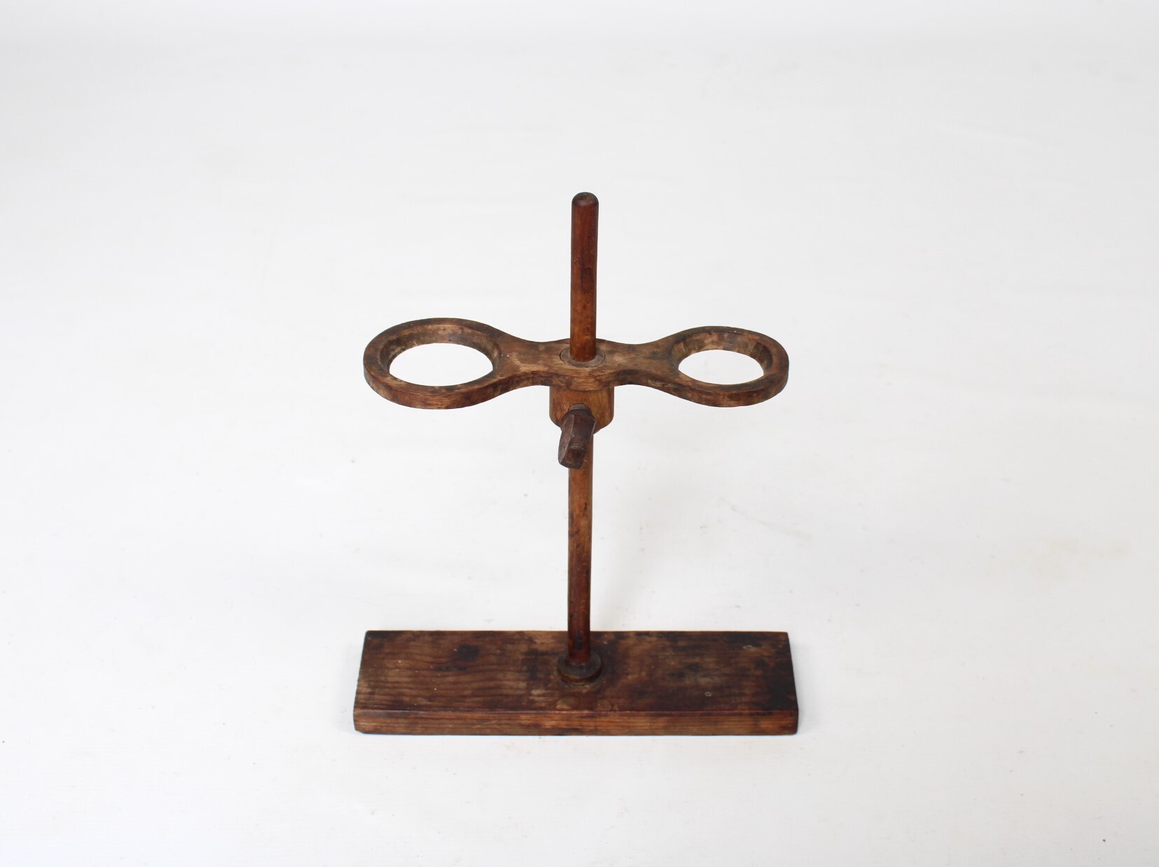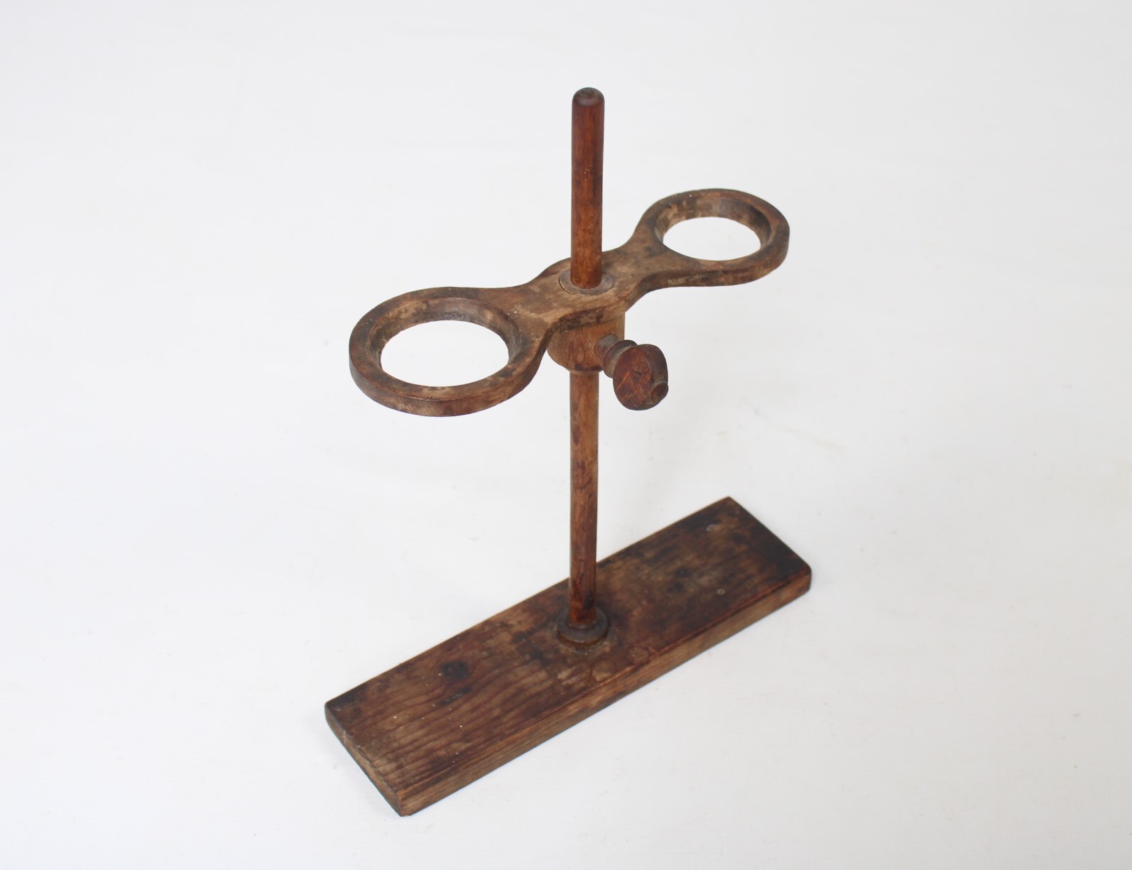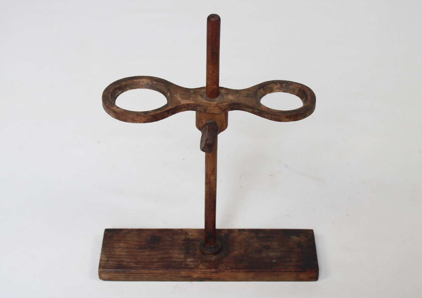 Een antieke houten staander om scheikundig mariaal in te zetten om chemieproeven uit te voeren.