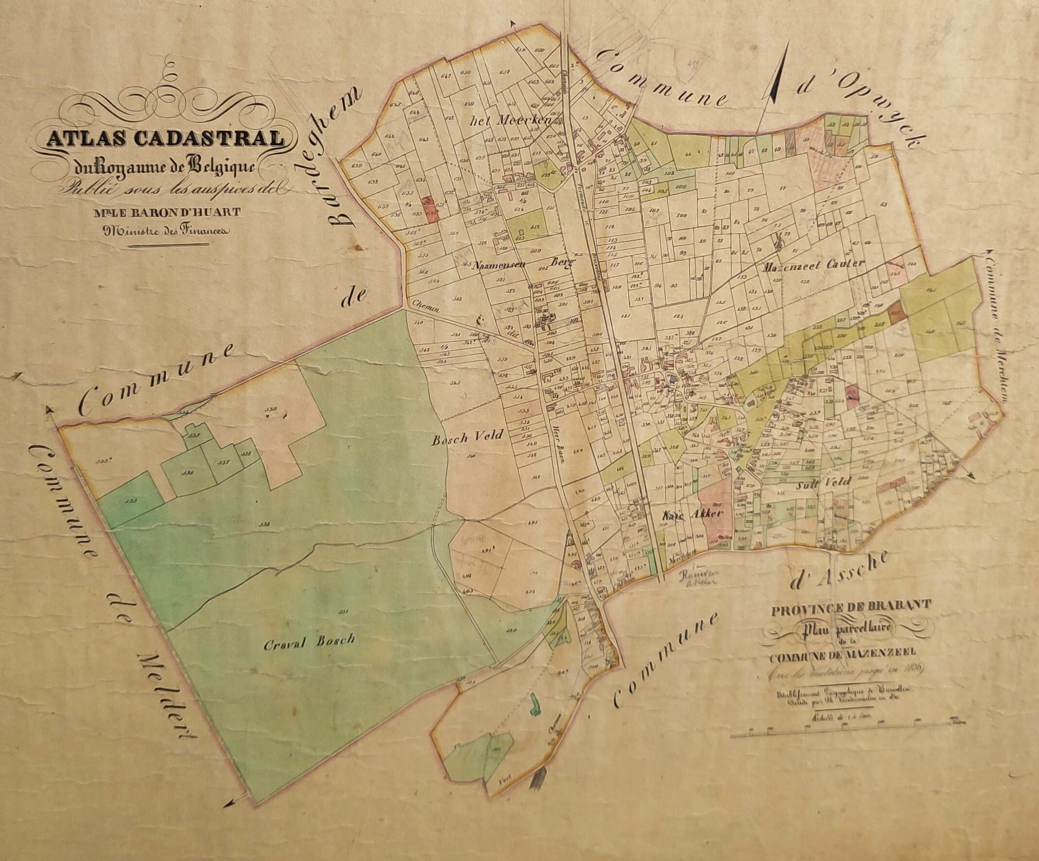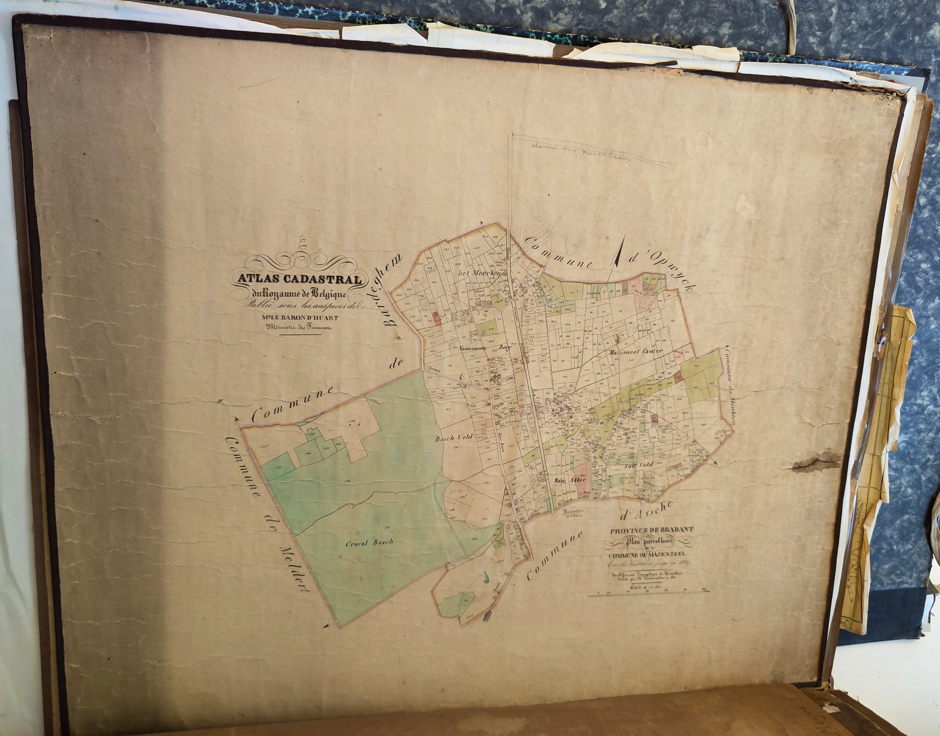 Een grote originele kadasterkaart van 'Mazenzeel' die door cartograaf Philippe Vandermaelen werd opgemaakt en als "Carte topographique de la Belgique" werd uitgegeven tussen 1846 en 1854. Op deze kaart staat: "Avec les mutations jusqu'à 1836". Schaal: