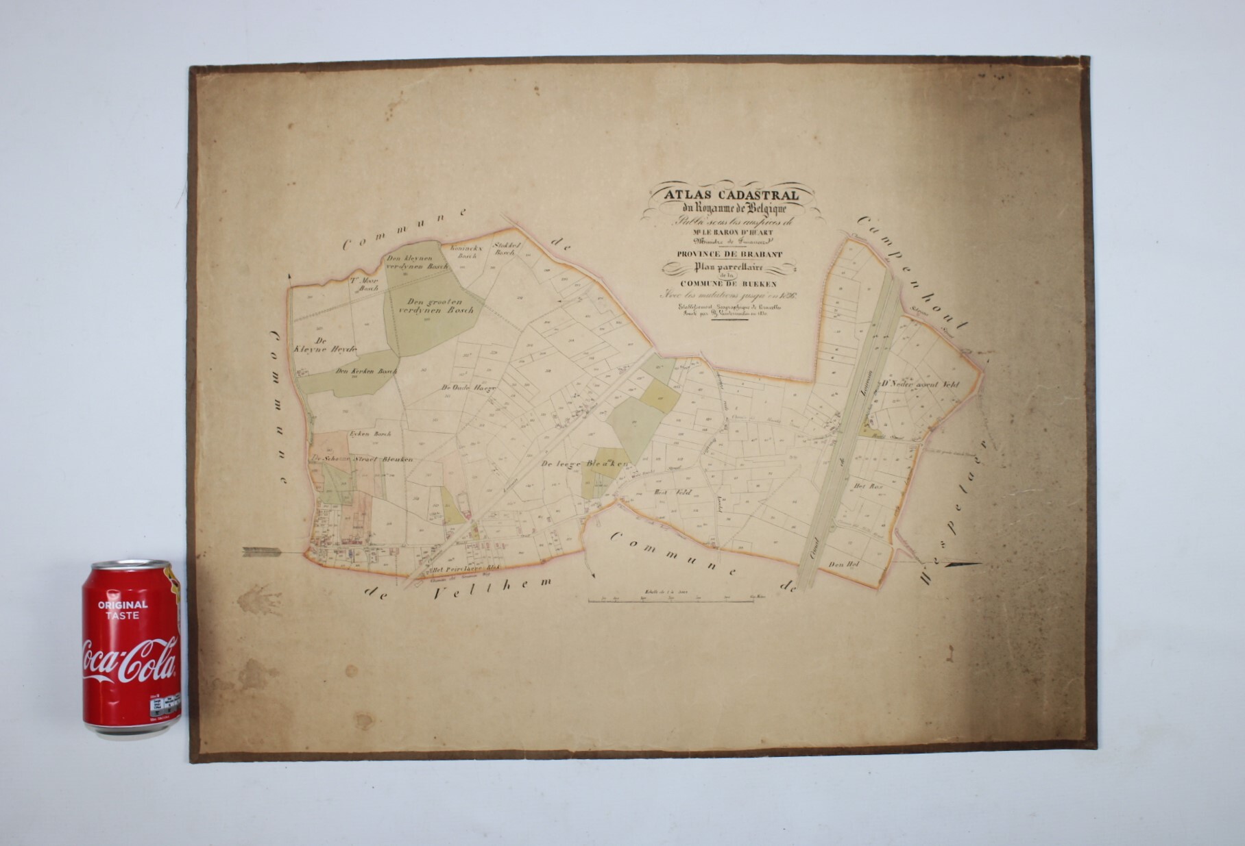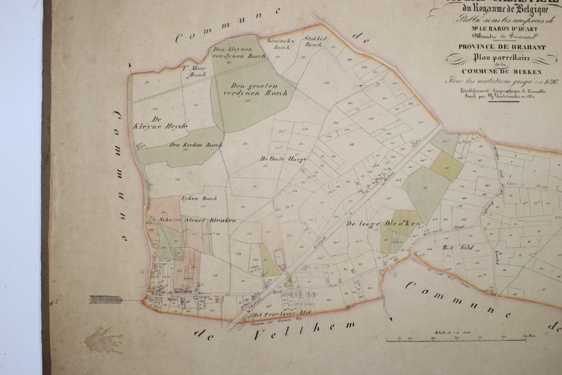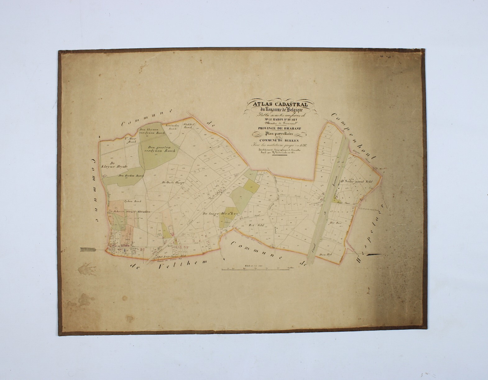 Een oude kaart van Buken (Bueken), Kampenhout. Afkomstig uit de 'Atlas Cadastral', uit het midden van de 19°eeuw. 'Avec les mutations jusqu'en 1836'. Philippe Vandermaelen was een Belgische cartograaf en geograaf. Hij richtte het Établissement Géographique de Bruxelles op in 1830. Vanaf 1836 kreeg hij de toelating van de Minister van Financiën baron d'Huart om de kadasterkaarten te publiceren in de bekende 'Atlas Cadastral'. Deze kaarten werden gebruikt door notarissen en landmeters en waren dus één van de eerste kadasterkaarten. Zeer gedetailleerde weergave van kavels en woningen.In relatief goede staat gezien de leeftijd, met verkleuringen.