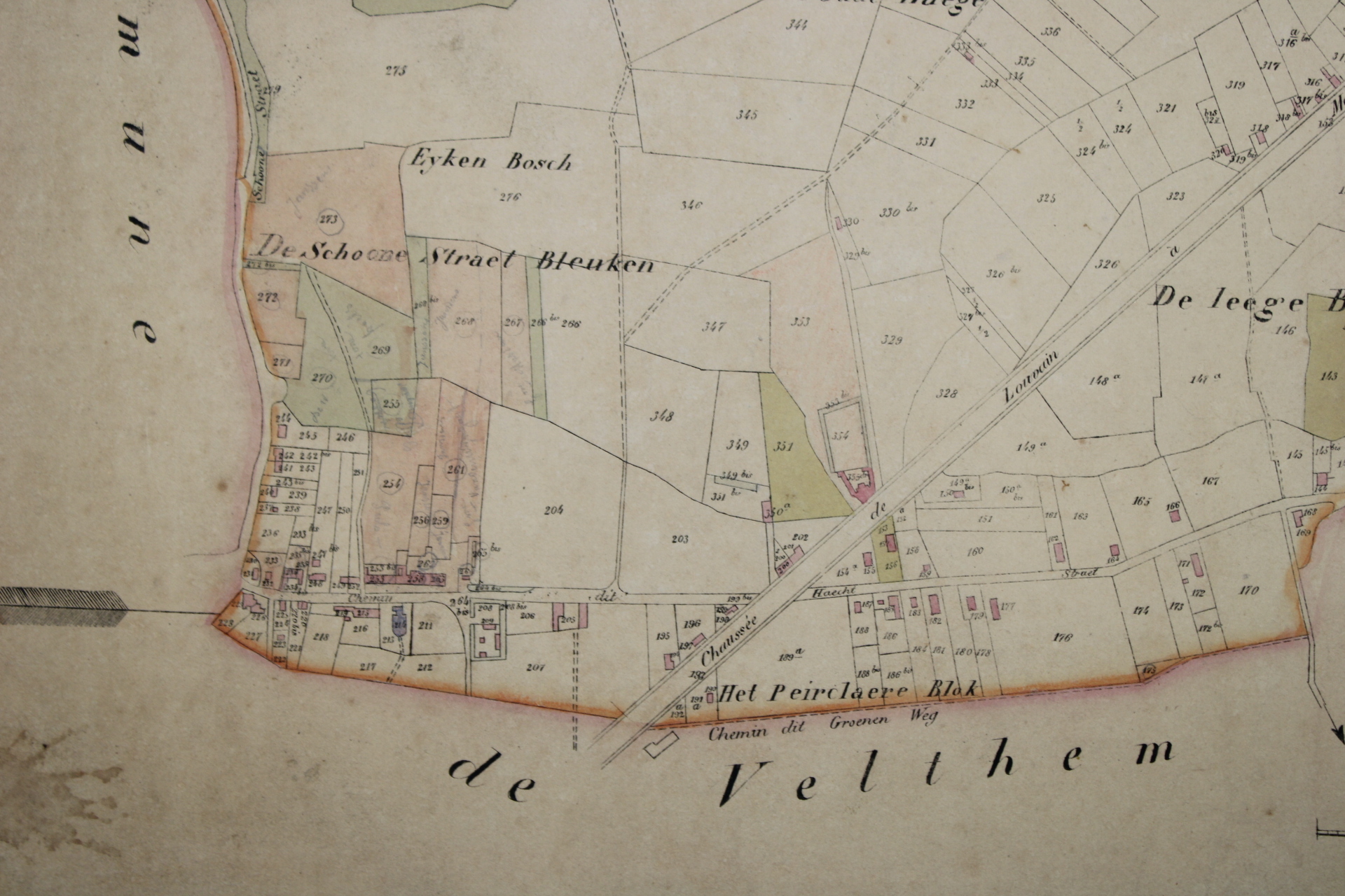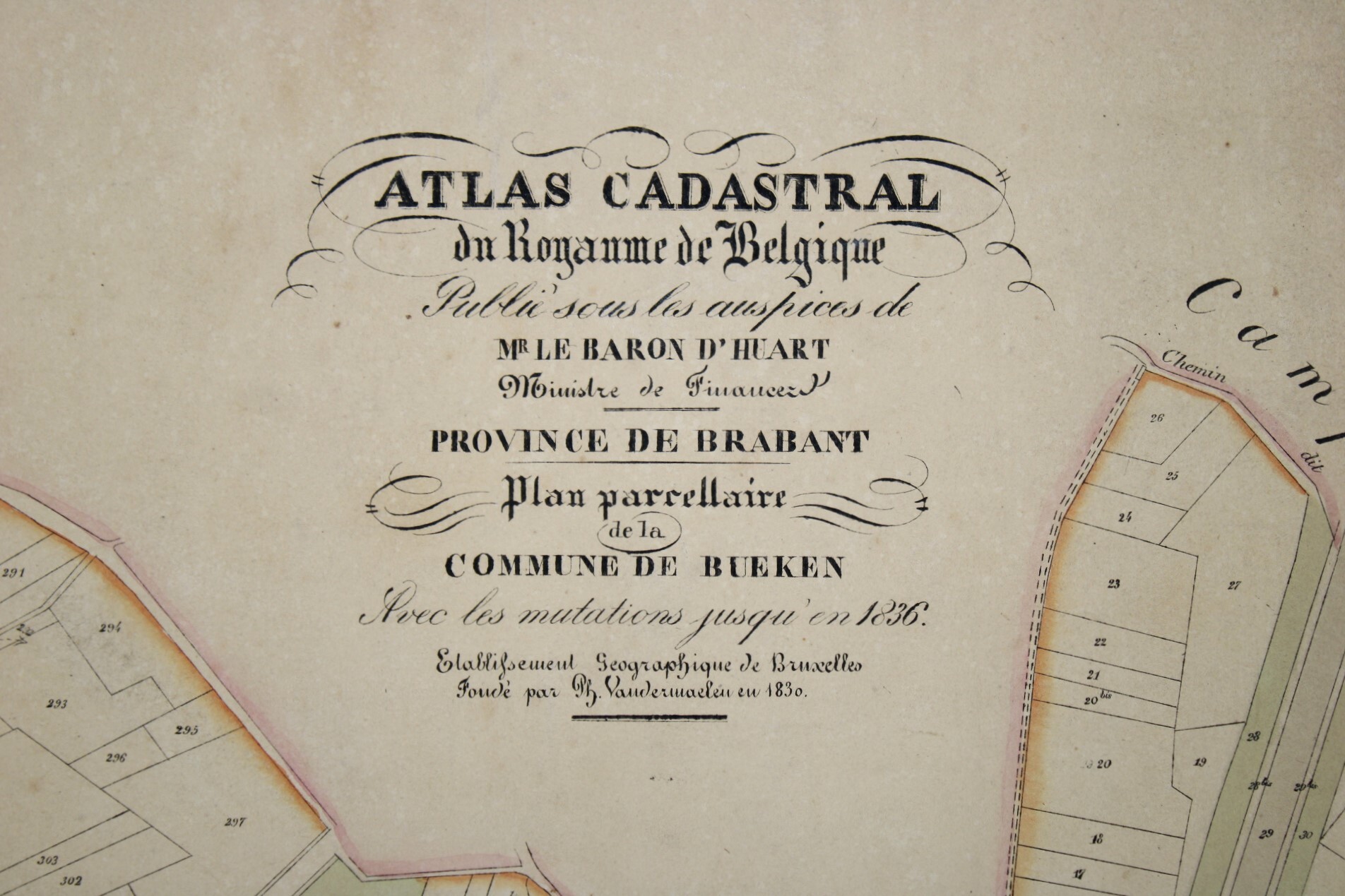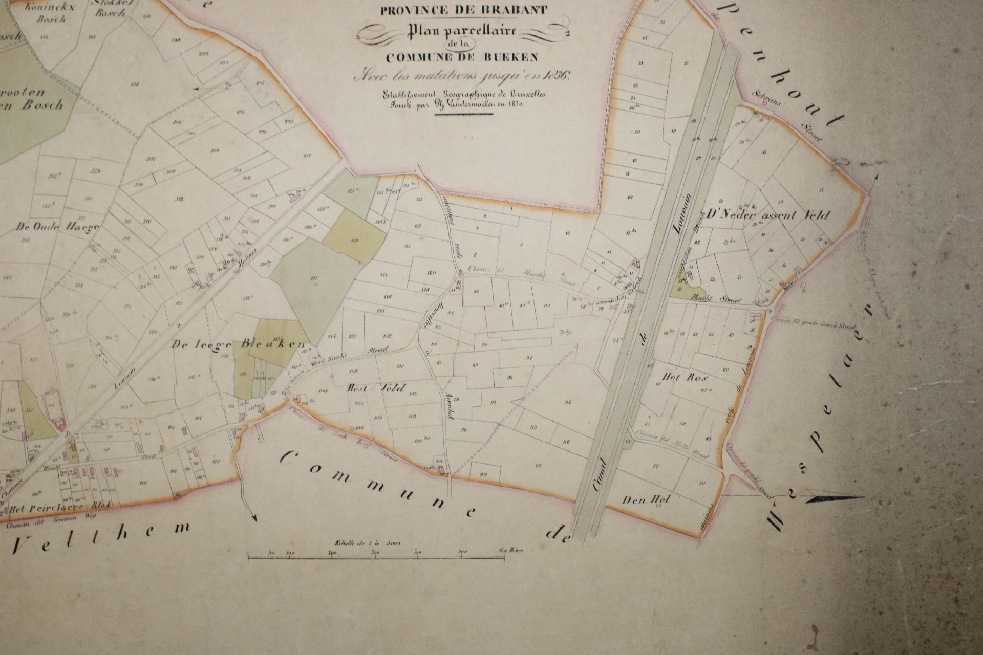 Een oude kaart van Buken (Bueken), Kampenhout. Afkomstig uit de 'Atlas Cadastral', uit het midden van de 19°eeuw. 'Avec les mutations jusqu'en 1836'. Philippe Vandermaelen was een Belgische cartograaf en geograaf. Hij richtte het Établissement Géographique de Bruxelles op in 1830. Vanaf 1836 kreeg hij de toelating van de Minister van Financiën baron d'Huart om de kadasterkaarten te publiceren in de bekende 'Atlas Cadastral'. Deze kaarten werden gebruikt door notarissen en landmeters en waren dus één van de eerste kadasterkaarten. Zeer gedetailleerde weergave van kavels en woningen.In relatief goede staat gezien de leeftijd, met verkleuringen.