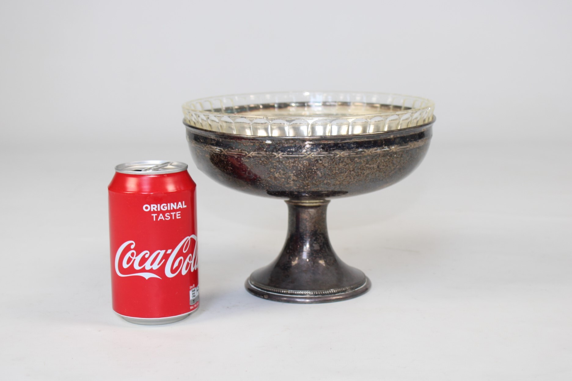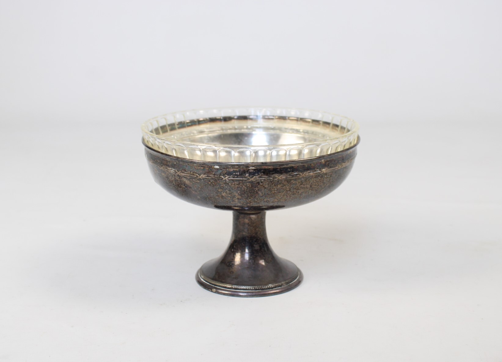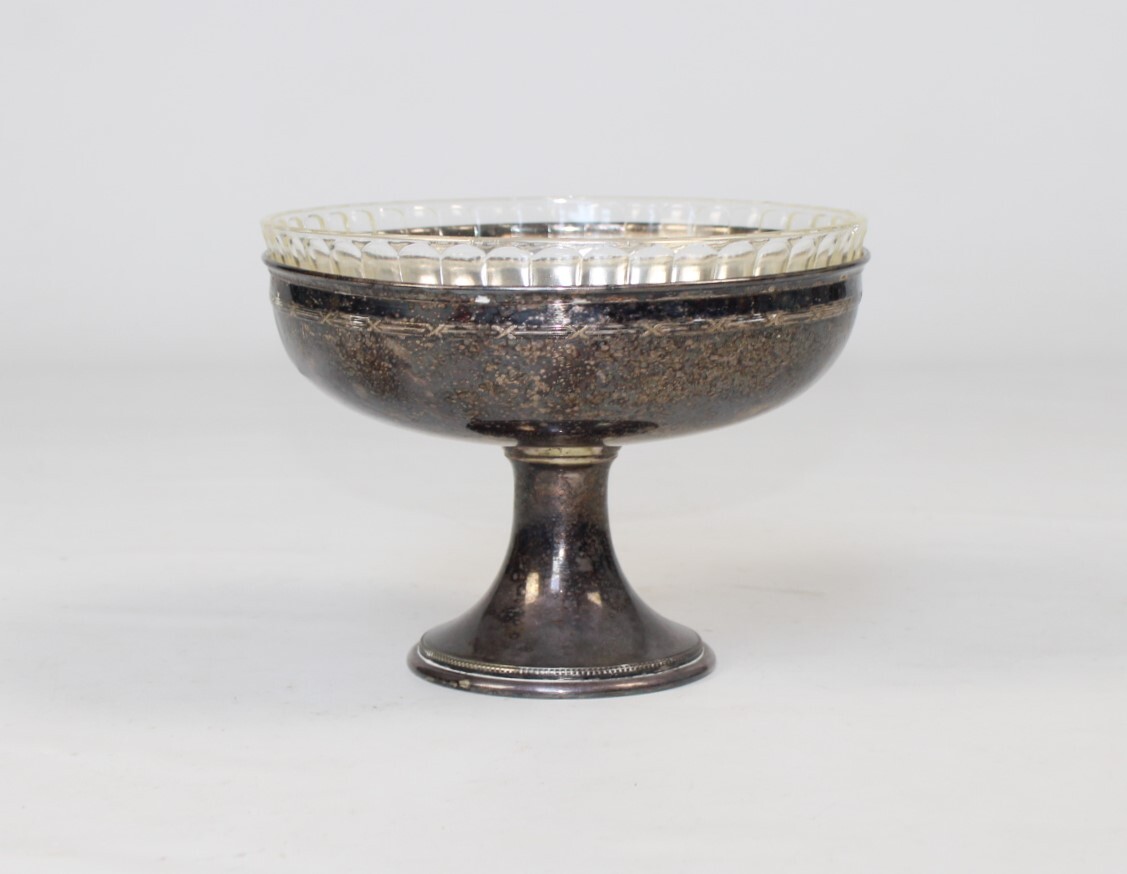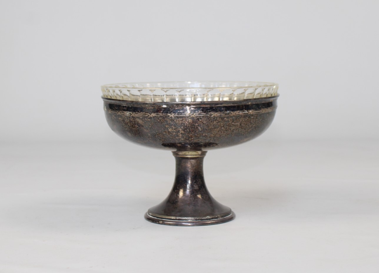 Een oude verzilverde schaal of tazza met een bijhorende glazen kom die er mooi in past. Te gebruiken als fruit- of snoepschaal. Klassiek decor met oa ruban croisé. Gepatineerde zilverlaag. Geen zichtbare merktekens.