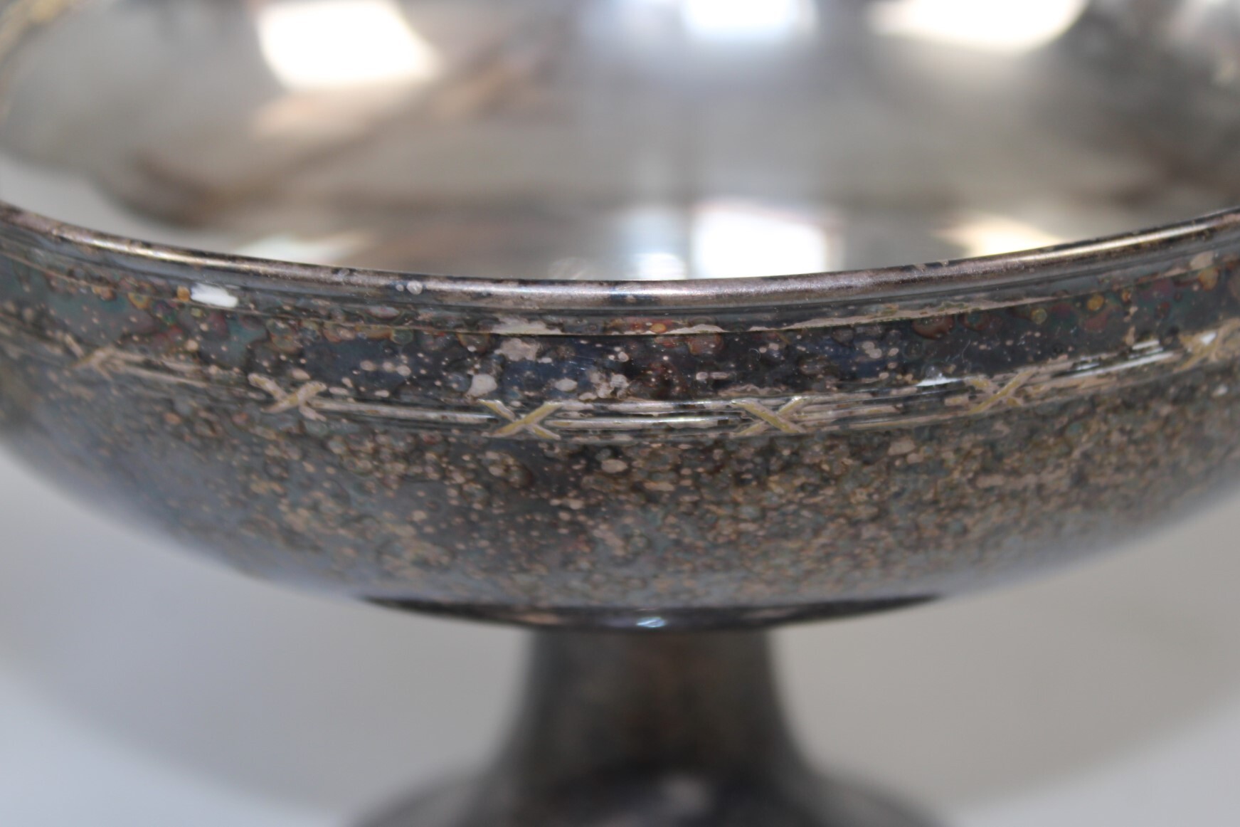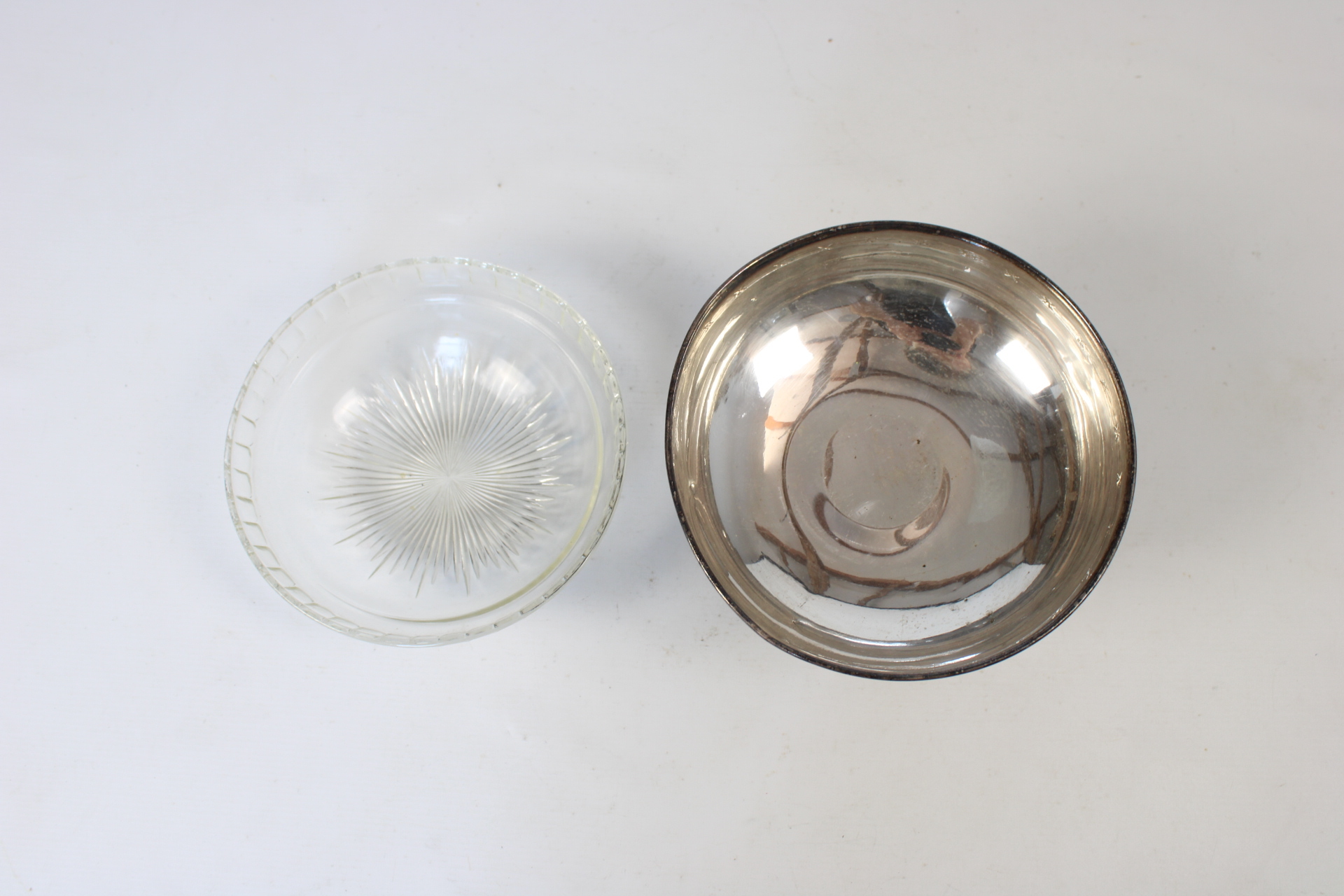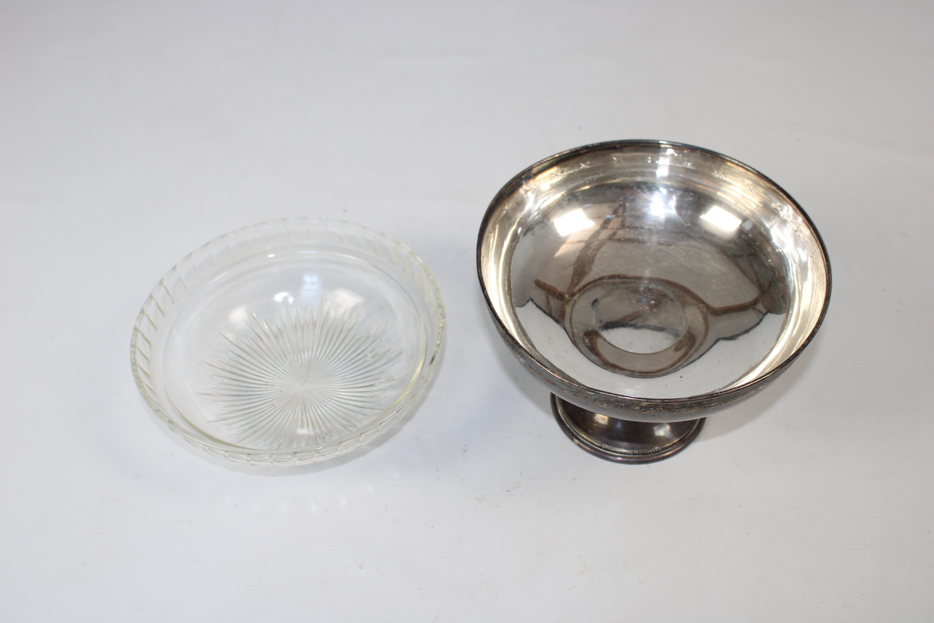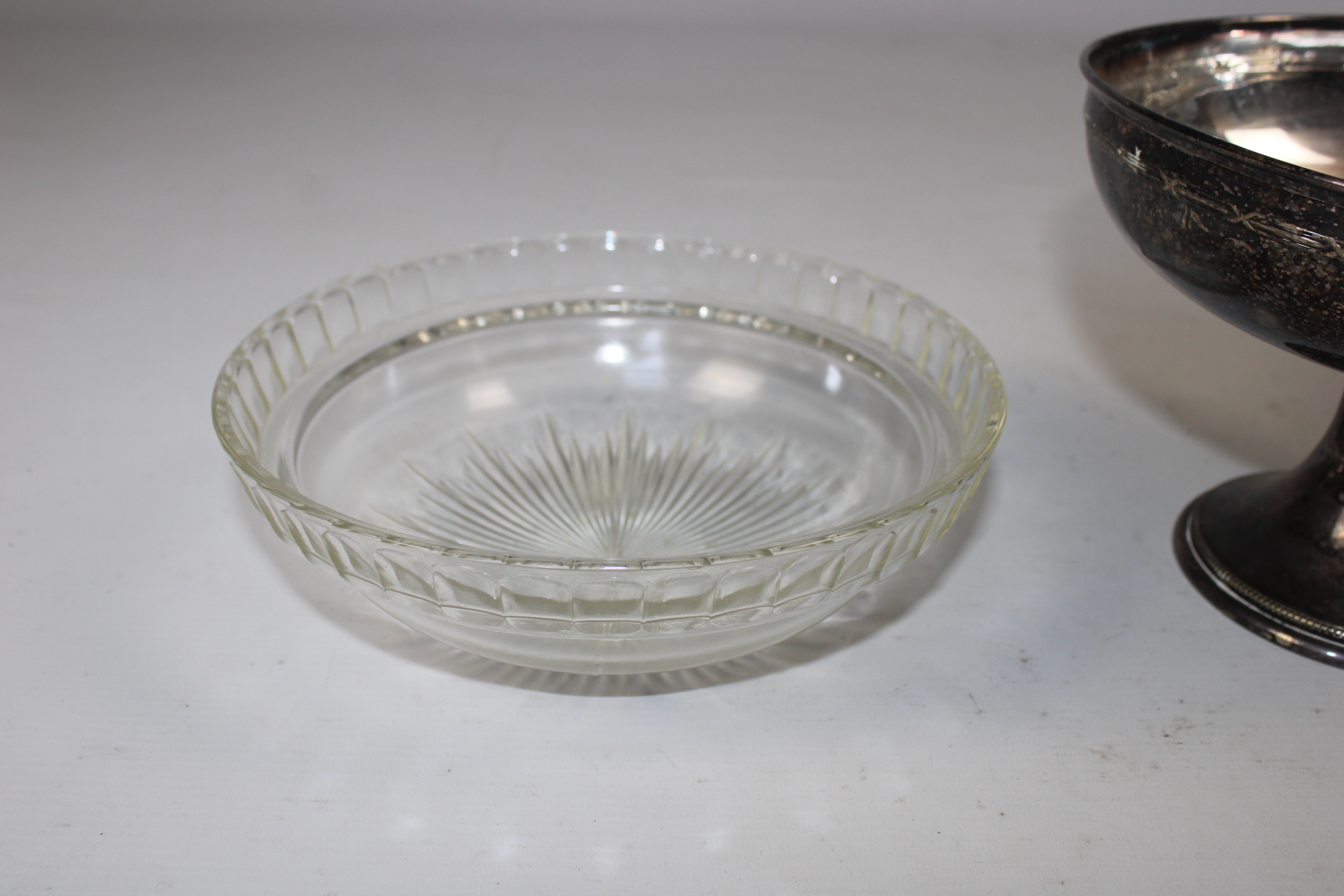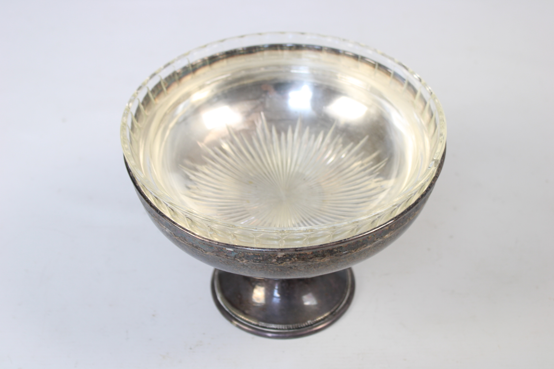 Een oude verzilverde schaal of tazza met een bijhorende glazen kom die er mooi in past. Te gebruiken als fruit- of snoepschaal. Klassiek decor met oa ruban croisé. Gepatineerde zilverlaag. Geen zichtbare merktekens.