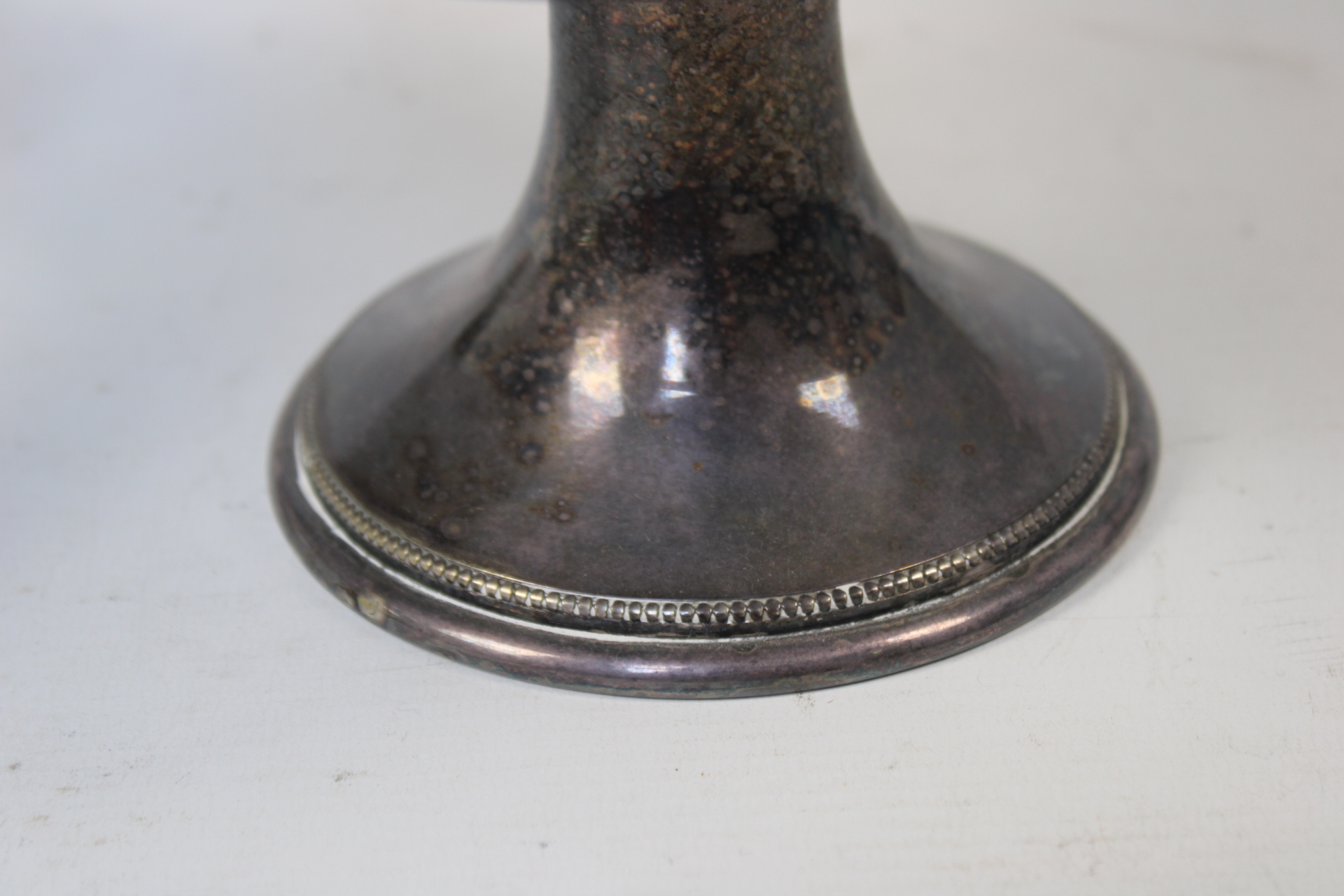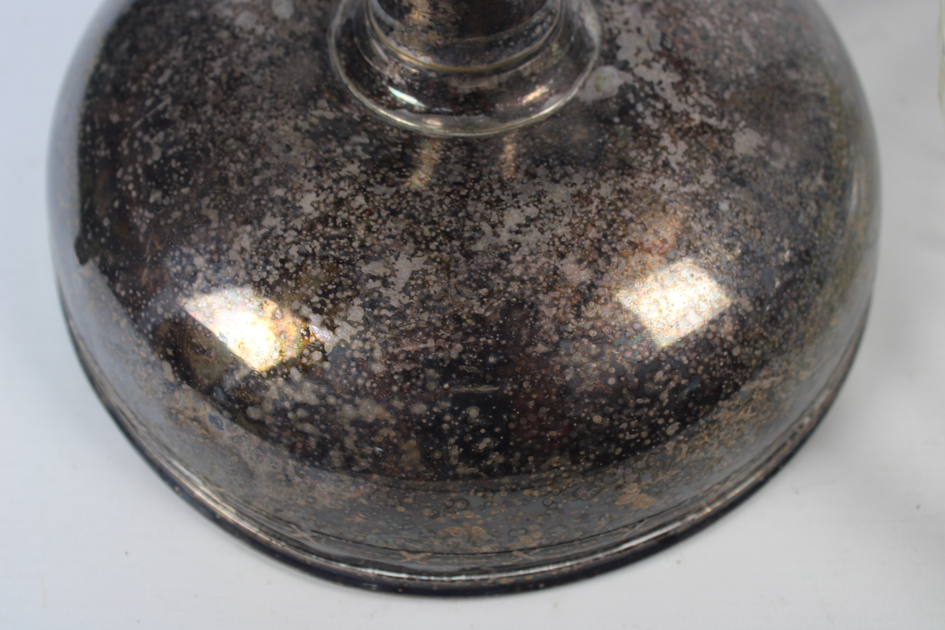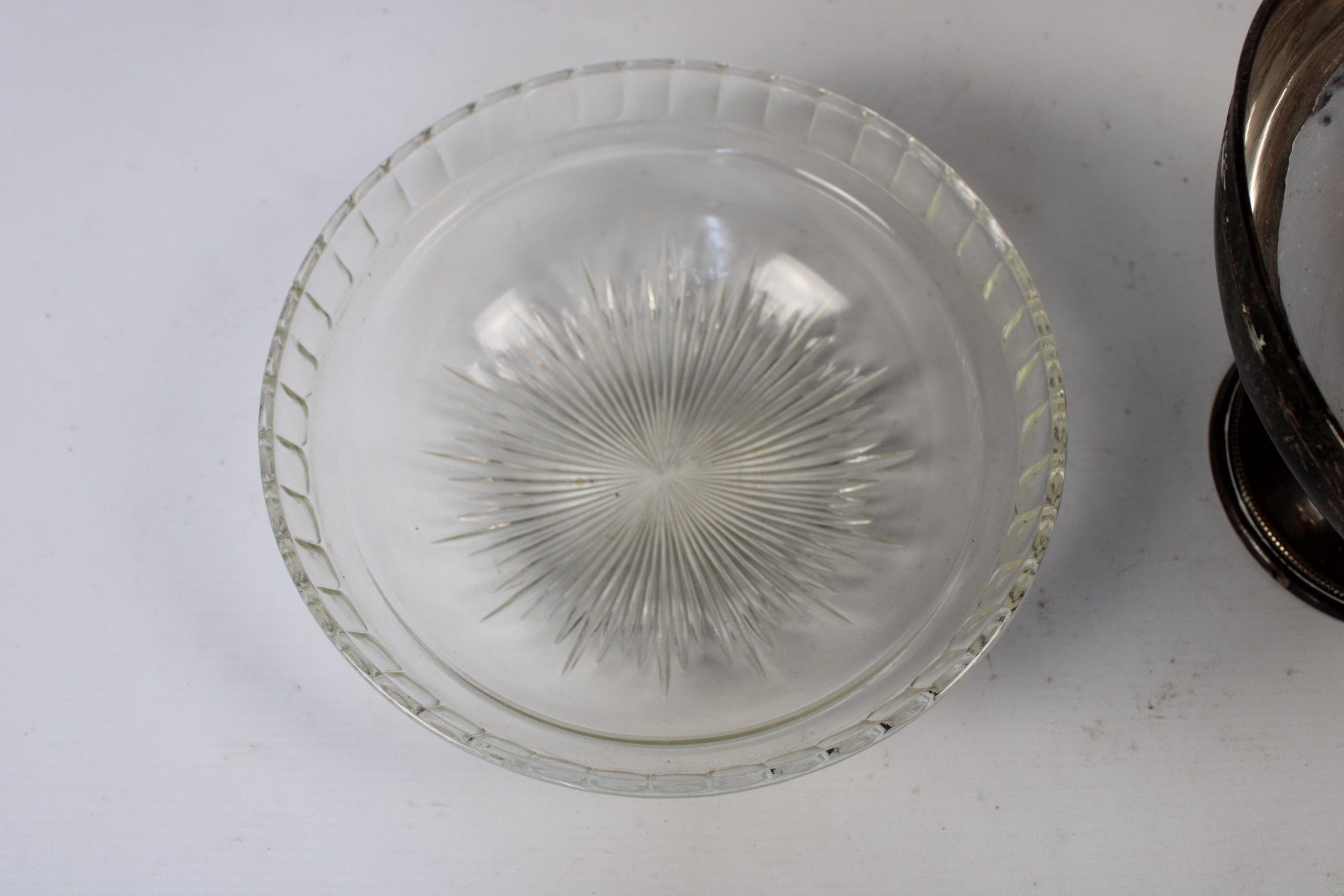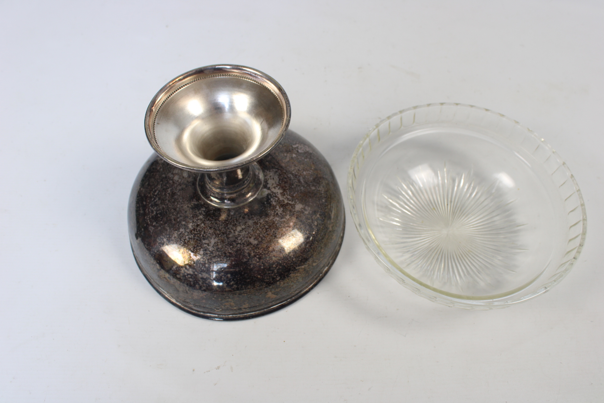 Een oude verzilverde schaal of tazza met een bijhorende glazen kom die er mooi in past. Te gebruiken als fruit- of snoepschaal. Klassiek decor met oa ruban croisé. Gepatineerde zilverlaag. Geen zichtbare merktekens.
