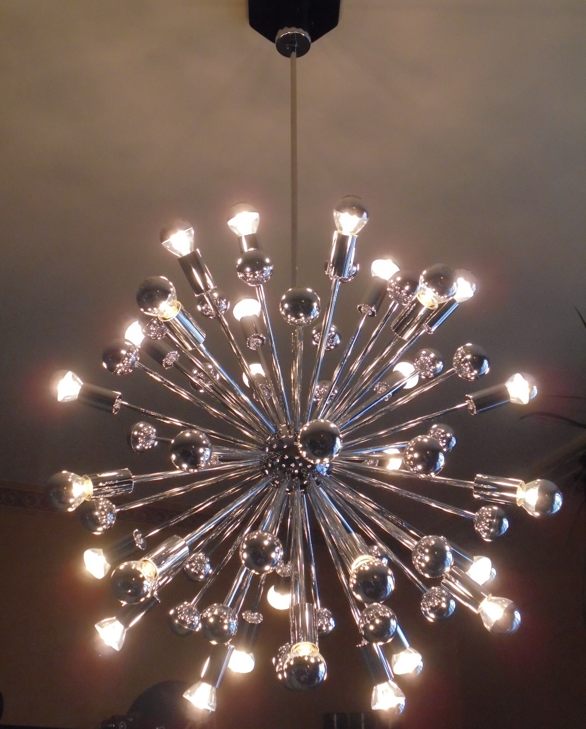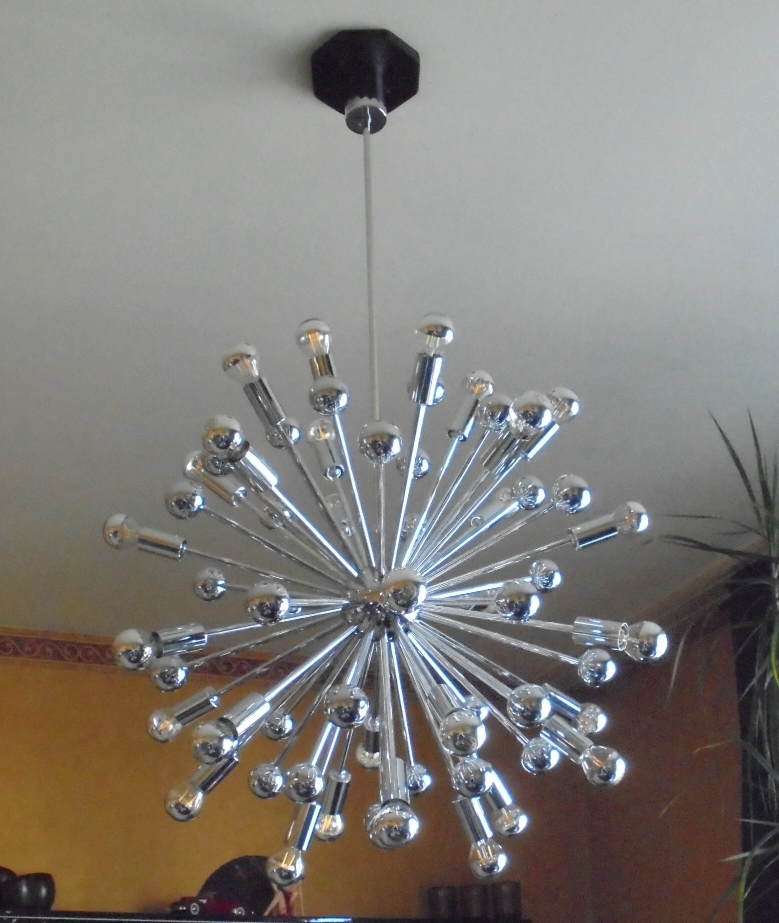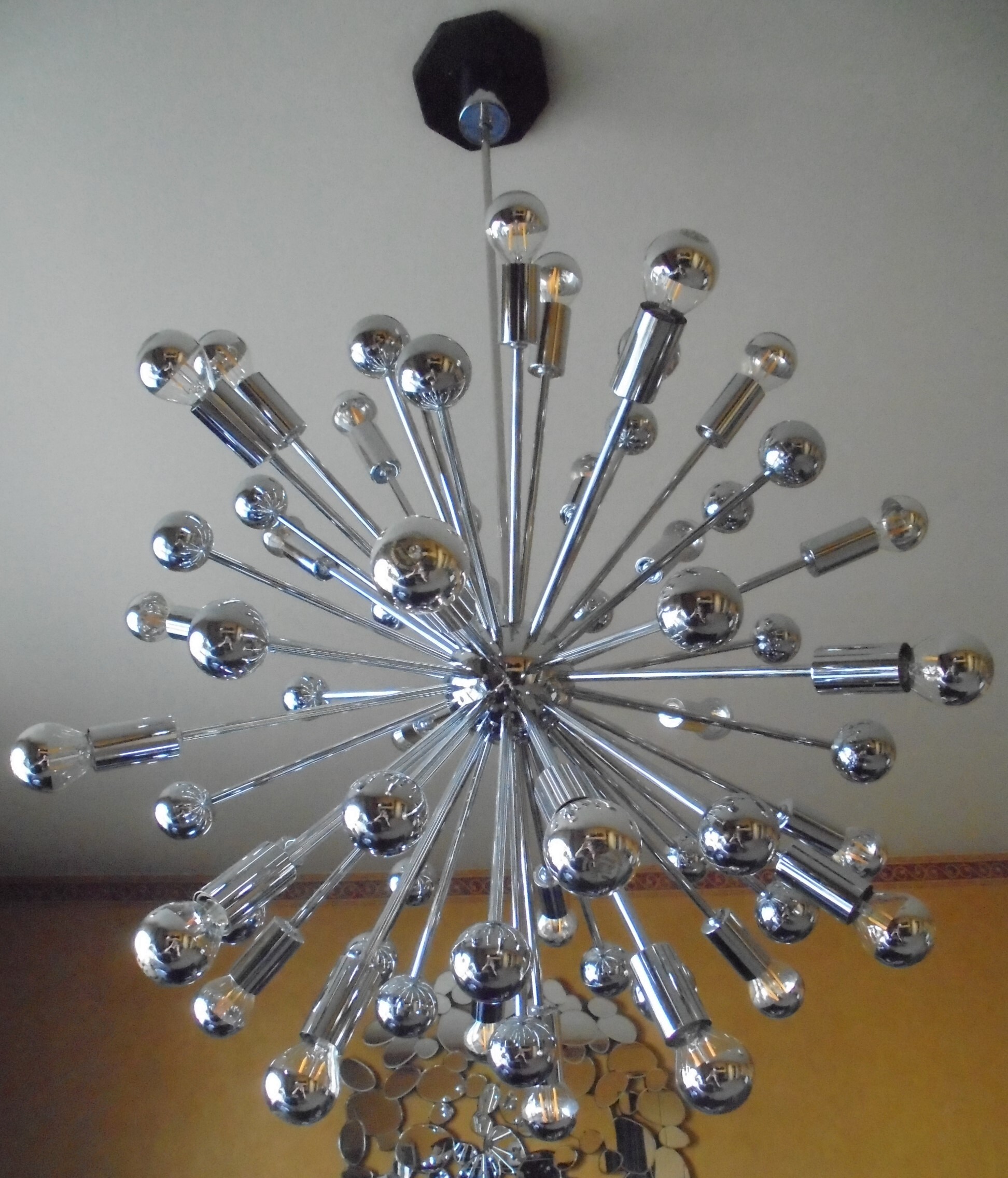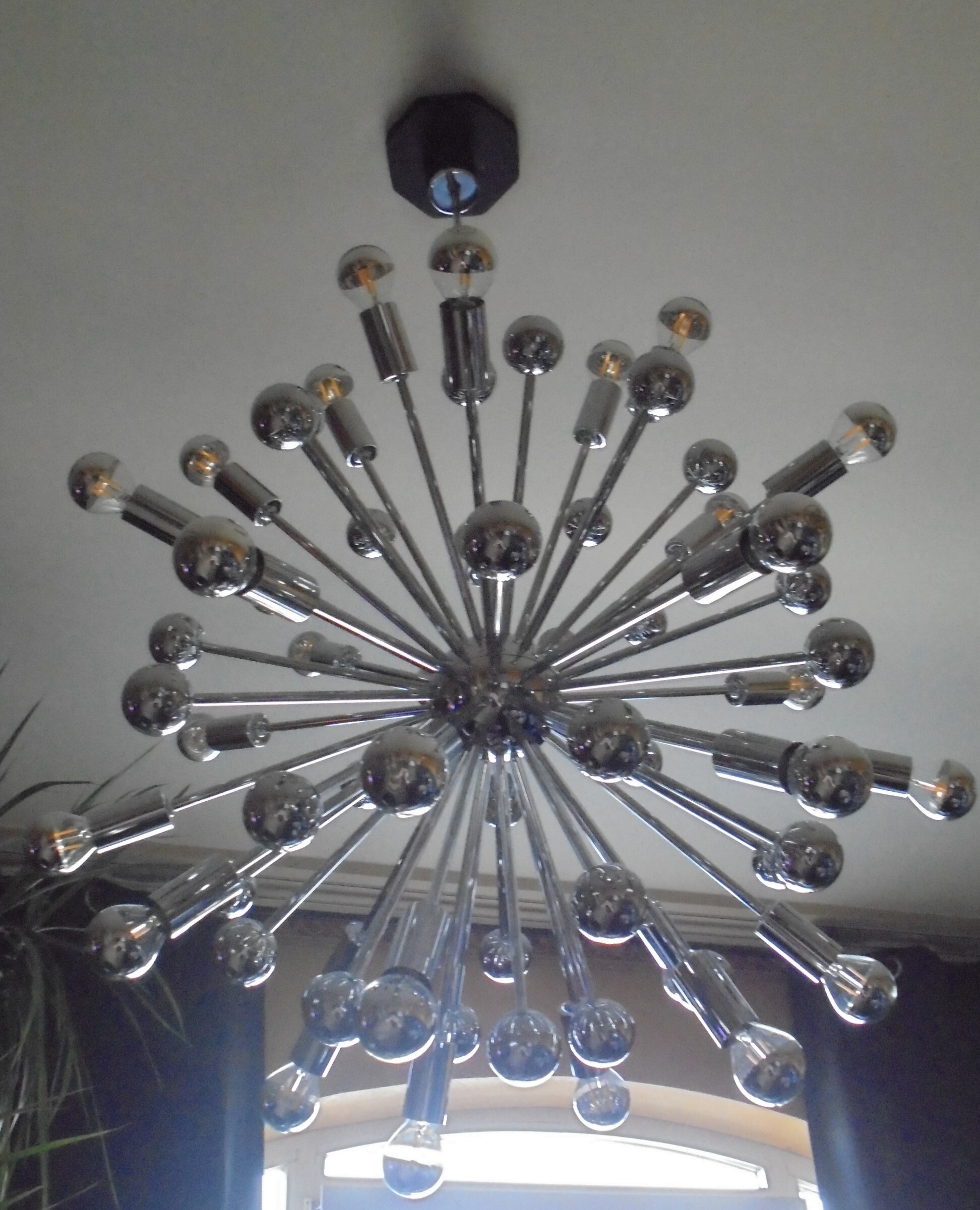 Een zeldzame "Space Age" Sputnik-lamp van begin jaren '70. Een originele en zeer grote XL-lamp met een diameter van 75 cm en 30 lichtpunten. Een design van Gaetano Sciolari en geproduceerd door SA Boulanger te Brussel (Anderlecht). Vanaf eind jaren 60 vervaardigde deze fabrikant verlichting voor het eerder luxueuzere segment en werd gekend door de samenwerking met de Italiaanse ontwerper Angelo Gaetano Sciolari.