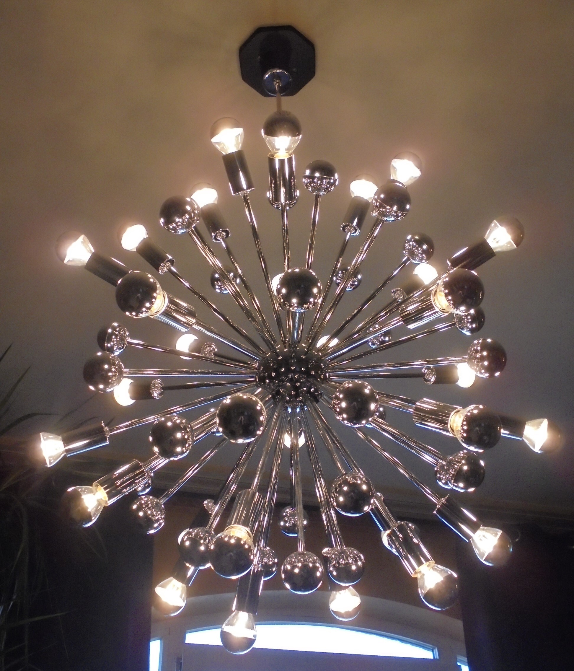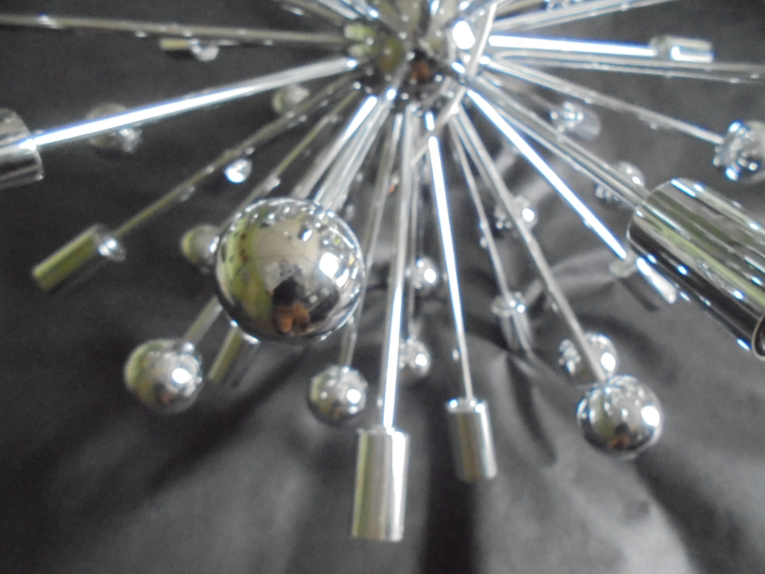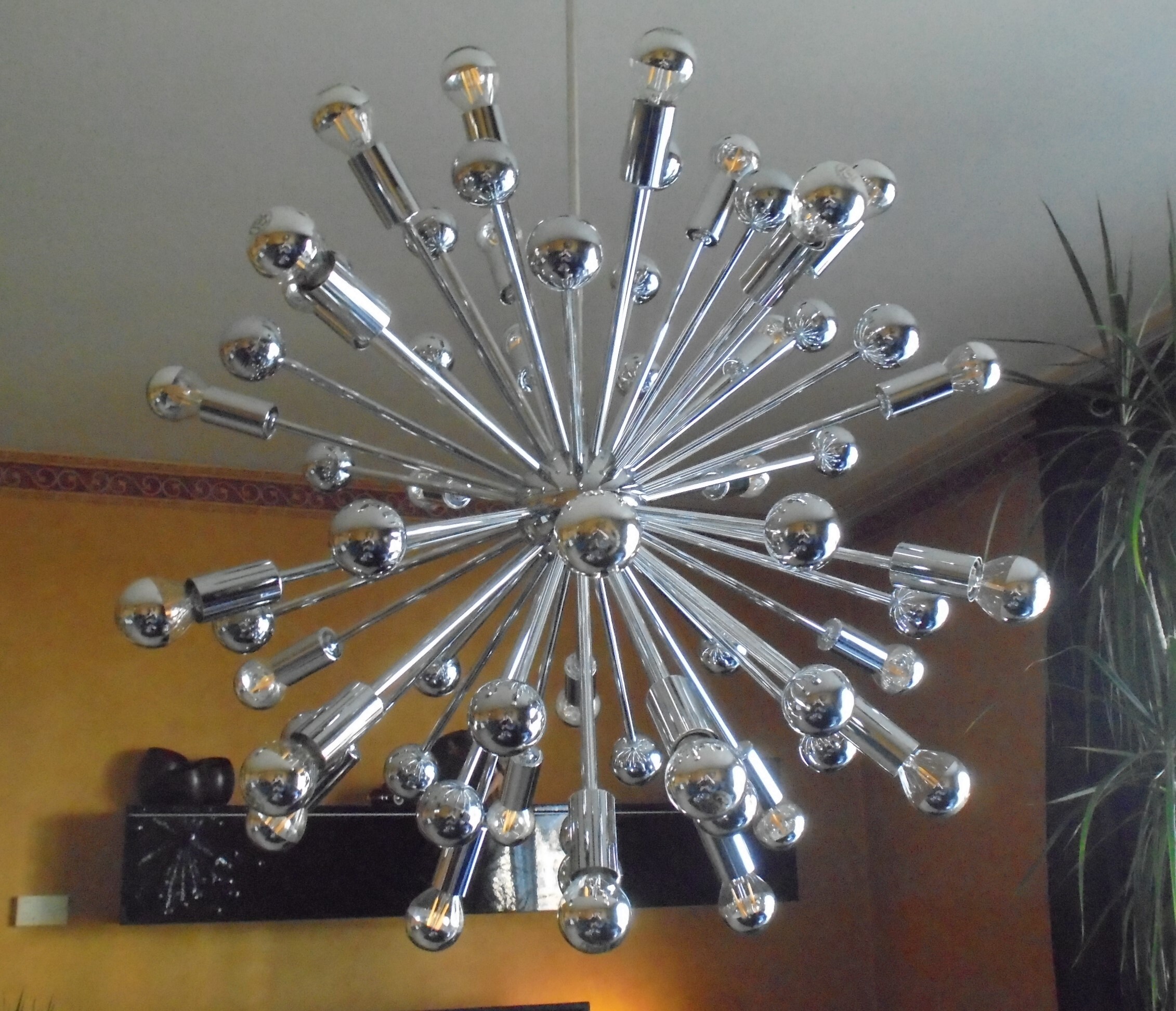 Een zeldzame "Space Age" Sputnik-lamp van begin jaren '70. Een originele en zeer grote XL-lamp met een diameter van 75 cm en 30 lichtpunten. Een design van Gaetano Sciolari en geproduceerd door SA Boulanger te Brussel (Anderlecht). Vanaf eind jaren 60 vervaardigde deze fabrikant verlichting voor het eerder luxueuzere segment en werd gekend door de samenwerking met de Italiaanse ontwerper Angelo Gaetano Sciolari.