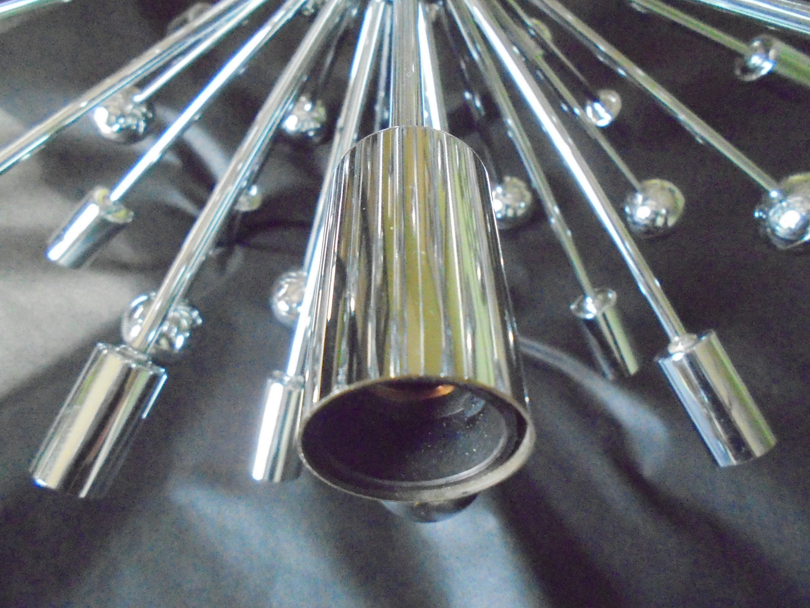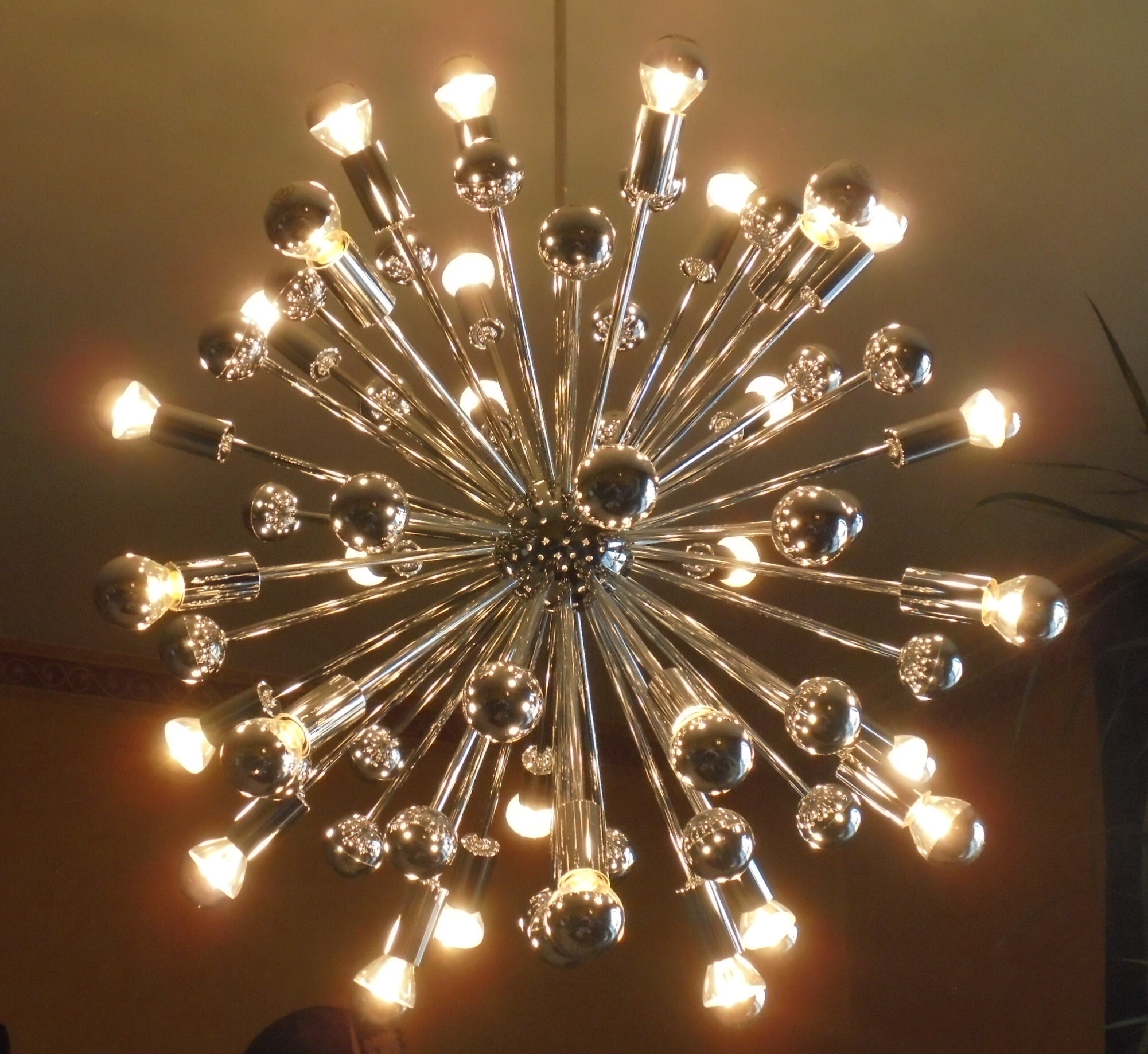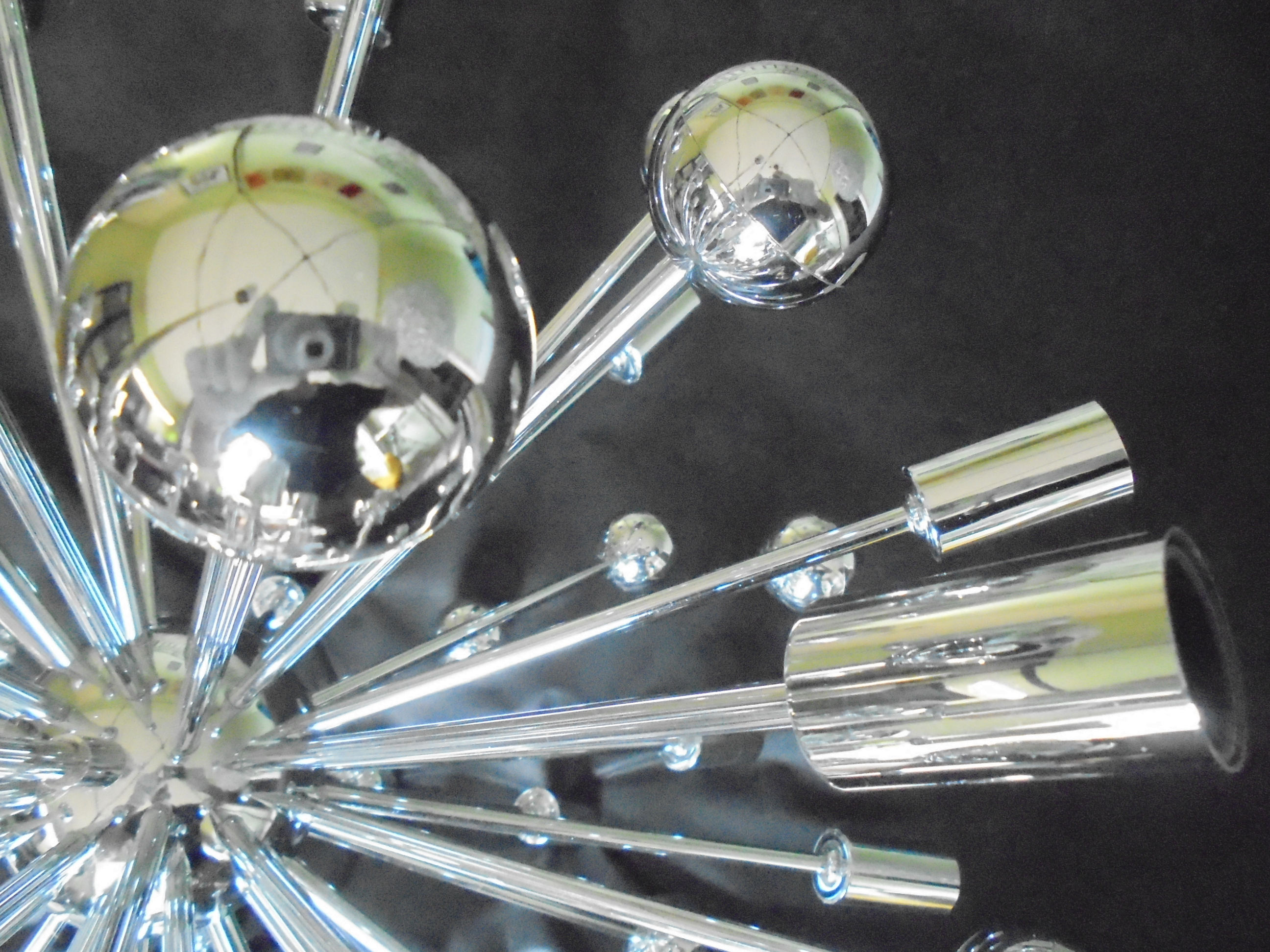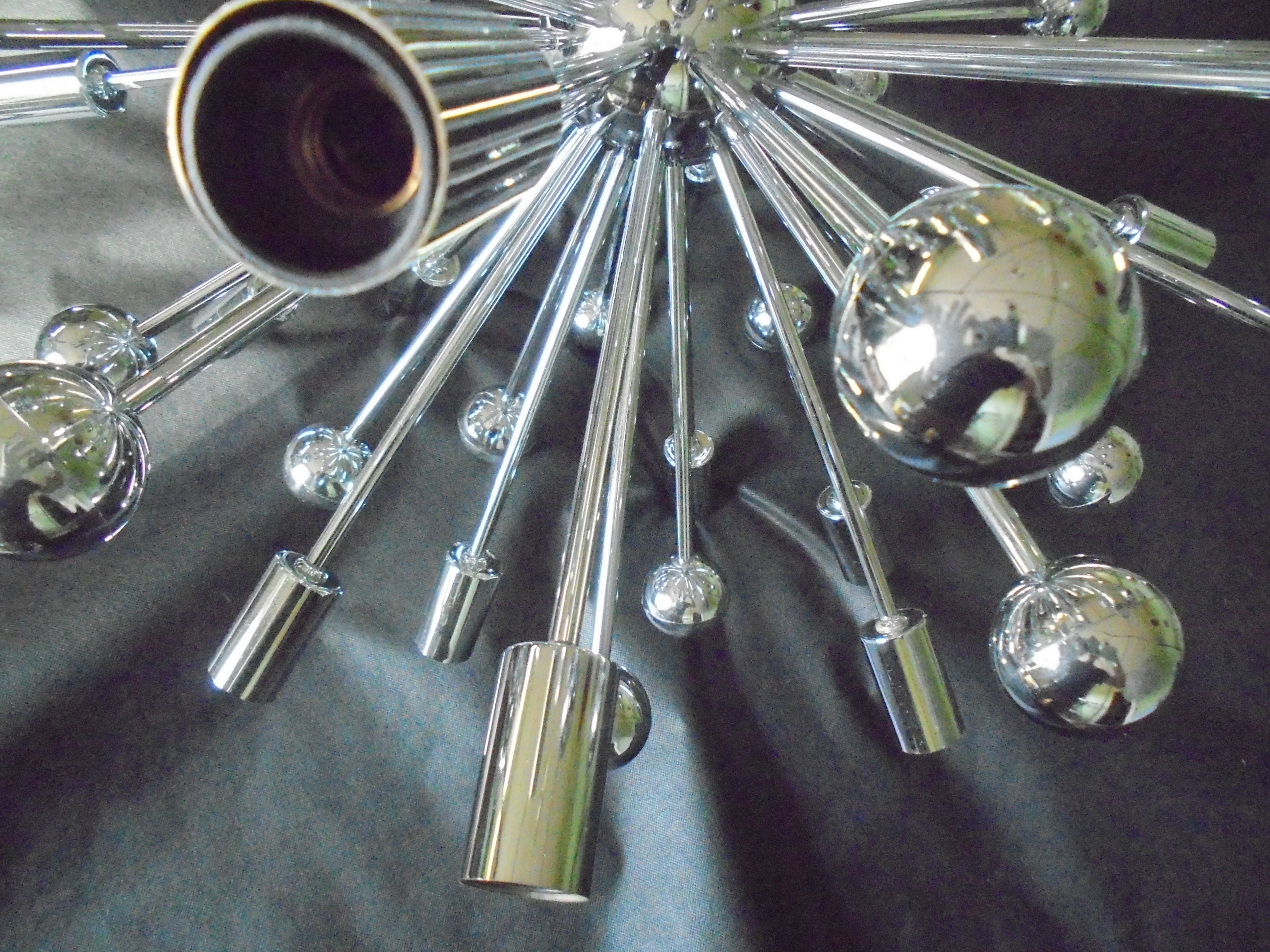 Een zeldzame "Space Age" Sputnik-lamp van begin jaren '70. Een originele en zeer grote XL-lamp met een diameter van 75 cm en 30 lichtpunten. Een design van Gaetano Sciolari en geproduceerd door SA Boulanger te Brussel (Anderlecht). Vanaf eind jaren 60 vervaardigde deze fabrikant verlichting voor het eerder luxueuzere segment en werd gekend door de samenwerking met de Italiaanse ontwerper Angelo Gaetano Sciolari.
