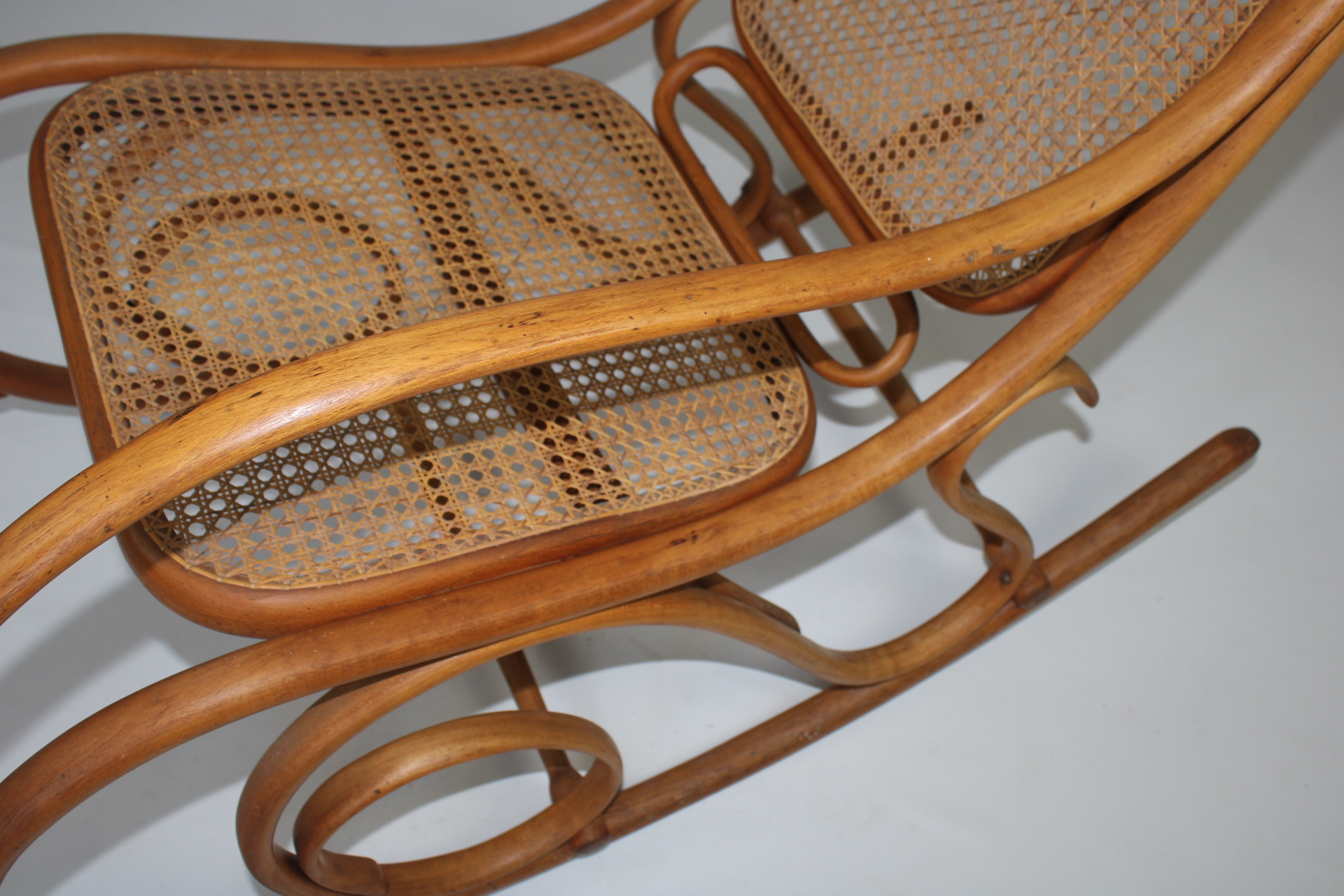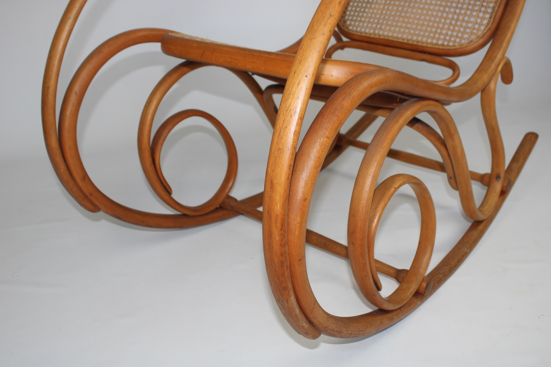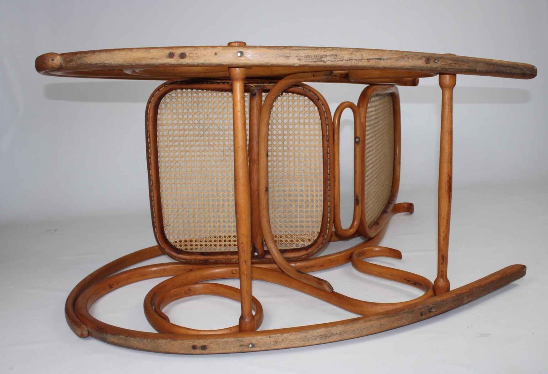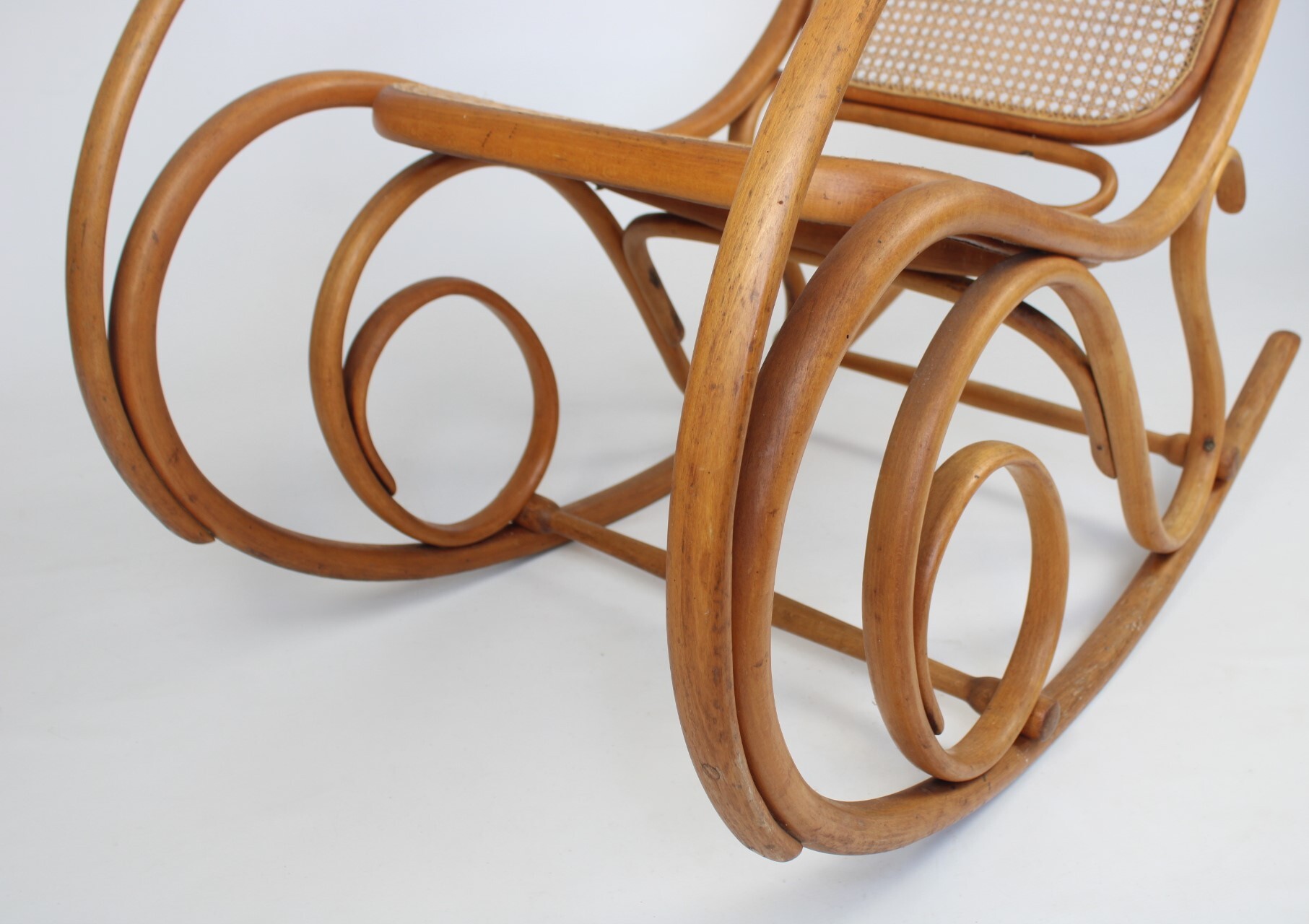 Een schommelstoel nr. 14 van Thonet met een mooie uitstraling. Eind 19de-begin 20ste eeuw. Dit type van schommelstoel stond vanaf de jaren 1886 in de catalogus van Thonet. Gerestaureerd, in zeer goede staat. Het etiket van Thonet is niet meer aanwezig, nog enkele sporen van waar het etiket gekleefd heeft.