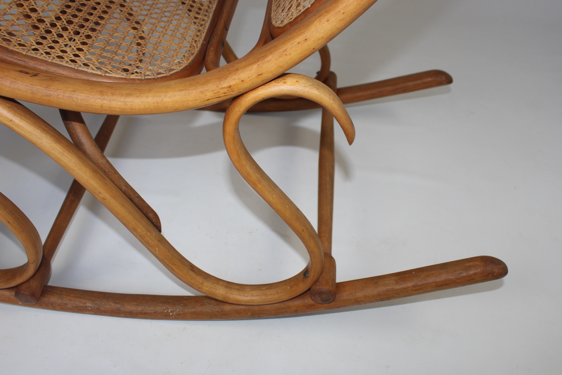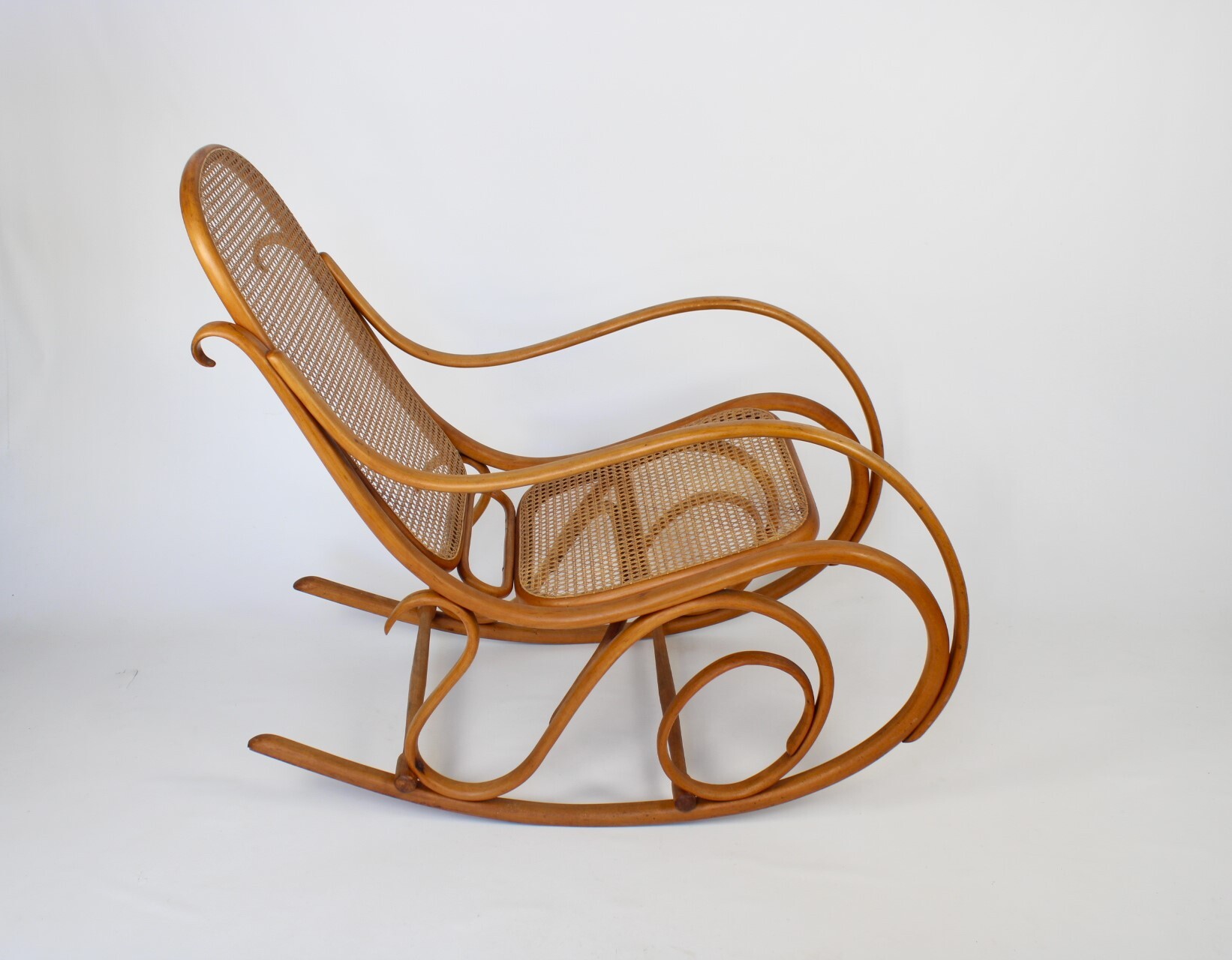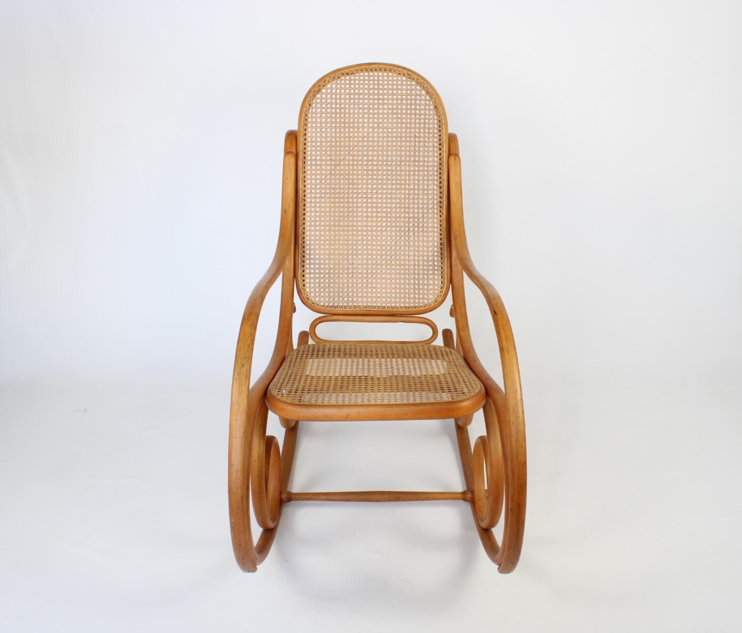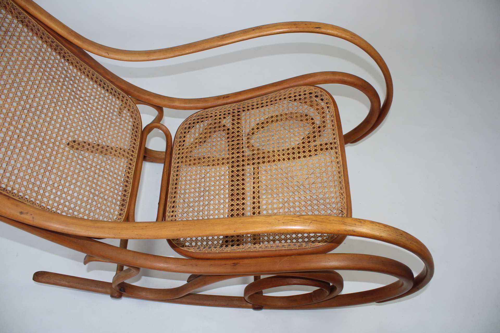 Een schommelstoel nr. 14 van Thonet met een mooie uitstraling. Eind 19de-begin 20ste eeuw. Dit type van schommelstoel stond vanaf de jaren 1886 in de catalogus van Thonet. Gerestaureerd, in zeer goede staat. Het etiket van Thonet is niet meer aanwezig, nog enkele sporen van waar het etiket gekleefd heeft.