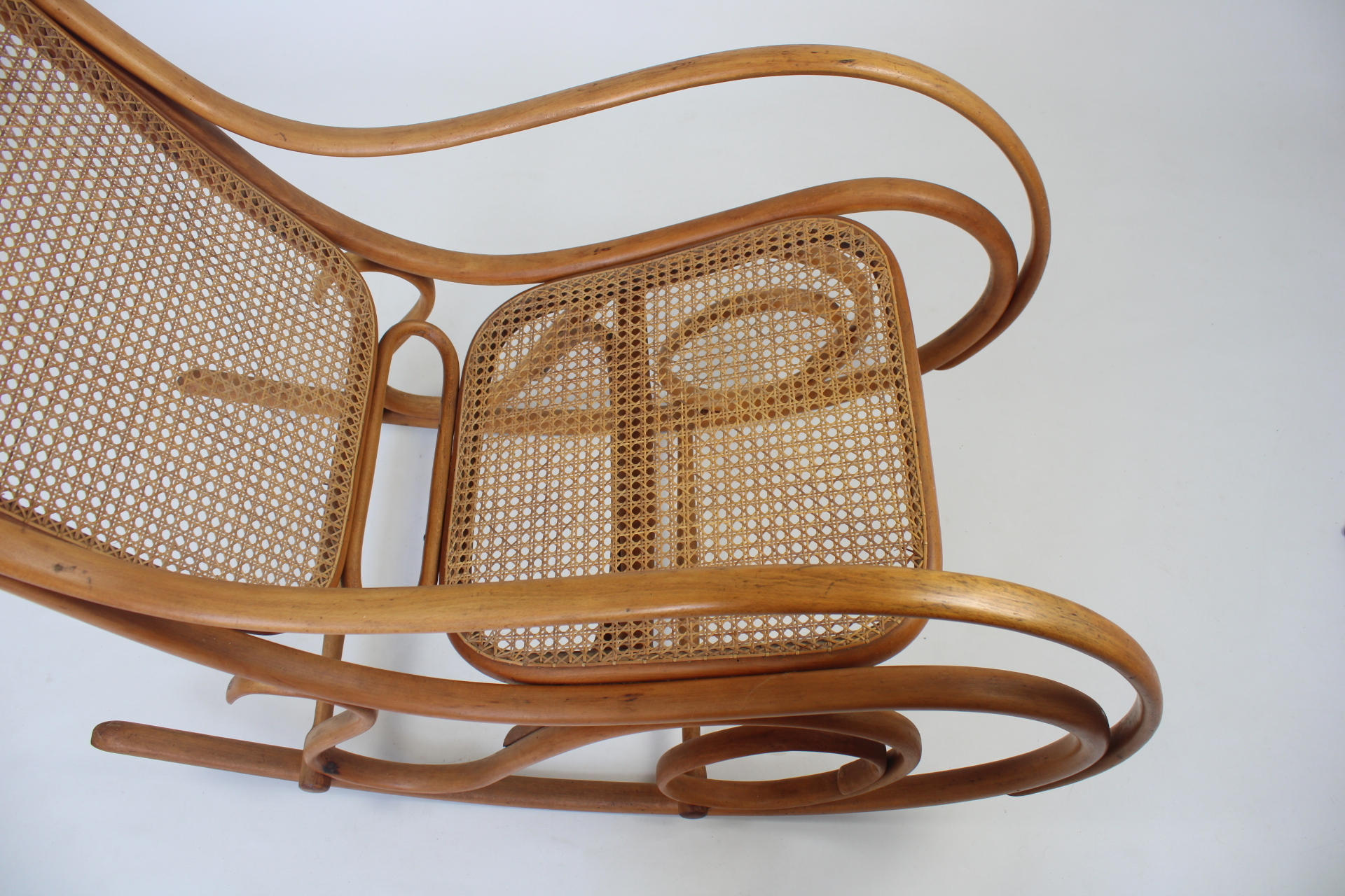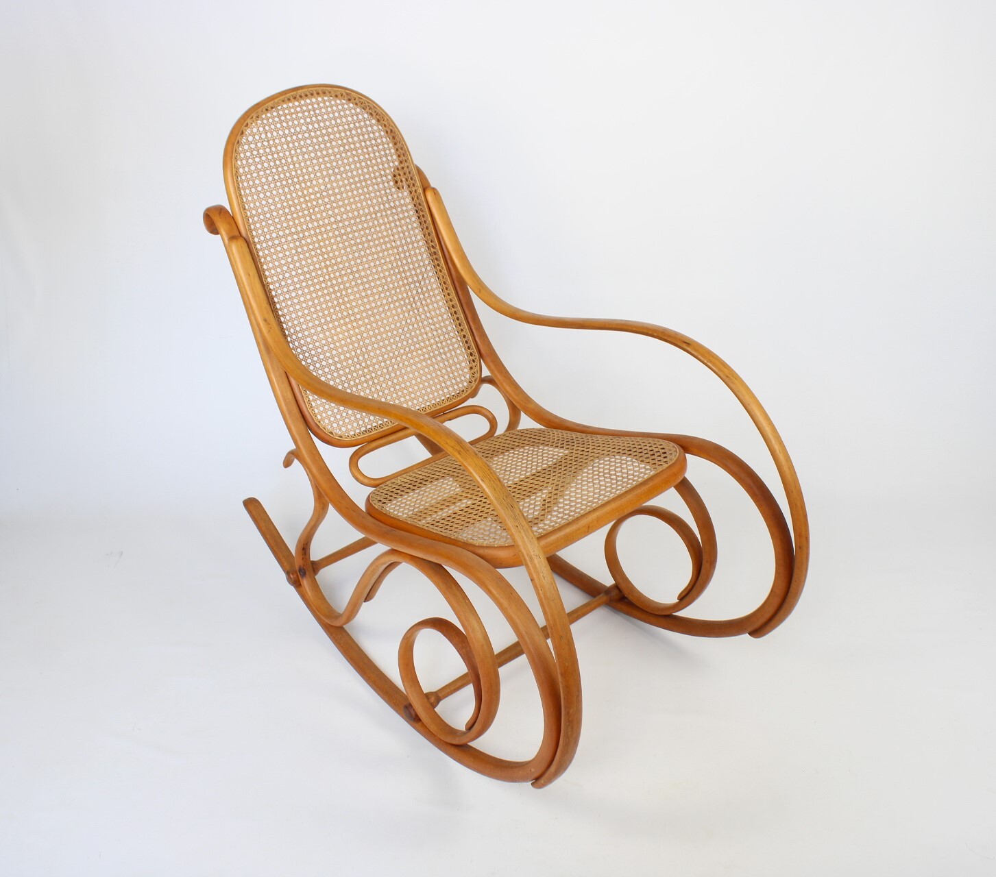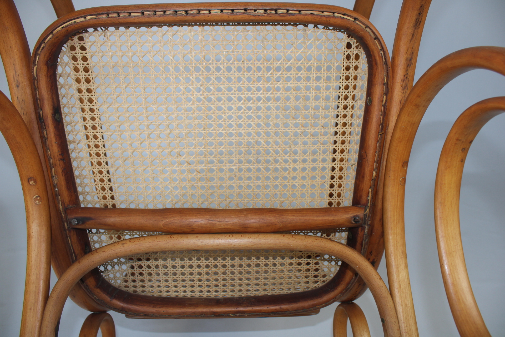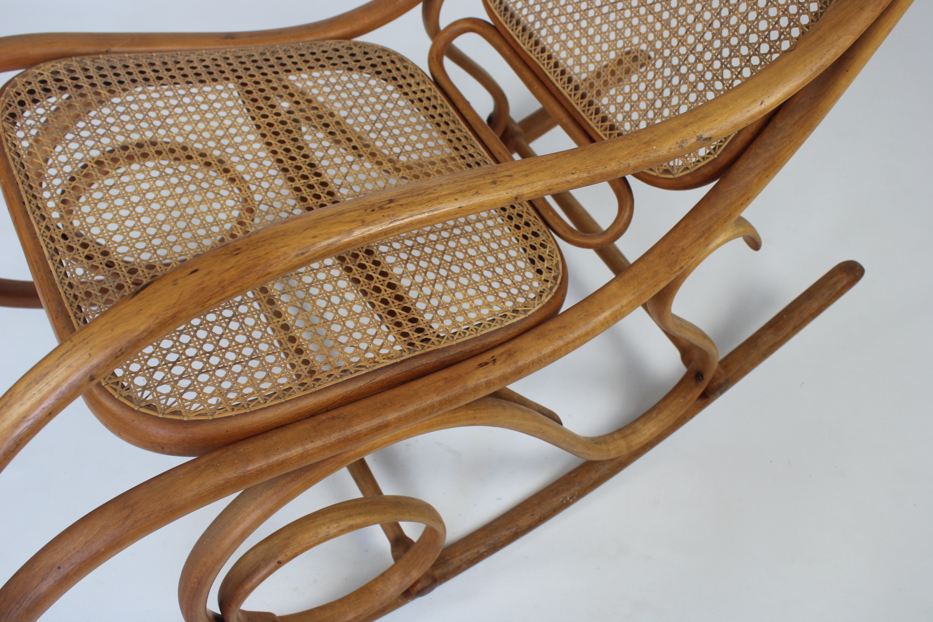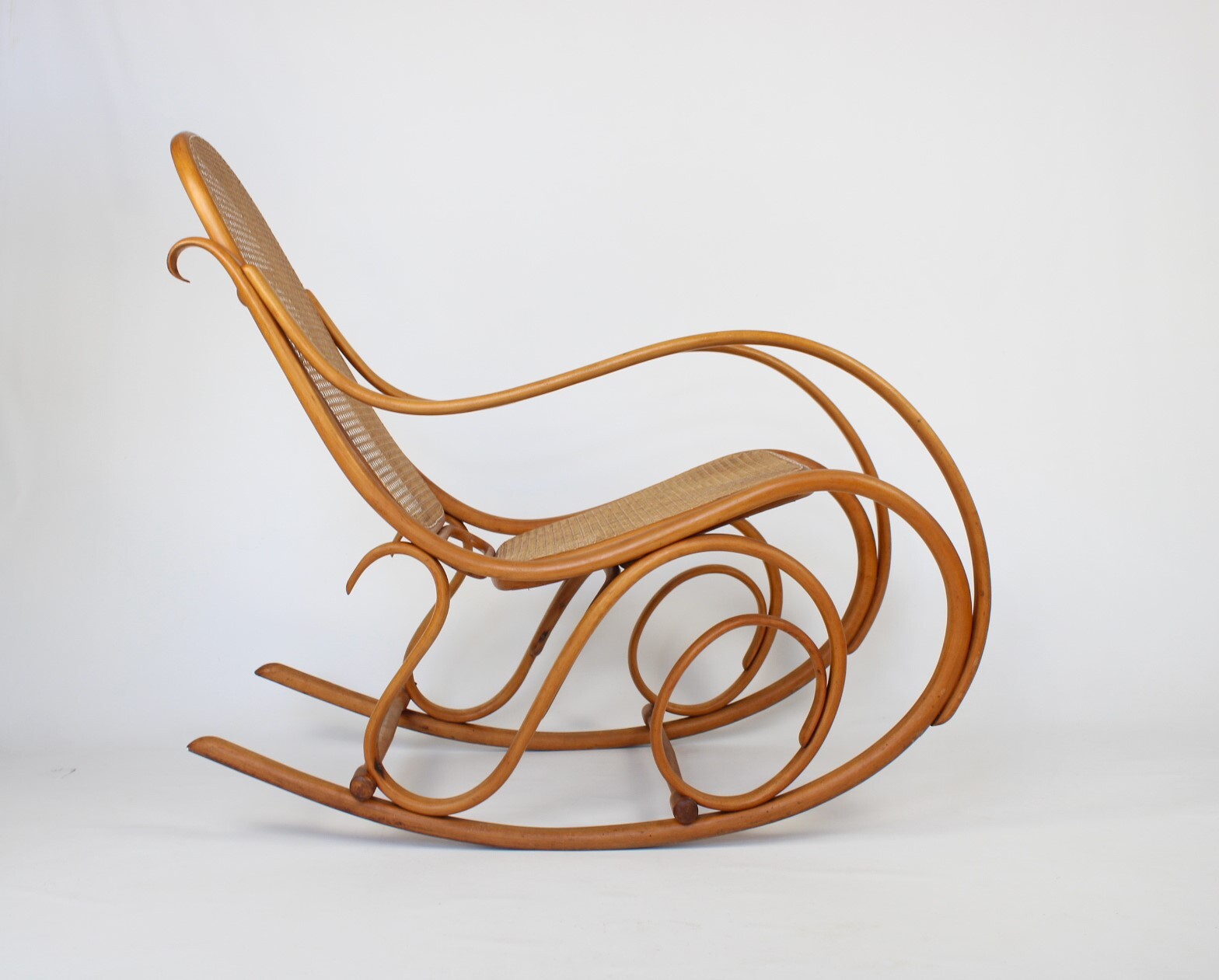 Een schommelstoel nr. 14 van Thonet met een mooie uitstraling. Eind 19de-begin 20ste eeuw. Dit type van schommelstoel stond vanaf de jaren 1886 in de catalogus van Thonet. Gerestaureerd, in zeer goede staat. Het etiket van Thonet is niet meer aanwezig, nog enkele sporen van waar het etiket gekleefd heeft.