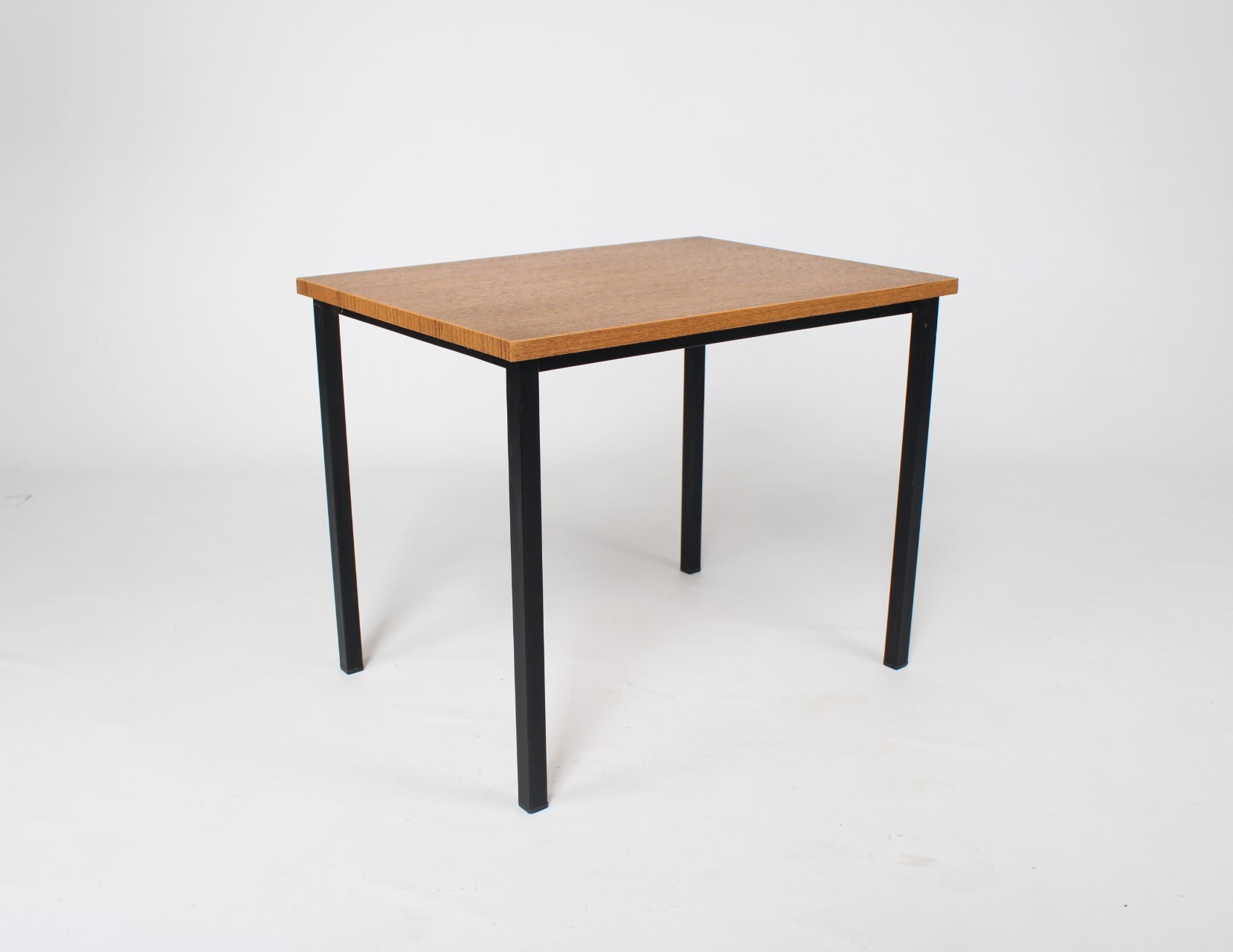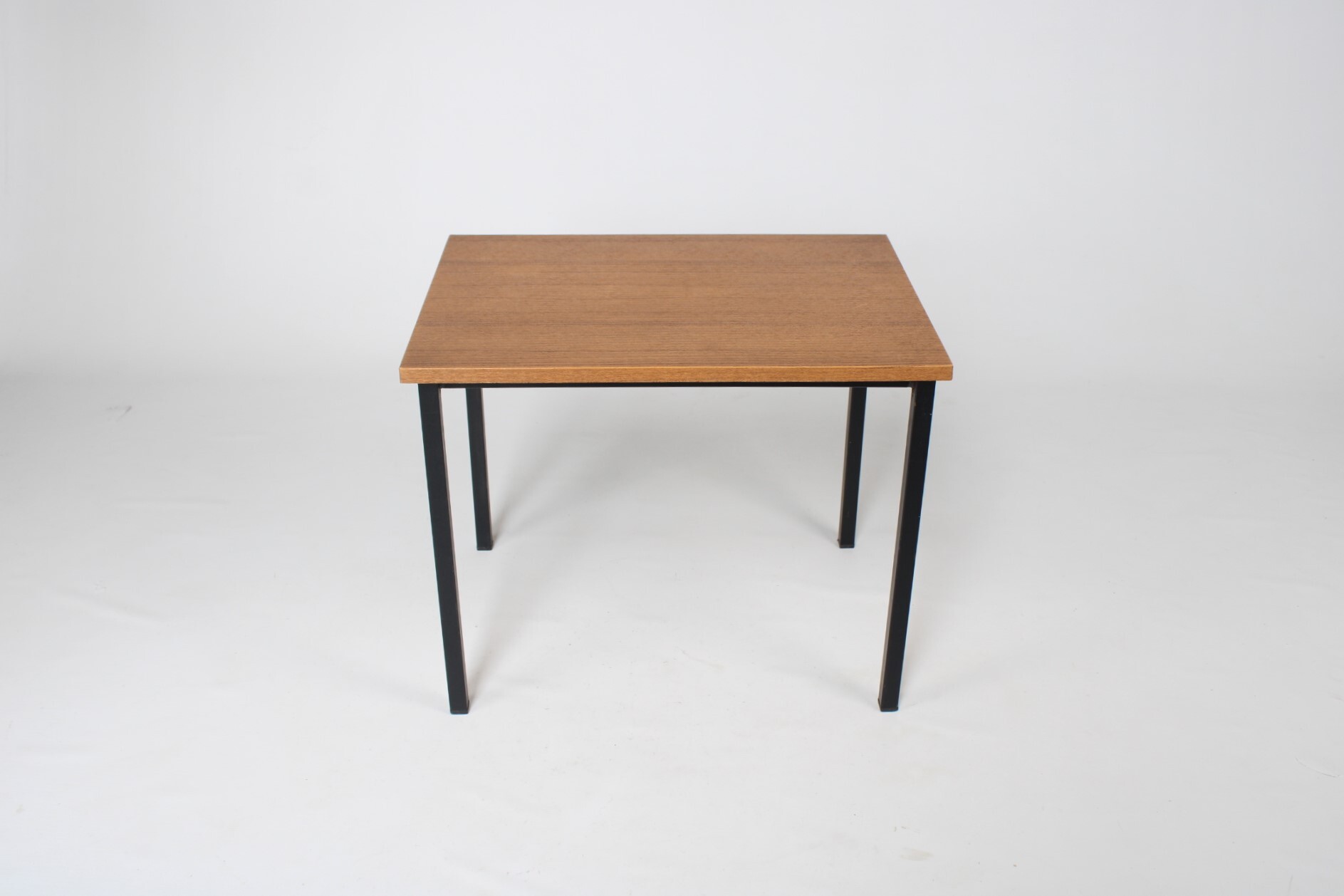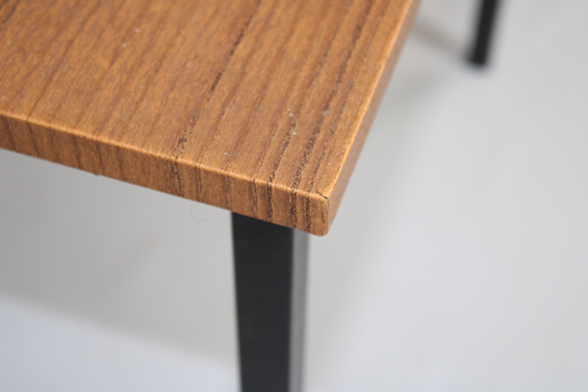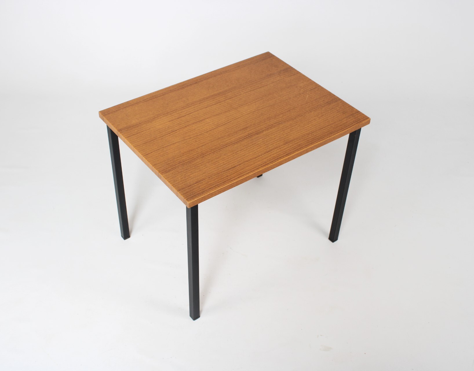 Een klein vintage tafeltje met een afwerking in bruin imitatiehout. Zwarte metalen pootjes.