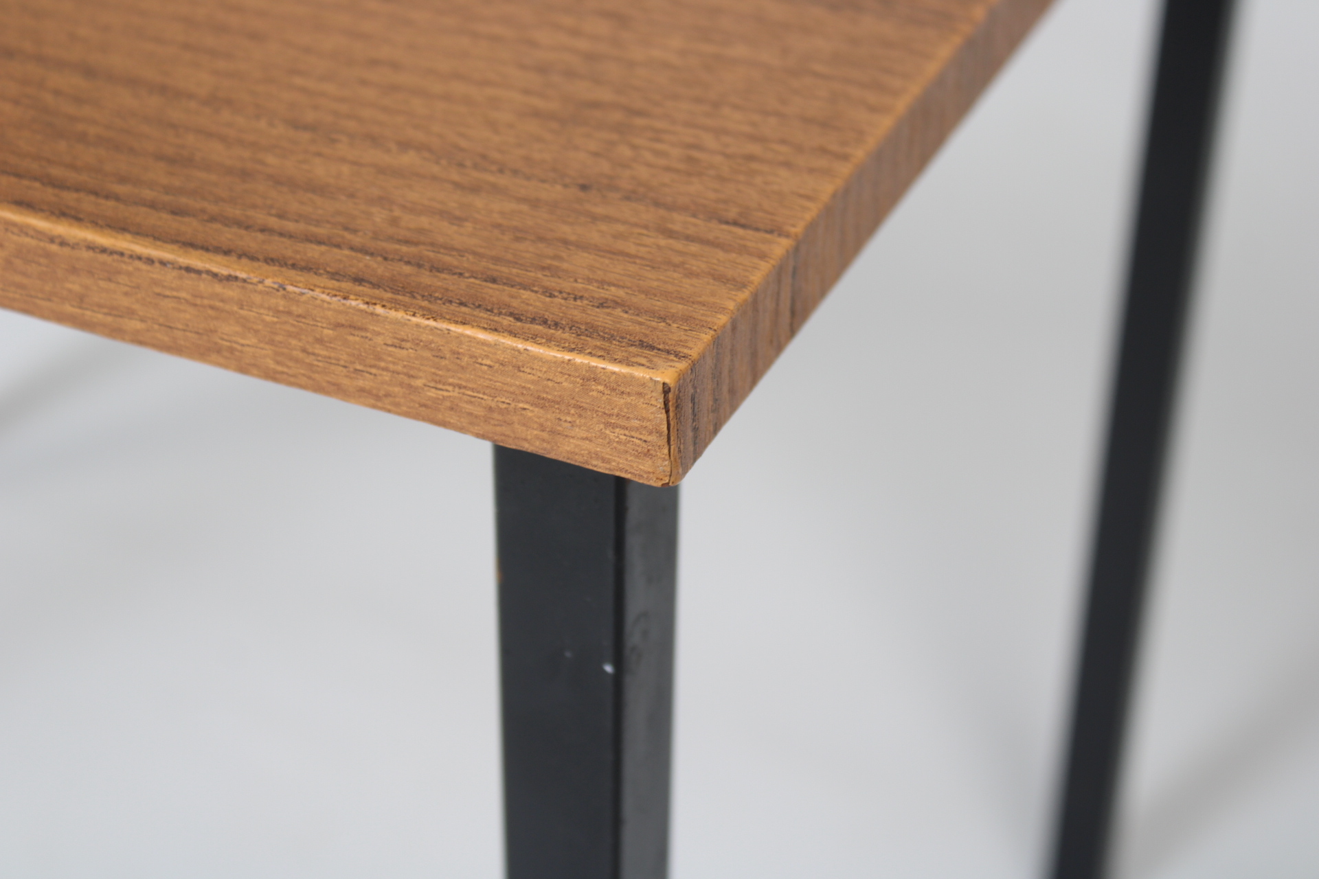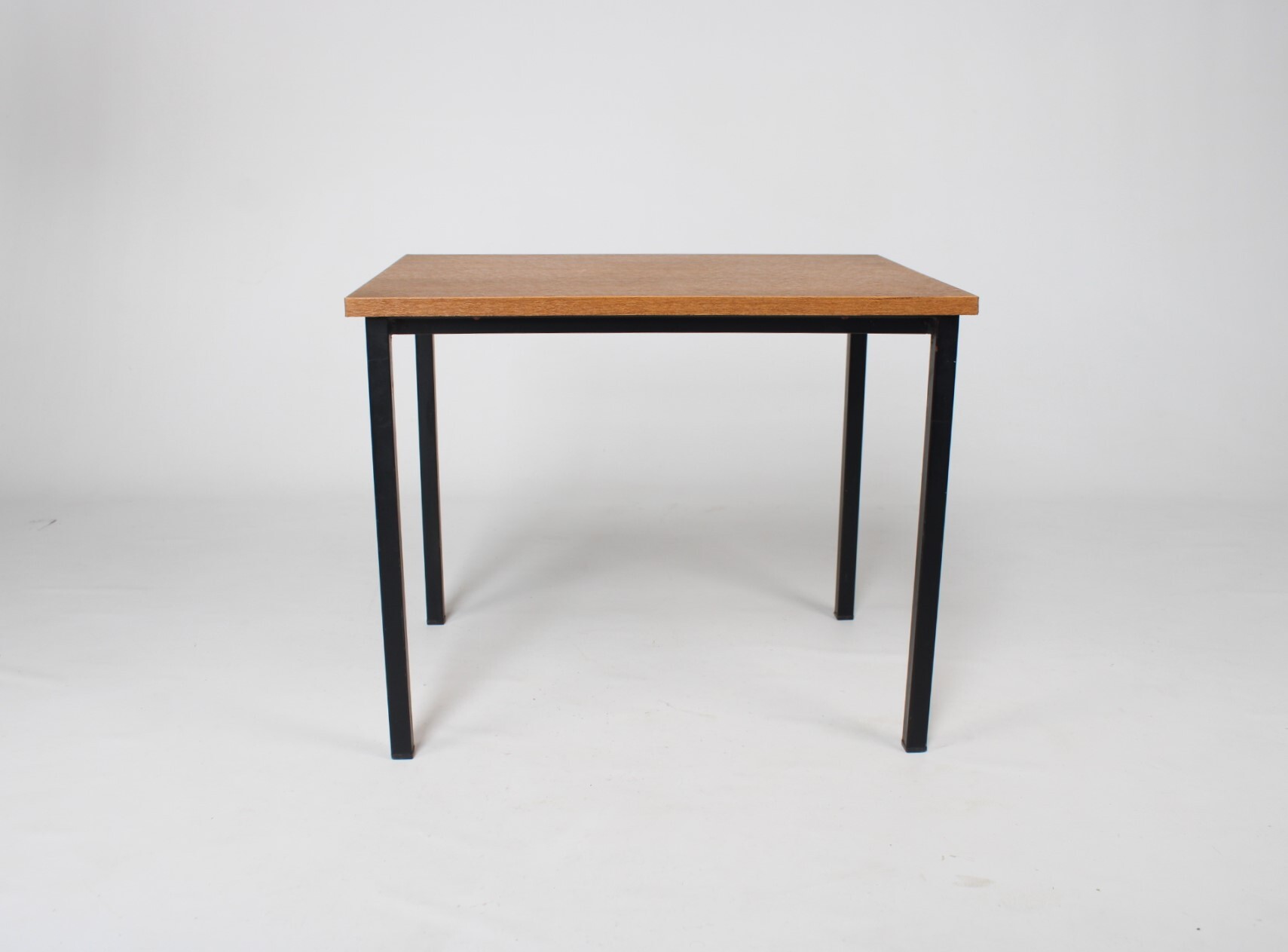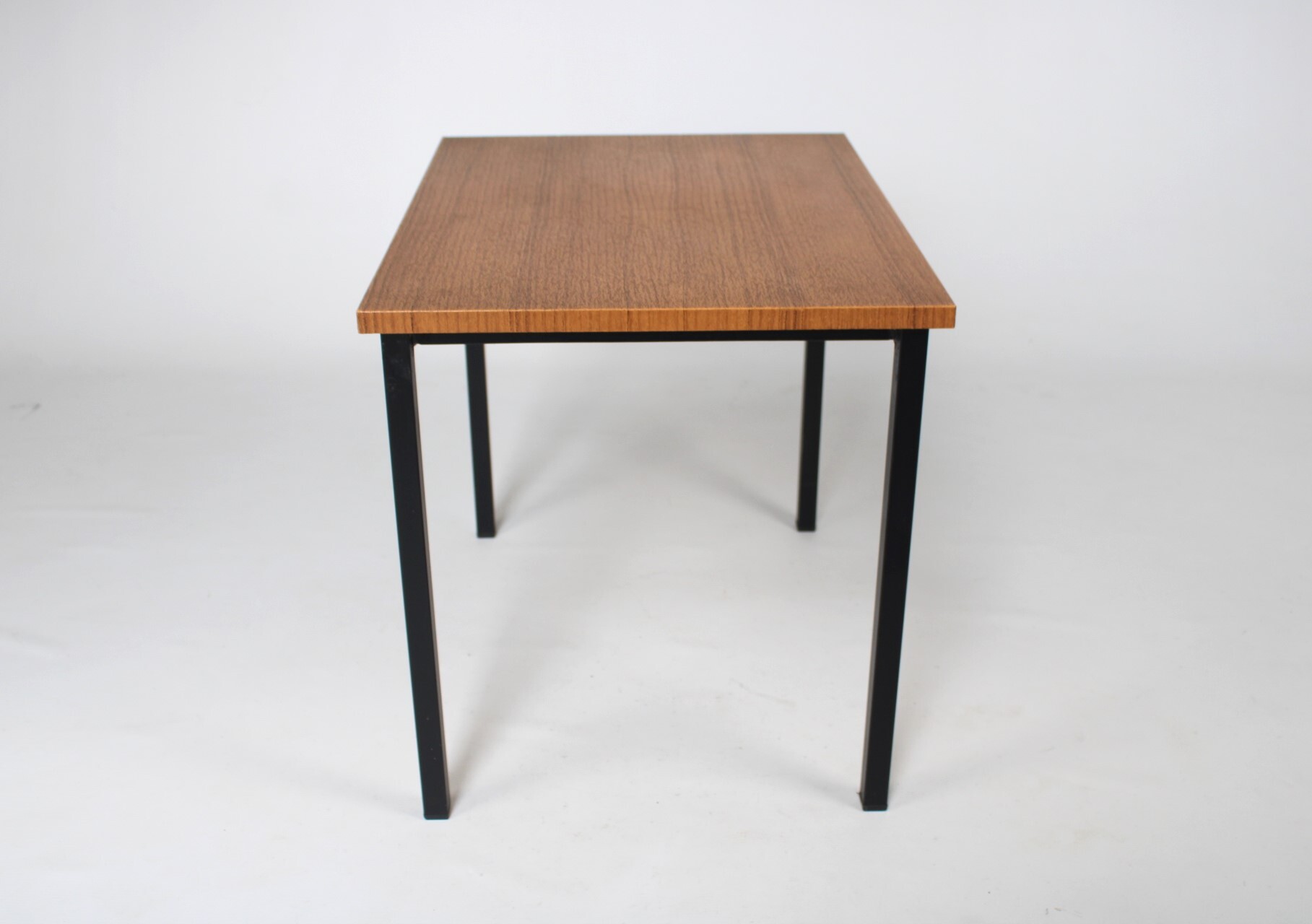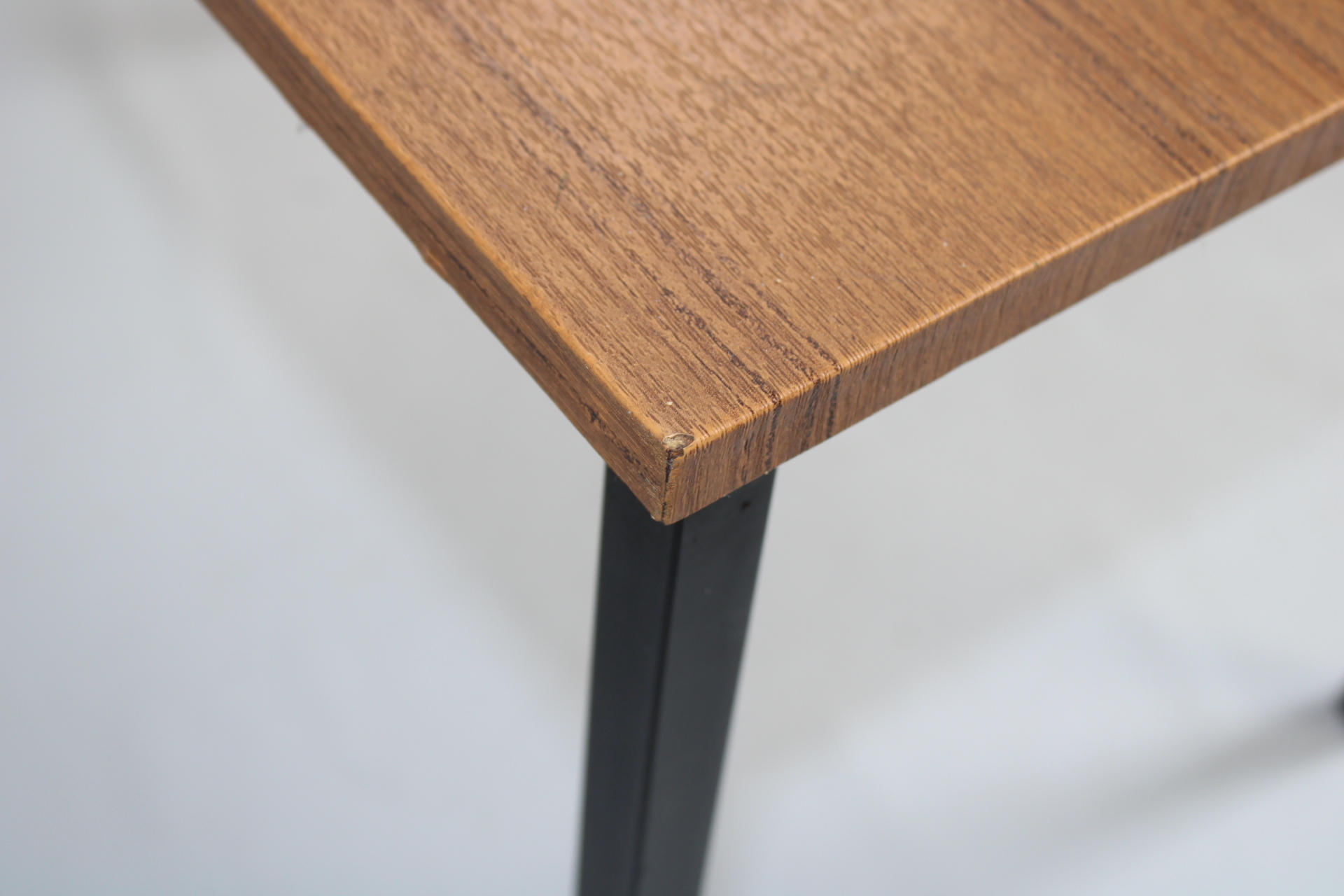 Een klein vintage tafeltje met een afwerking in bruin imitatiehout. Zwarte metalen pootjes.